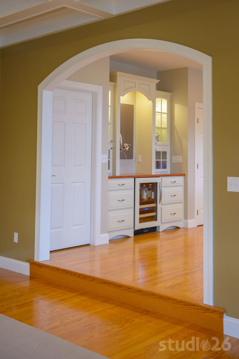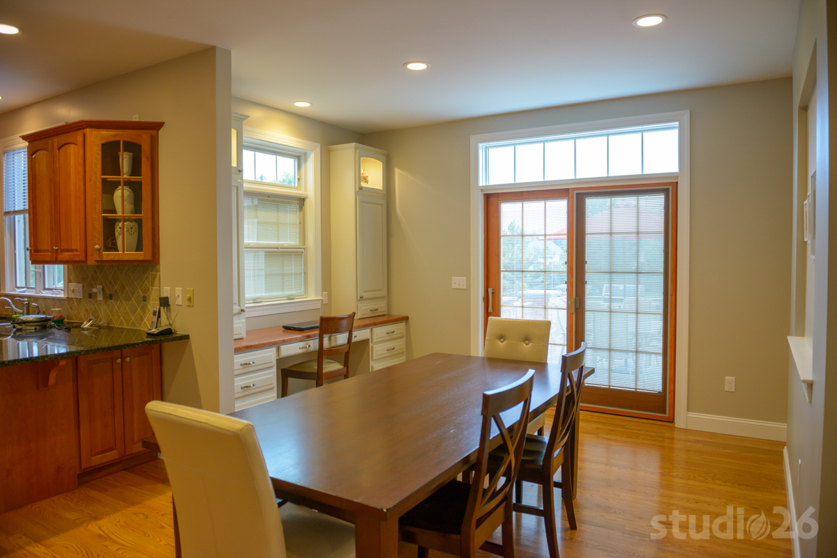To round out the family’s needs, the kitchen area was also expanded to better accommodate a larger kitchen table, a new dry bar area with an undercounter beverage center and glassware storage above, and a new expansive desk area for the family to use for paying bills, doing homework, or surfing the internet. A modifiable feature wall was also incorporated to highlight current family photos and notable artwork through the years. Furthermore, the finish of the painted built-in cabinetry and natural cherry countertop was carefully selected to stand apart, yet still complement the existing natural cherry cabinetry throughout the rest of the kitchen.