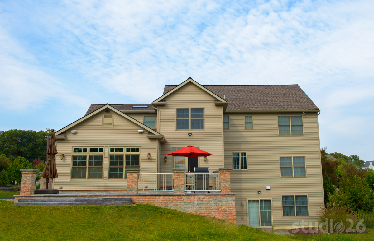 Since living outdoors as often as they can is a high priority for our client, it was important for them to remove the old, rotting deck and ponder what options might be best for their family. After much deliberation, we ultimately crafted a prominent and spacious outdoor patio; which was a significant undertaking in and of itself. Since the home has an existing walk-out basement, the grade was more conducive to simply reinstalling a new deck. However, the homeowners’ wanted something more permanent, more durable, and more luxurious. So, we ended up building a patio complete with a robust footer and foundation structure, concrete walls faced with brick to match the front of the home, brick piers with custom-fabricated metal handrails in between, a hidden propane line plumbed for the outdoor grill, and an in-laid cleft flagstone patio surface.