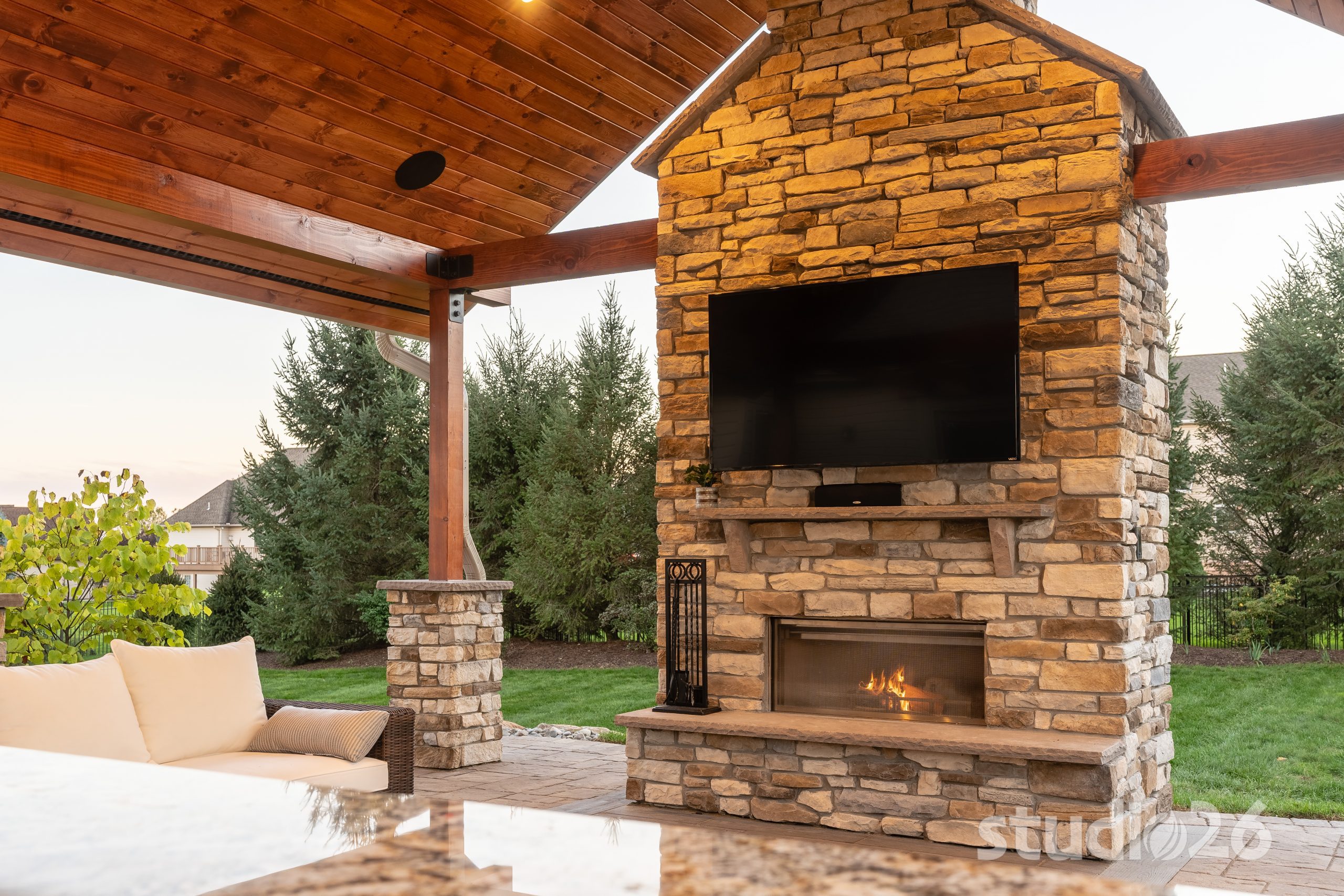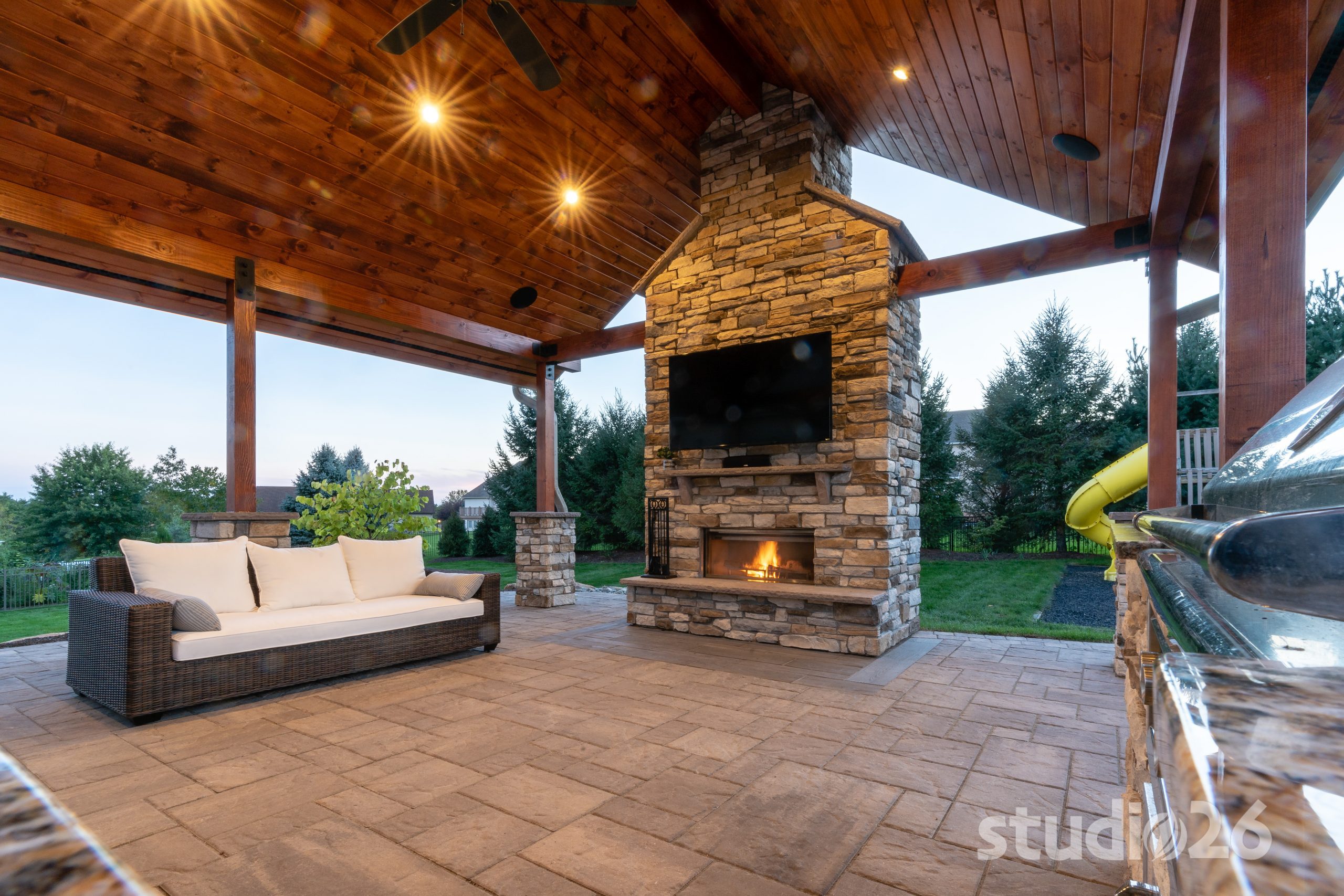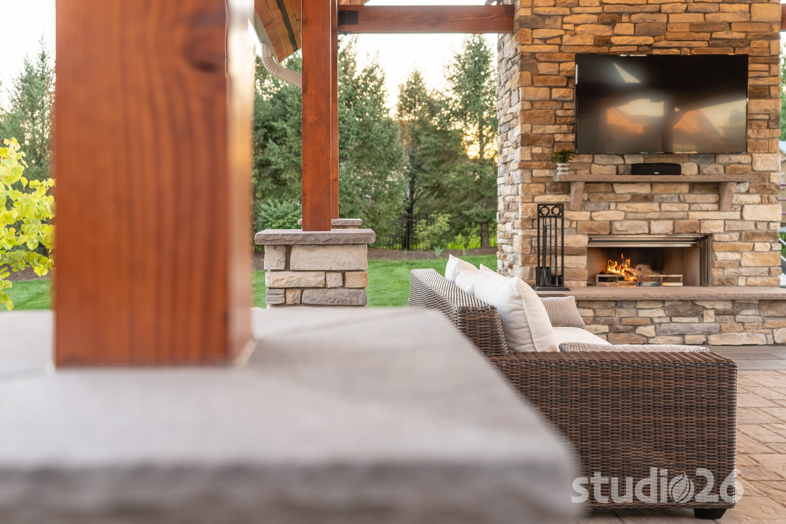 Underneath the covered porch anchored by its robust wood-burning fireplace, our clients can enjoy rainy Summer days as well as chilly Fall evenings by the fire – experiencing the sight, smell, and crackle of a fresh wood burn. Whether grilling out with the family or enjoying some beverages with friends, this space affords comfortable bar and lounge seating under cover, all while watching their favorite TV shows or sporting events. Considering the ‘flooring’ as part of the overall design, we incorporated relatively neutral hues throughout and a notably different, but still complimentary paver around the fireplace – one with a darker-toned wood grain to help further distinguish the sculptural centerpiece.