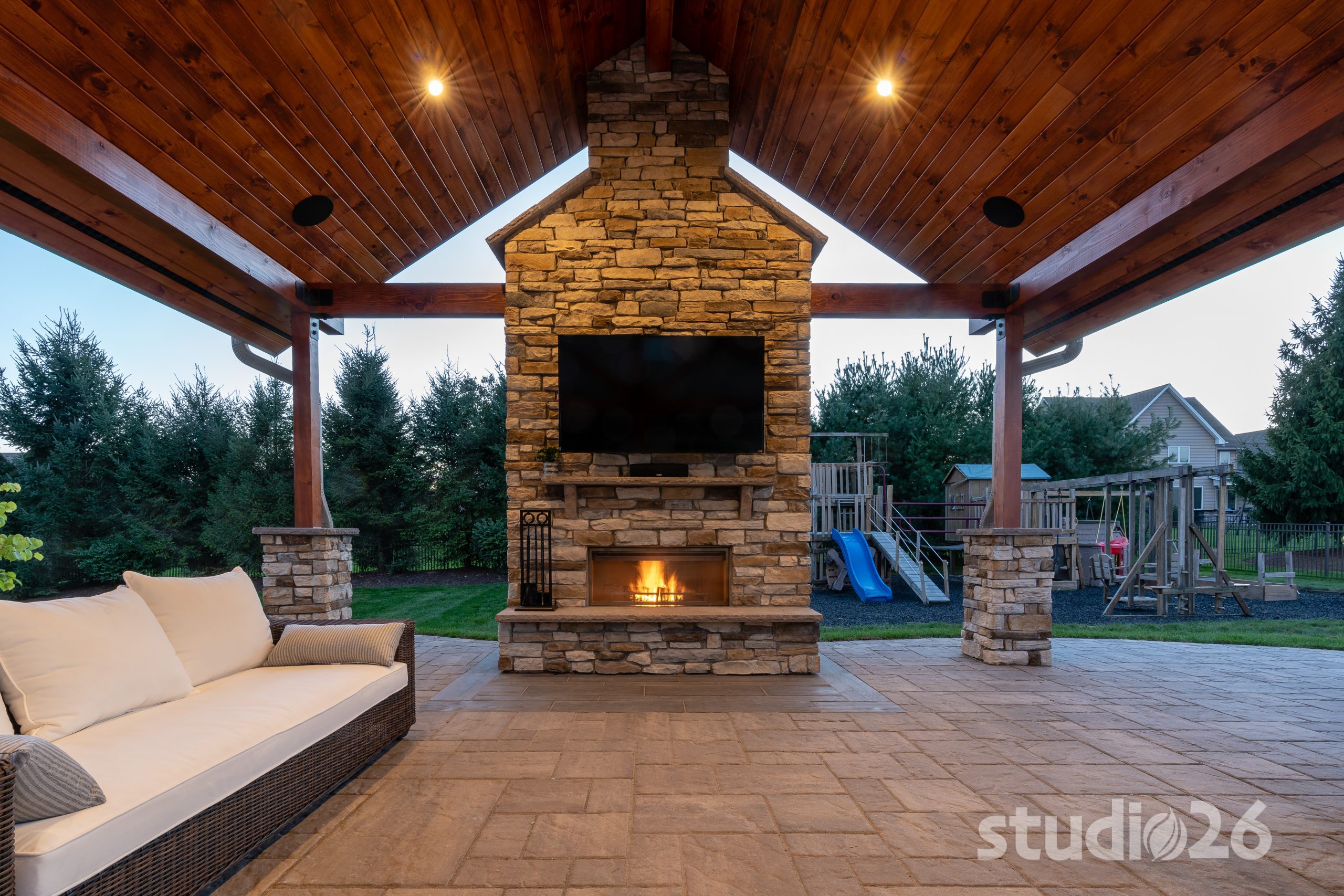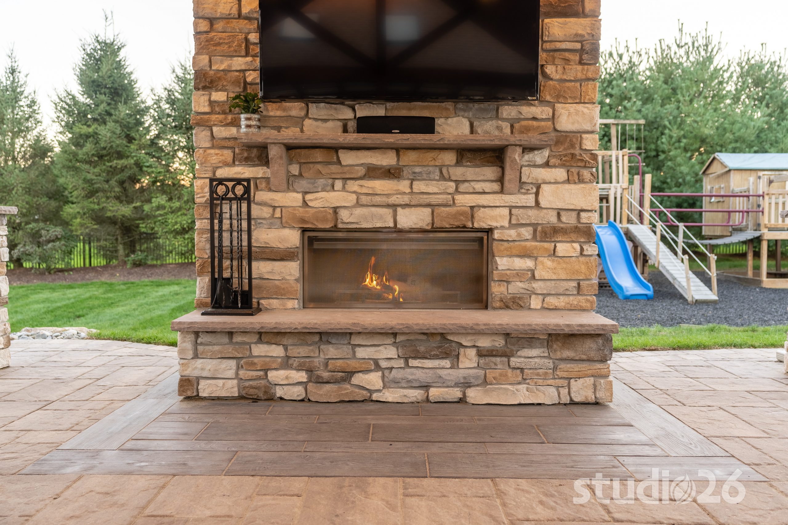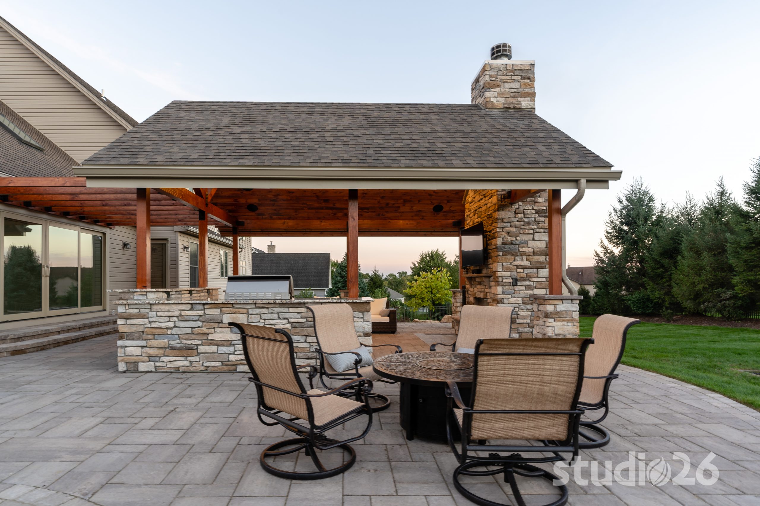 Underneath the covered porch anchored by its robust wood-burning fireplace, our clients can enjoy rainy Summer days as well as chilly Fall evenings by the fire – experiencing the sight, smell, and crackle of a fresh wood burn. Whether grilling out with the family or enjoying some beverages with friends, this space affords comfortable bar and lounge seating under cover, all while watching their favorite TV shows or sporting events. Considering the ‘flooring’ as part of the overall design, we incorporated relatively neutral hues throughout and a notably different, but still complimentary paver around the fireplace – one with a darker-toned wood grain to help further distinguish the sculptural centerpiece.