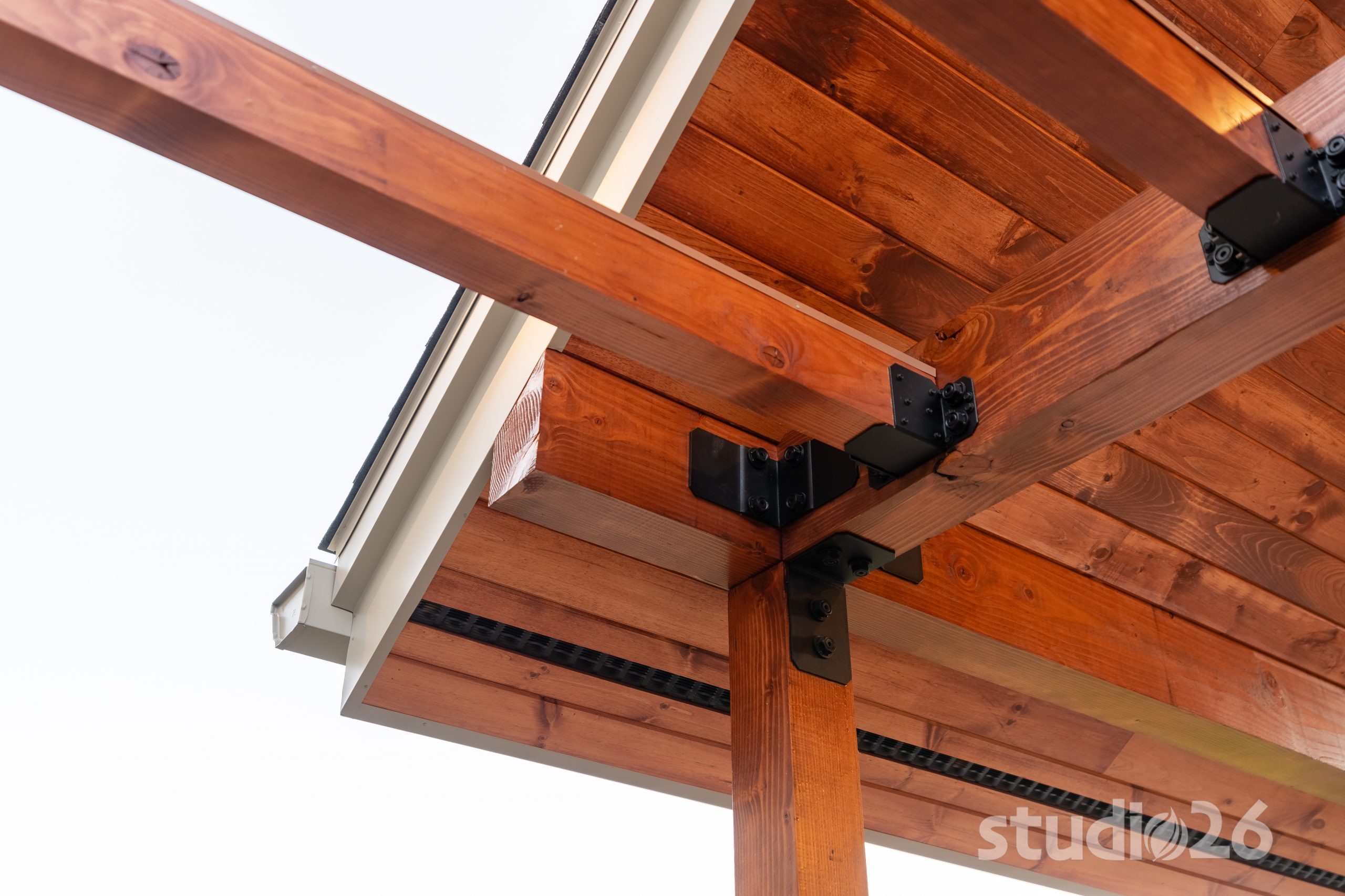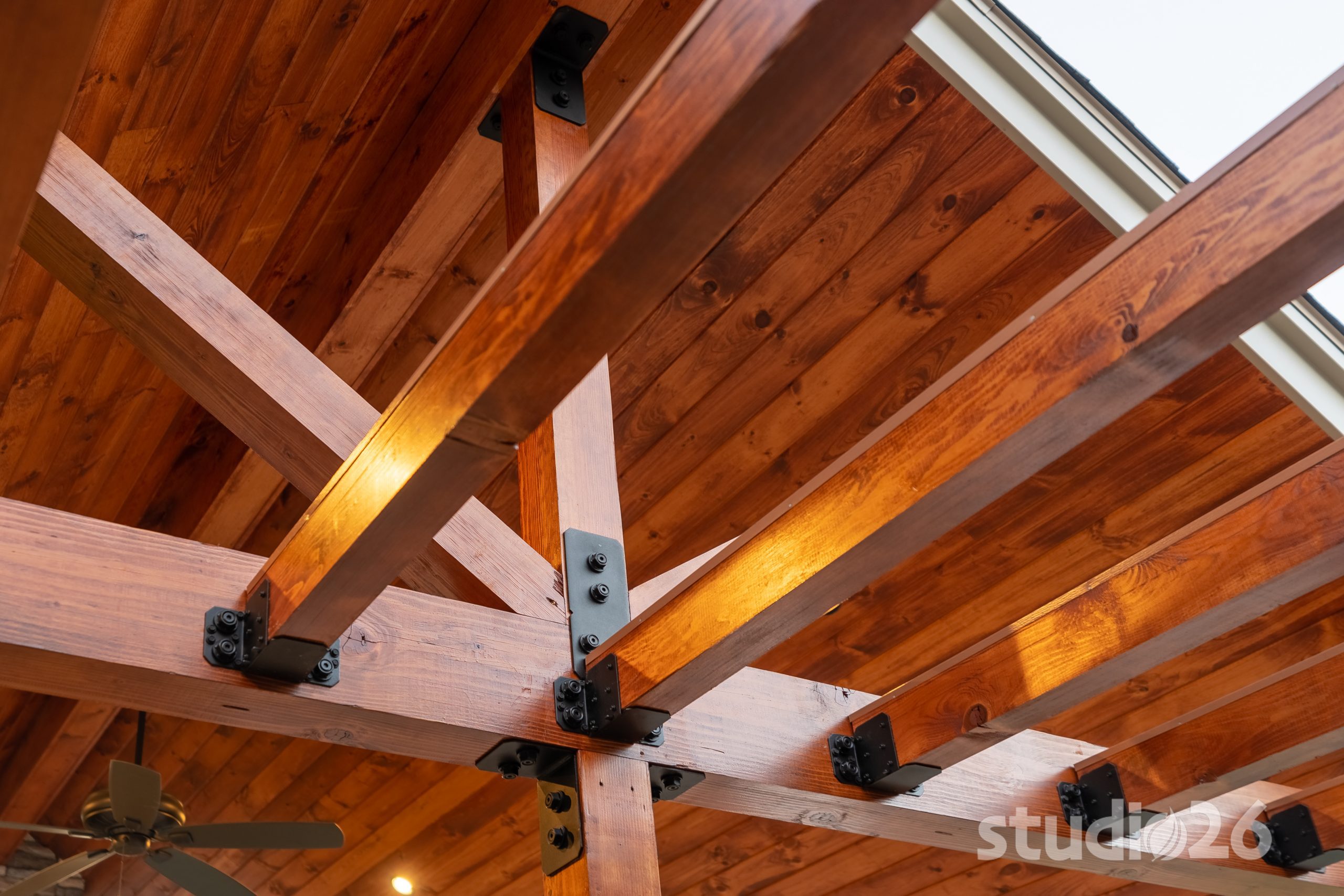 Almost as critical as the spaces themselves were the overall look and feel of the architecture. We decided that we were going to springboard off the home’s existing aesthetic, and introduce some new natural wood tones and stonework to help warm up the ambiance. More specifically, we incorporated deep stained solid hardwood posts and beams and accentuated those connections with contrasting black architectural hardware. Furthermore, we carried that black detail throughout the rest of the design with the light fixtures, speakers, television, and soffit venting.