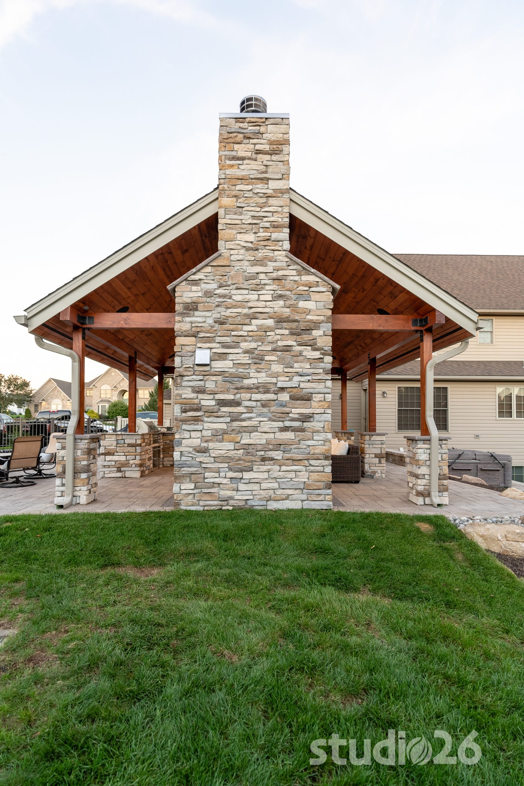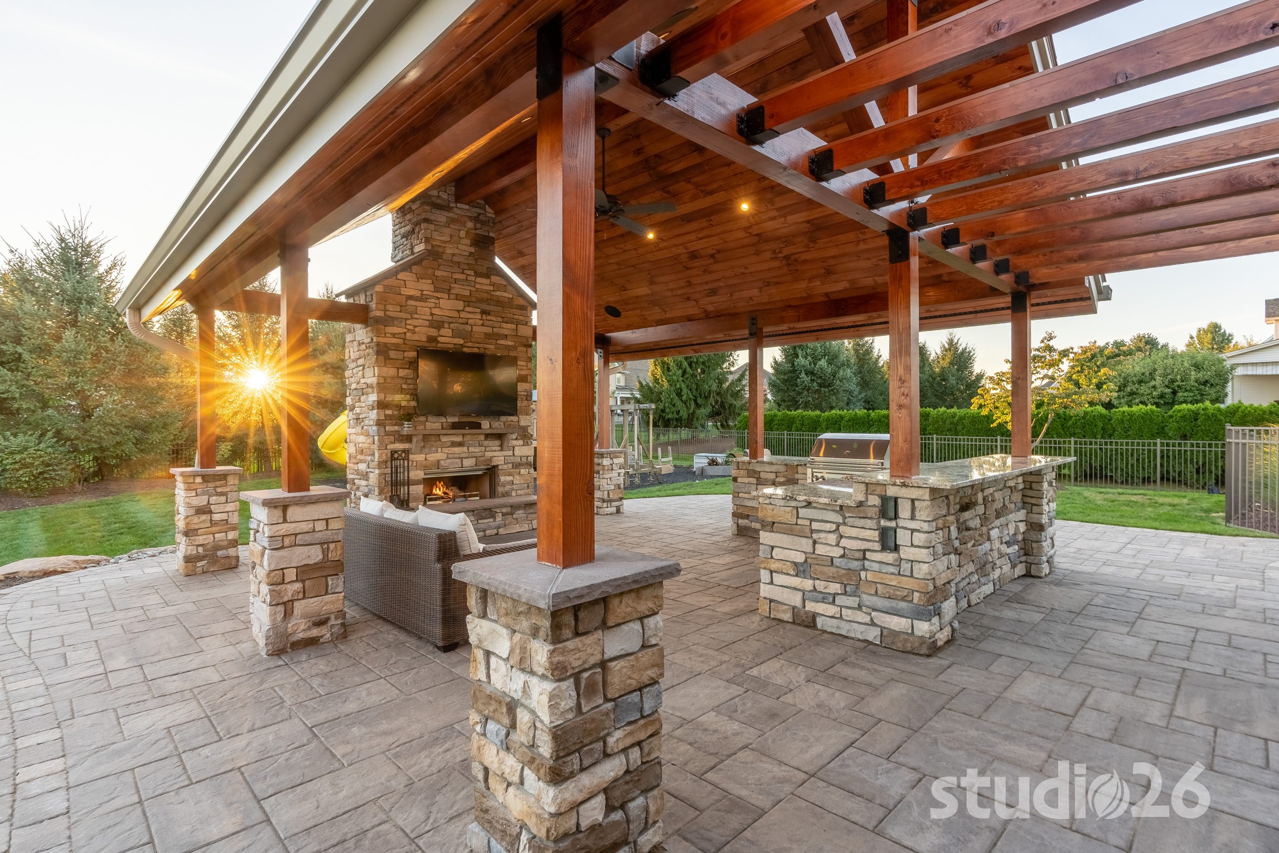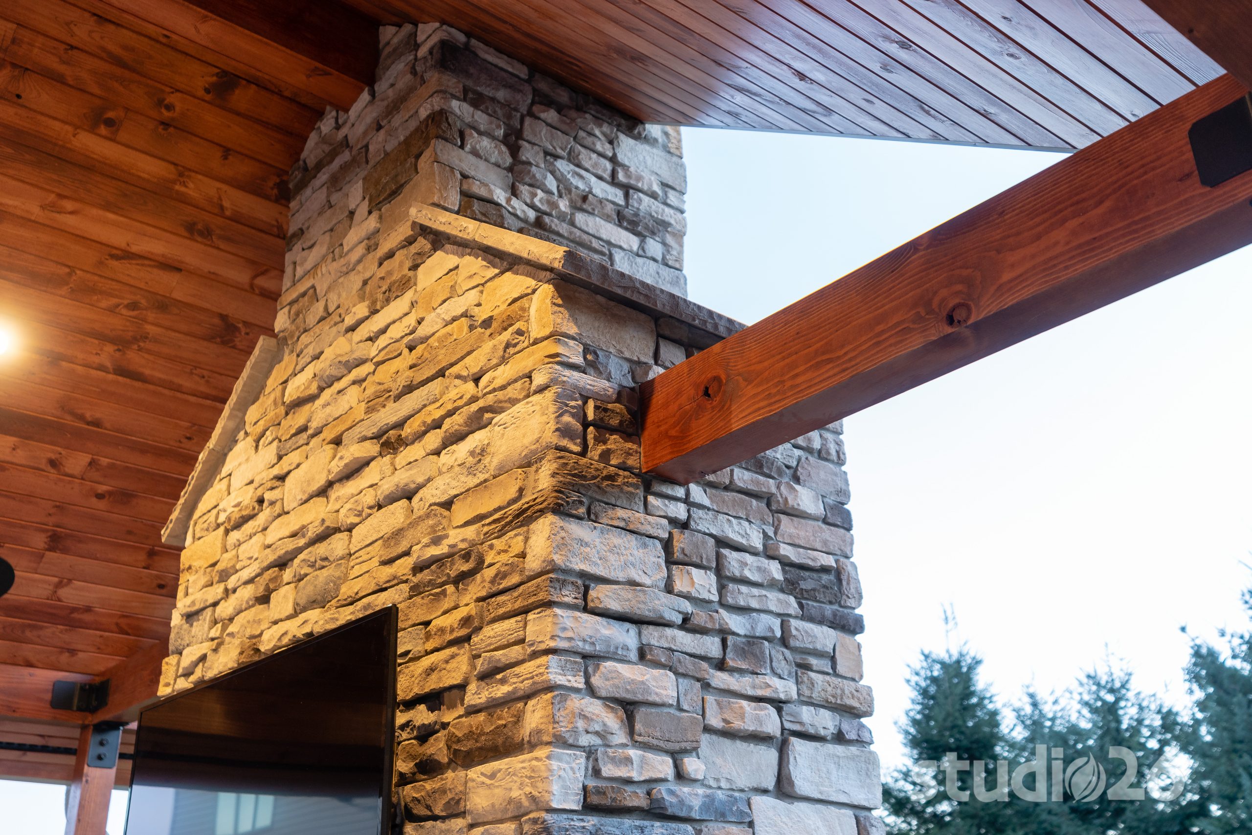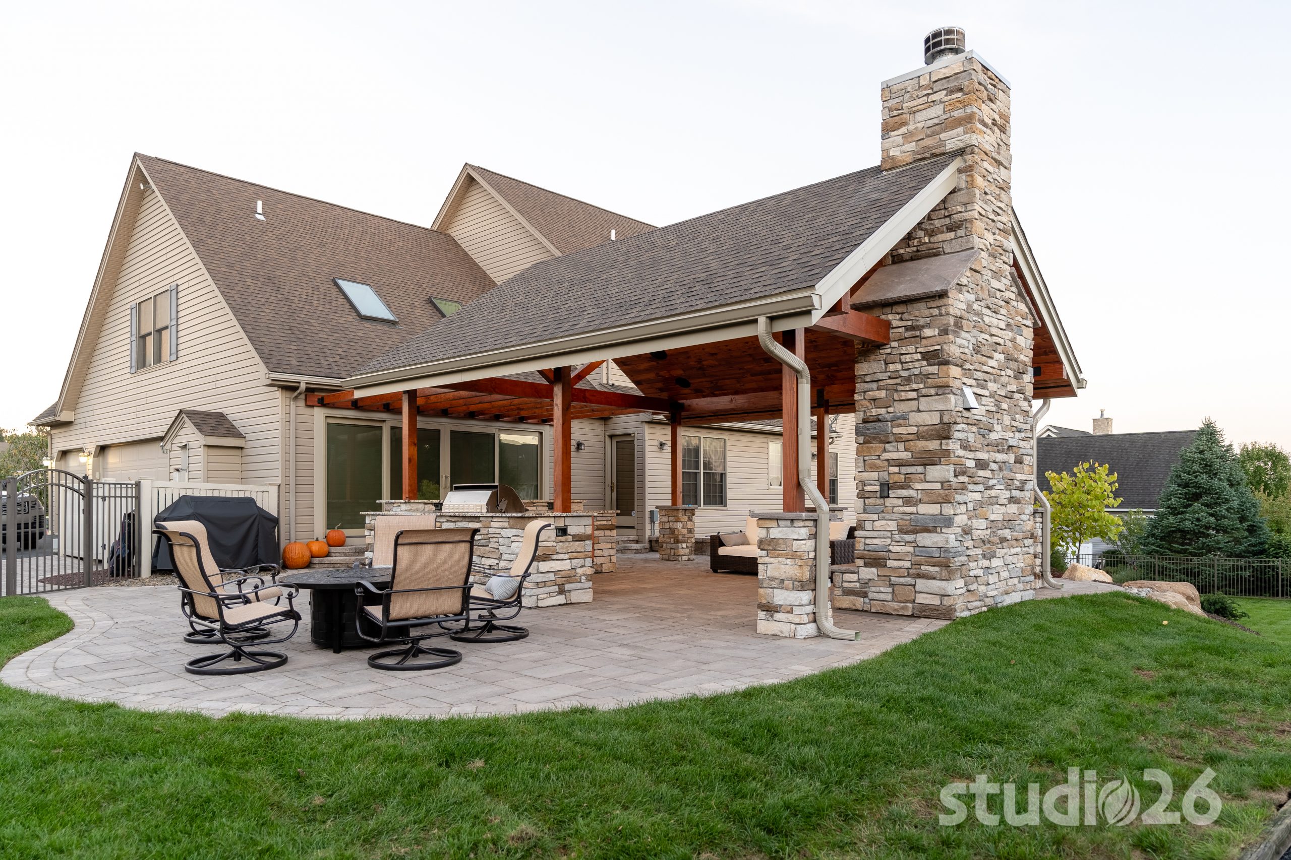 Stone Veneer, Douglas Fir Beams & Posts, Paver Patio & Steps