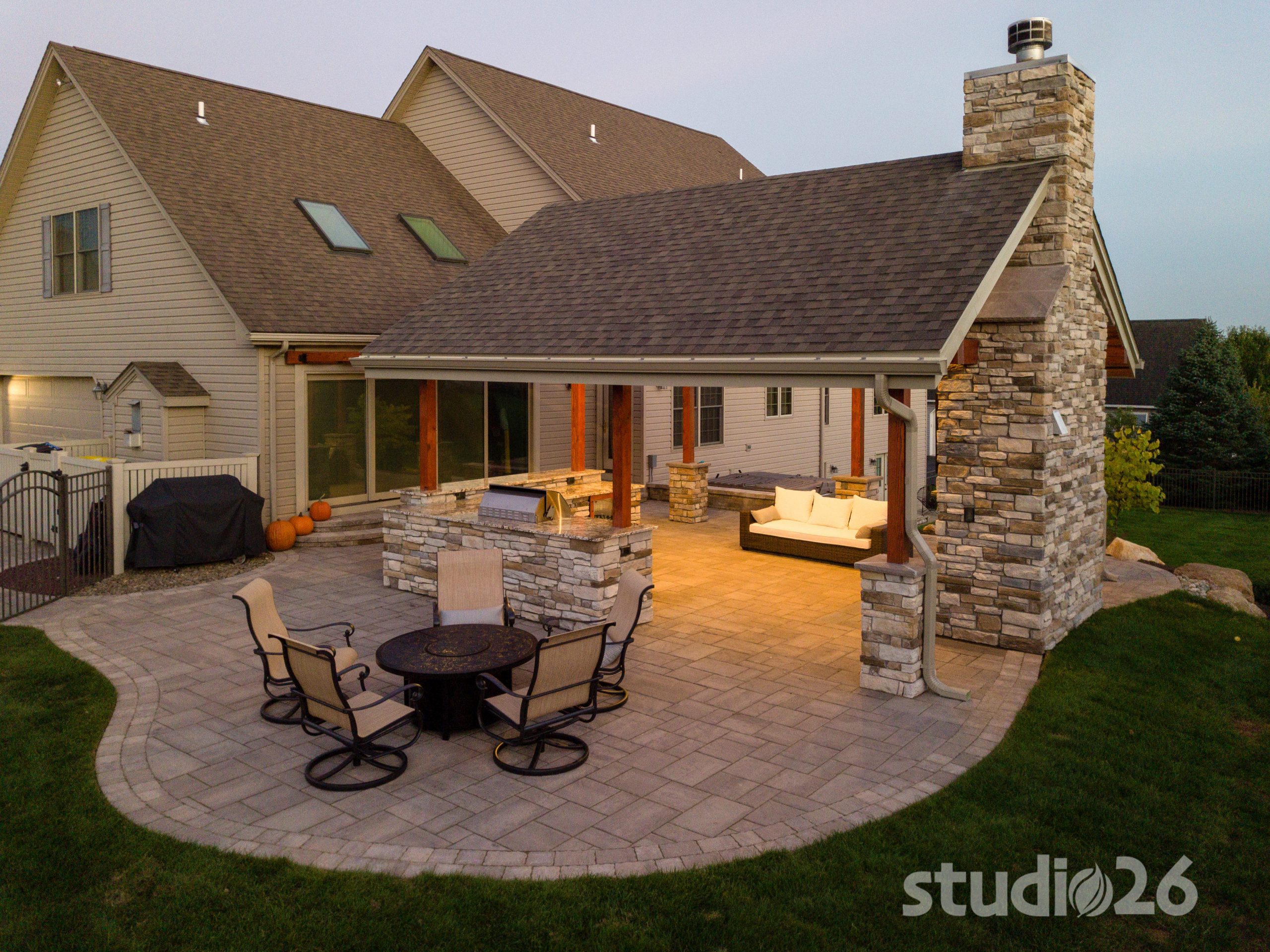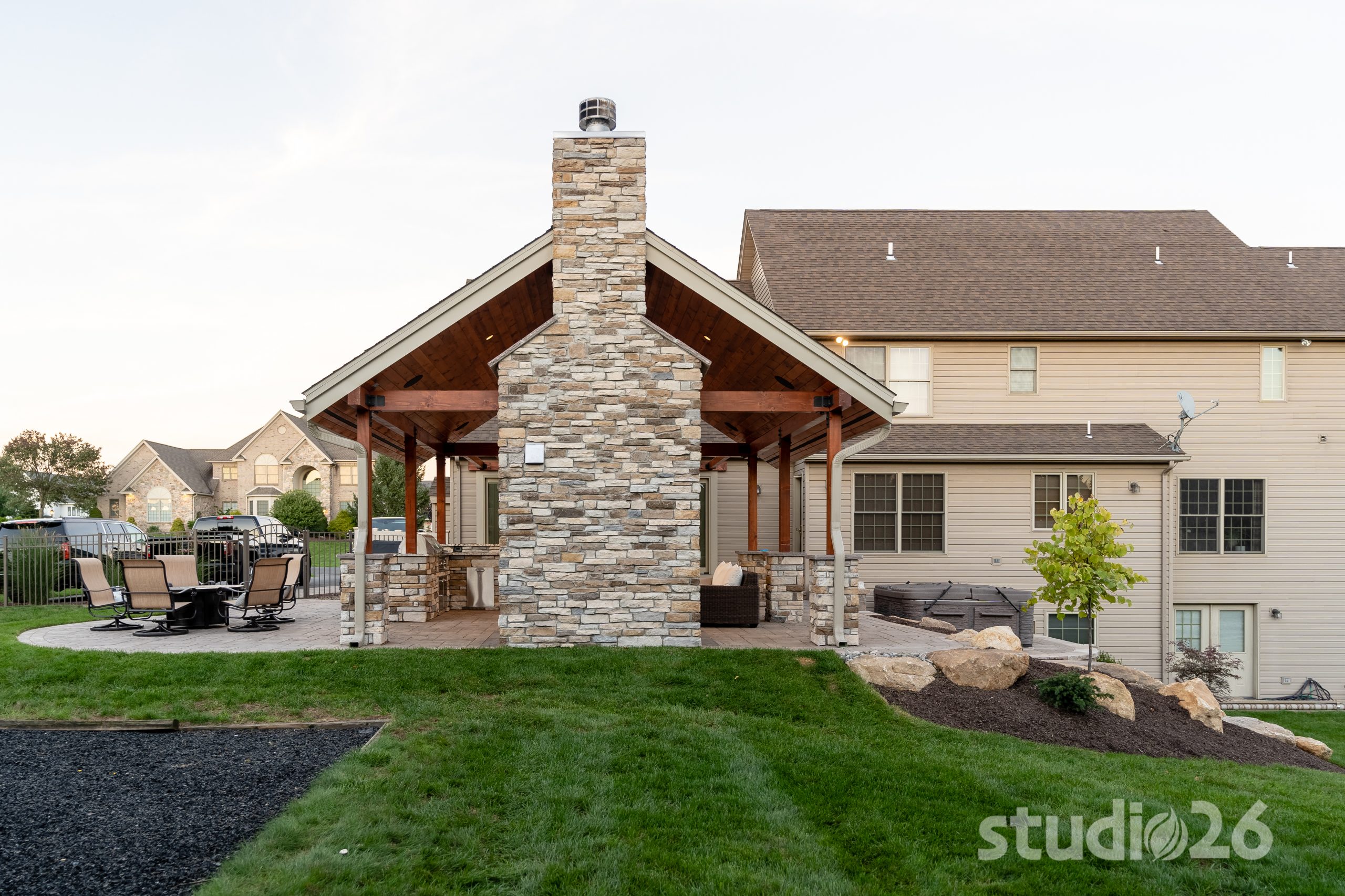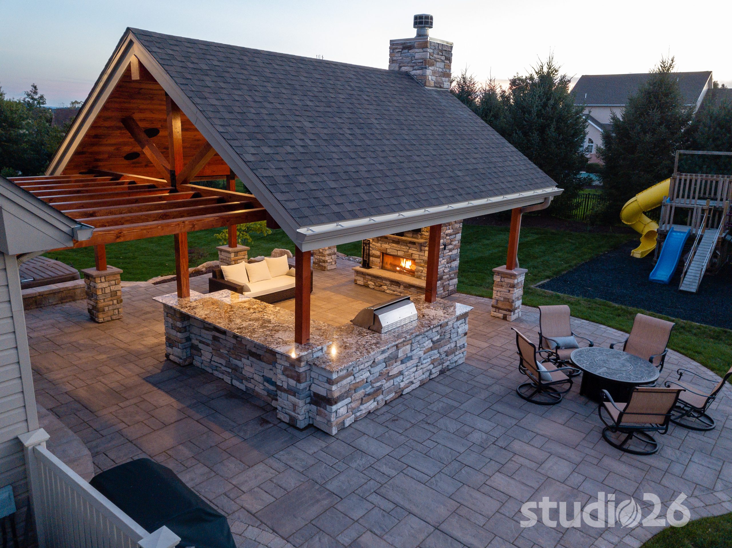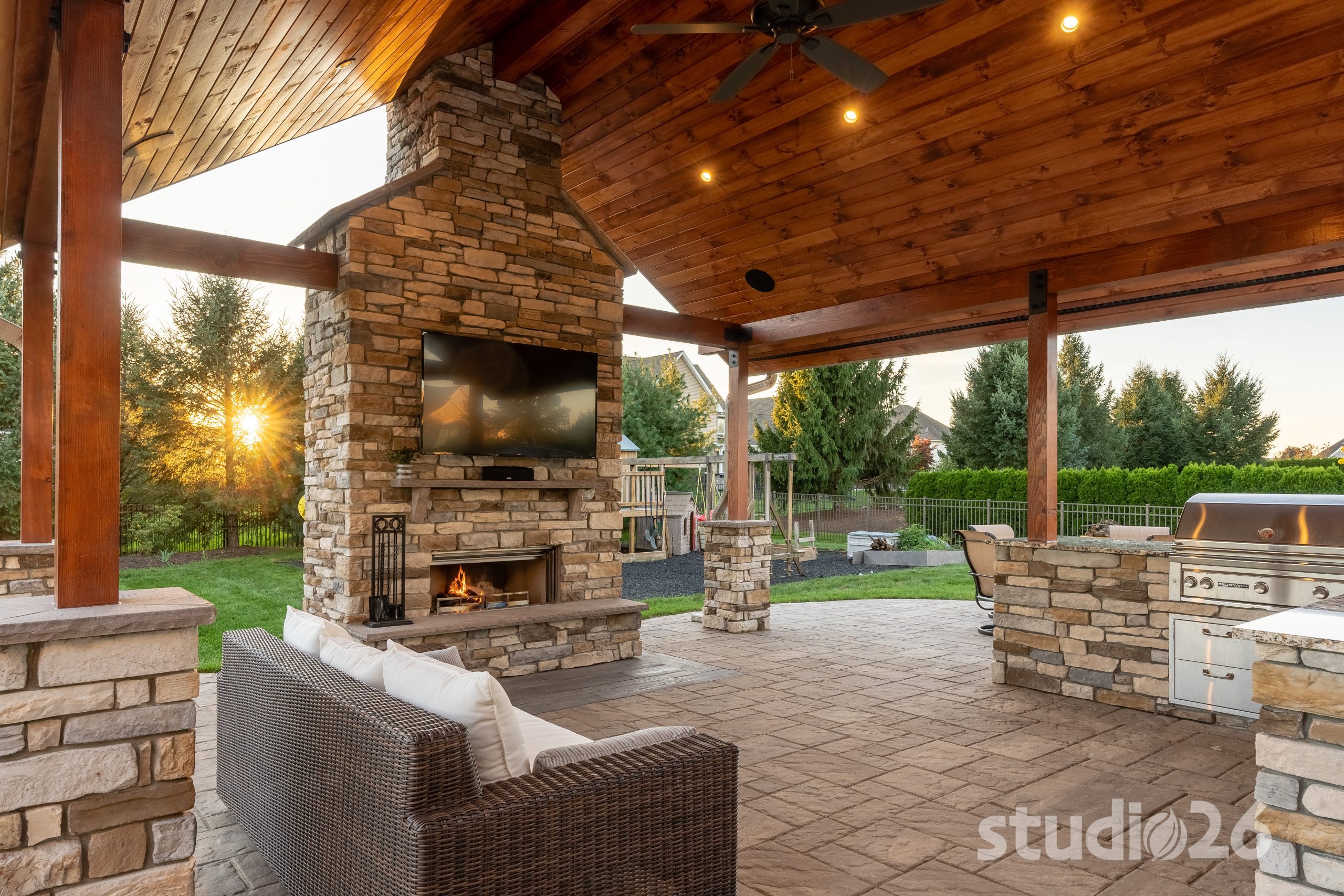 Stone Veneer, Douglas Fir Beams & Posts, Paver Patio & Steps