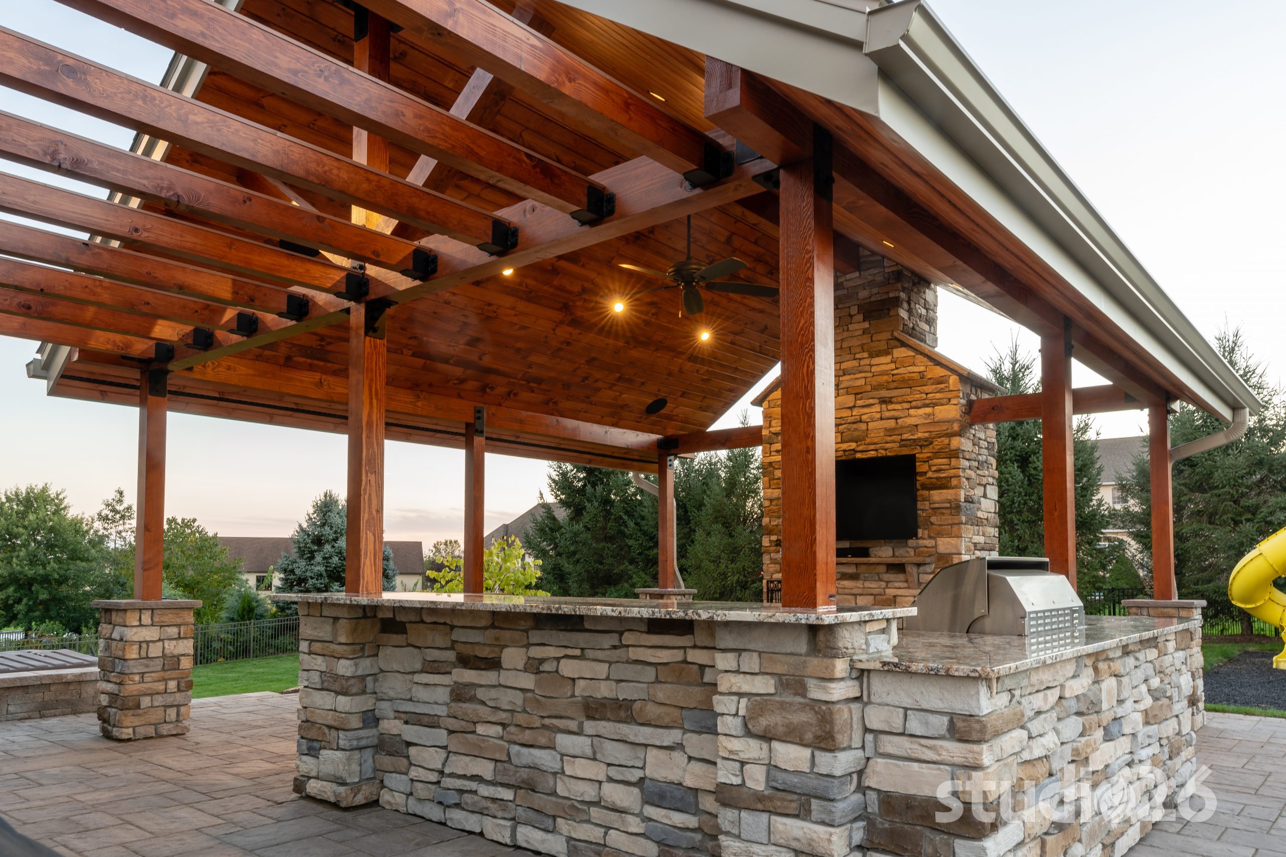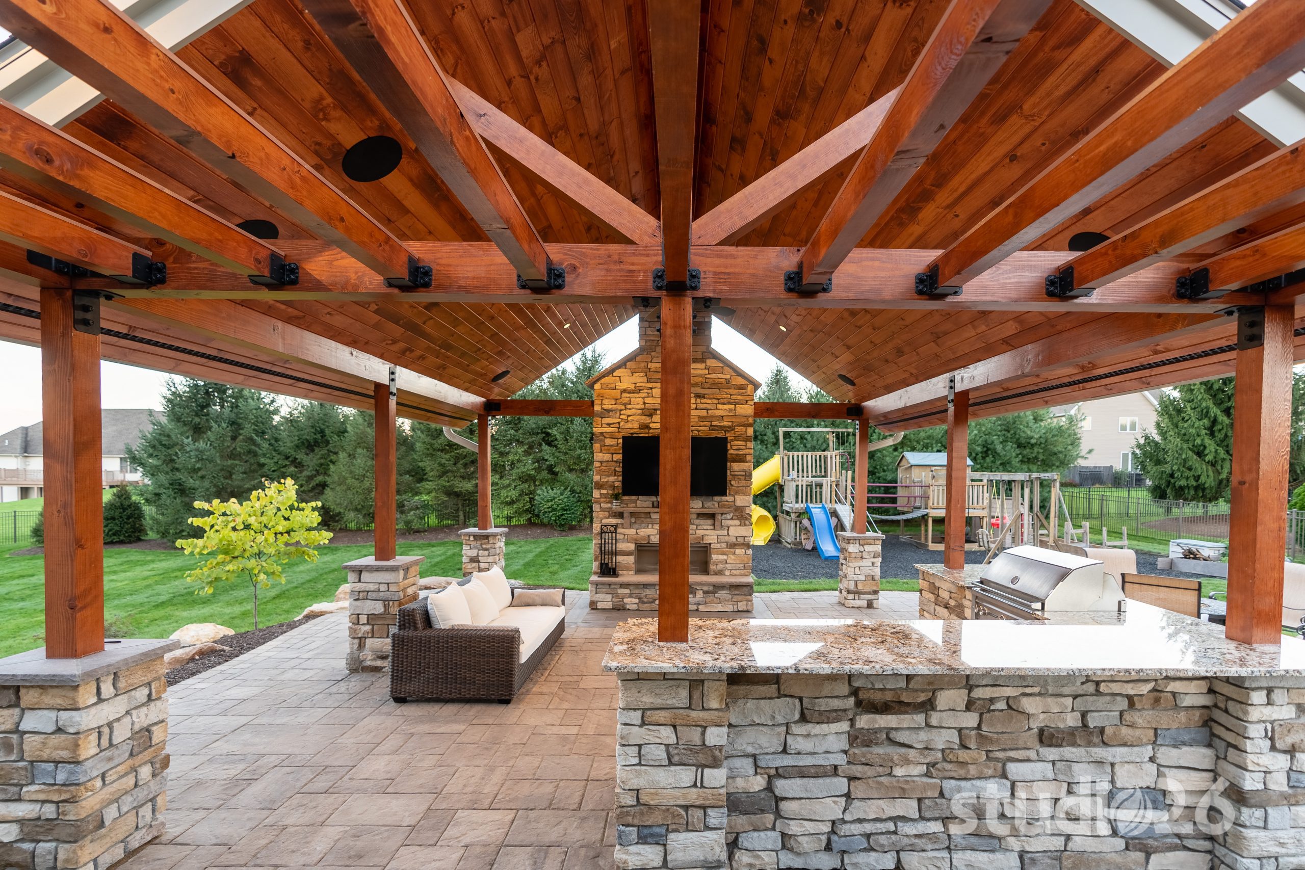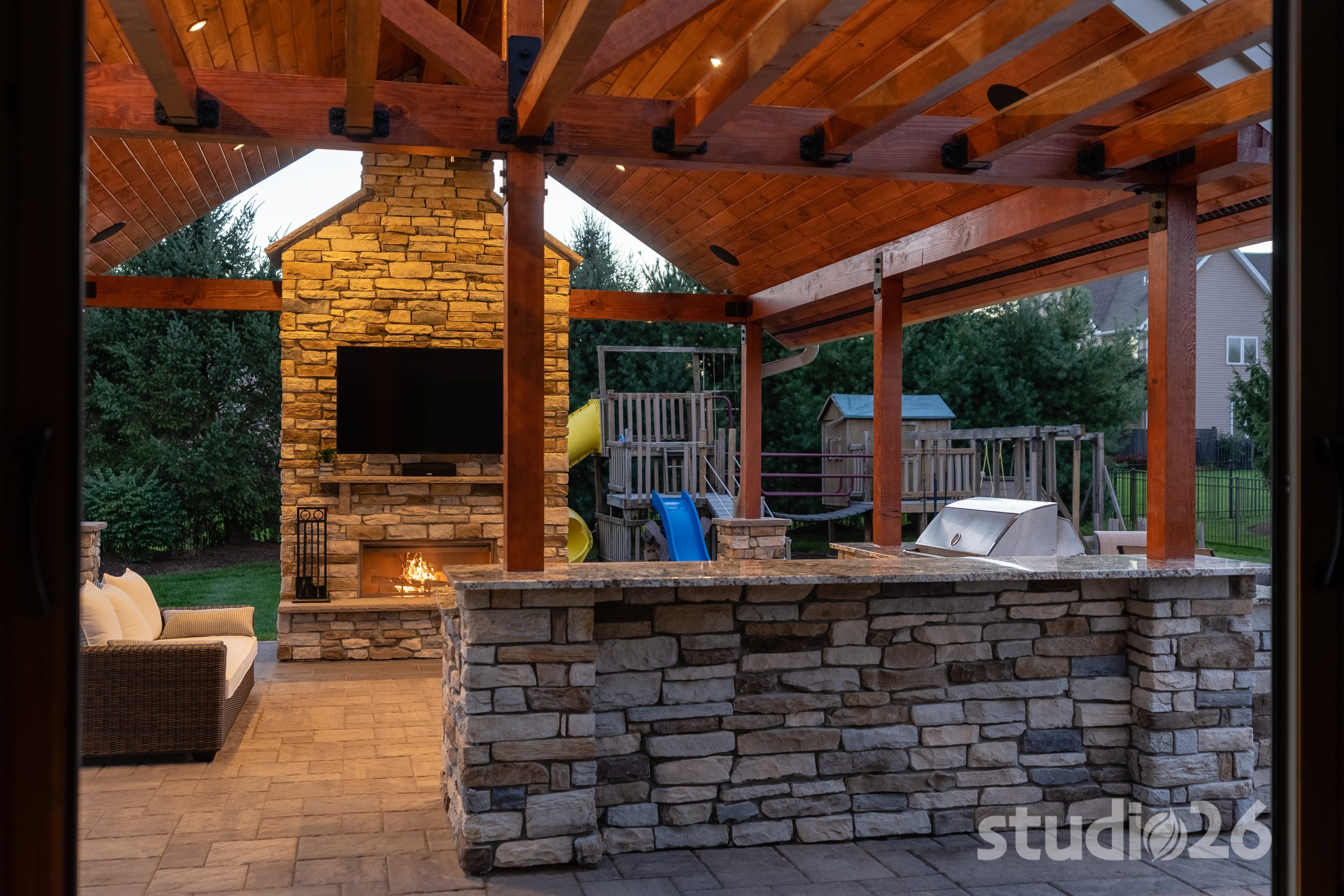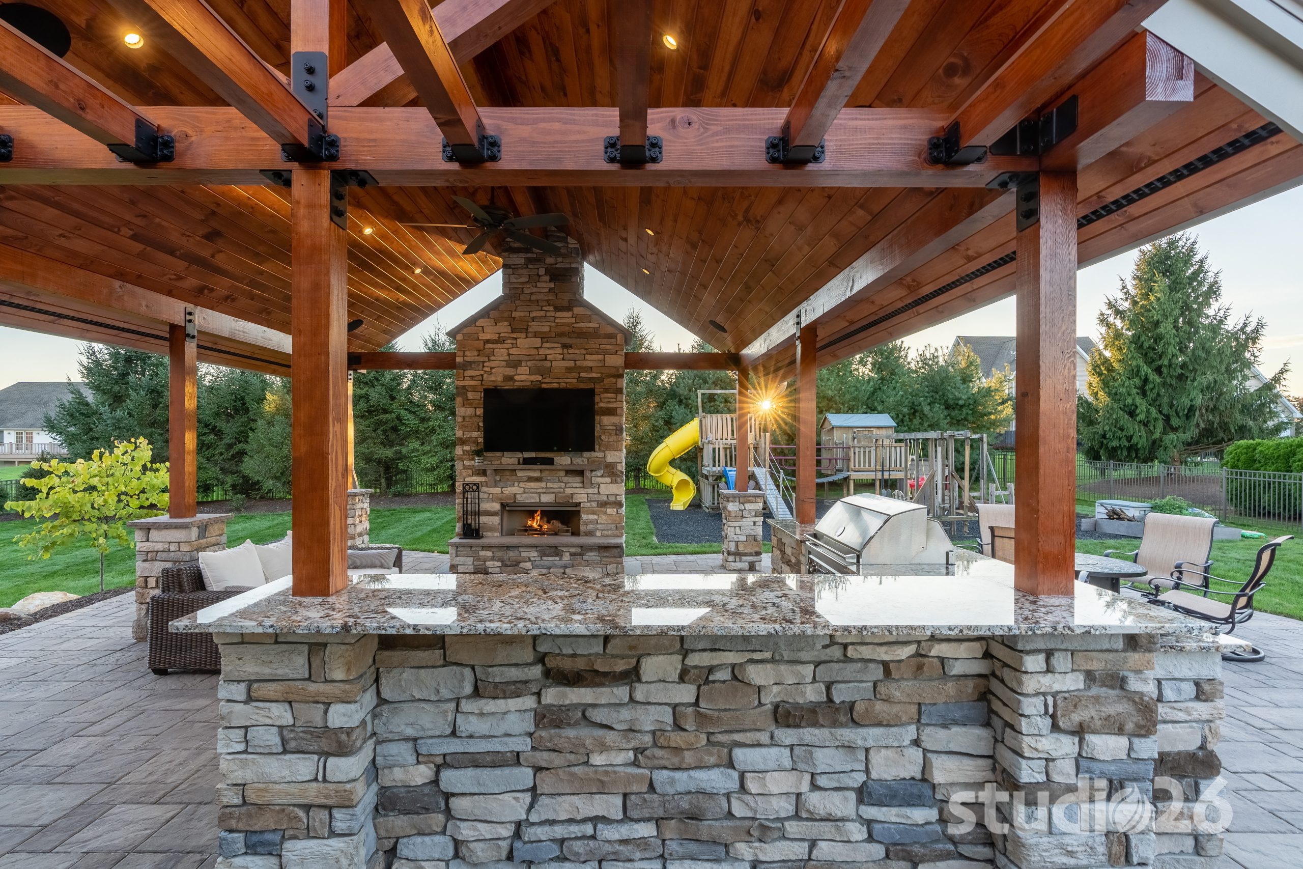 Stone Veneer, Douglas Fir Beams & Posts, Paver Patio & Steps