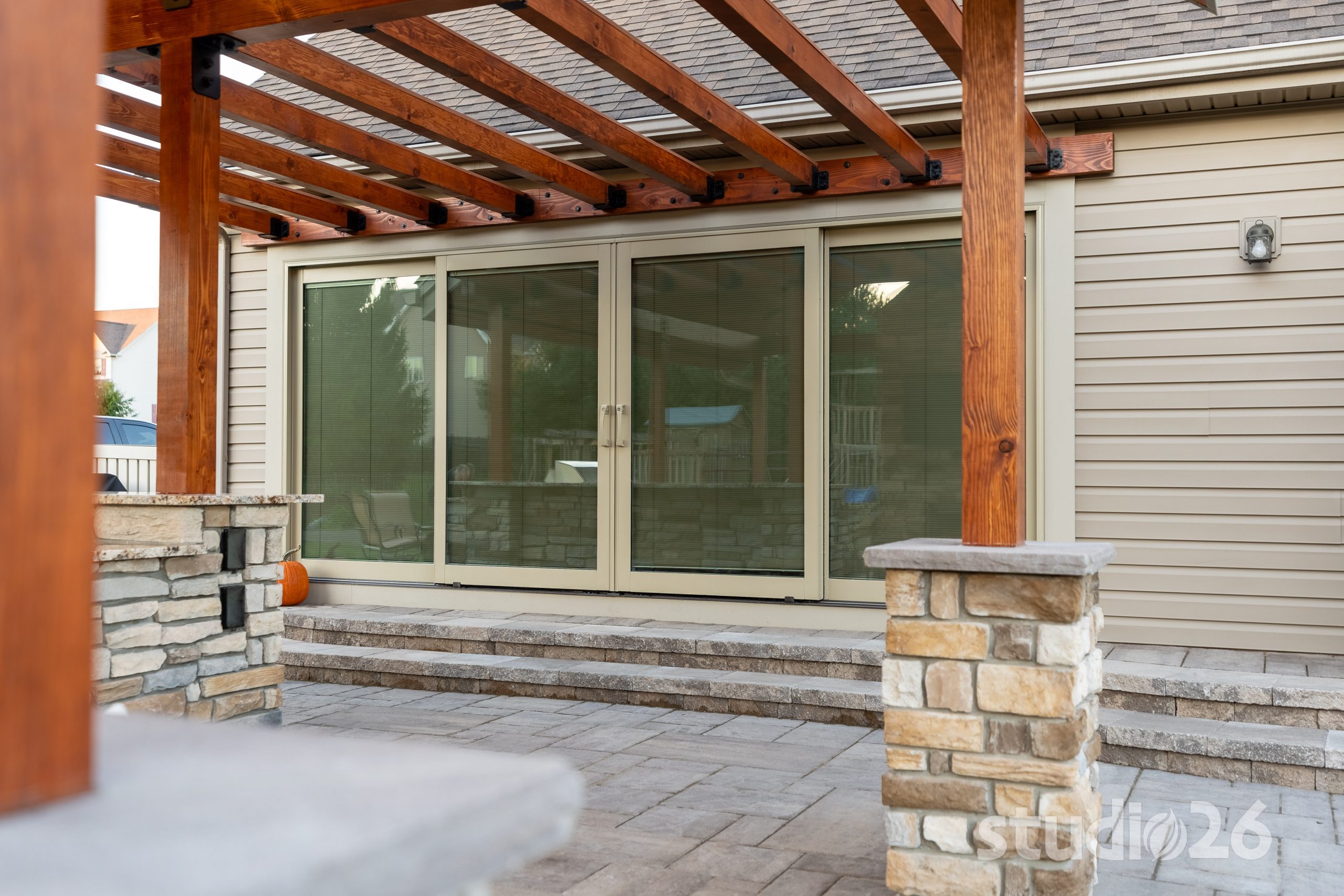 For a better connection between the interior of the Great Room and our new outdoor living area, we replaced two pairs of windows with an expansive quad slider unit; which really helped marry the two spaces. Furthermore, since the community’s Deed Restrictions required that no separate outbuildings could be constructed, we introduced a unique, clean-lined pergola structure interconnecting both structures.