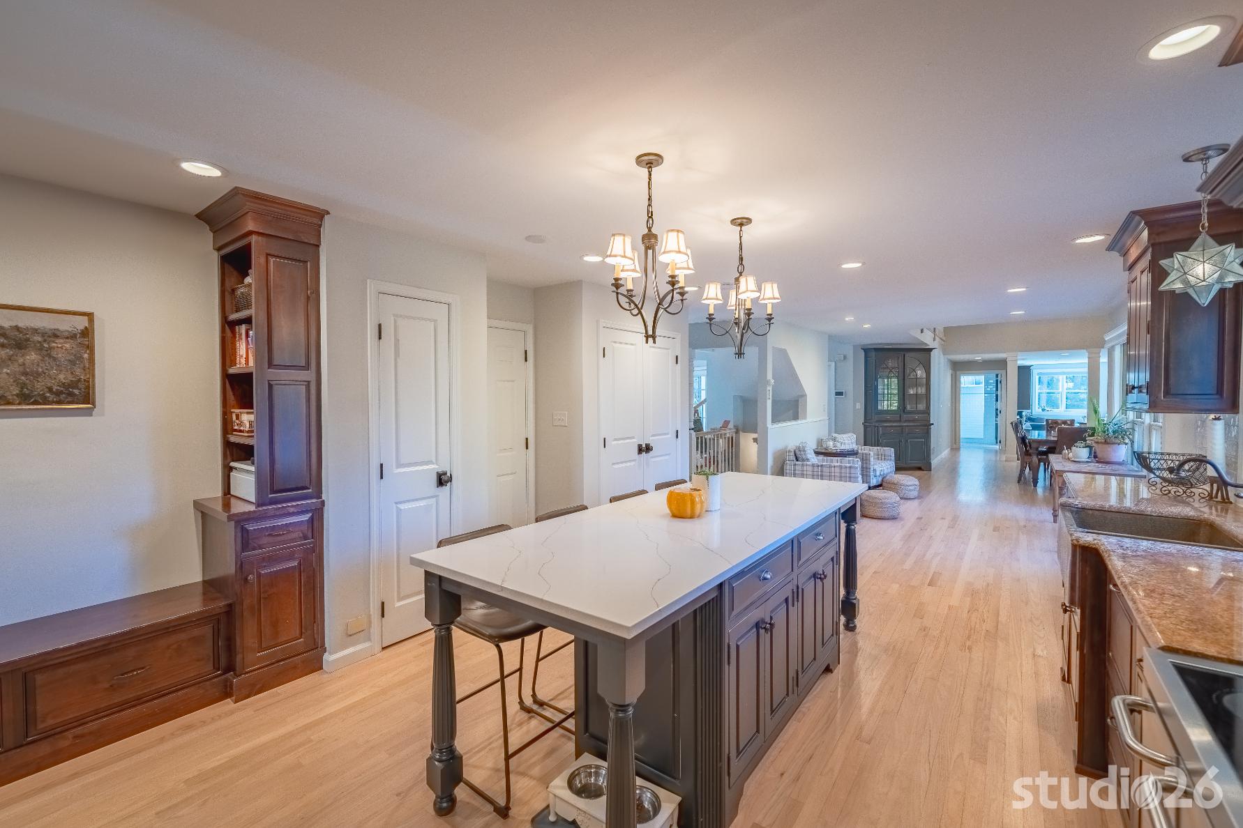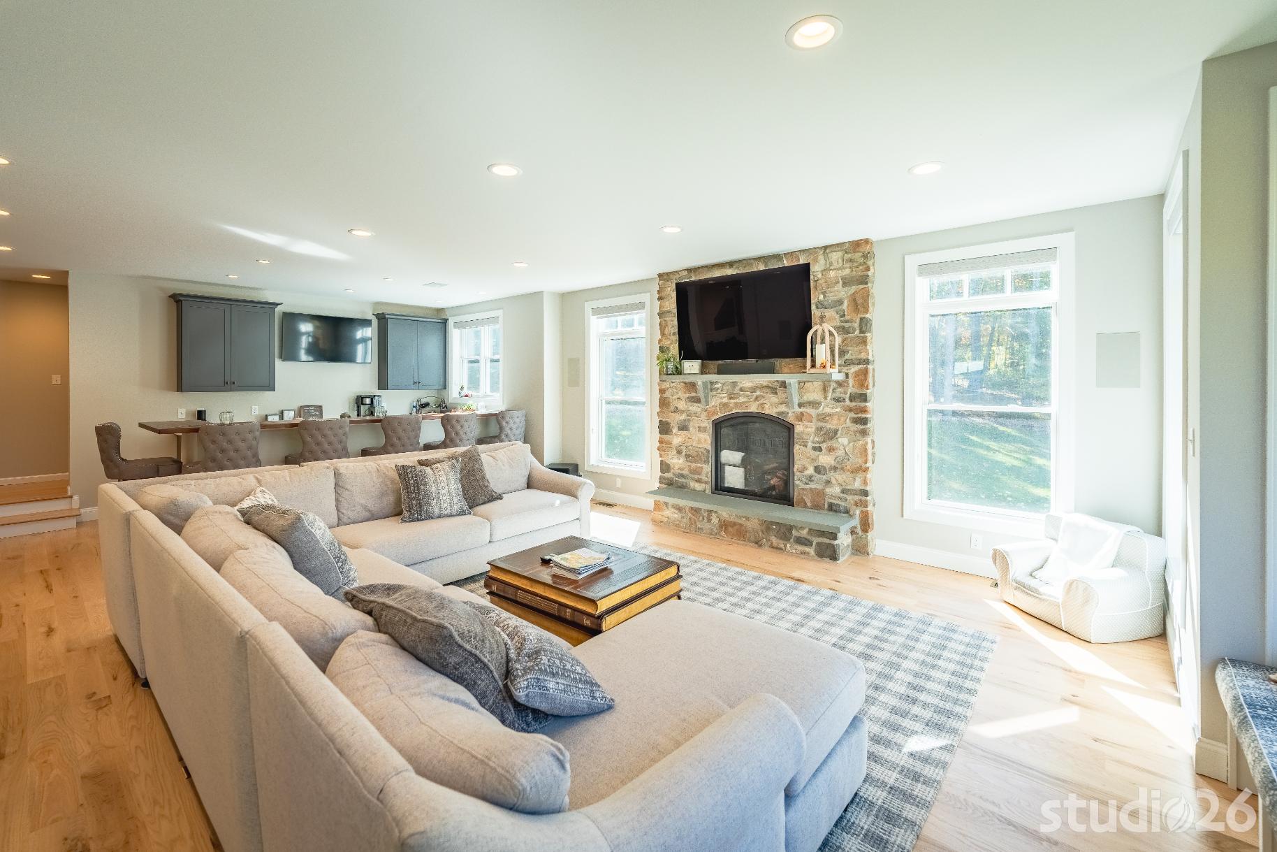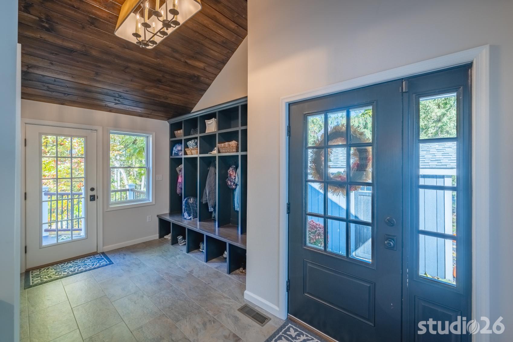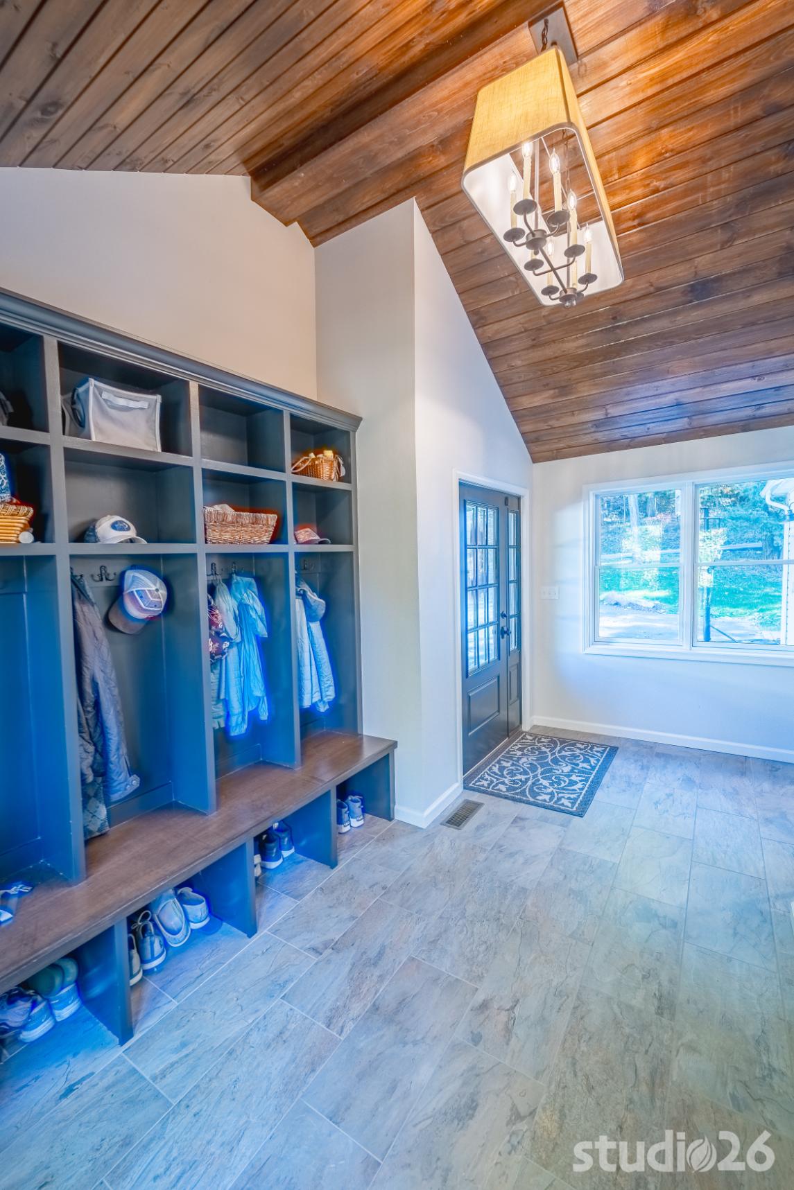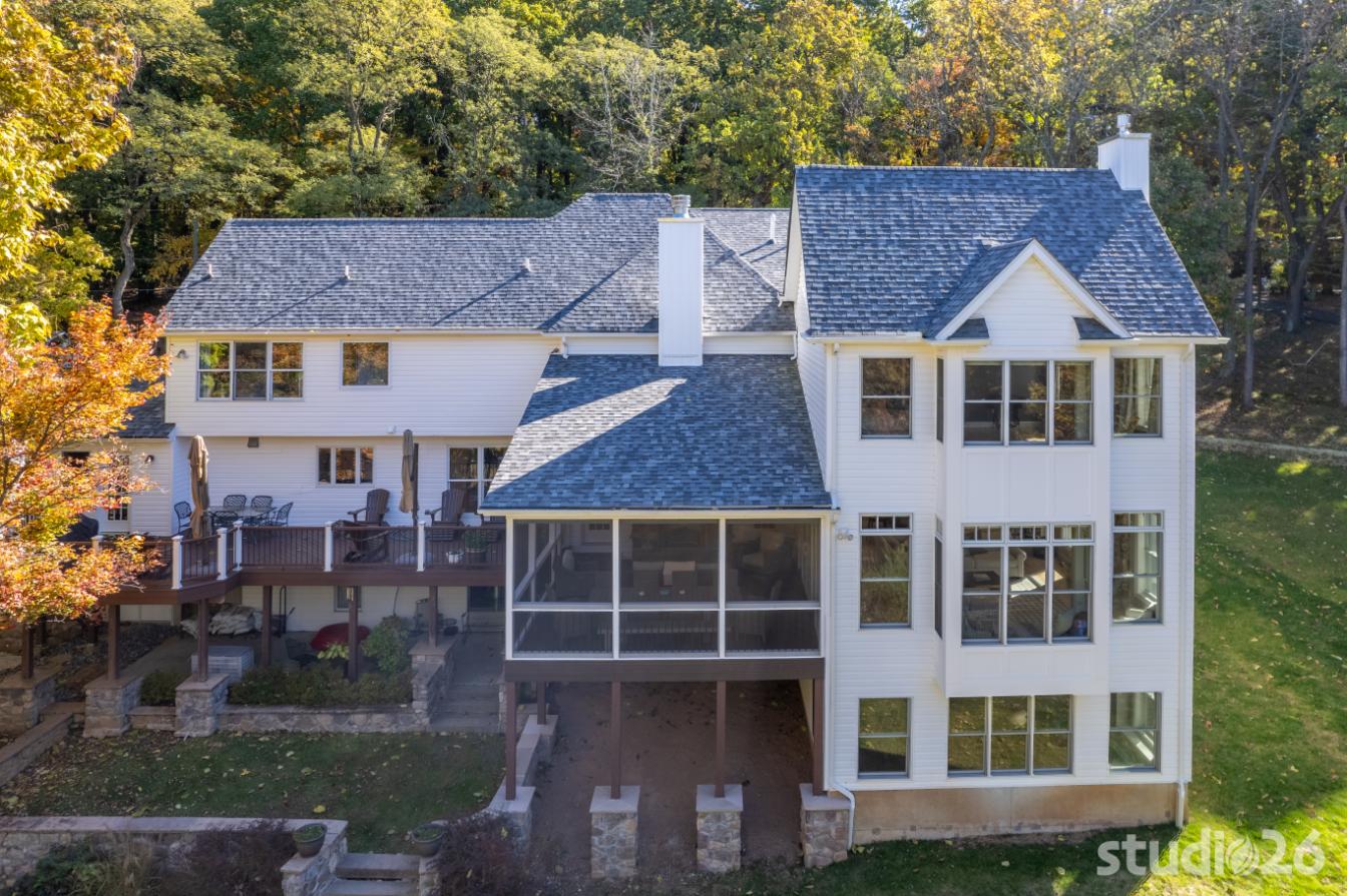For the addition/renovation portion of the project, there were essentially four primary needs: create a mud room since they didn’t previously have one, create a large open play area for their three kids, create a first floor bedroom for visiting in-laws, and create a new master suite oasis with dedicated his/her walk-in closets and a larger, more up-to-date bathroom. Important secondary needs included creating a new home office space that had access to direct natural light, creating a new laundry room up on the second floor (instead of the in the basement where it was originally located), expanding the kitchen and increasing its connectivity to the rest of the home, and creating a new three to four season outdoor covered screened porch. As is common with almost any addition project, we also restored many smaller portions of the home to help deliver a new home that is difficulty to delineate old from new.