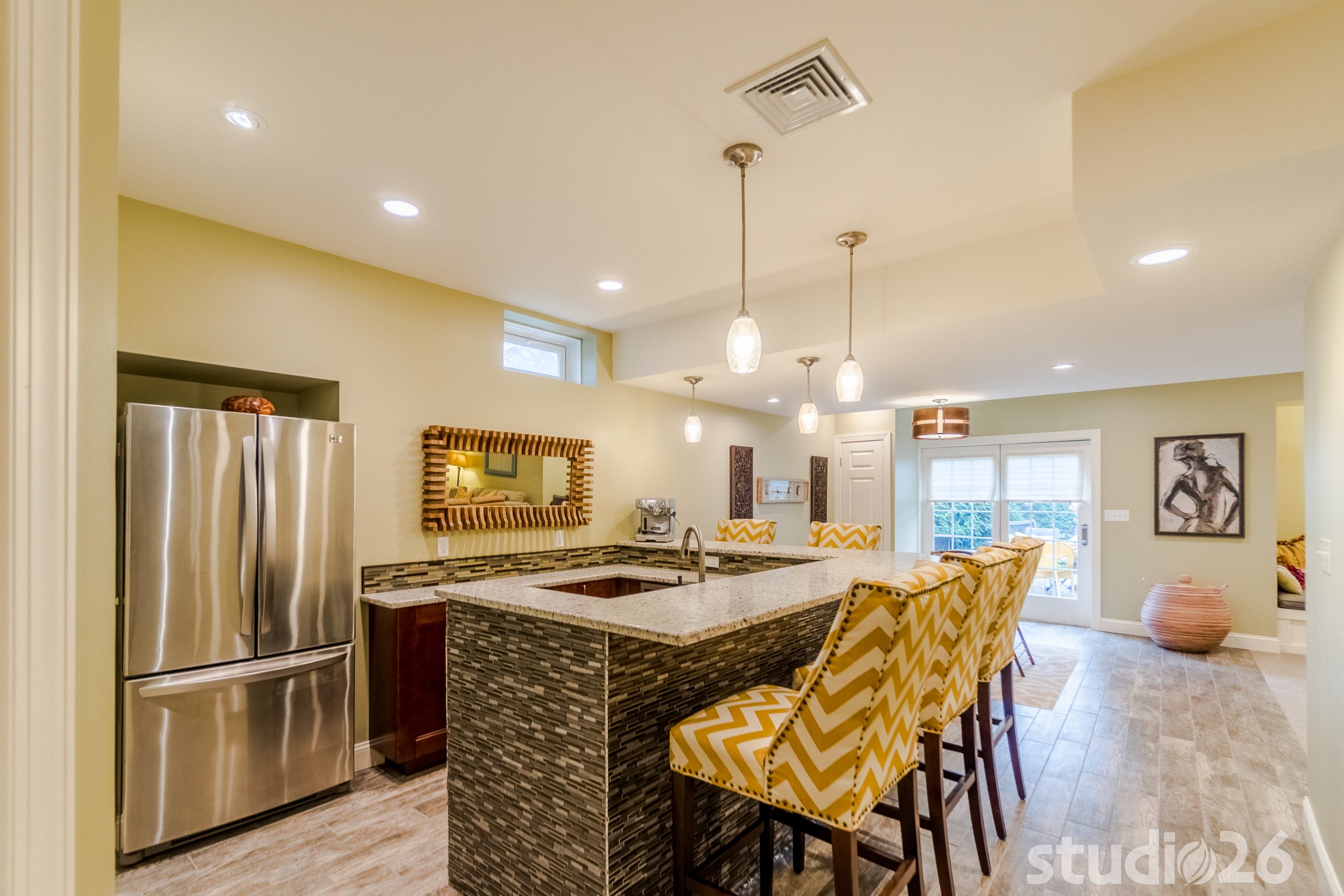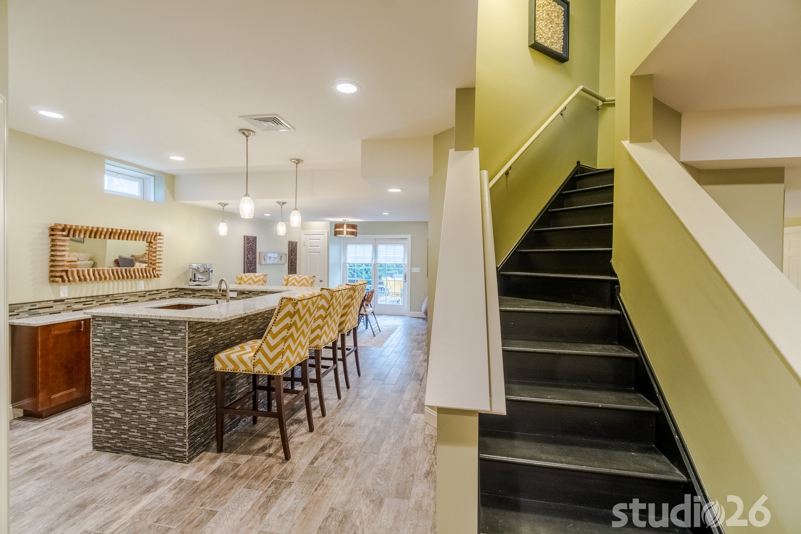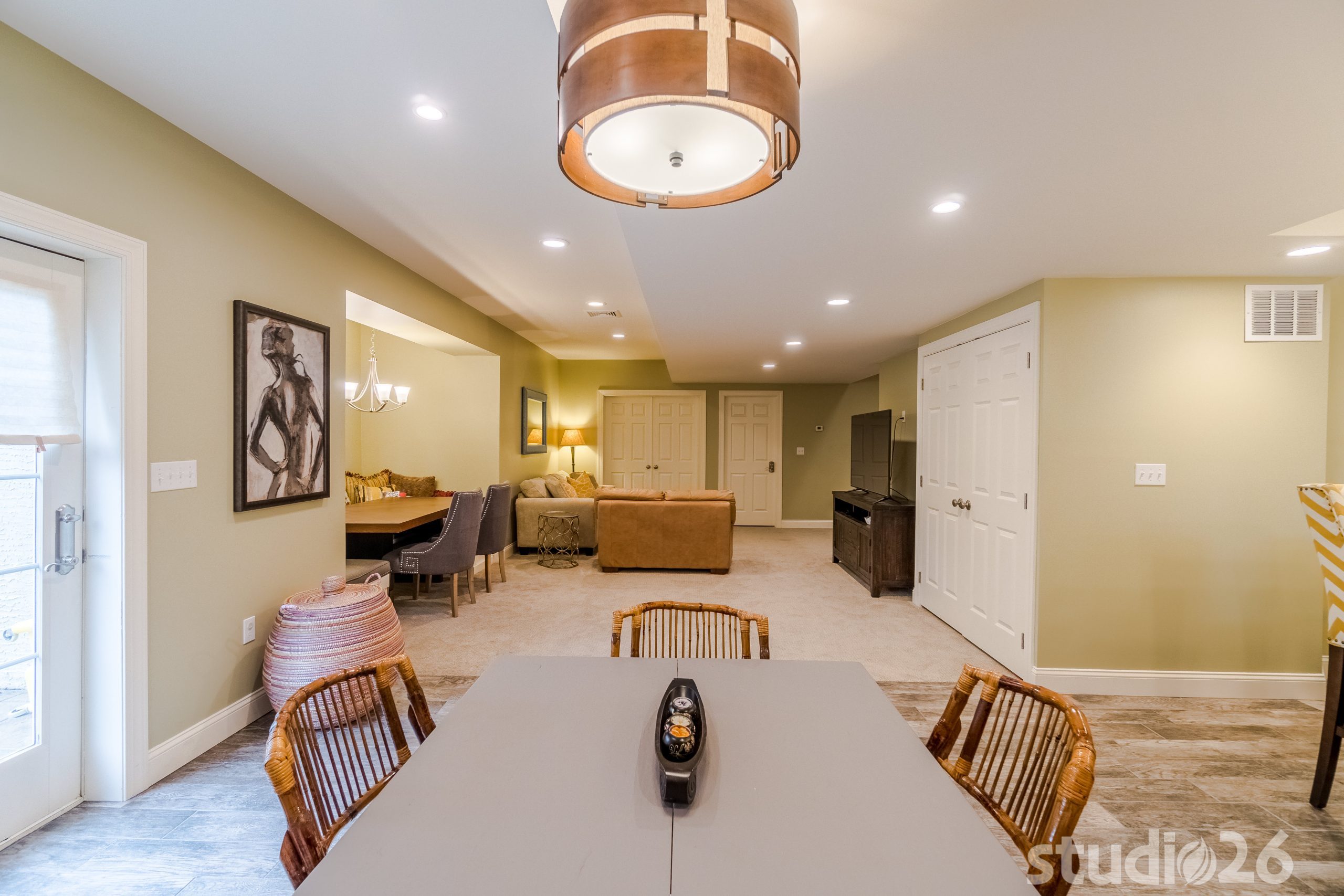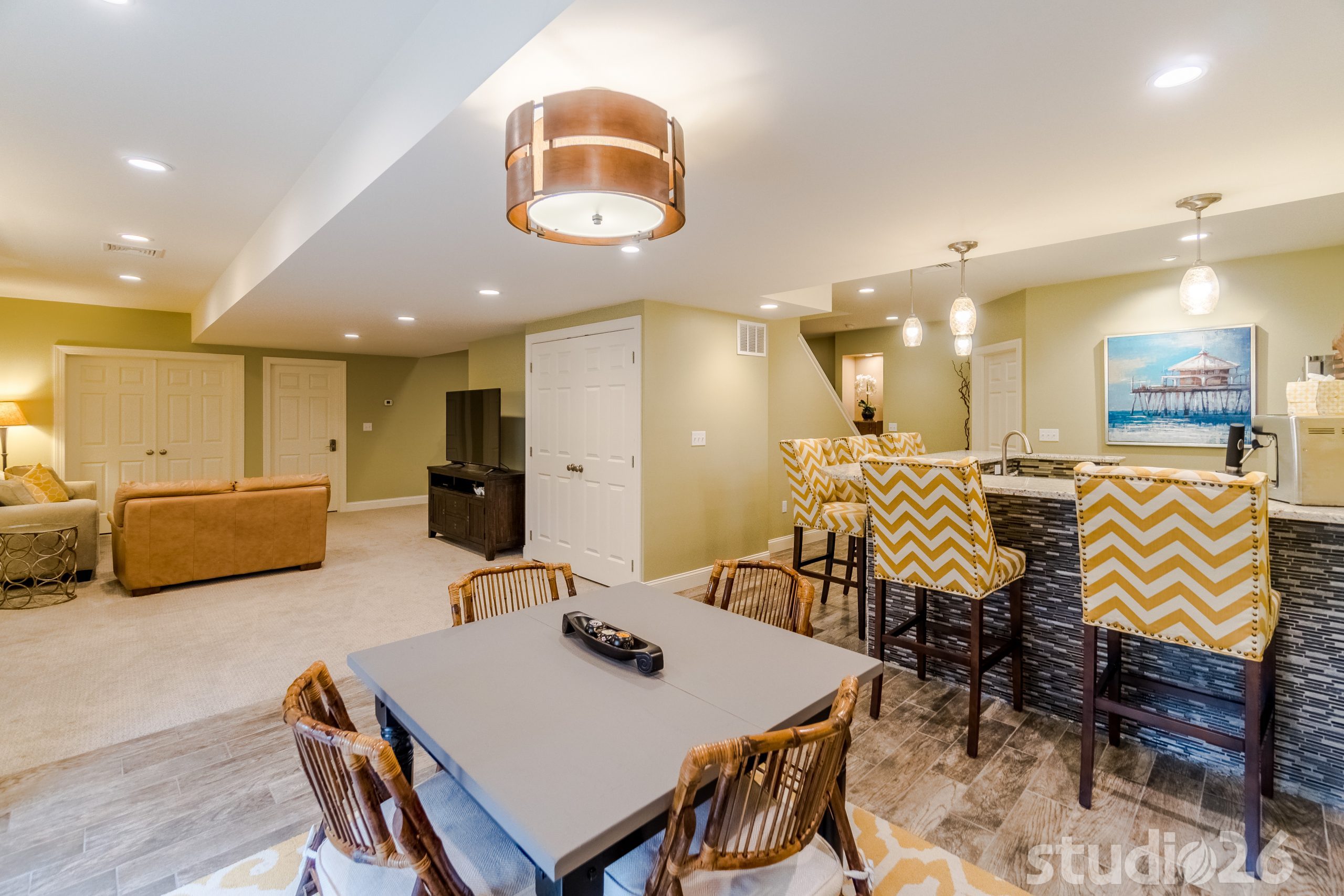 Maintaining an open, yet functional floor plan was critical for our client. In addition to designing a nice comfortable flow around the central staircase and mechanical room, we were charged with the task of creating some distinct entertaining areas. To start, we began by modifying the walls of the central staircase to open up more fully to both sides of the basement. On one side rests the kids’ portion of the basement where they can have fun and play freely, while the other side into the rear of the home where the walkout basement invitingly brings in rays of natural light rests the bar, cocktail area, and banquet and TV lounge area. The bar is an anchoring element for the entire space where our client can entertain their guests for years to come. Directly adjacent to the bar is a charming cocktail area that is distinguished by a custom carpet inlay installed flush with the durable and low-maintenance, distressed hardwood-look floor tile.