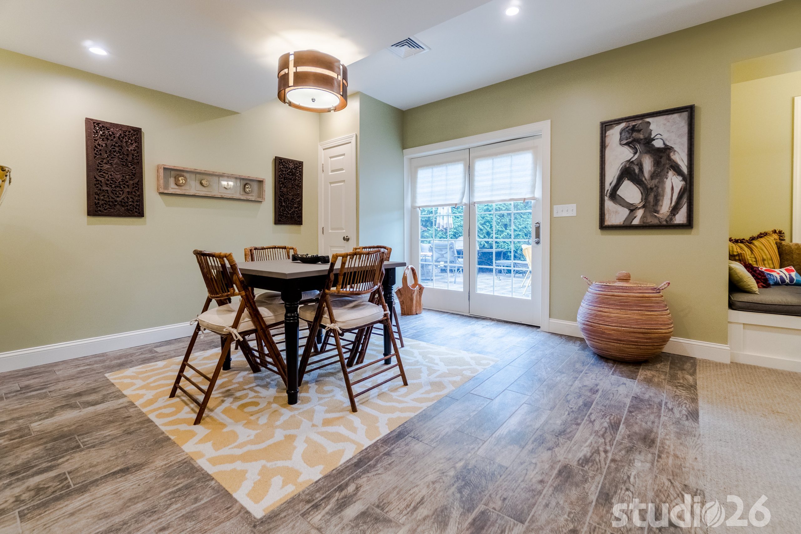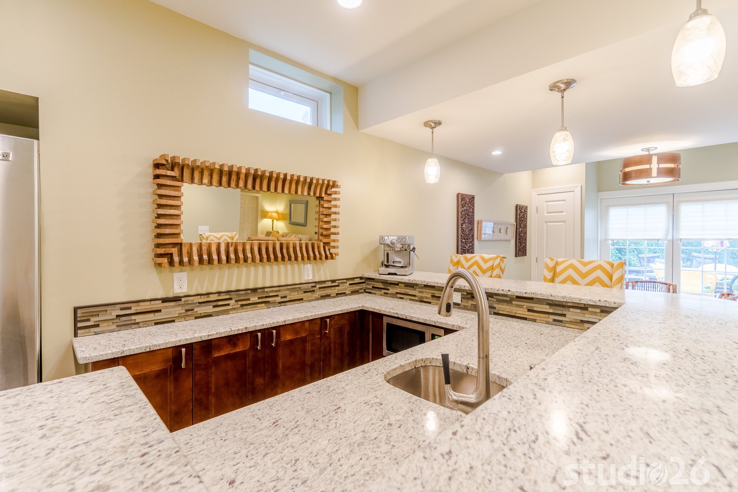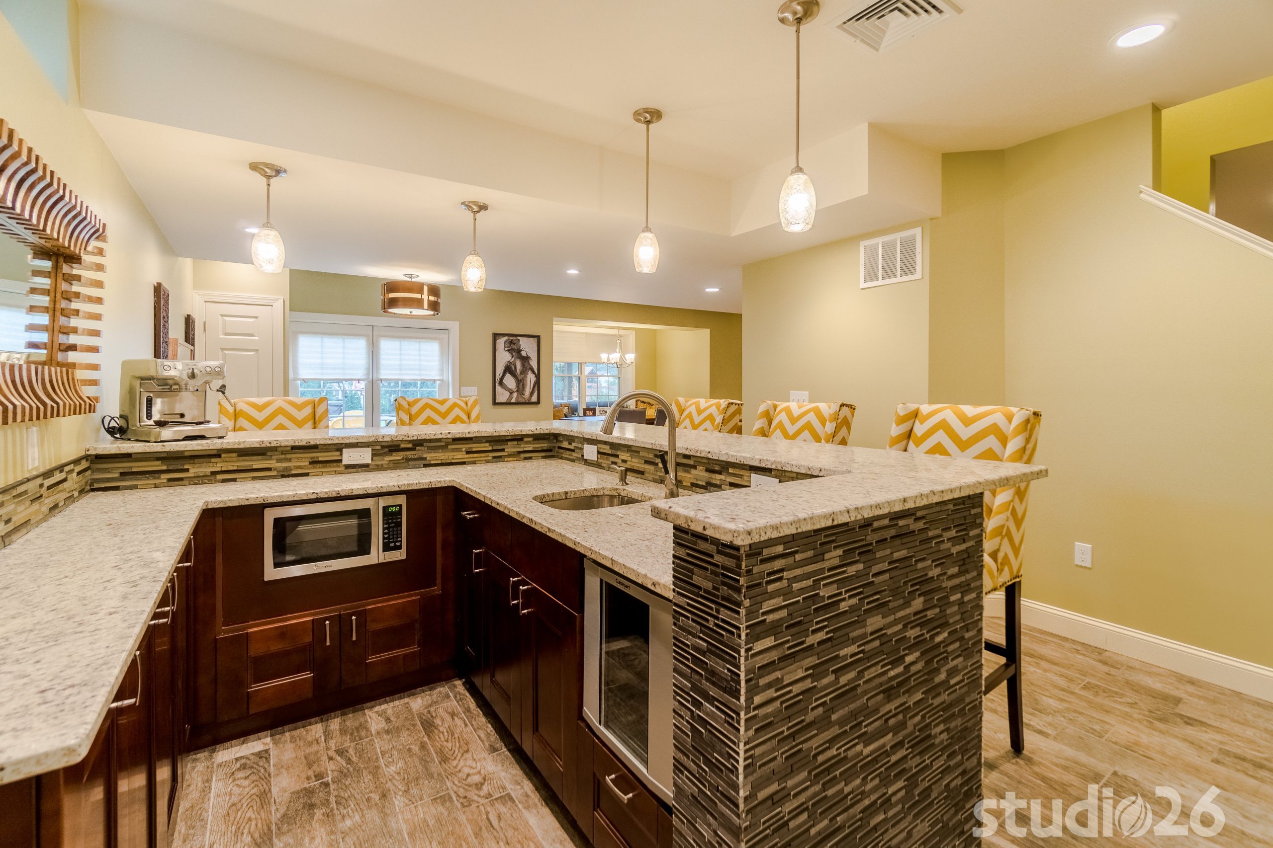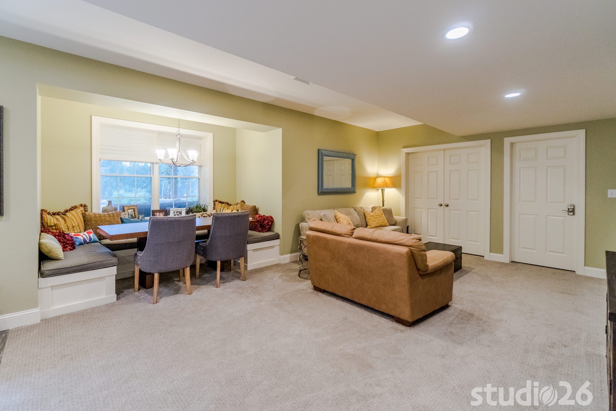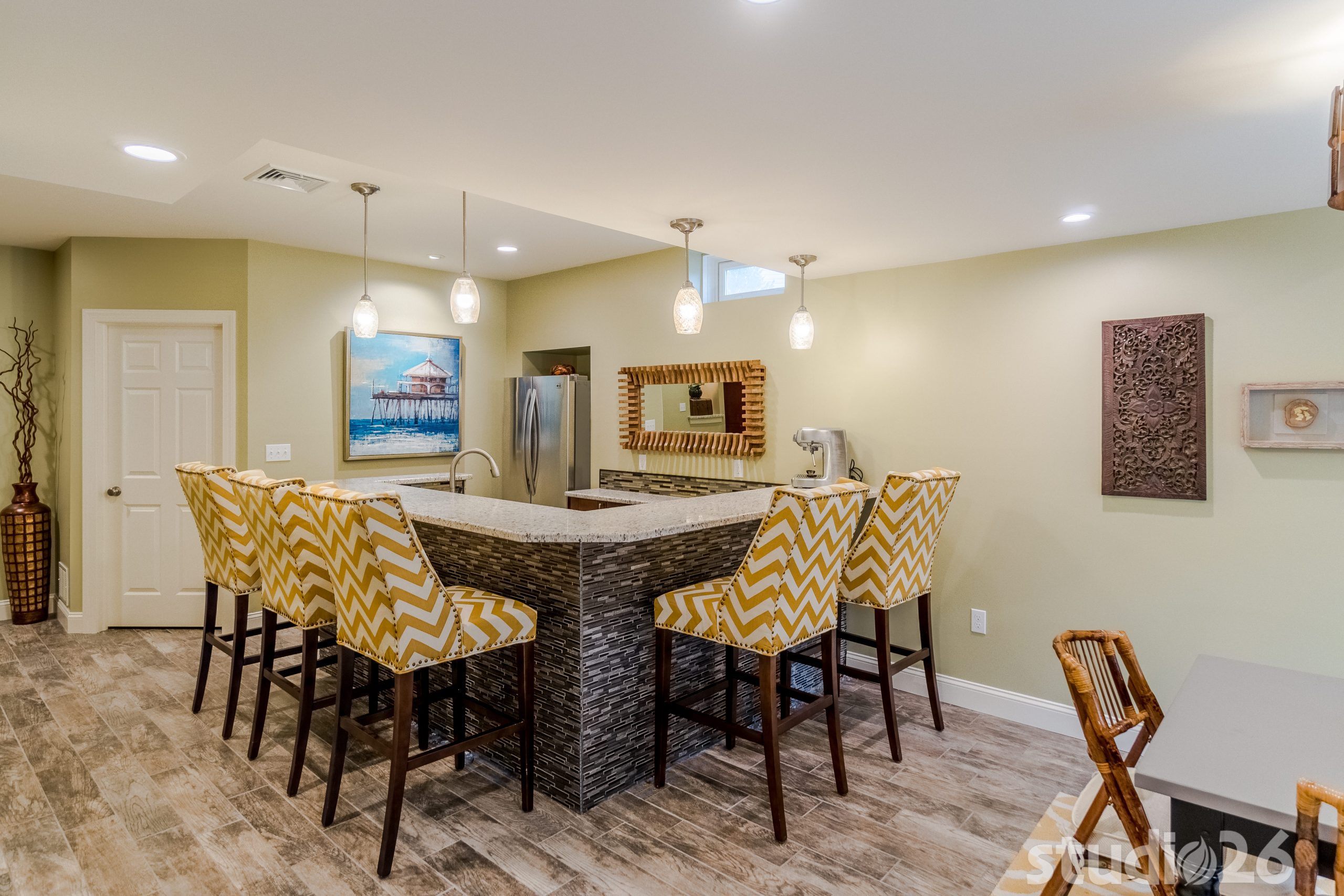 Maintaining an open, yet functional floor plan was critical for our client. In addition to designing a nice comfortable flow around the central staircase and mechanical room, we were charged with the task of creating some distinct entertaining areas. To start, we began by modifying the walls of the central staircase to open up more fully to both sides of the basement. On one side rests the kids’ portion of the basement where they can have fun and play freely, while the other side into the rear of the home where the walkout basement invitingly brings in rays of natural light rests the bar, cocktail area, and banquet and TV lounge area. The bar is an anchoring element for the entire space where our client can entertain their guests for years to come. Directly adjacent to the bar is a charming cocktail area that is distinguished by a custom carpet inlay installed flush with the durable and low-maintenance, distressed hardwood-look floor tile.