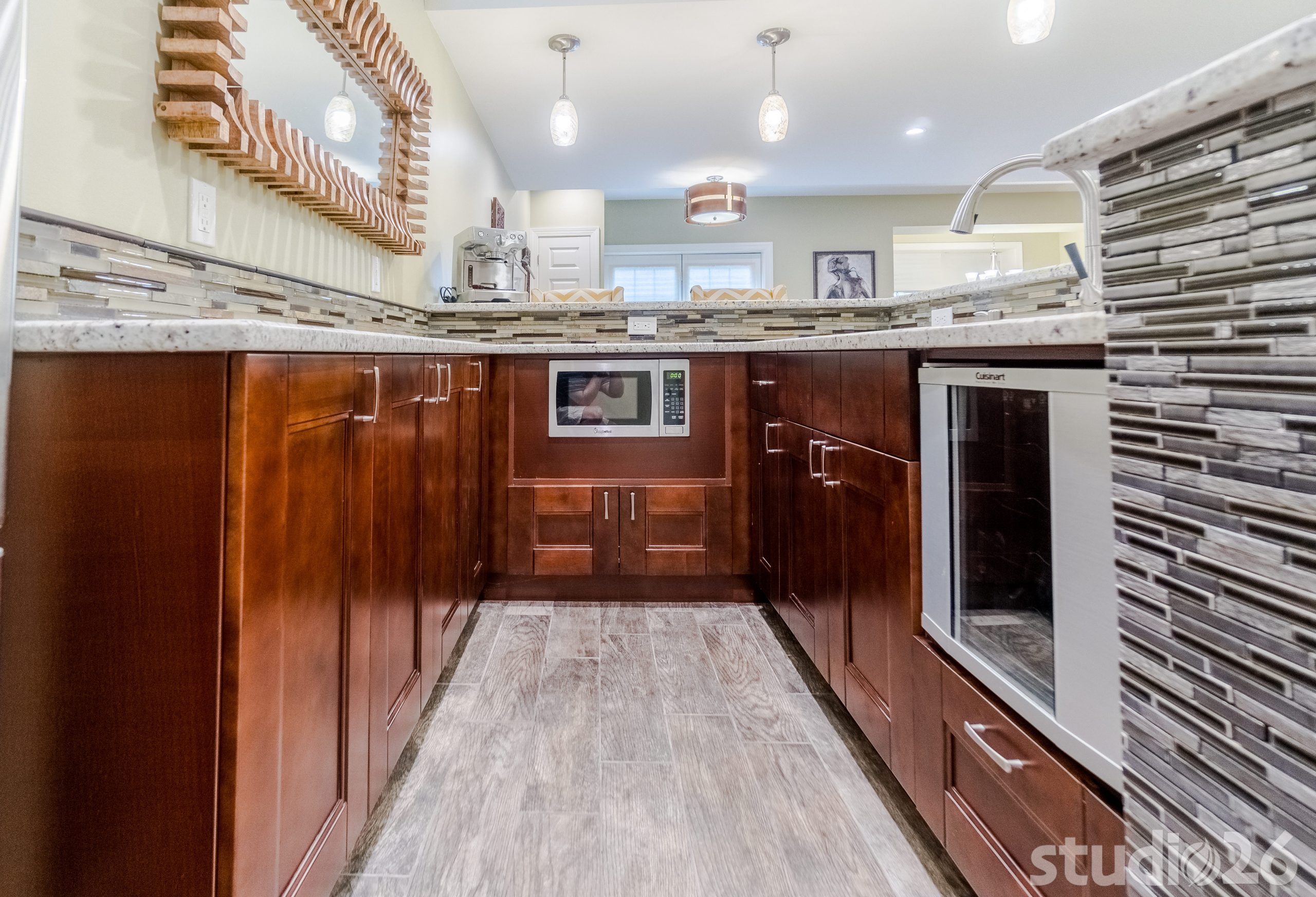 Concrete Tile Flooring, Hardwood-Look Tile Flooring, Carpet, Glass Tile Backsplash