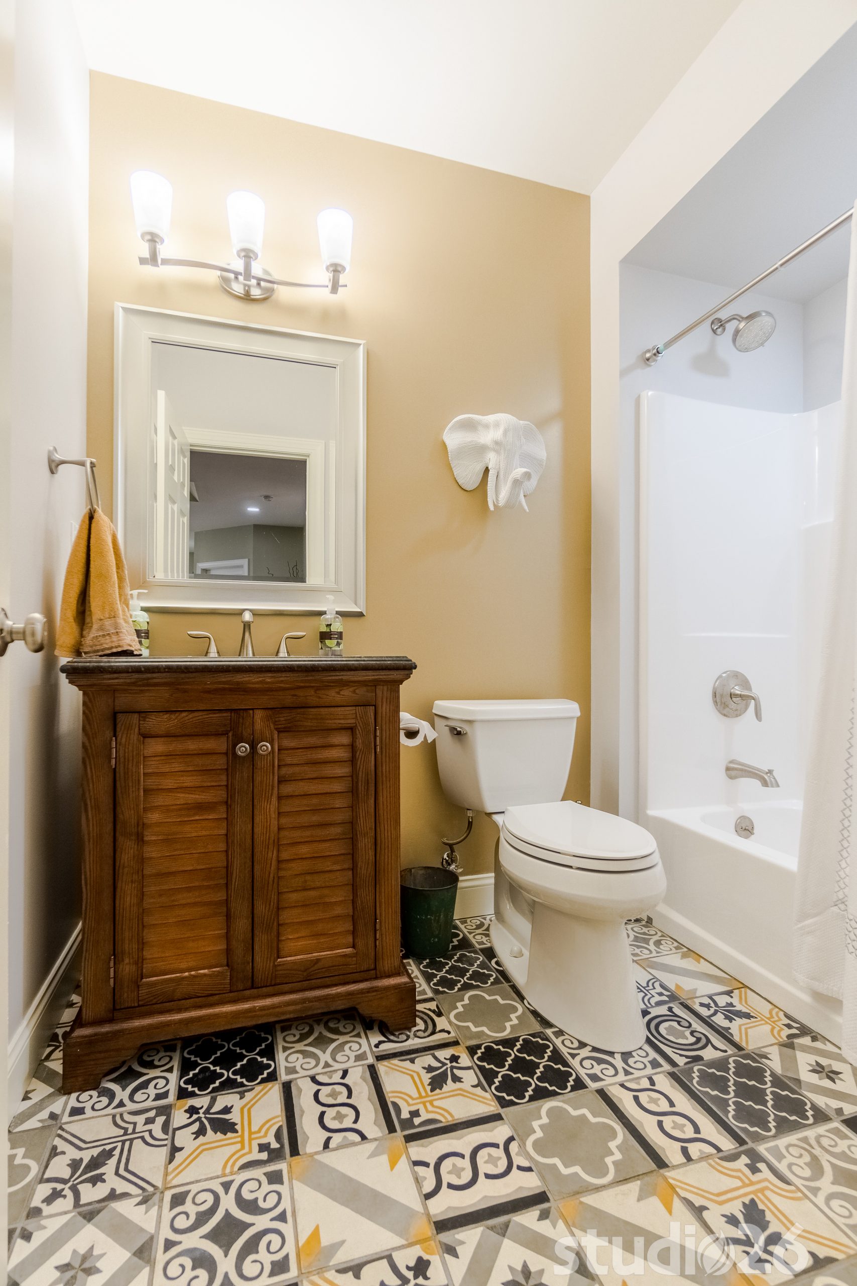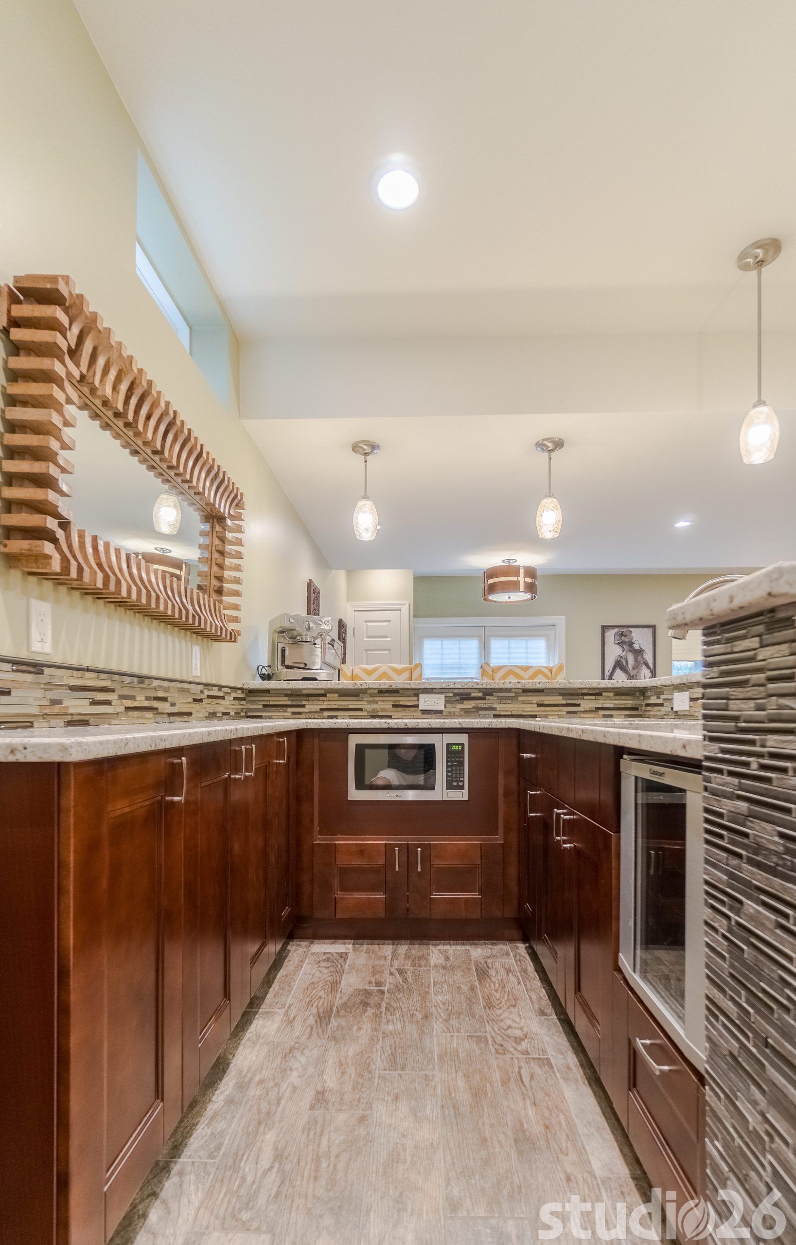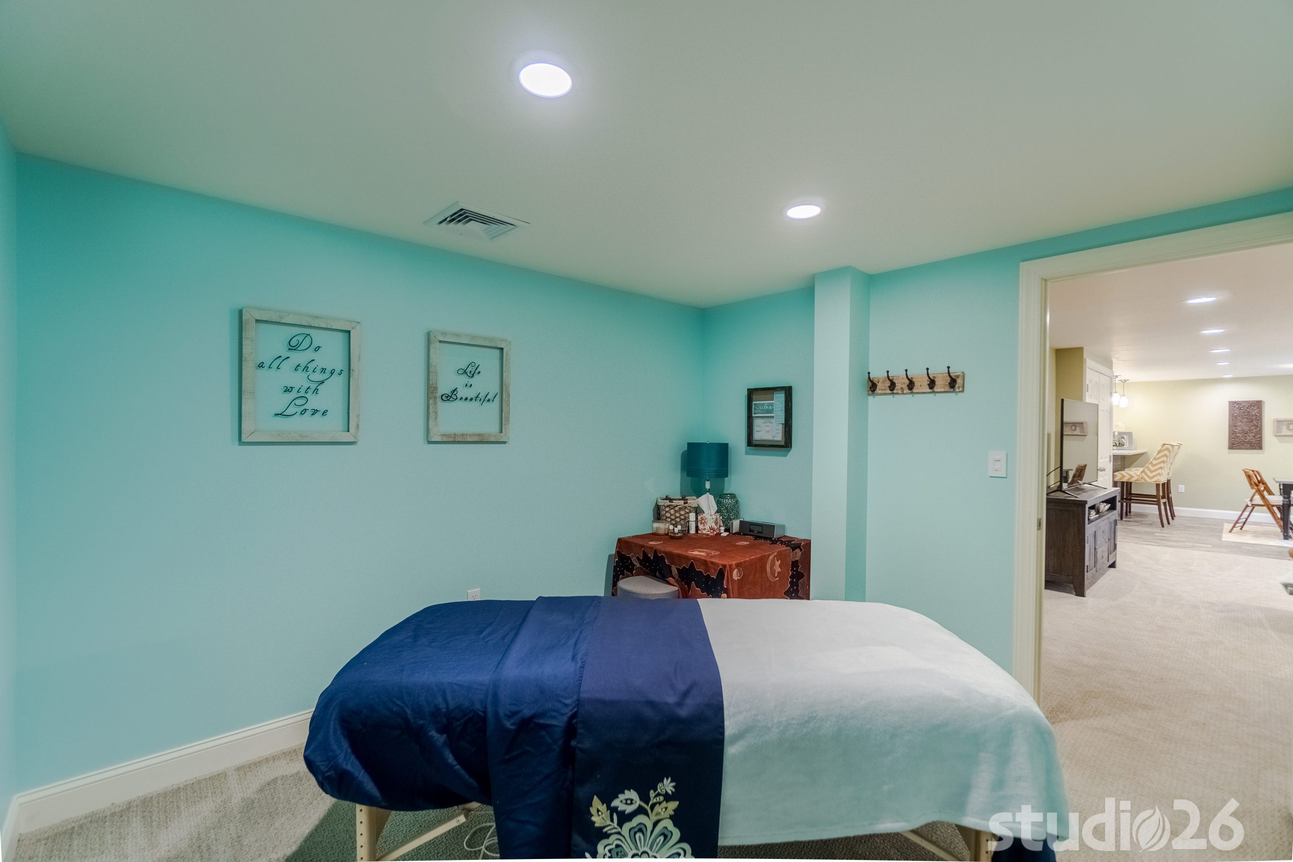 Nearby the cocktail area is a custom built-in banquette that was creatively designed into the home’s existing rear bumpout. On the opposite side of the banquette and TV lounge area, is a relaxing massage room and separate large storage room. And tucked comfortably adjacent to the office is a full bathroom with refreshingly unique concrete tiles.