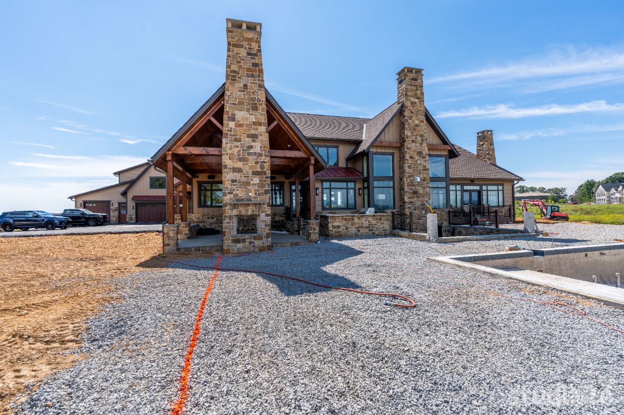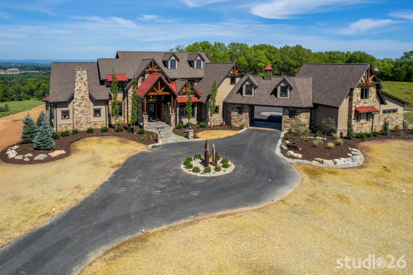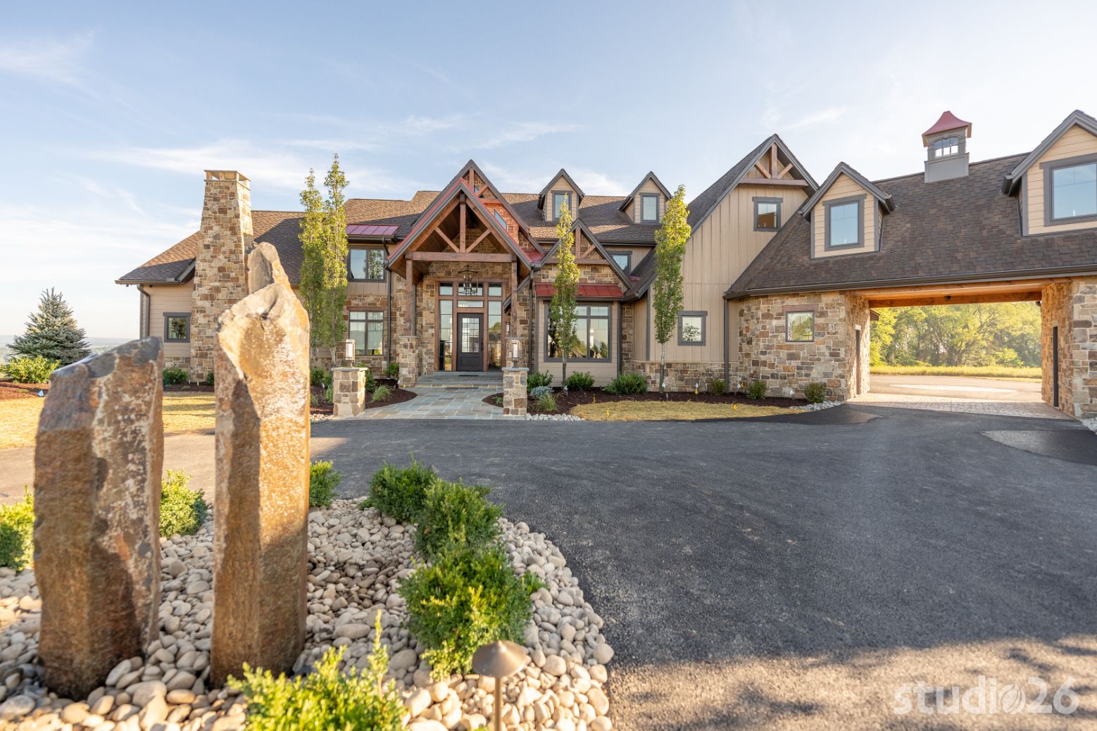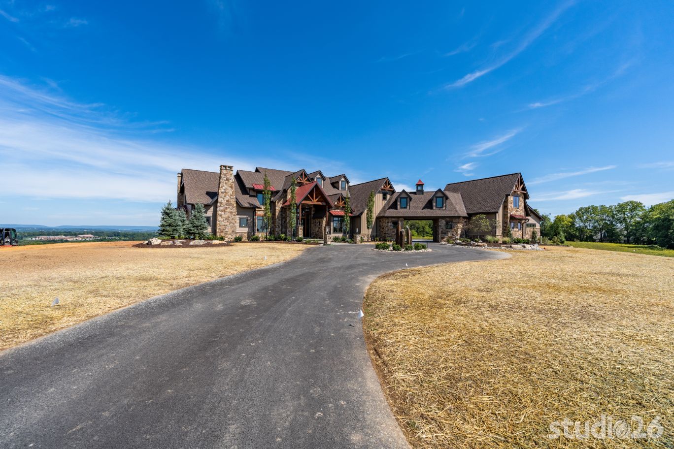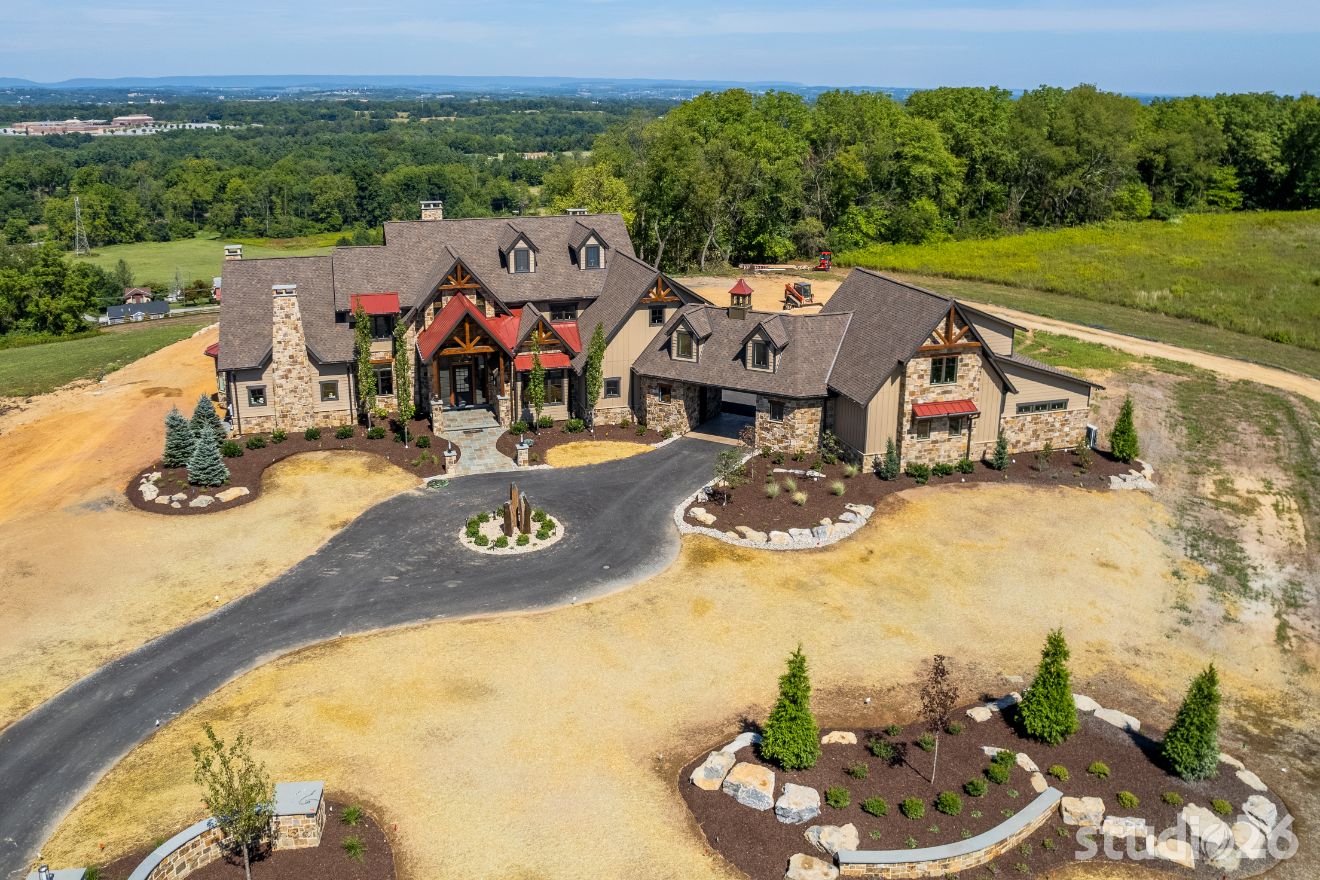 Introducing profound luxurious living at its finest! Perched upon an amazing panoramic site with nearly 360 degree views, this high-performance Colorado Craftsman-inspired residence truly embraces its breathtaking setting all around. Upon arrival, its stunning presence provides an unmatched curb appeal with its tasteful blend of stone, composite wood siding, metal roofing, glazing, and detailed beamwork. The home’s graceful stance is quite memorable as it rests comfortably in a lush, serene landscape anchored by thoughtful bluestone walkways and patios and an inviting round-about driveway which leads through the quaint porte cochere into the vast motor court anchored by five distinct garage bays.