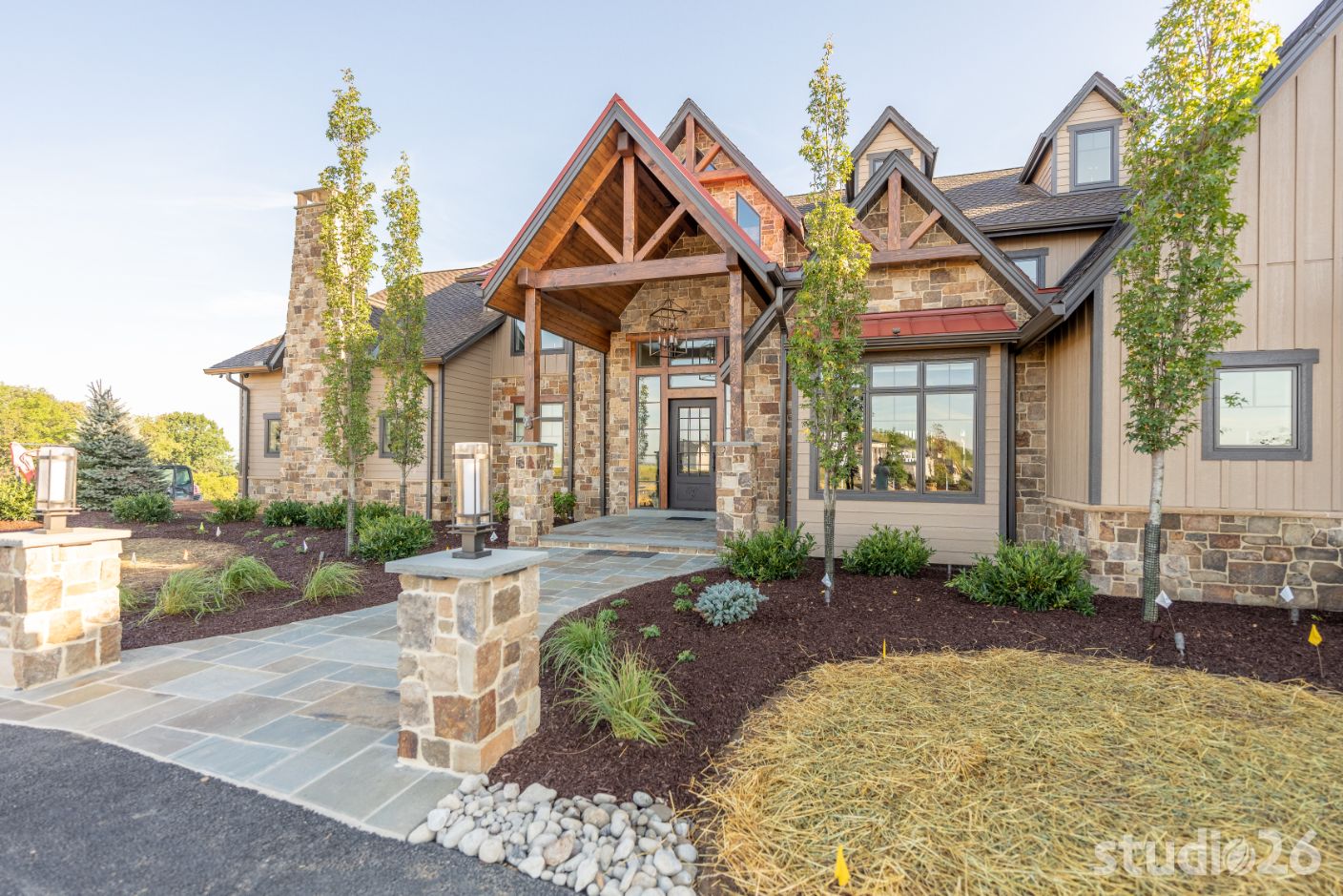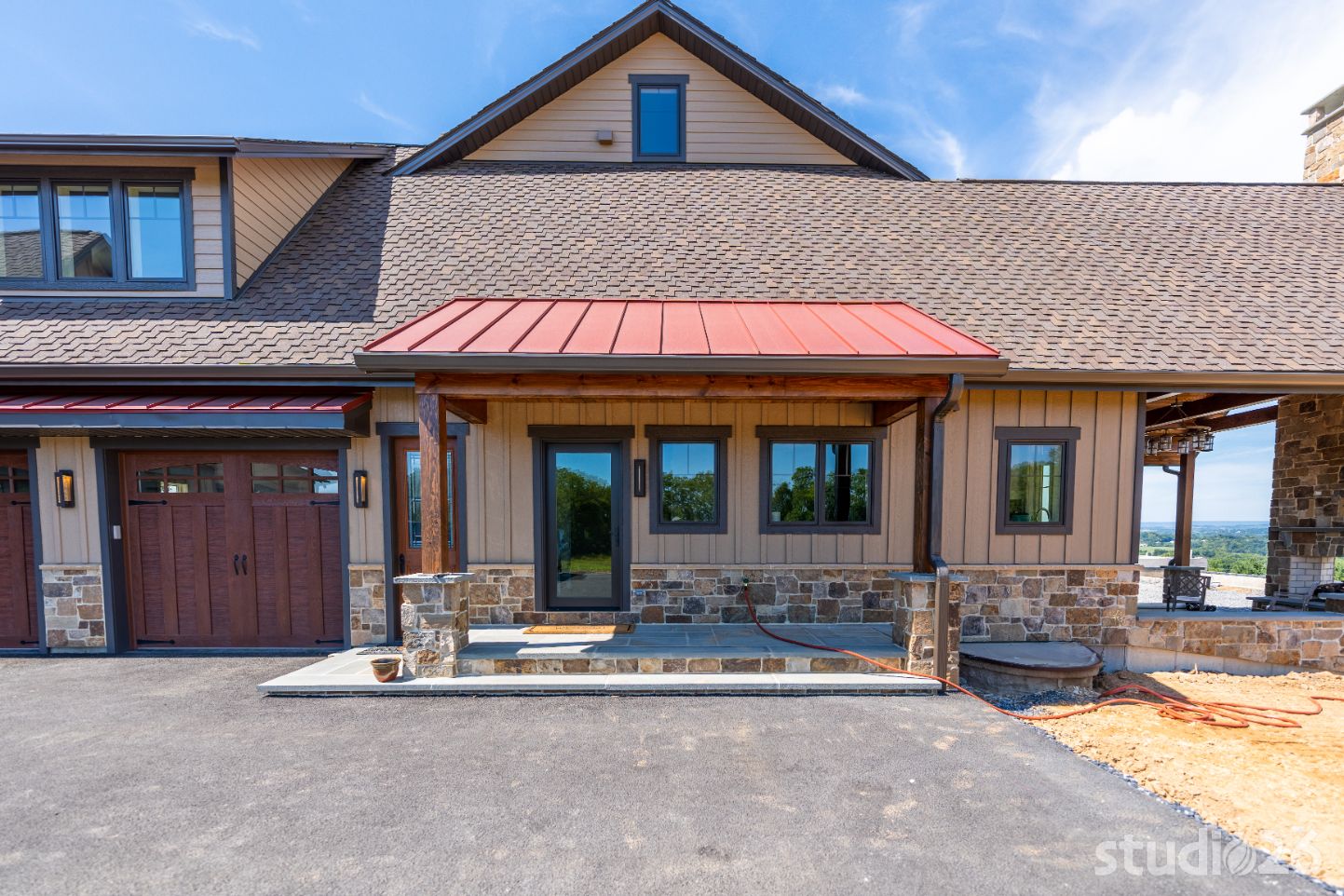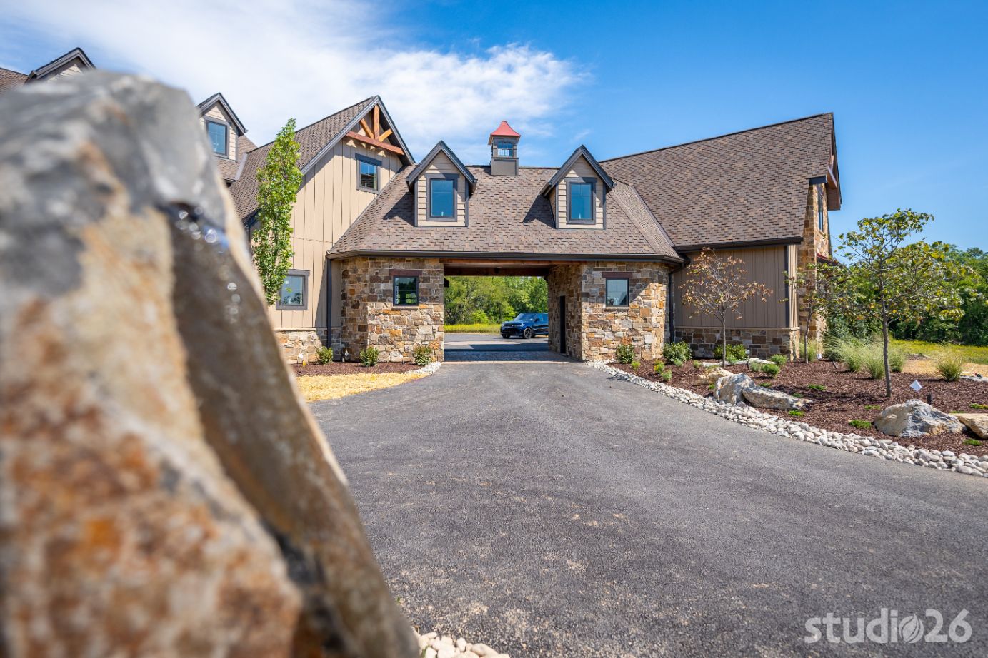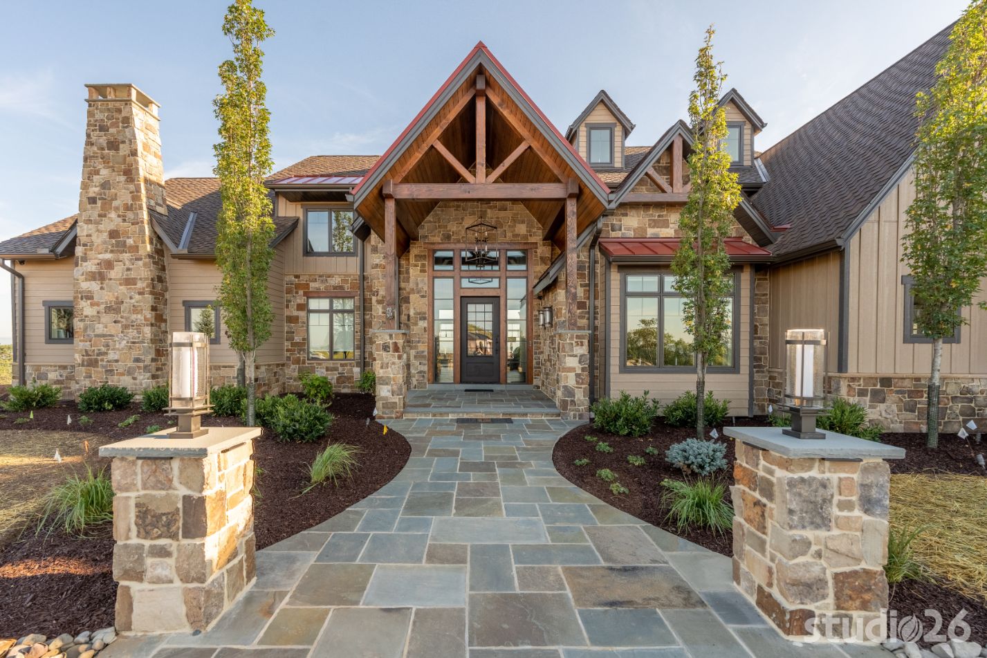 Introducing profound luxurious living at its finest! Perched upon an amazing panoramic site with nearly 360 degree views, this high-performance Colorado Craftsman-inspired residence truly embraces its breathtaking setting all around. Upon arrival, its stunning presence provides an unmatched curb appeal with its tasteful blend of stone, composite wood siding, metal roofing, glazing, and detailed beamwork. The home’s graceful stance is quite memorable as it rests comfortably in a lush, serene landscape anchored by thoughtful bluestone walkways and patios and an inviting round-about driveway which leads through the quaint porte cochere into the vast motor court anchored by five distinct garage bays.