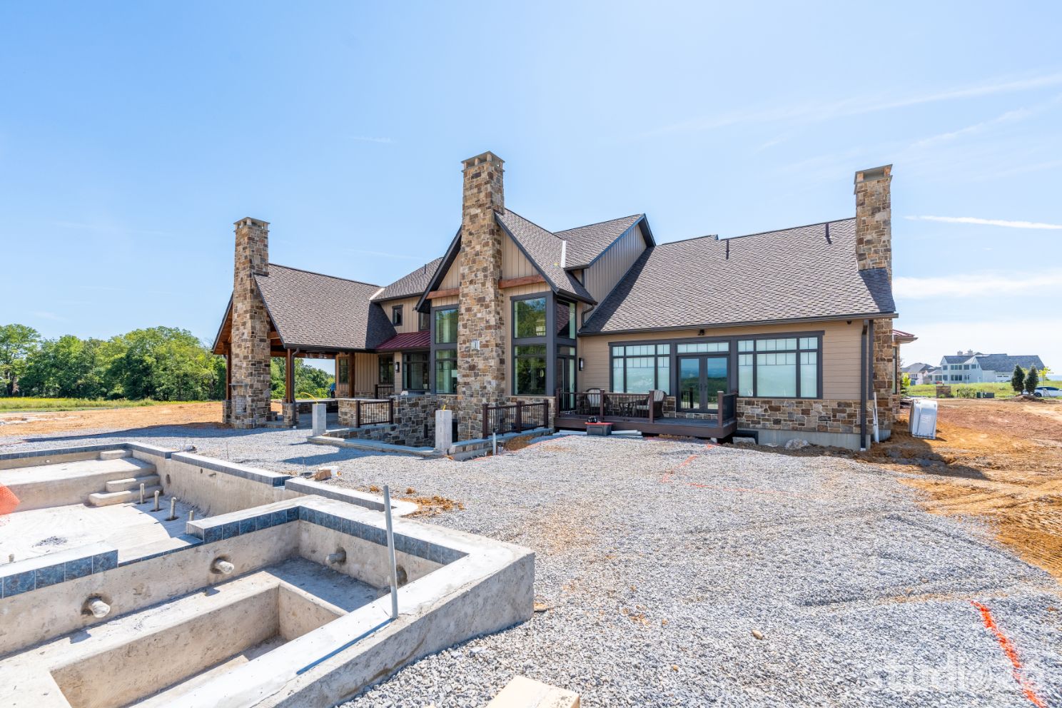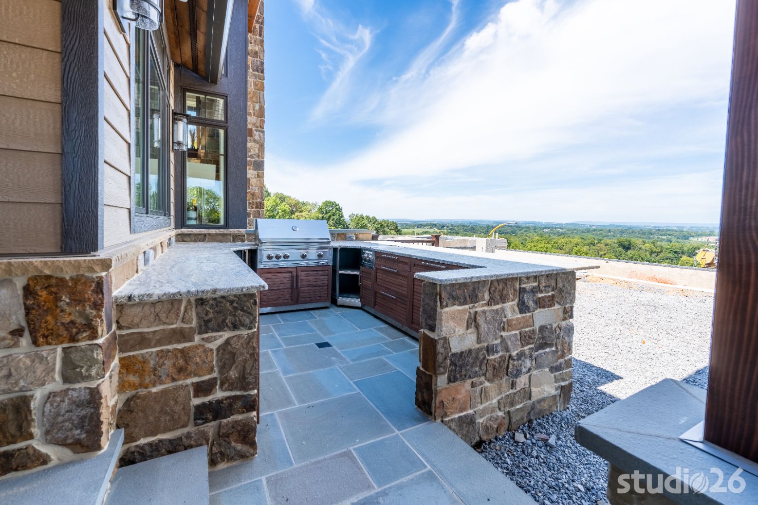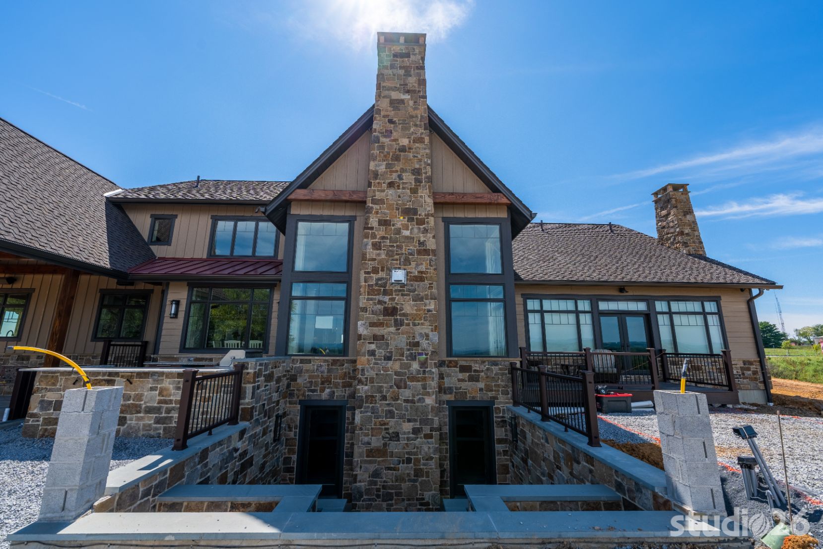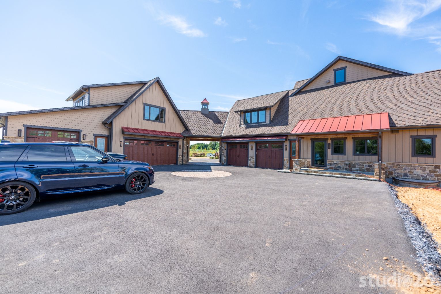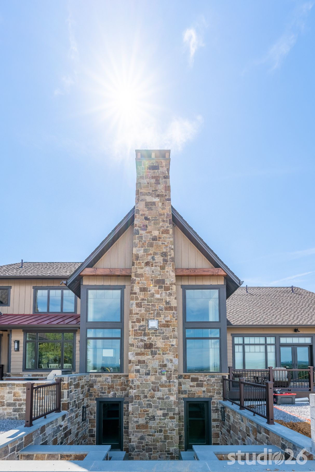 Introducing profound luxurious living at its finest! Perched upon an amazing panoramic site with nearly 360 degree views, this high-performance Colorado Craftsman-inspired residence truly embraces its breathtaking setting all around. Upon arrival, its stunning presence provides an unmatched curb appeal with its tasteful blend of stone, composite wood siding, metal roofing, glazing, and detailed beamwork. The home’s graceful stance is quite memorable as it rests comfortably in a lush, serene landscape anchored by thoughtful bluestone walkways and patios and an inviting round-about driveway which leads through the quaint porte cochere into the vast motor court anchored by five distinct garage bays.