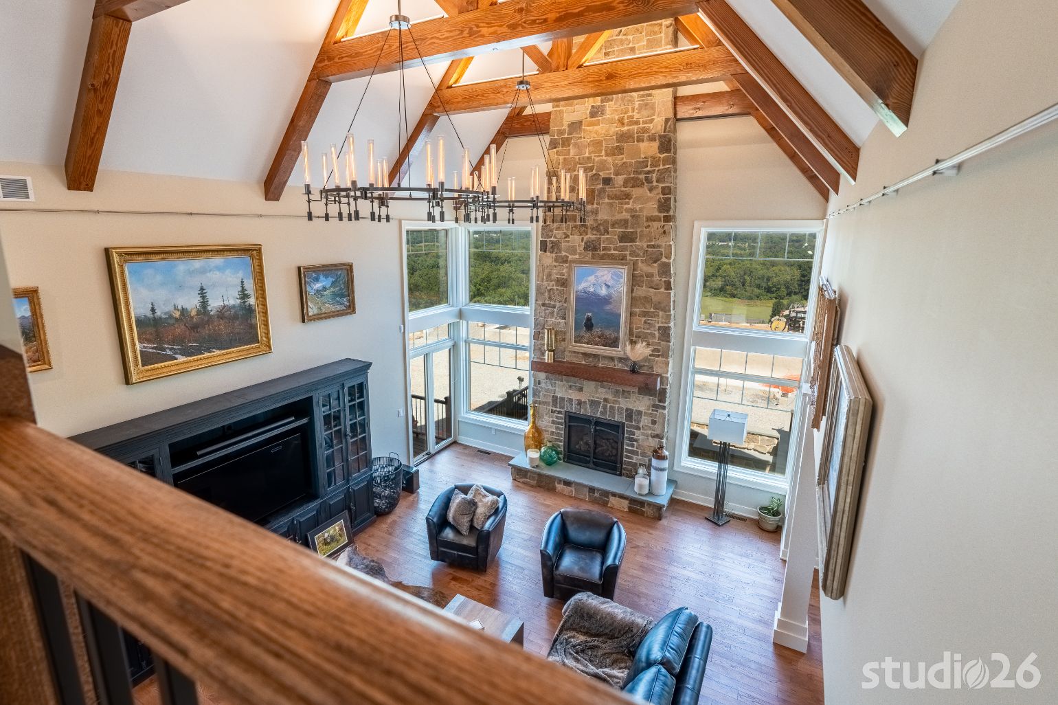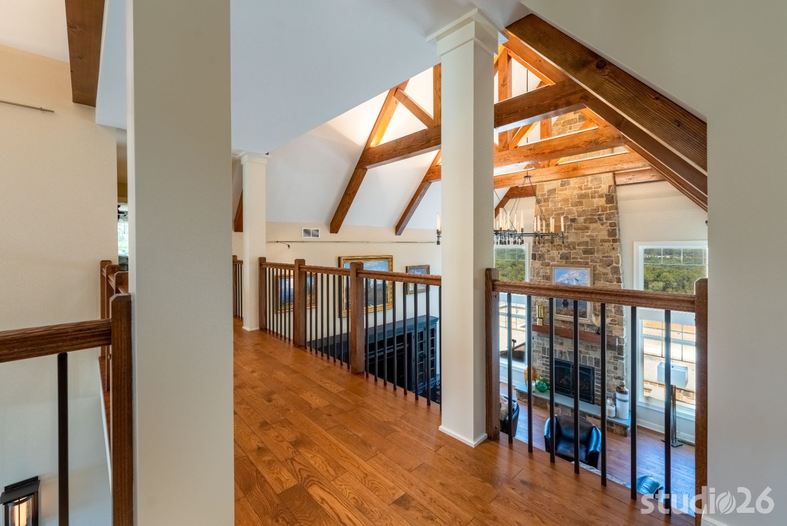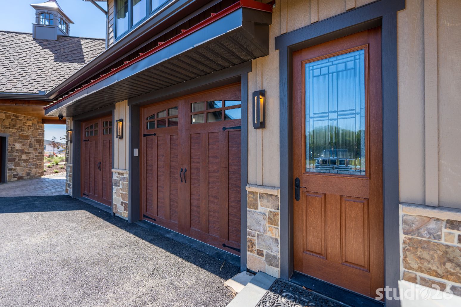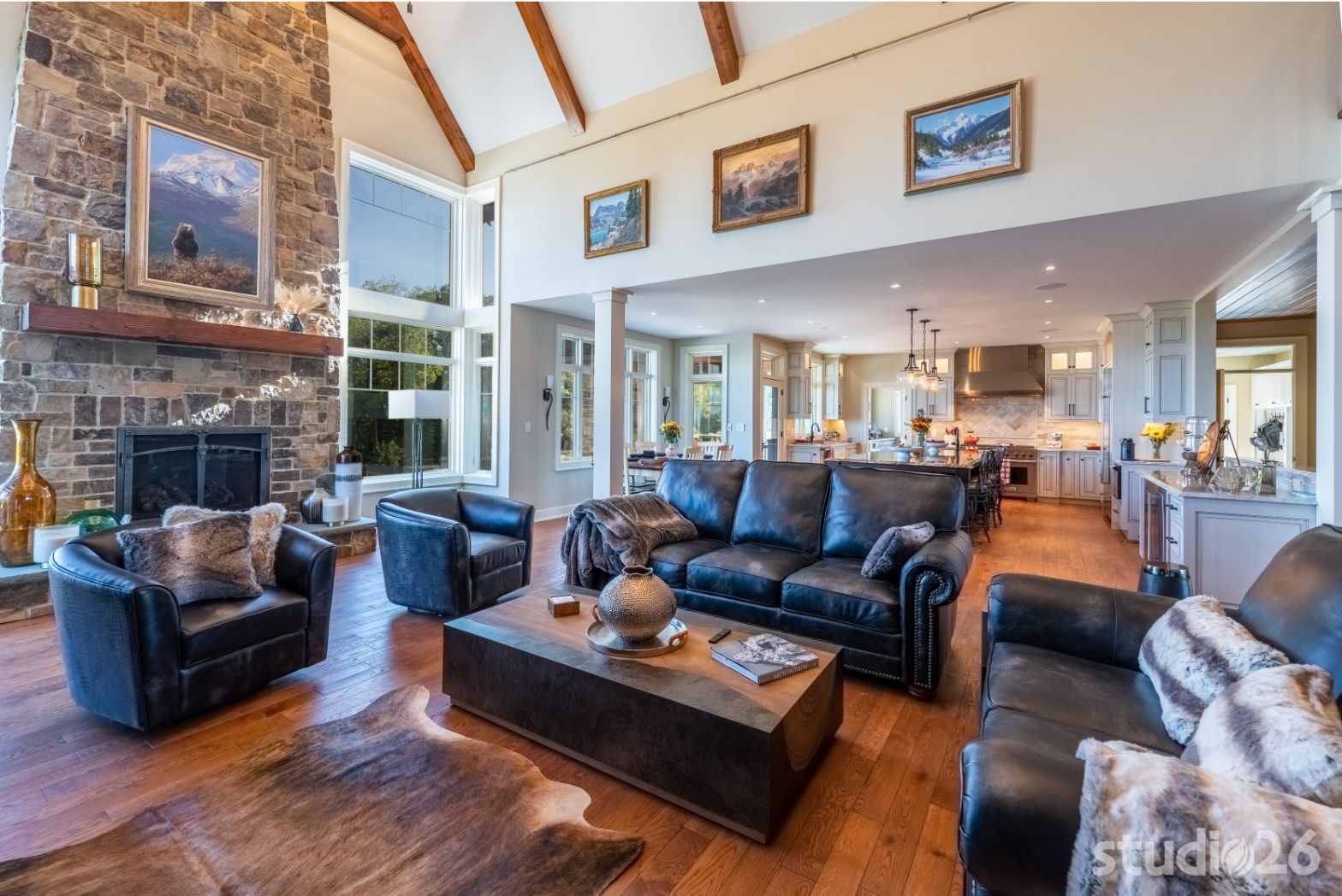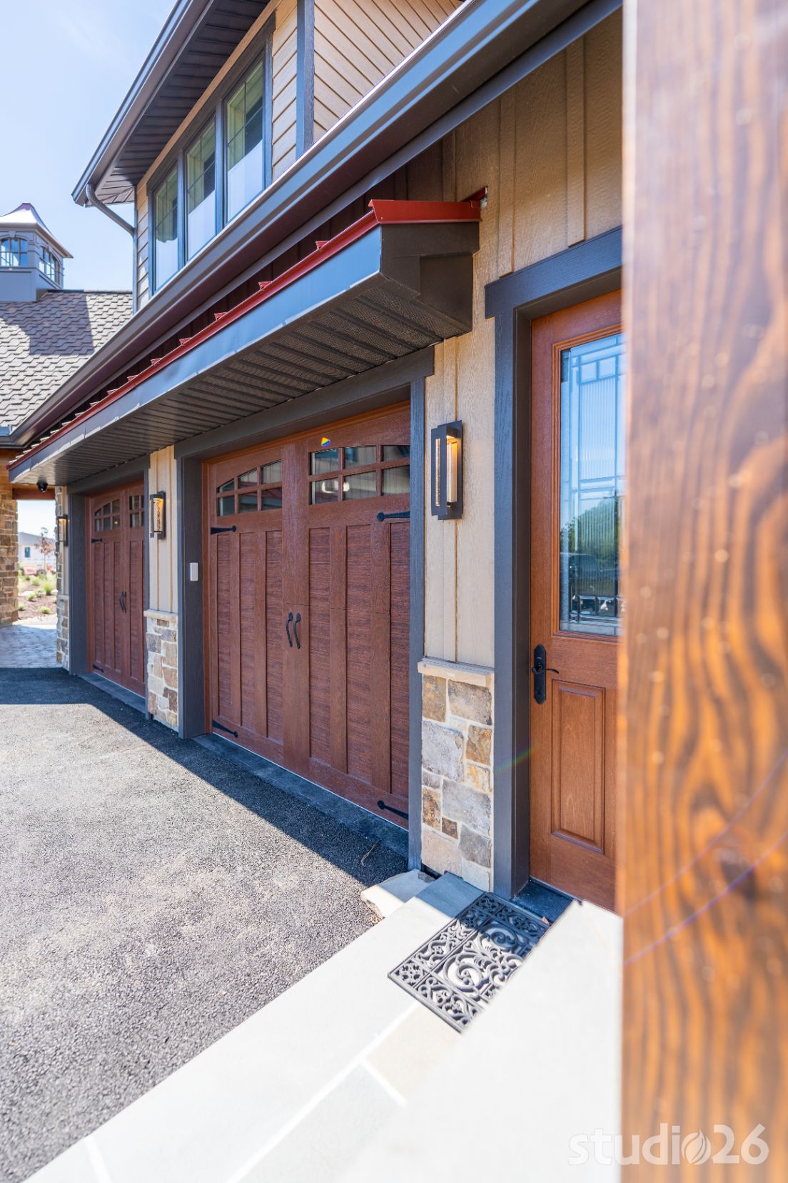 Introducing profound luxurious living at its finest! Perched upon an amazing panoramic site with nearly 360 degree views, this high-performance Colorado Craftsman-inspired residence truly embraces its breathtaking setting all around. Upon arrival, its stunning presence provides an unmatched curb appeal with its tasteful blend of stone, composite wood siding, metal roofing, glazing, and detailed beamwork. The home’s graceful stance is quite memorable as it rests comfortably in a lush, serene landscape anchored by thoughtful bluestone walkways and patios and an inviting round-about driveway which leads through the quaint porte cochere into the vast motor court anchored by five distinct garage bays.