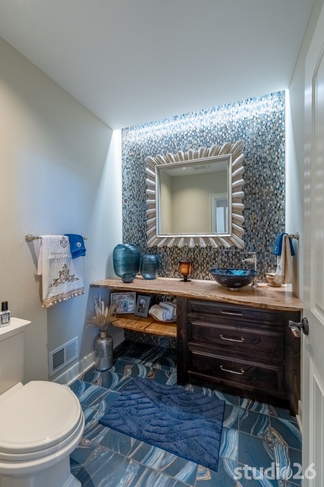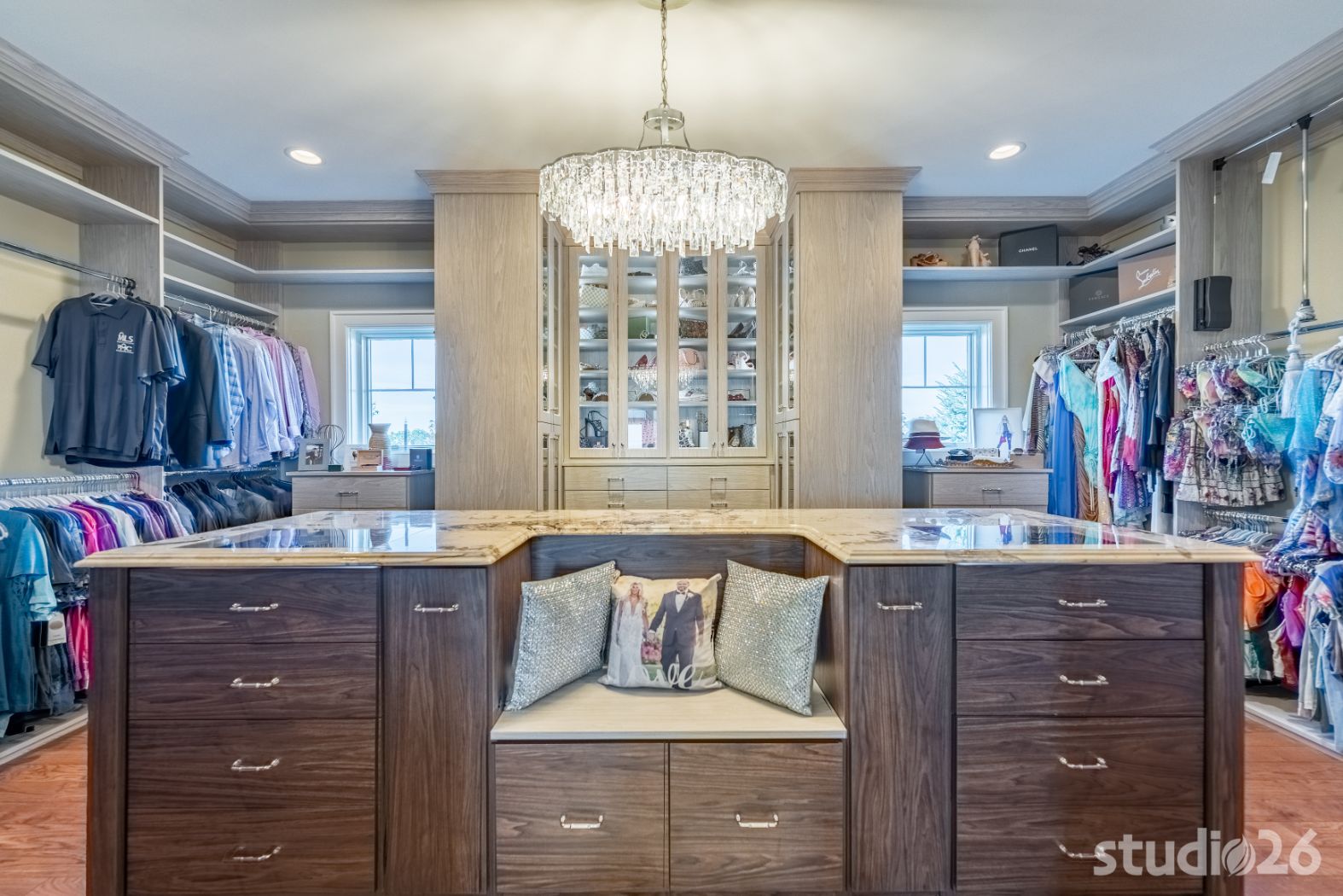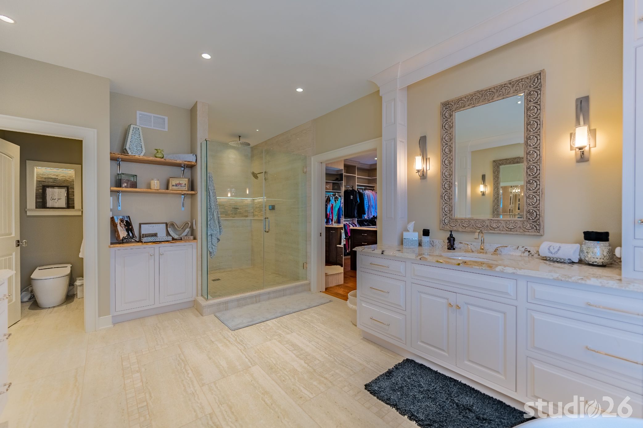 And rounding out the main level is the sublime master suite with plenty of luxuriant space to unwind after a stressful day. Details abound in the boudoir including beautiful ceiling plane shifts, premier direct and indirect lighting, and artful beamwork. In the stately bathroom, more impressive details flourish with impressive custom cabinetry, a palatial 5’ round freestanding tub back-lit by surrounding in-floor uplighting, and elegant tile work with illuminated niches in the water closet and also in the expansive walk-in shower. And it doesn’t stop there…the adjacent dressing room is both functional and fun – plenty of space for garments and shoes while also providing an enjoyable experience overall with subtle lighting and fanciful vignettes into special showcased areas such as the dazzling marble countertop ‘viewports’ on the island.