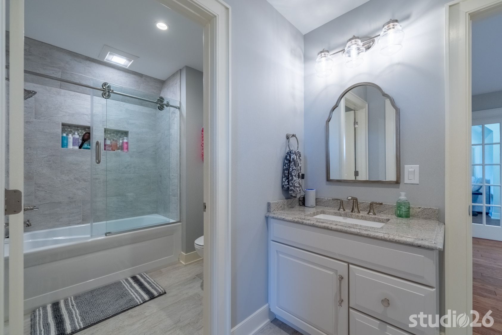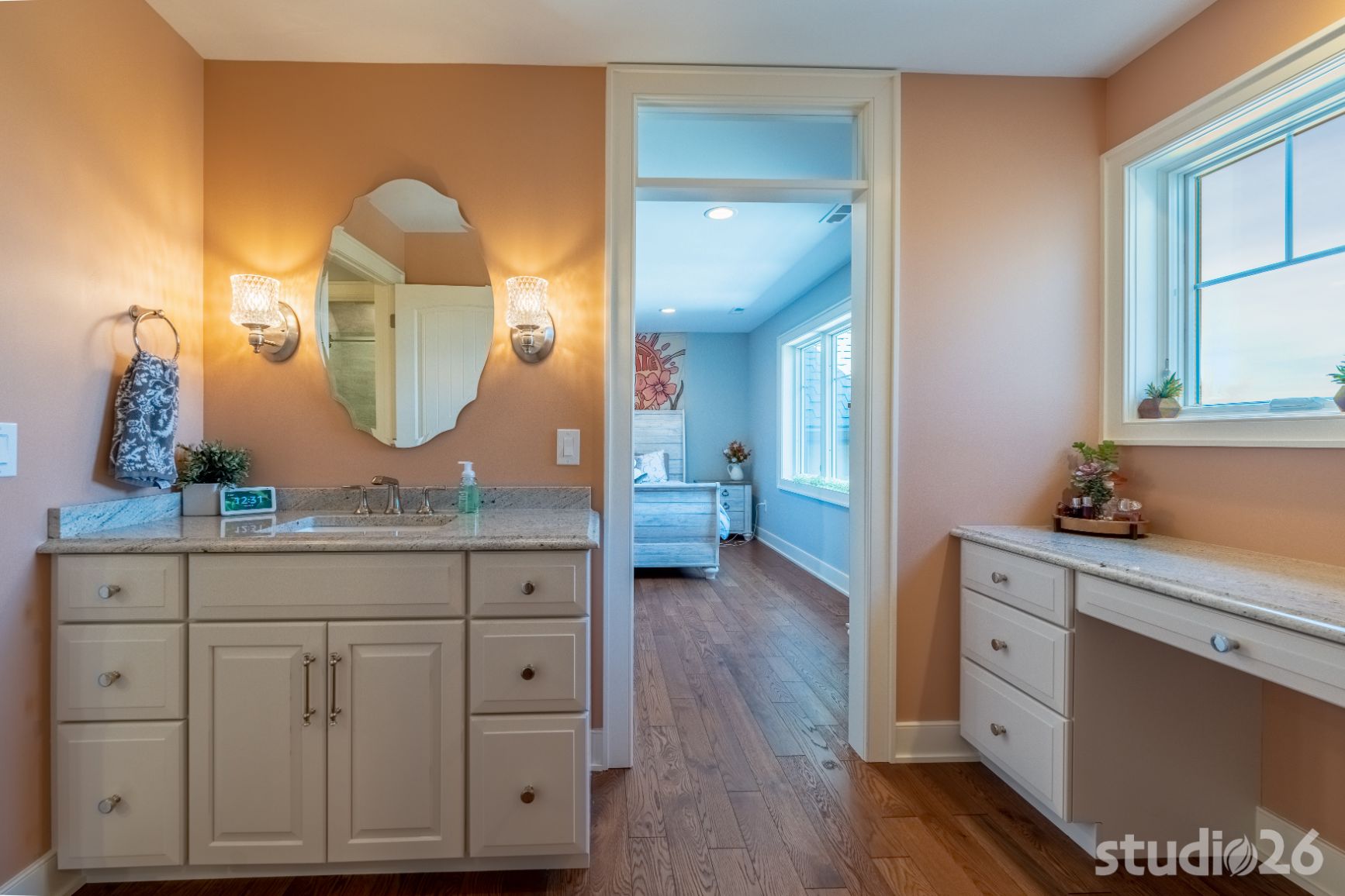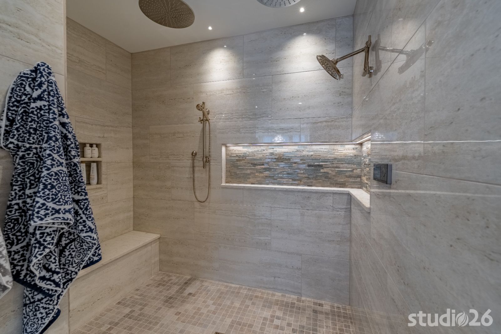 And rounding out the main level is the sublime master suite with plenty of luxuriant space to unwind after a stressful day. Details abound in the boudoir including beautiful ceiling plane shifts, premier direct and indirect lighting, and artful beamwork. In the stately bathroom, more impressive details flourish with impressive custom cabinetry, a palatial 5’ round freestanding tub back-lit by surrounding in-floor uplighting, and elegant tile work with illuminated niches in the water closet and also in the expansive walk-in shower. And it doesn’t stop there…the adjacent dressing room is both functional and fun – plenty of space for garments and shoes while also providing an enjoyable experience overall with subtle lighting and fanciful vignettes into special showcased areas such as the dazzling marble countertop ‘viewports’ on the island.