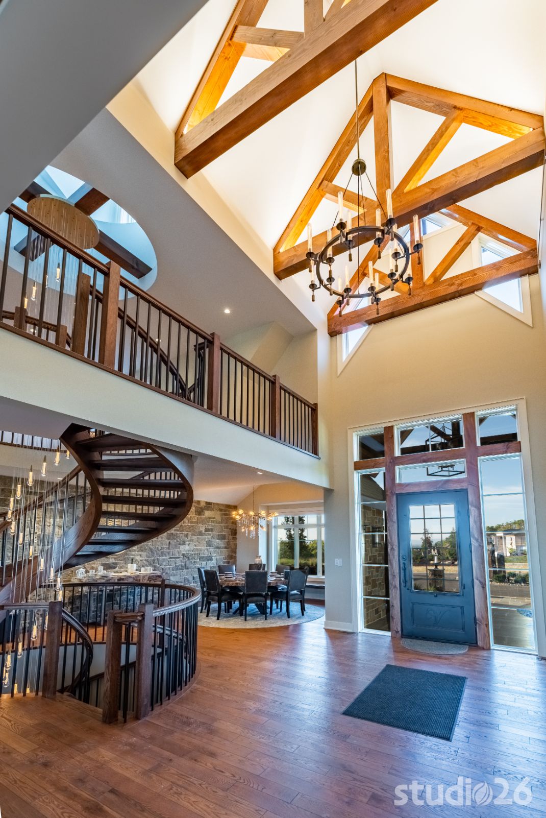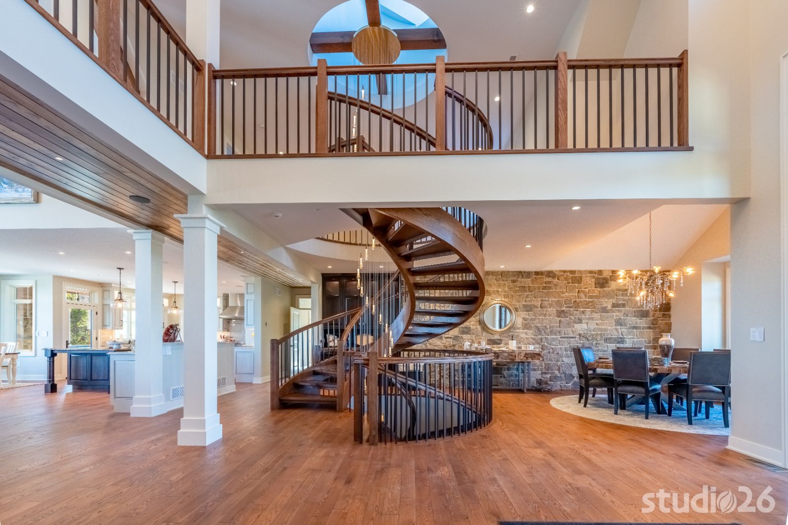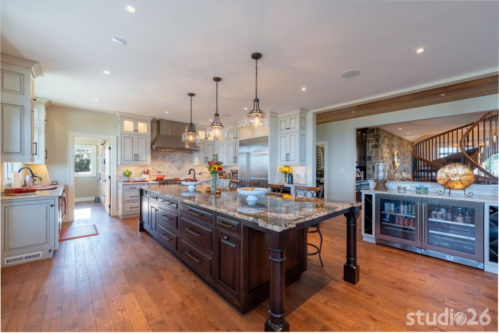 Stepping inside, guests walk through a massive 42” x 8’ tall bronze glass door into an awe-inspiring foyer with exciting glimpses into adjacent rooms including the majestic great room and outdoor pool beyond; and perhaps most prominent is the playful circular staircase and its exquisite ‘weeping’ chandelier! Close by is the professional chef’s kitchen complete with an illustrious island and an adjacent prep kitchen that also serves as a large pantry. Supporting spaces such as the alluring powder room, custom cabinet-filled mud room, and first floor laundry help make day to day living that much more enjoyable!
