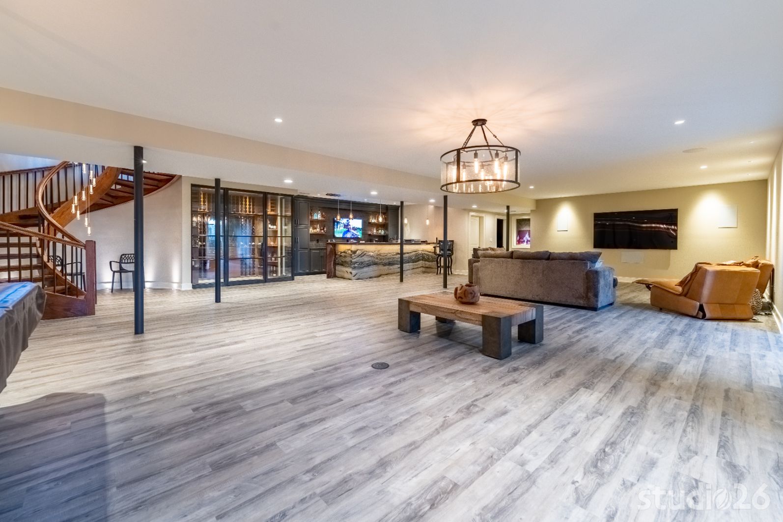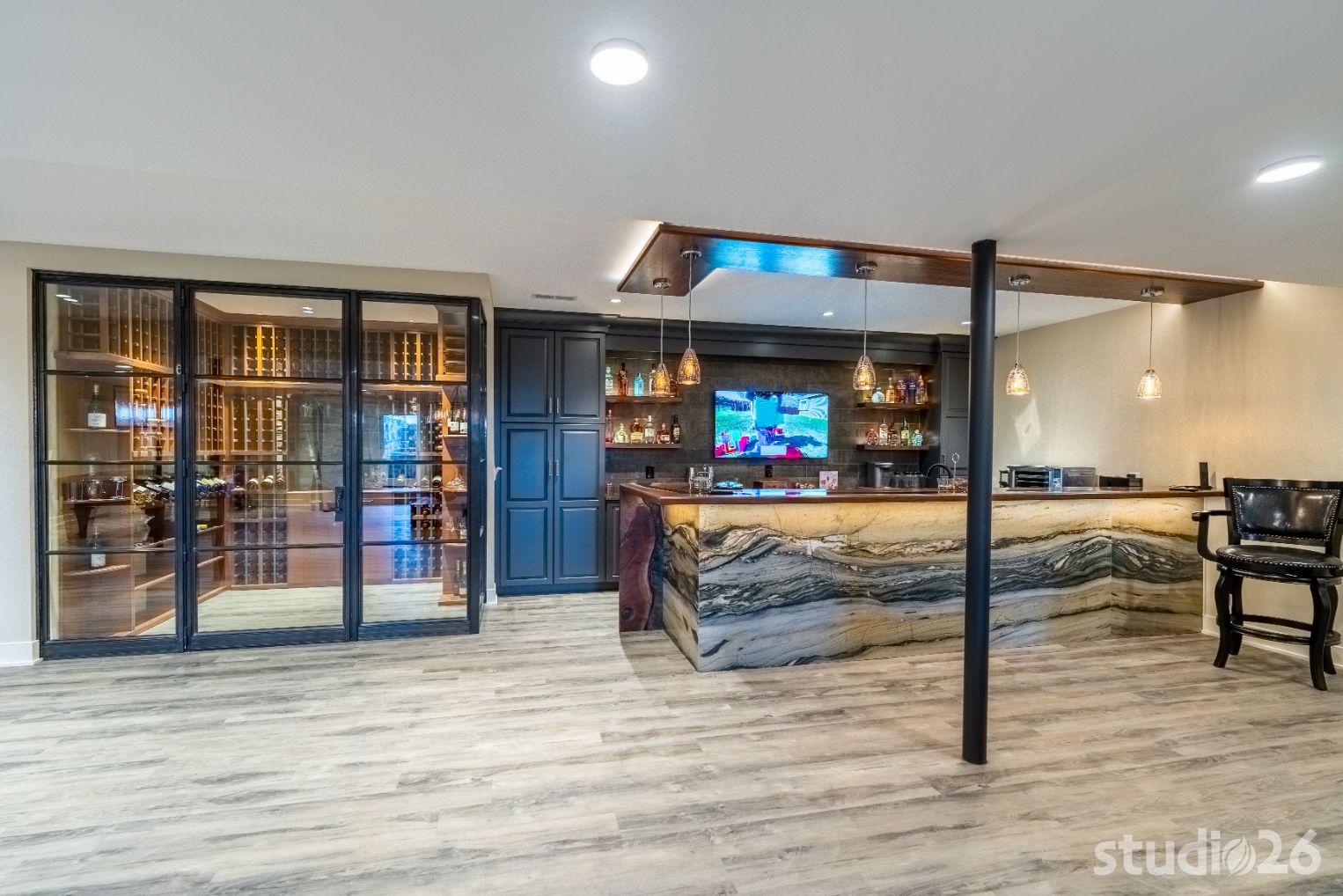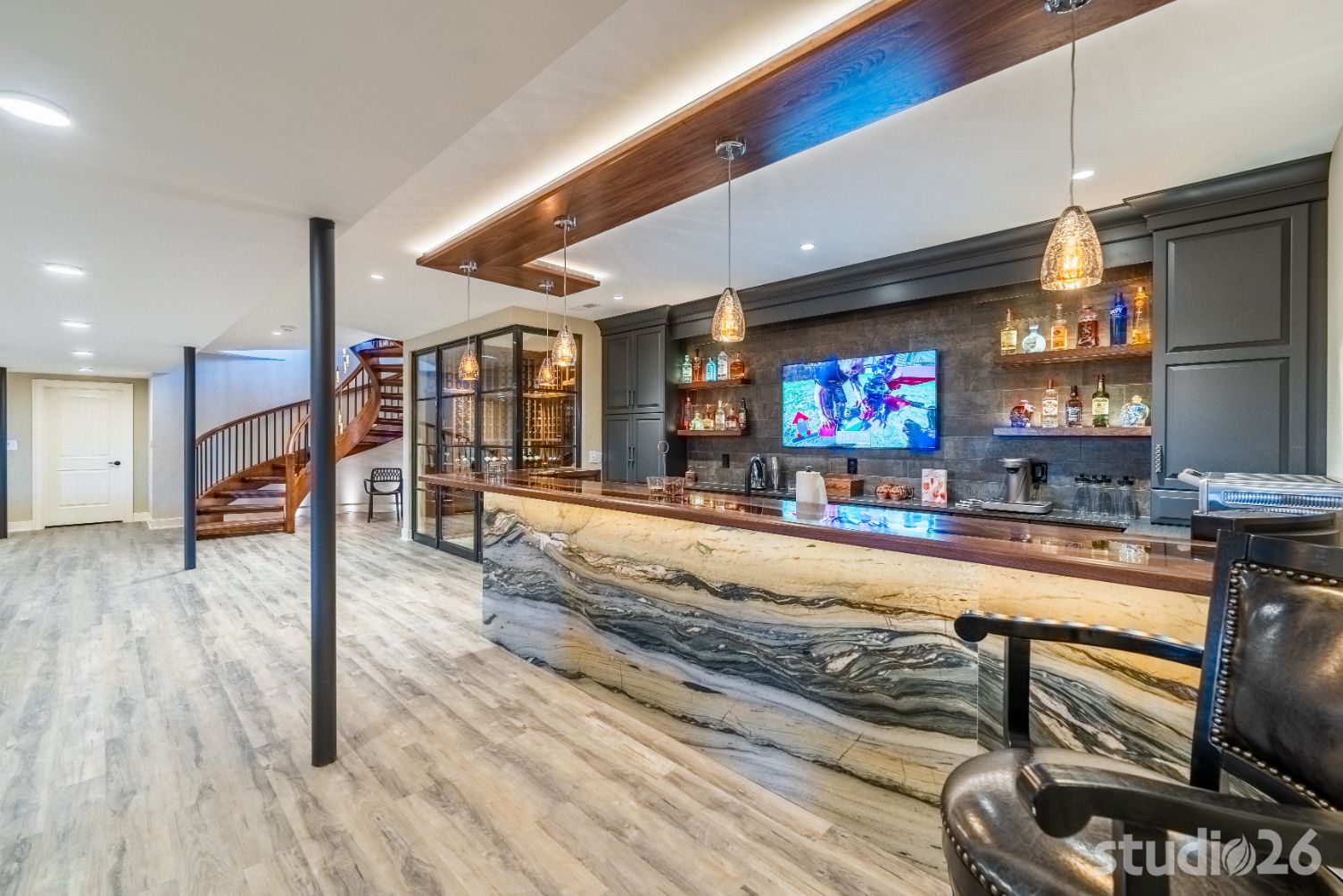 On the lower level, an entertainer’s dream awaits – the perfect setting for billiards, lounging, movie night, and sipping cocktails and wine with friends! In addition to an additional guest suite and another dedicated office space, guests will enjoy the vast open space together headlined by a captivating one-of-a-kind bar with purposeful sight lines into the adjacent climate-controlled wine room. Whether its the illuminated exotic granite slabs laid vertically under the bartop, the custom artisanal walnut with smokey epoxy river bartop itself, or the flushly illuminated walnut shelves lighting up through the colorful liquor bottles, enjoying a drink or two while watching a ball game with friends is sure to be memorable. And if the evening continues on, perhaps the enjoyment can adjourn into the private cigar room with elegant lighting and appointments.