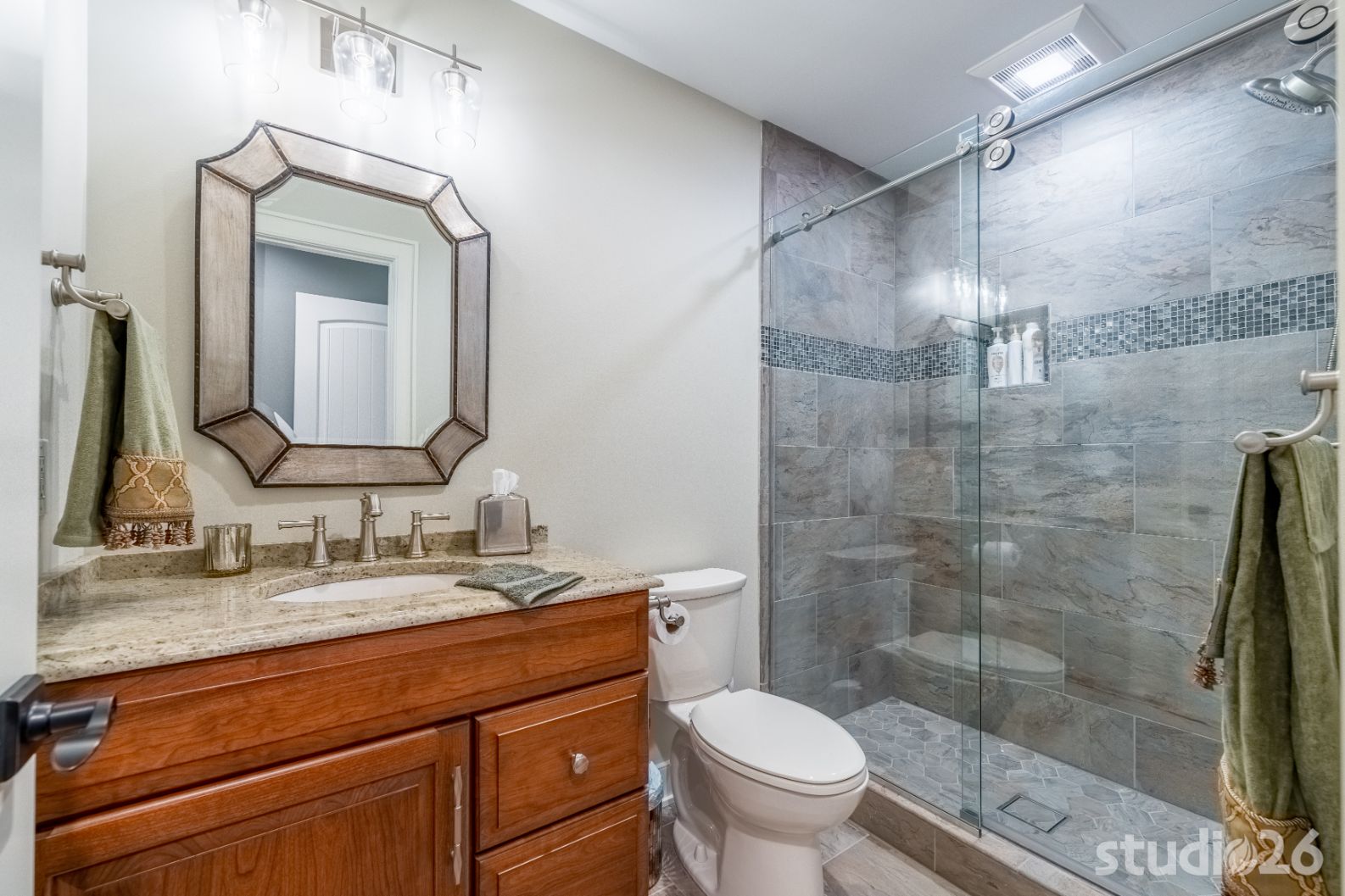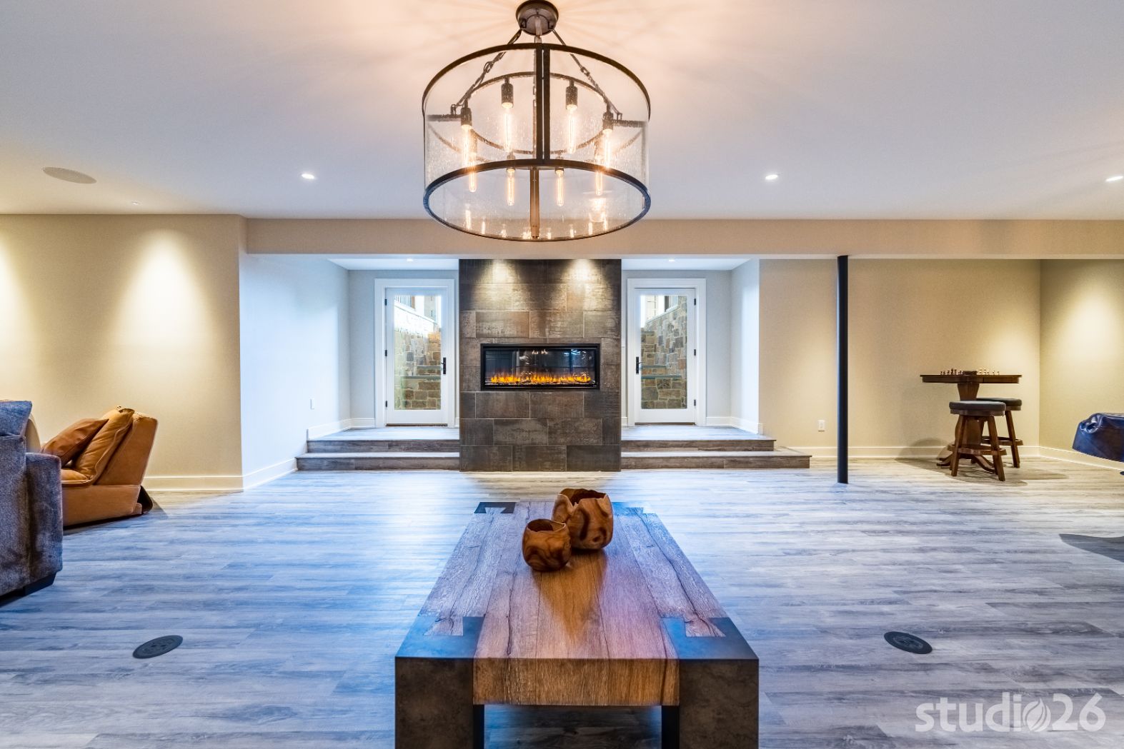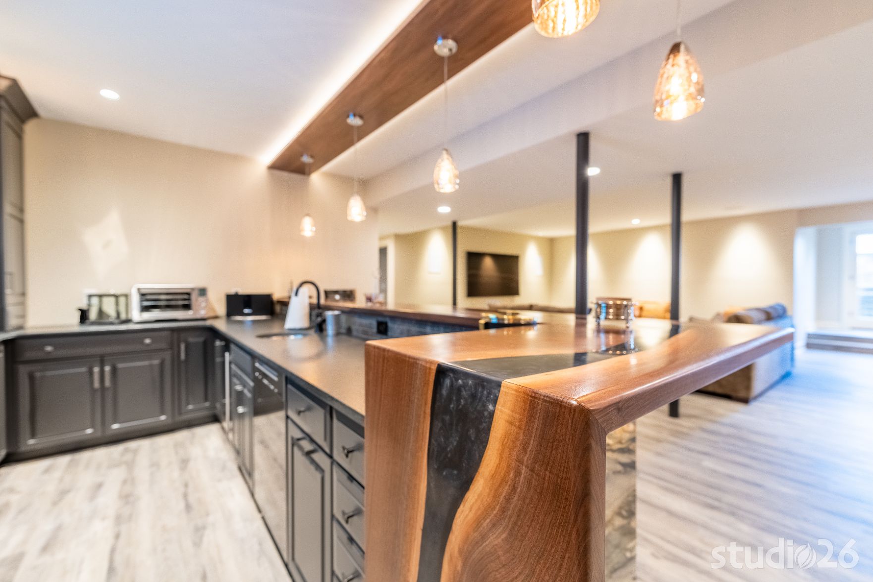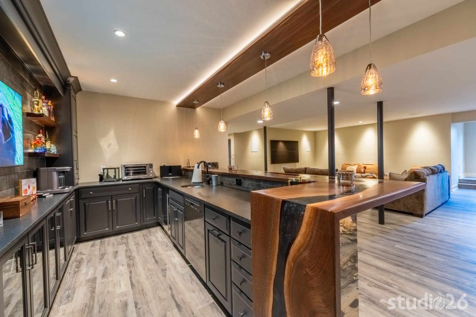 On the lower level, an entertainer’s dream awaits – the perfect setting for billiards, lounging, movie night, and sipping cocktails and wine with friends! In addition to an additional guest suite and another dedicated office space, guests will enjoy the vast open space together headlined by a captivating one-of-a-kind bar with purposeful sight lines into the adjacent climate-controlled wine room. Whether its the illuminated exotic granite slabs laid vertically under the bartop, the custom artisanal walnut with smokey epoxy river bartop itself, or the flushly illuminated walnut shelves lighting up through the colorful liquor bottles, enjoying a drink or two while watching a ball game with friends is sure to be memorable. And if the evening continues on, perhaps the enjoyment can adjourn into the private cigar room with elegant lighting and appointments.