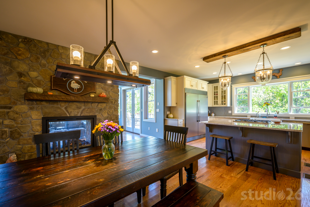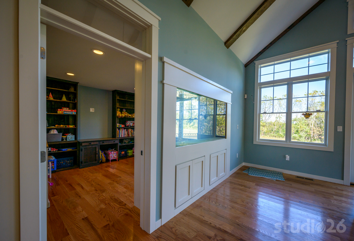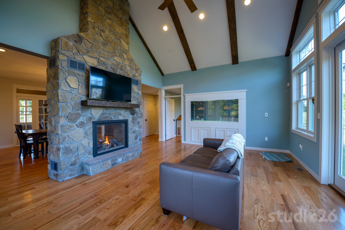 Programmatically, our client shared a few important requests: while they did not need a formal Dining Room or Living Room, they did desire a generally open first floor layout, but with rooms that still maintained a distinct prominence on their own. As a result, we created a design that situated separate spaces for the Kitchen, Den, Dining Area, Great Room, and Play Room all in close proximity, but with important prominent visual connections throughout. For example, the single delineation between the cathedral Great Room and the sizable Dining Area (and adjacent Kitchen) is the impressive two-sided stone fireplace, which is also flanked by two large open walk-throughs on either side. Furthermore, the neighboring Den is only separated, but only by two glass pocket doors (with transom overhead) that can easily be opened up to better unify the spaces. And, perhaps most interestingly, although its own individual space, the Play Room is still quite visually connected to the Great Room through the large fish tank built into the wall between the two rooms.
