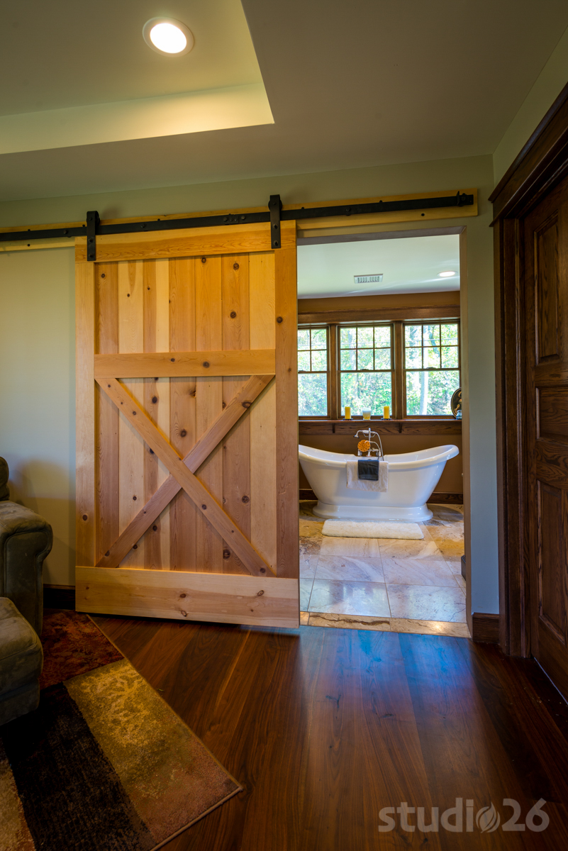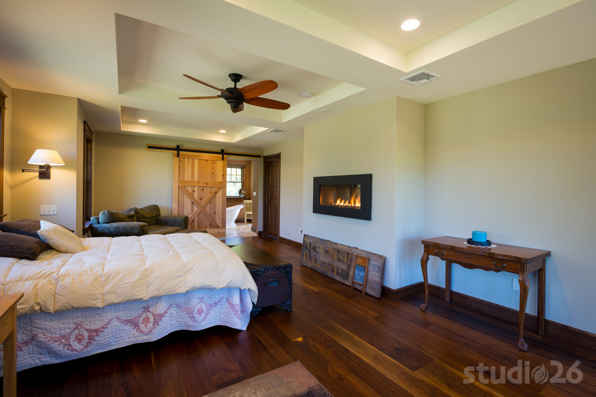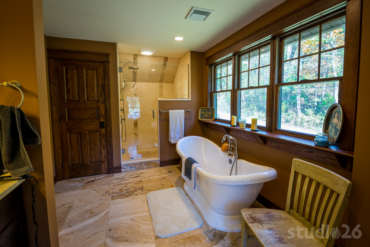 Among the homeowner’s favorite spaces is the private and expansive master suite; which occupies the entire second floor of the addition and includes a raised in-wall fireplace for easy view from their bed, a spacious walk-in closet, and a luxurious master bathroom complete with radiant flooring, a freestanding soaking tub, custom shower, and travertine finishes throughout. Since the home is located just a few paces from a running stream, we wanted to capture that experiential amenity by building a private balcony off the master suite integrated into the primary deck below on the first floor.
