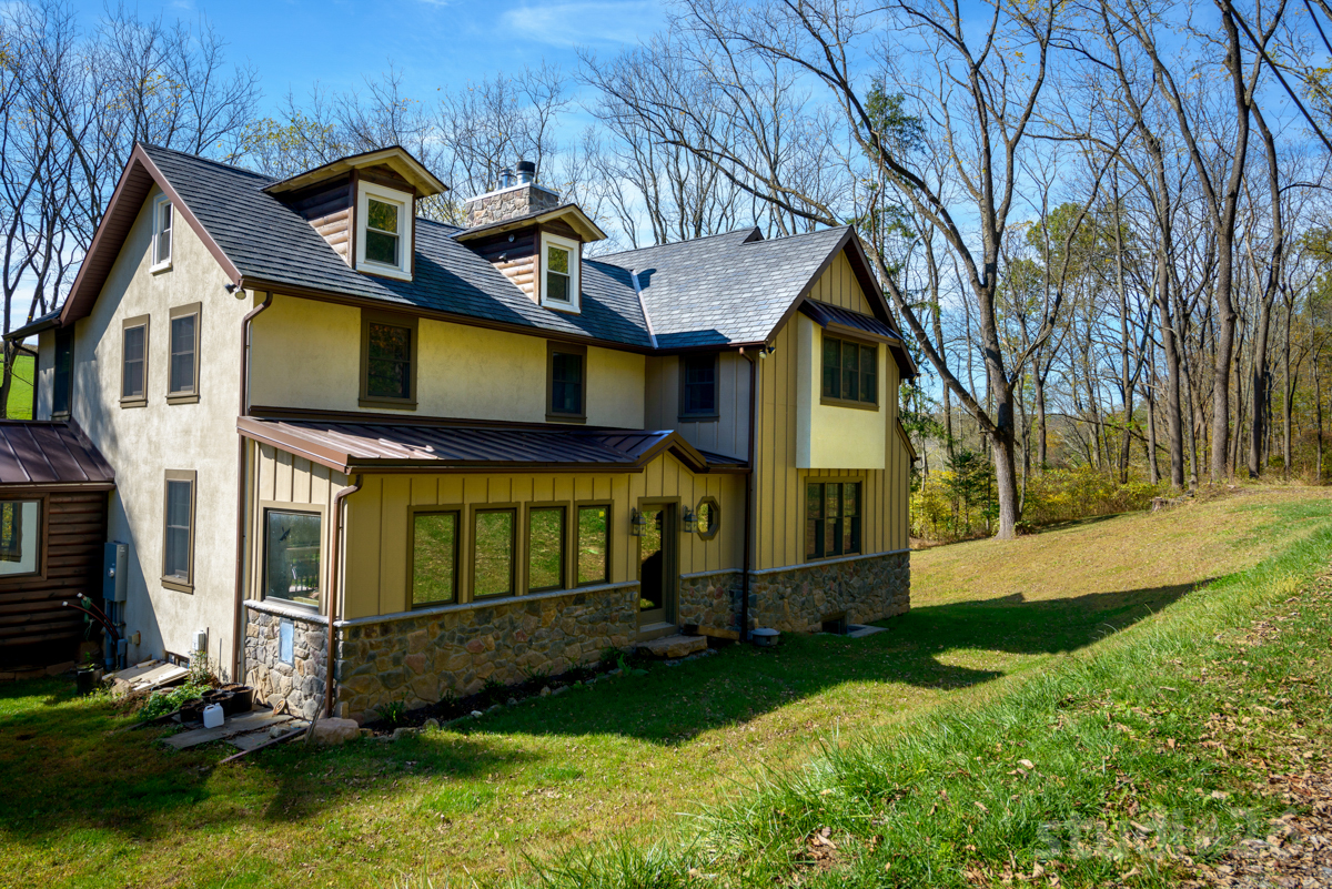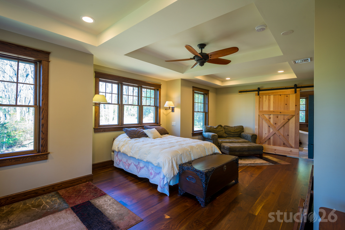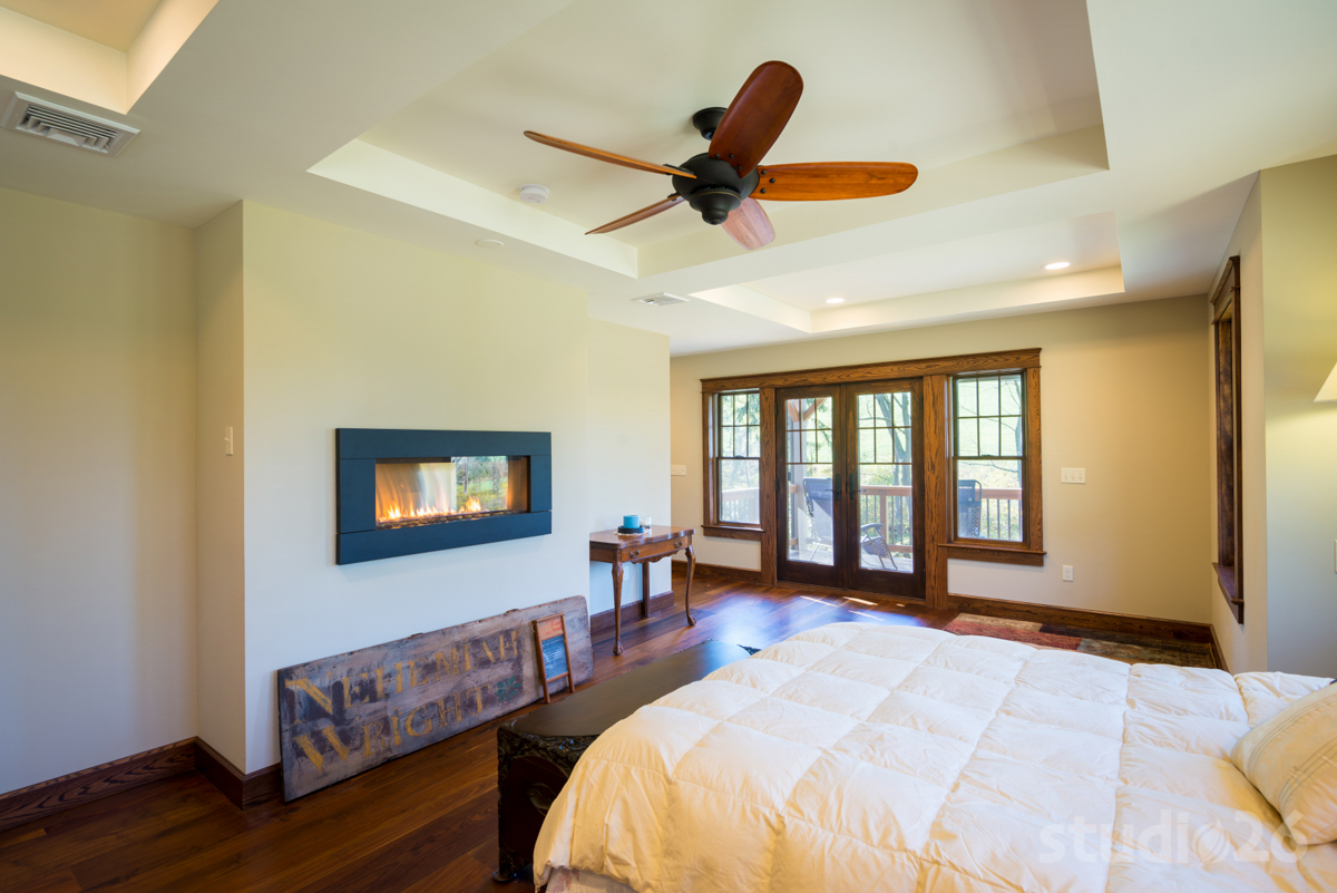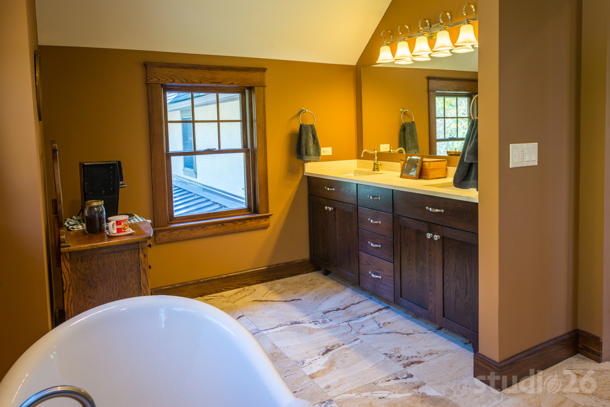 Among the homeowner’s favorite spaces is the private and expansive master suite; which occupies the entire second floor of the addition and includes a raised in-wall fireplace for easy view from their bed, a spacious walk-in closet, and a luxurious master bathroom complete with radiant flooring, a freestanding soaking tub, custom shower, and travertine finishes throughout. Since the home is located just a few paces from a running stream, we wanted to capture that experiential amenity by building a private balcony off the master suite integrated into the primary deck below on the first floor.
