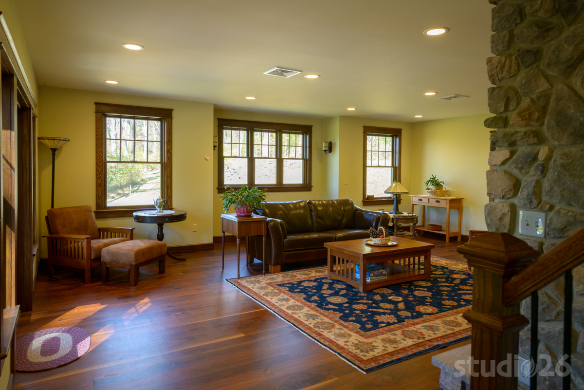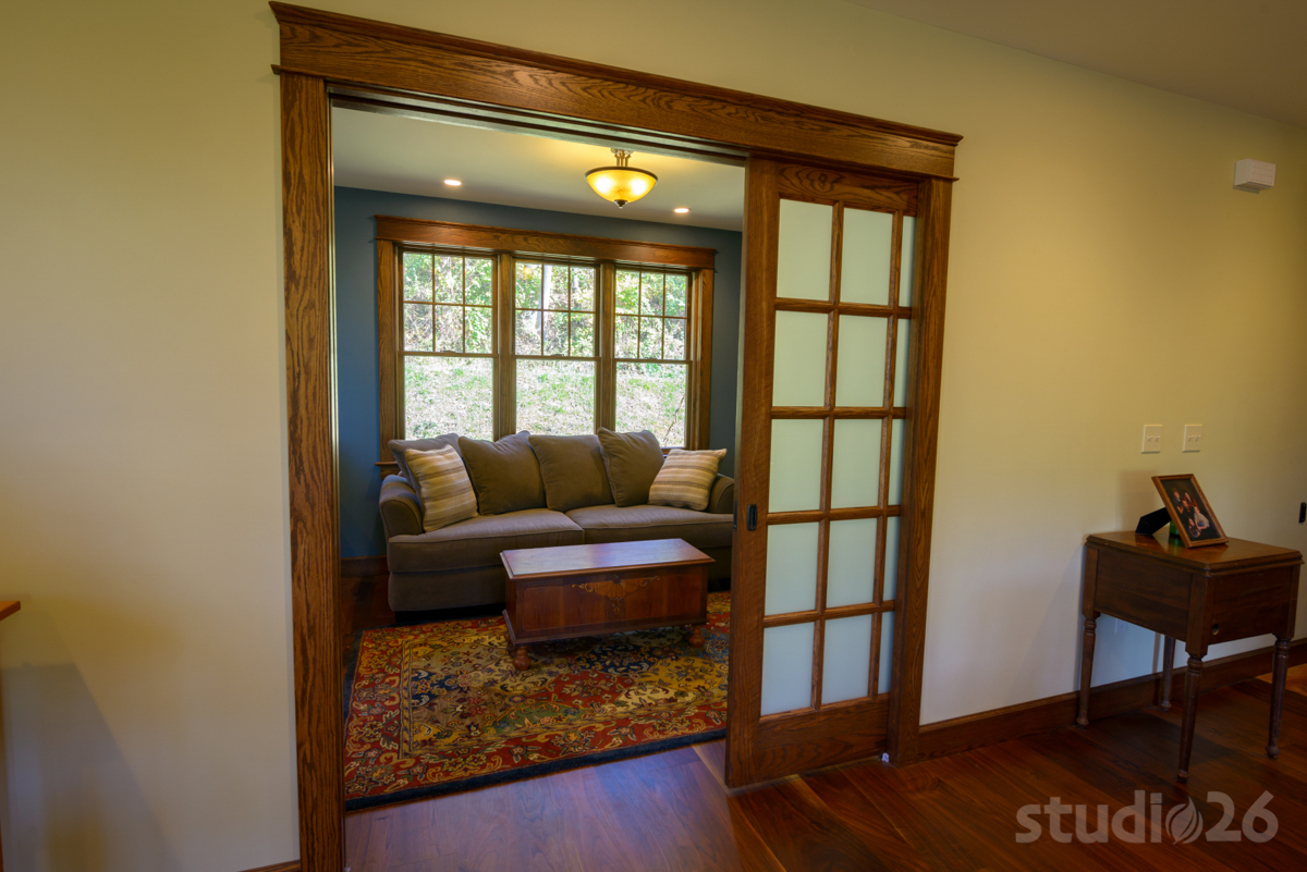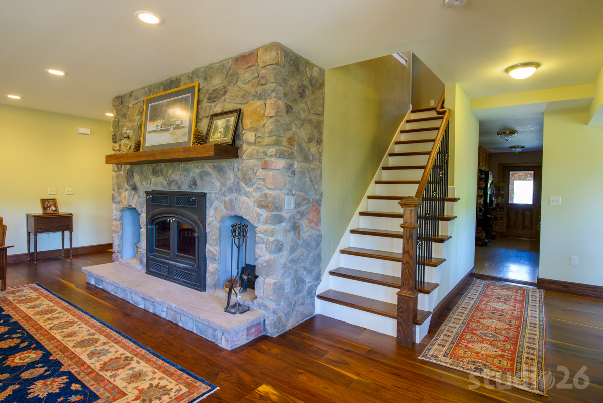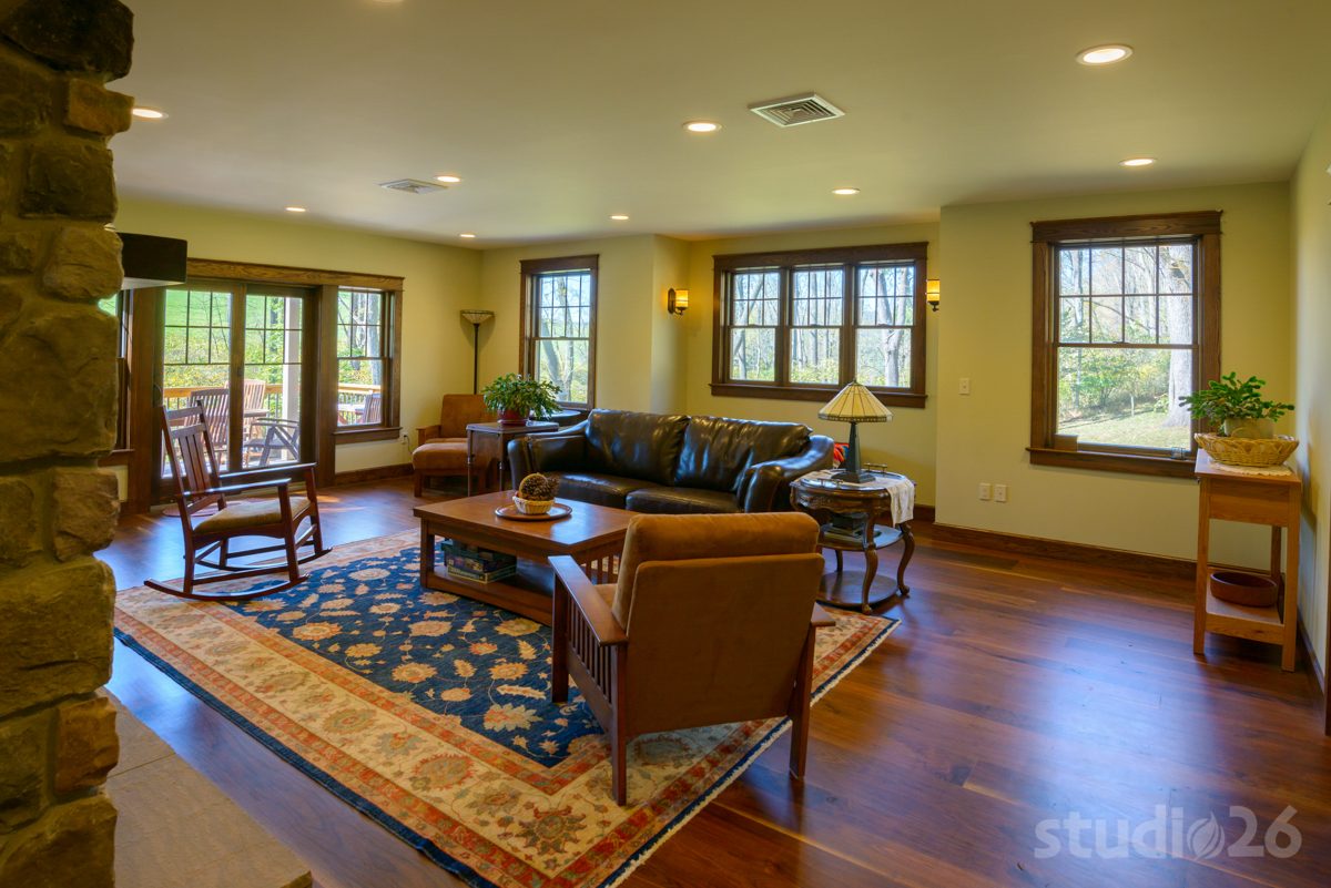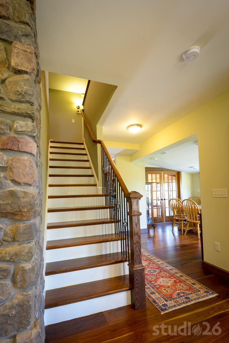 On the main level, our team added a new stair and powder room (as they were removed during demolition), great room with massive stone fireplace, office with special access not only from the home through large pocket doors, but also through the new front sunroom (which was partially added to help provide a new welcoming entrance for the home) for easier, more private access of clients for a possible future home business venture.