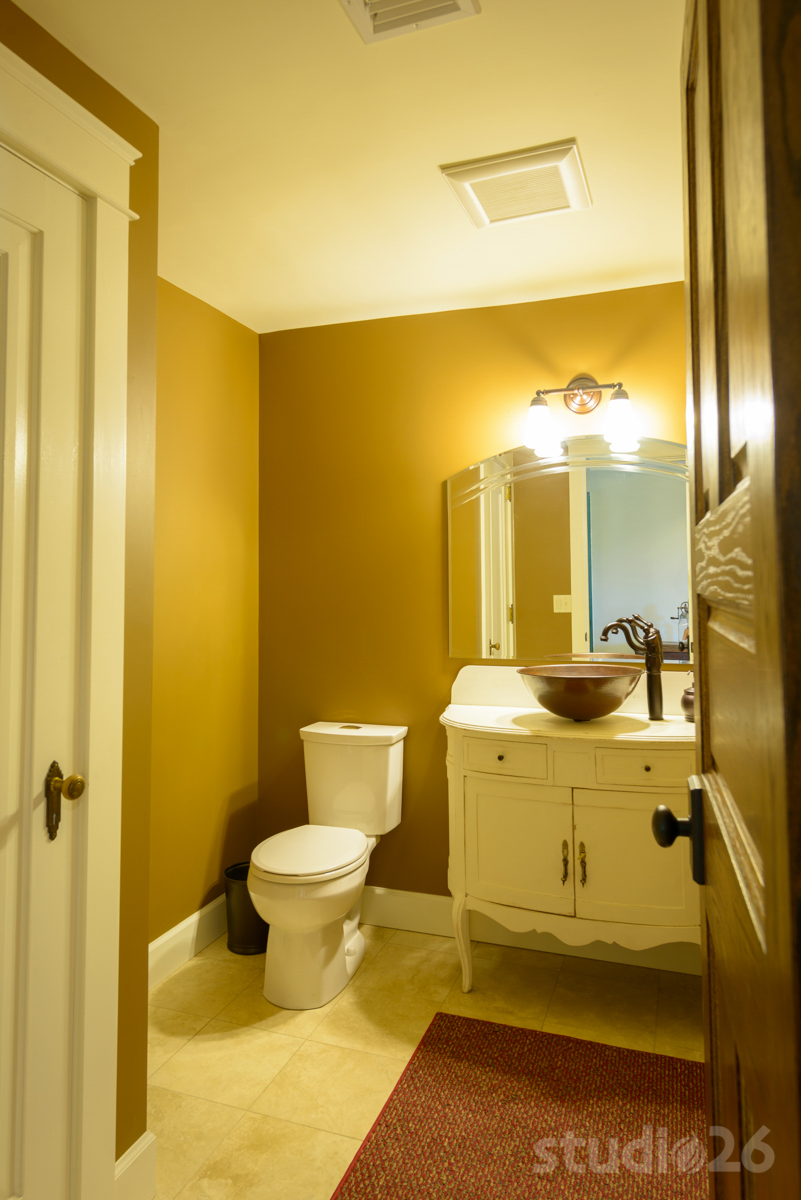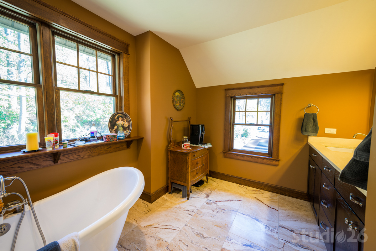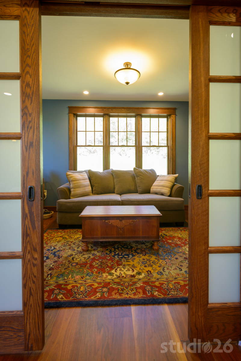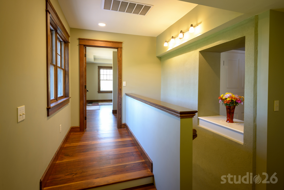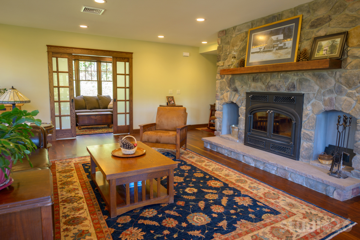 On the main level, our team added a new stair and powder room (as they were removed during demolition), great room with massive stone fireplace, office with special access not only from the home through large pocket doors, but also through the new front sunroom (which was partially added to help provide a new welcoming entrance for the home) for easier, more private access of clients for a possible future home business venture.