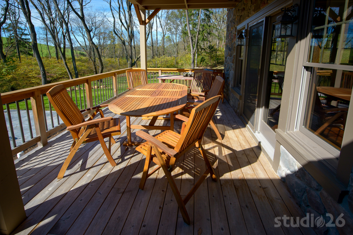 - American cedar decking materials with aluminum balusters on the rear of the home.