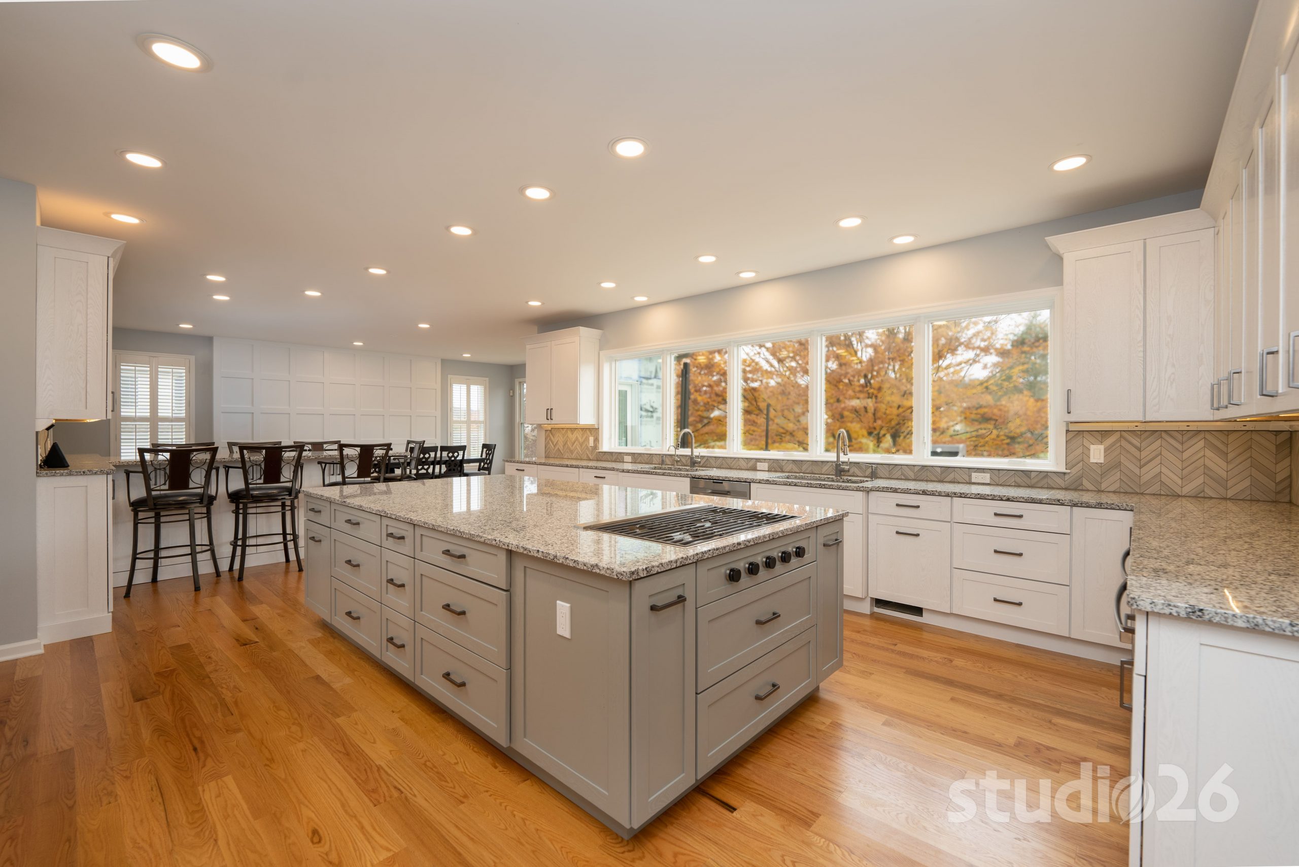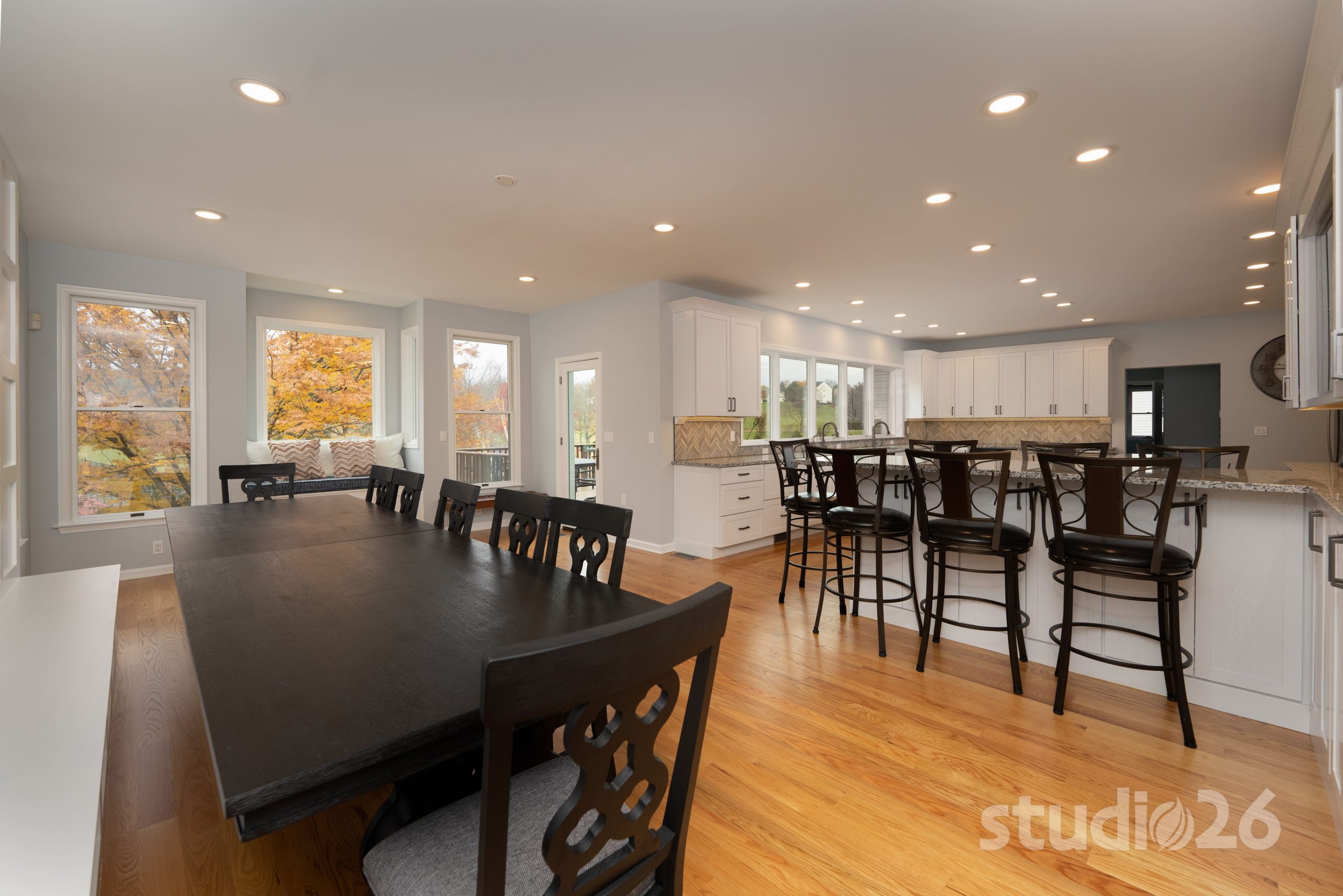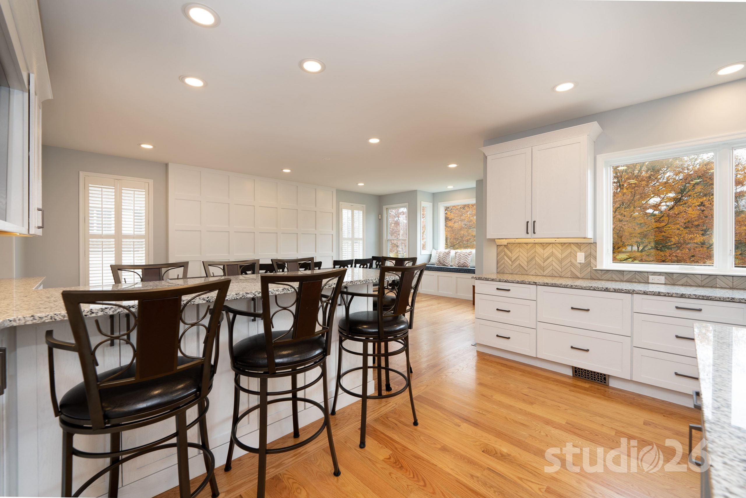 One of the most prominent design moves made was the relocation of the dining room from a tucked away alcove in the front of the house to the former great room space located directly adjacent to the kitchen. And in the former dining room, a new family study was born complete with custom built-ins and a hidden passage through the new expanded pantry and into the kitchen. This newly relocated and expanded dining room being so close to the social center of the home now affords our clients ample space to host large family dinners and gatherings. Furthermore, the original great room fireplace was then removed to make way for a quaint and comfy window seat nook, which doubles to bring in abundant more loads of natural light into the home. To increase the spacious feeling of the home and to improve traffic flow to and from the rear deck outside, we creatively designed a banquette seating area to anchor the large dining room table closer to the edge of the room as opposed to the typically common placement in the middle of the room.