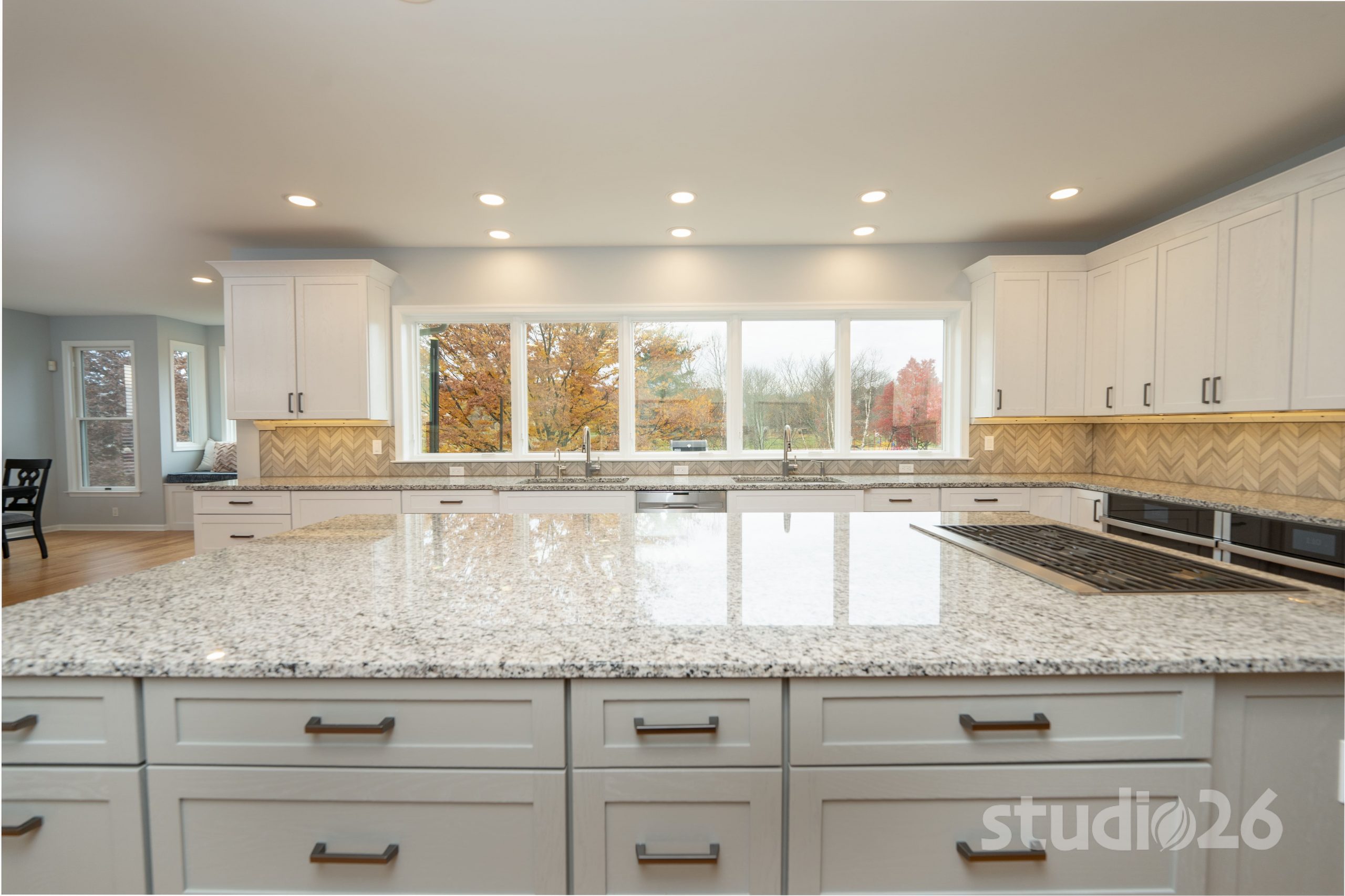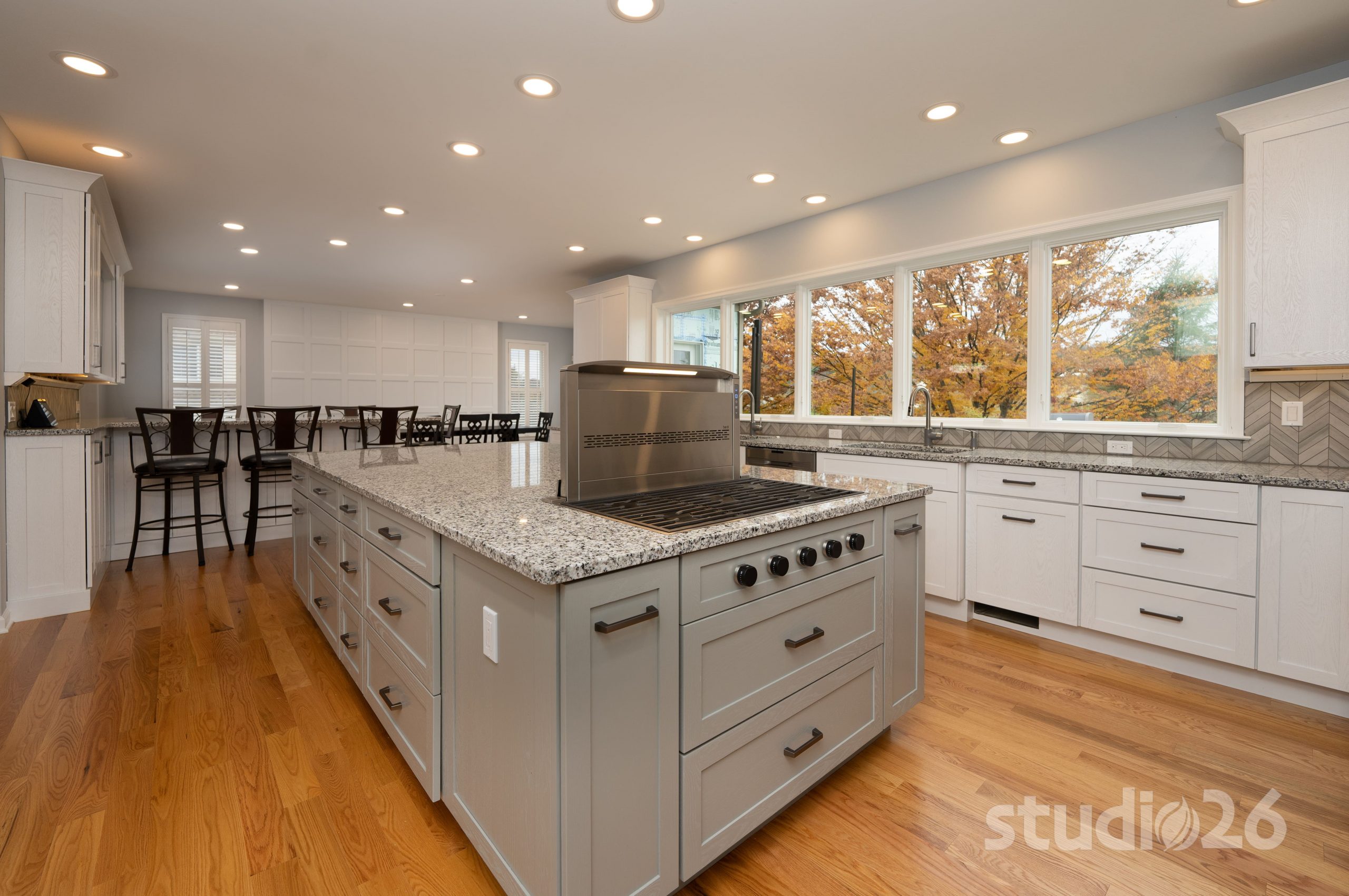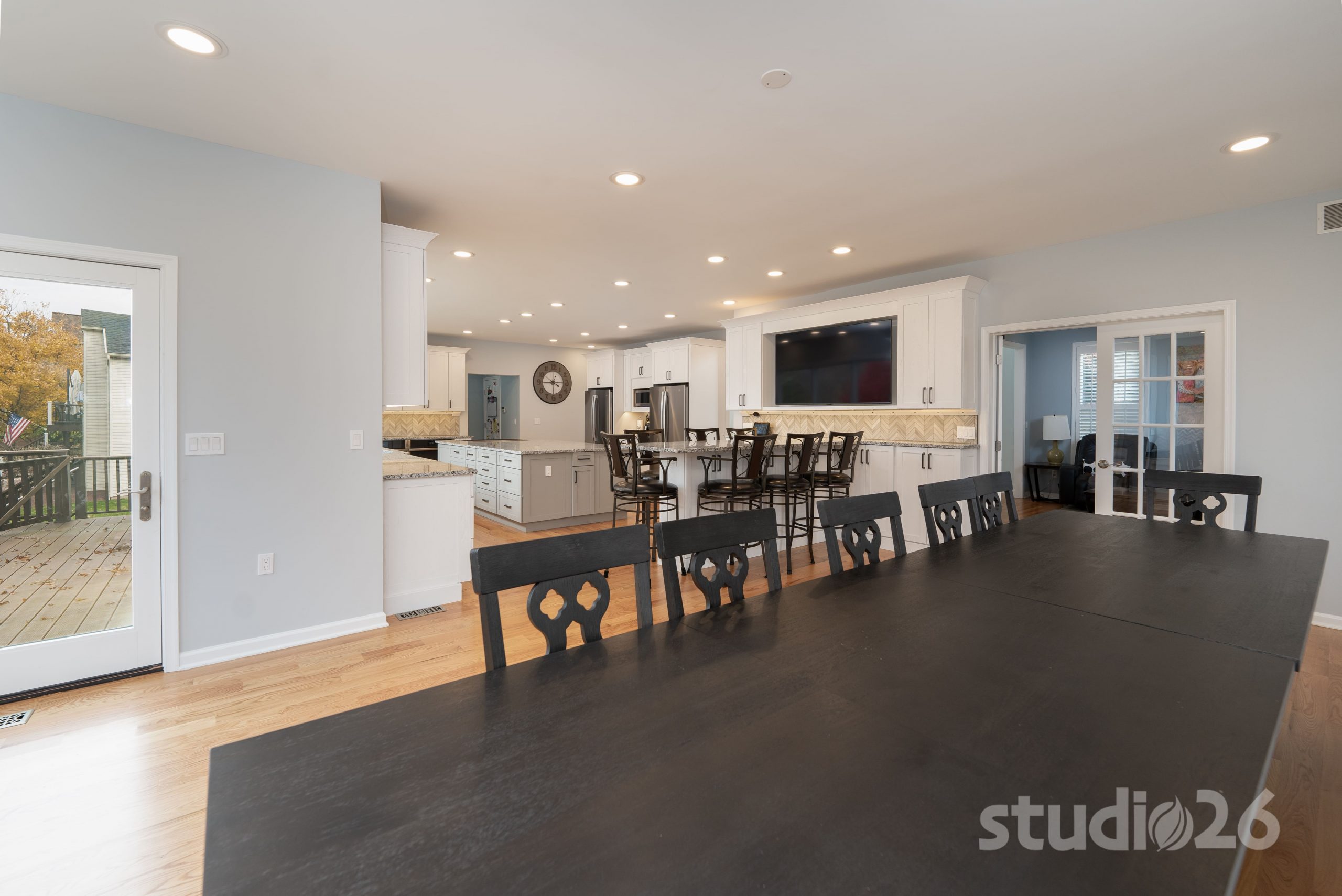 One of the most prominent design moves made was the relocation of the dining room from a tucked away alcove in the front of the house to the former great room space located directly adjacent to the kitchen. And in the former dining room, a new family study was born complete with custom built-ins and a hidden passage through the new expanded pantry and into the kitchen. This newly relocated and expanded dining room being so close to the social center of the home now affords our clients ample space to host large family dinners and gatherings. Furthermore, the original great room fireplace was then removed to make way for a quaint and comfy window seat nook, which doubles to bring in abundant more loads of natural light into the home. To increase the spacious feeling of the home and to improve traffic flow to and from the rear deck outside, we creatively designed a banquette seating area to anchor the large dining room table closer to the edge of the room as opposed to the typically common placement in the middle of the room.