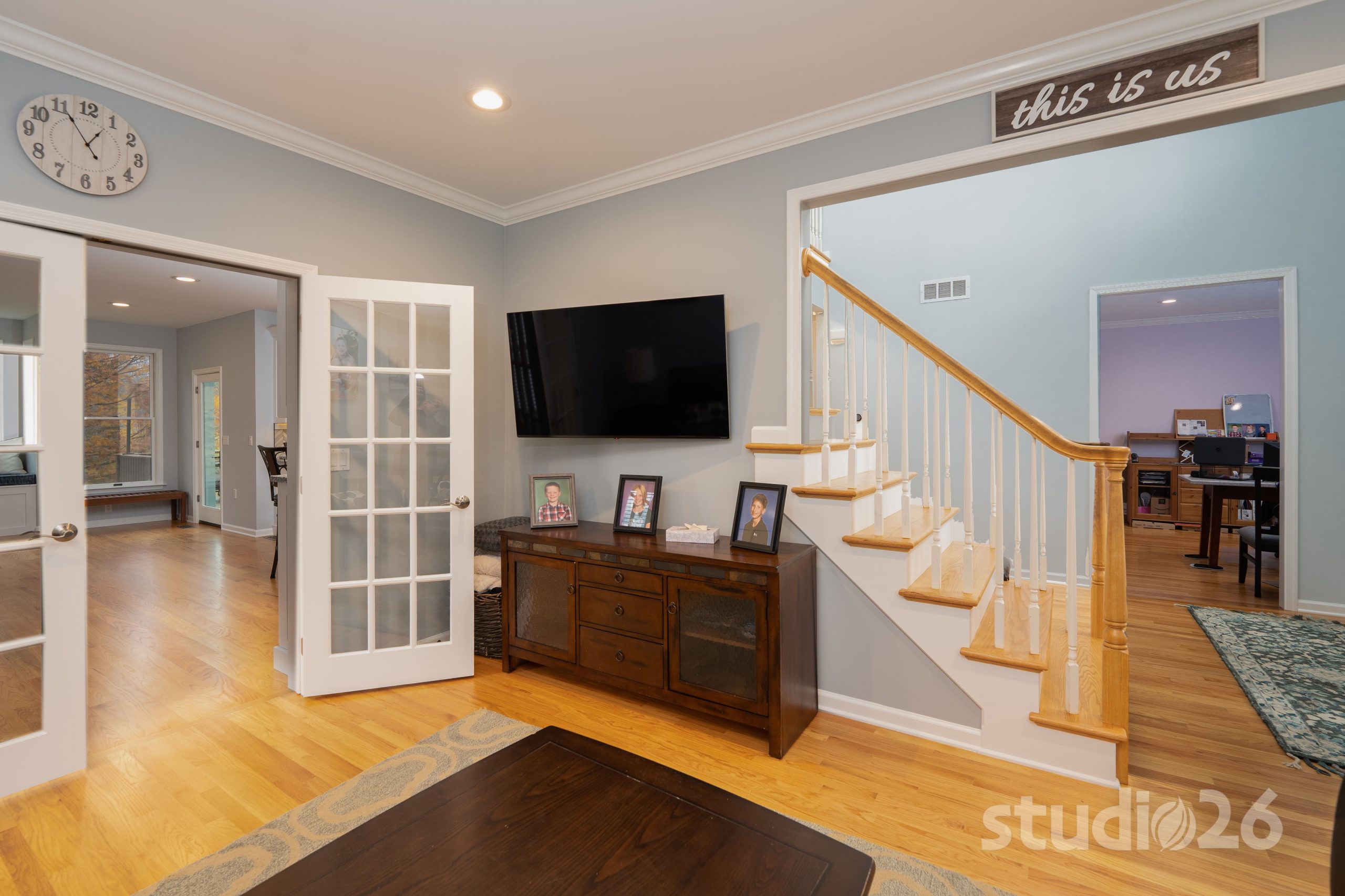 Perhaps the most notable improvement in the home is the spacious custom kitchen personalized to fit the homeowners’ specific needs and desires. But before we could even get very far along, the existing framing in this part of the home was so unique that opening up a couple of walls required two substantially sized steel beams with specially designed plumbing ‘portholes’ in its webbing supported by steel posts down a story to the foundation below just to make the project possible. With increased cabinet storage (including lots of drawers), the huge center island is perfect for preparing large family feasts. And for more informal social gatherings or just grabbing a quick bite to eat, we created a unique raised counter peninsula with spacious room for seven and a flanking large panel TV perfect for gameday events at the home. And as is a common theme in this exciting project, we more than doubled the amount of natural light coming into the kitchen increasing overall brightness as well as desirable sightlines to the rear yard. This was a fun and exciting project to be a part of – one that was both creative and rewarding. We are very blessed for our relationship with these terrific clients!