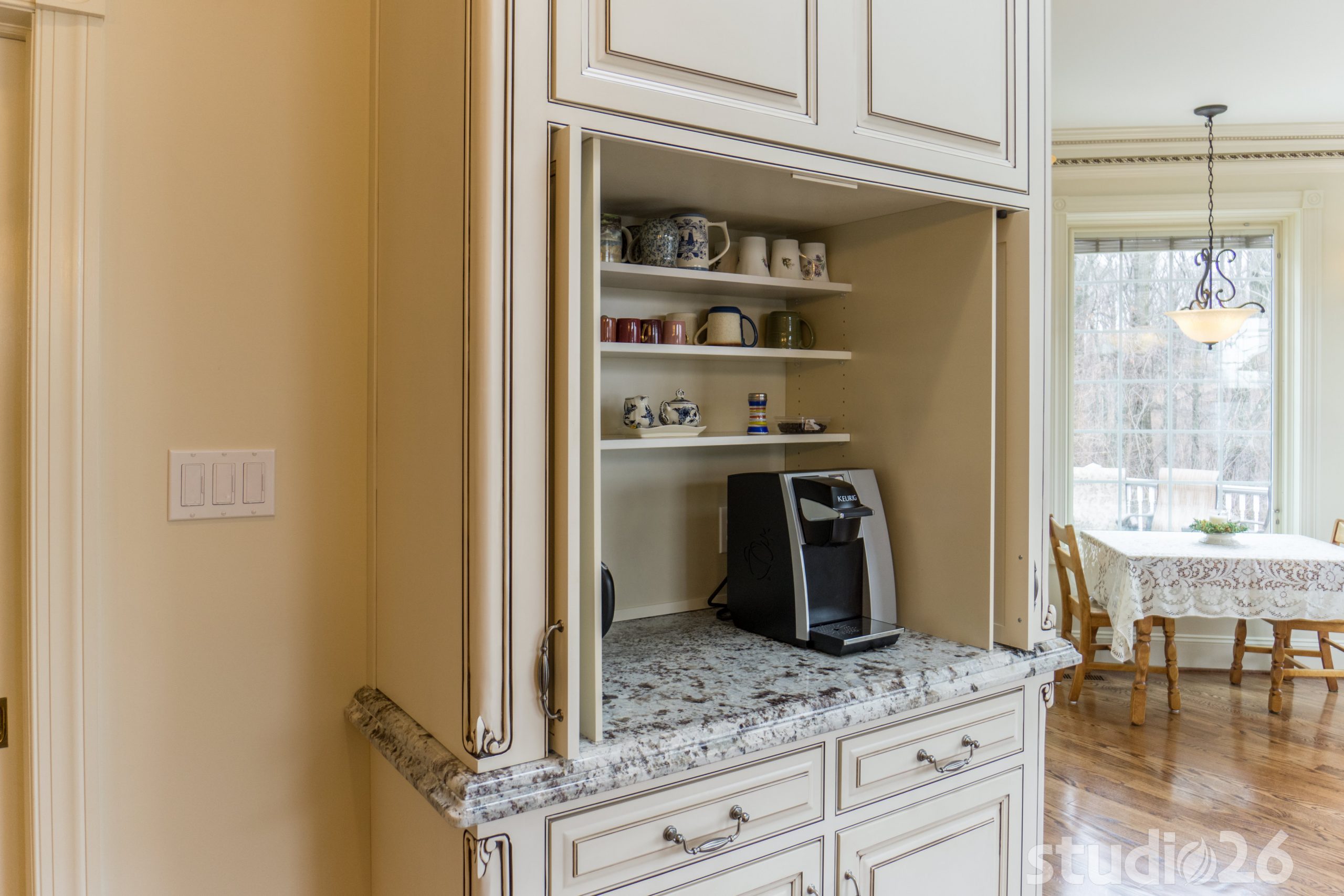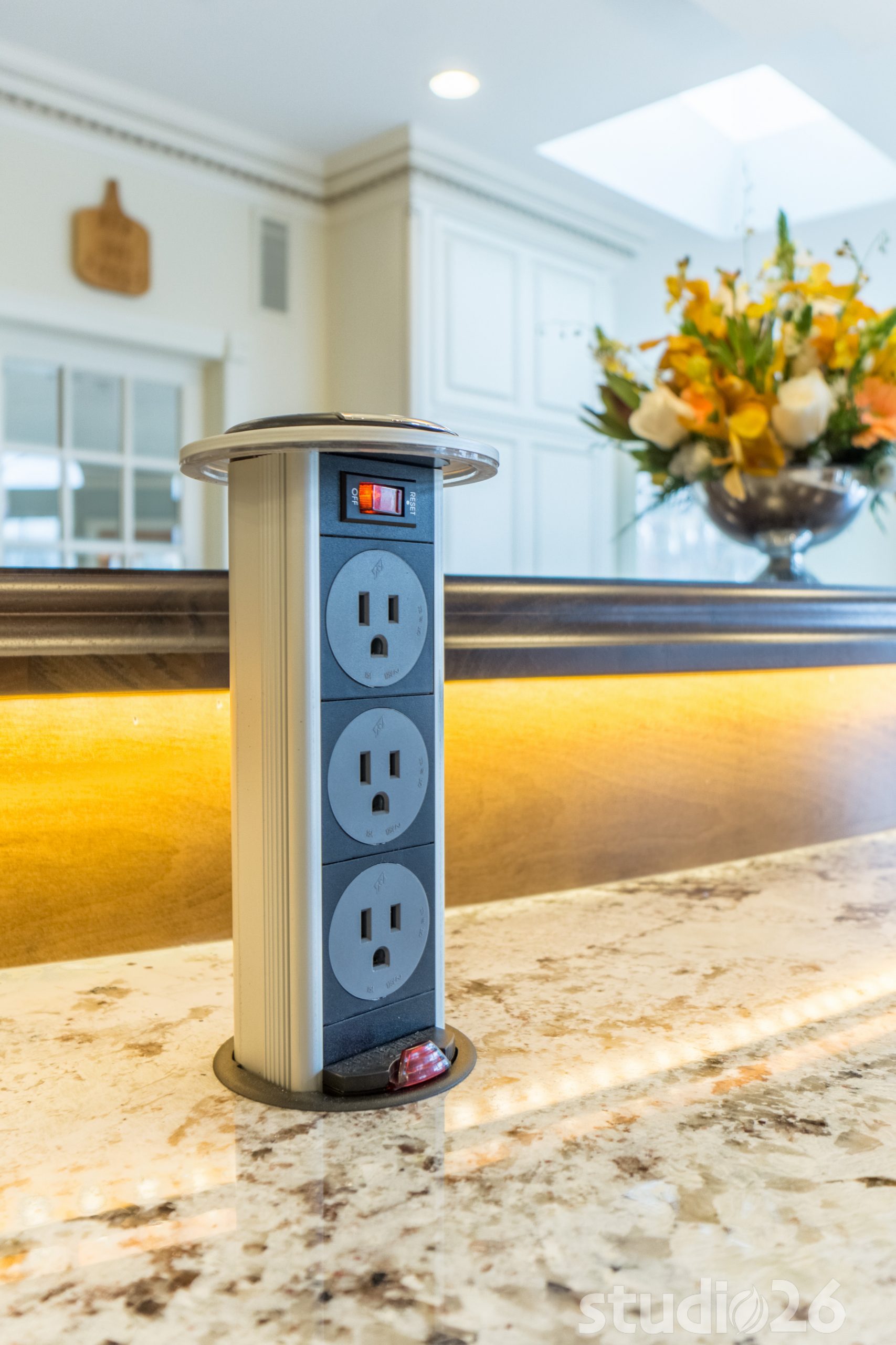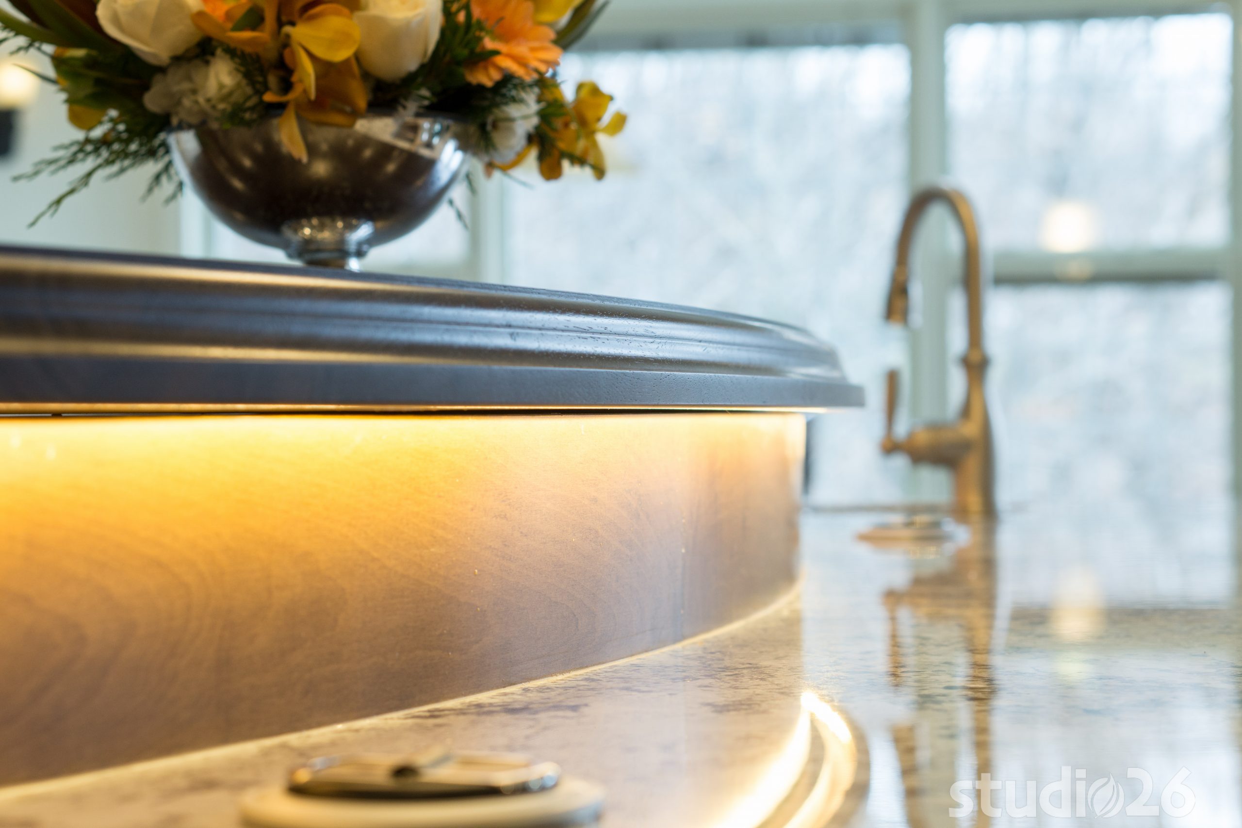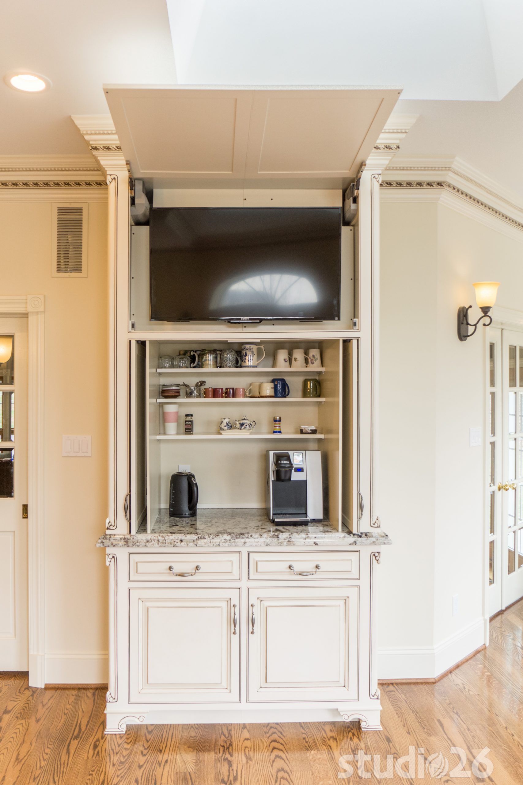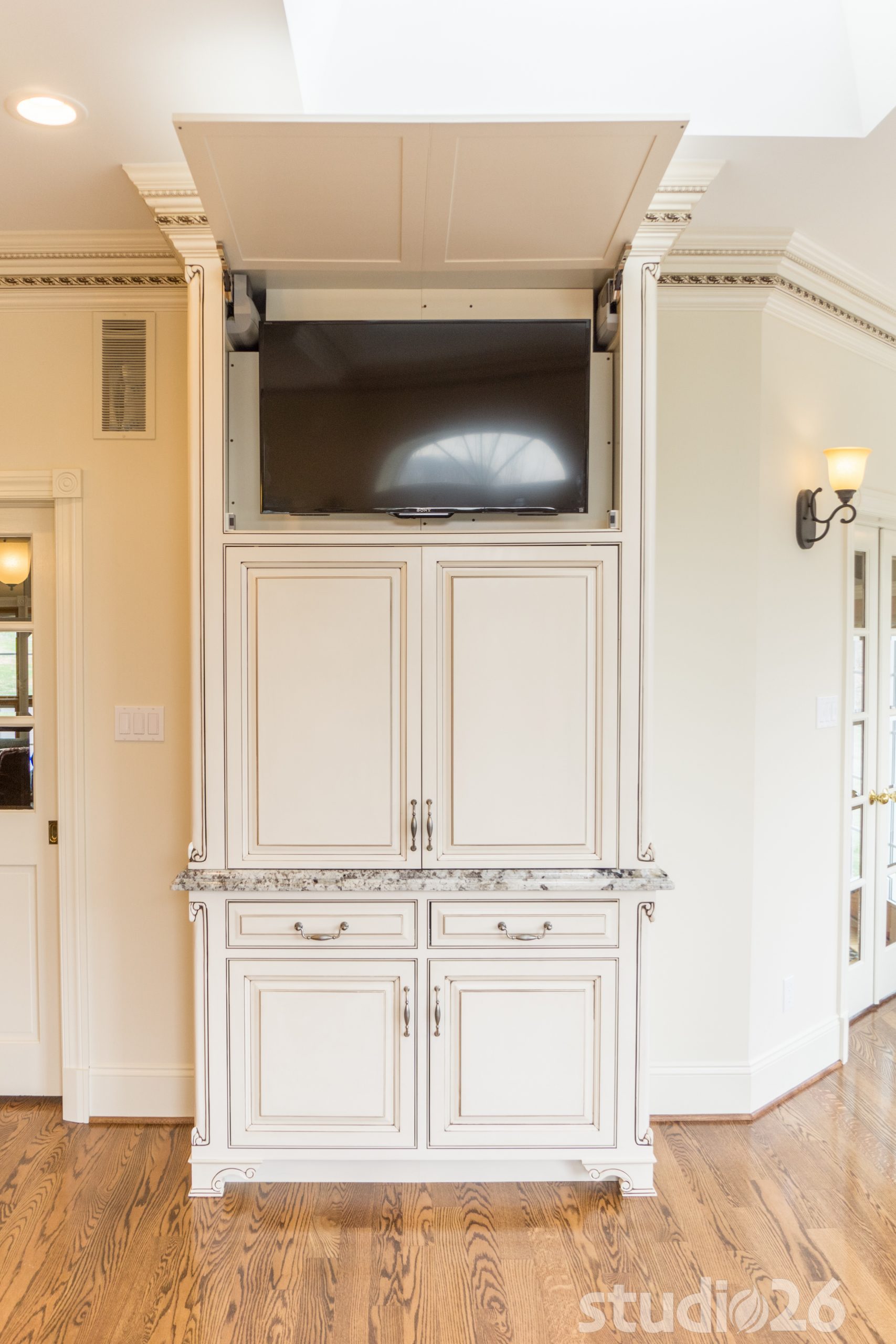 As we dove deeper into the kitchen design, we helped our client capture specific storage solutions that they had been desiring for quite a while – everything from typical pantry items and smaller appliances to hidden hideouts for hand towels, paper towels, and knives to name a few. In an effort to maintain the inherent beauty of the alluring glass tile backsplash and the double-thickness granite countertops, we were even able to help minimize the visual impact of most of the kitchen’s electrical outlets by incorporating an undercabinet power solution around the perimeter and pop-up electrical towers in the island. Also quite noteworthy is the hidden coffee station with recessed doors and the concealed TV area with remote-activated lift door. Innovative and beautiful lighting throughout help to further transform this space into something quite memorable for this family now and for many years to come!