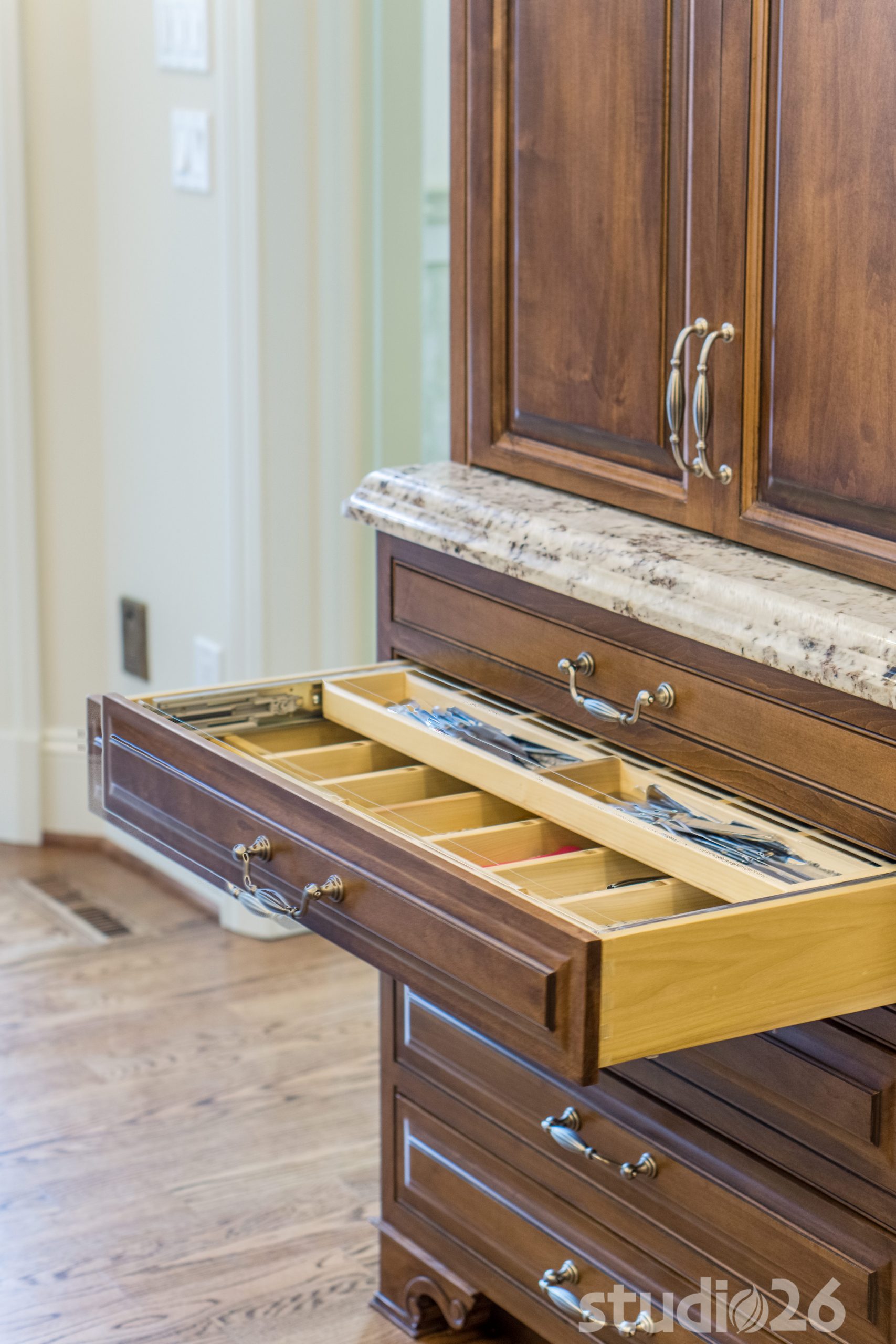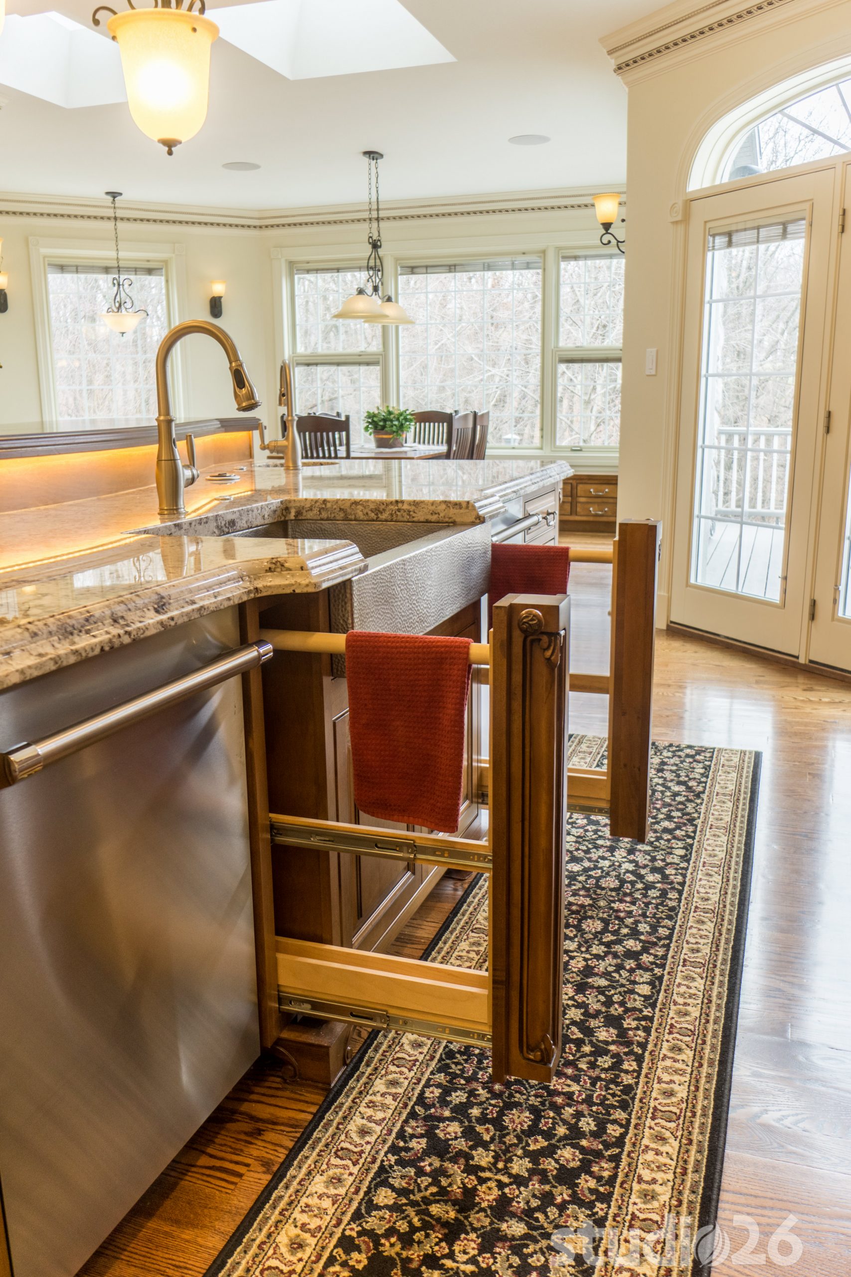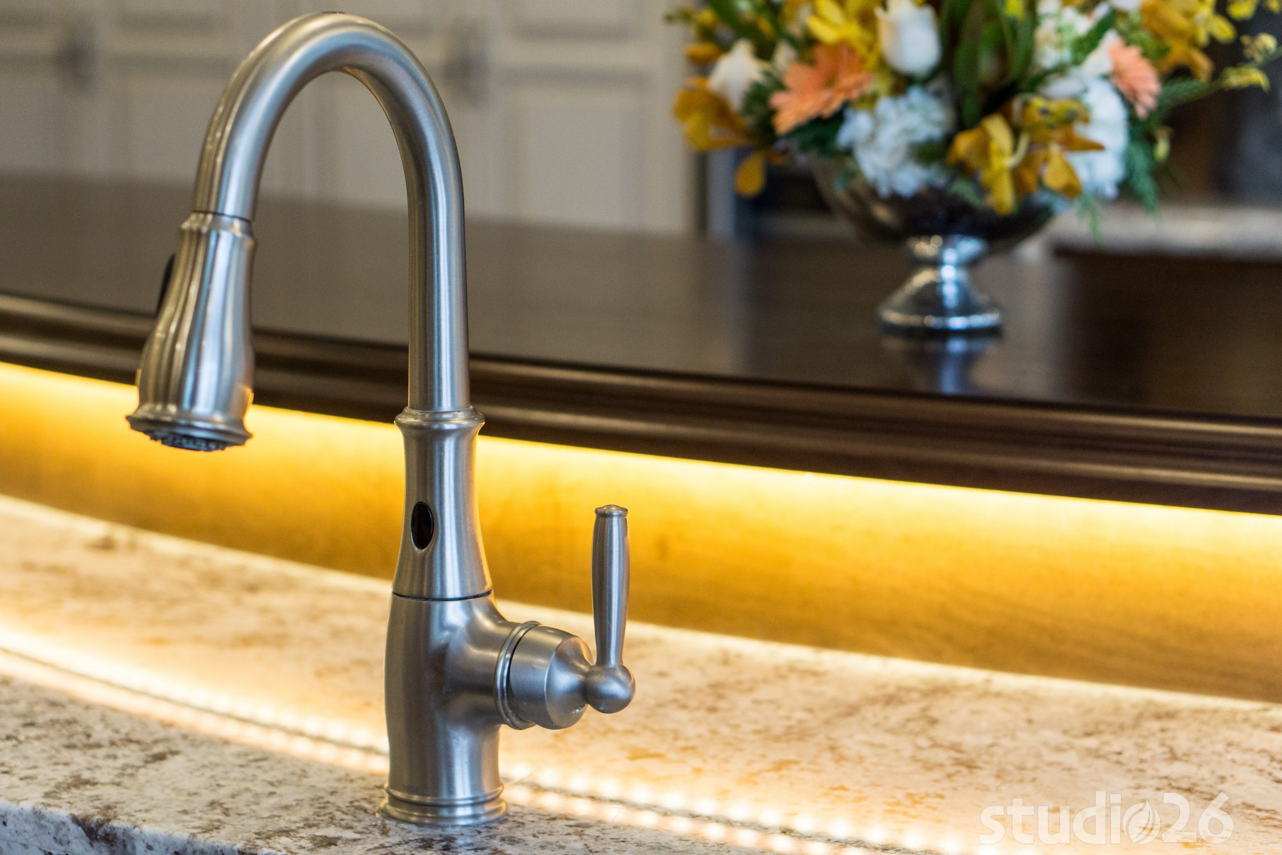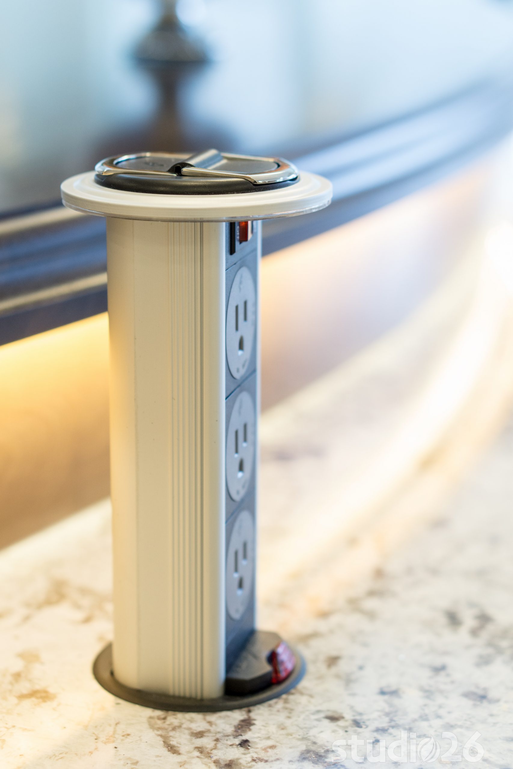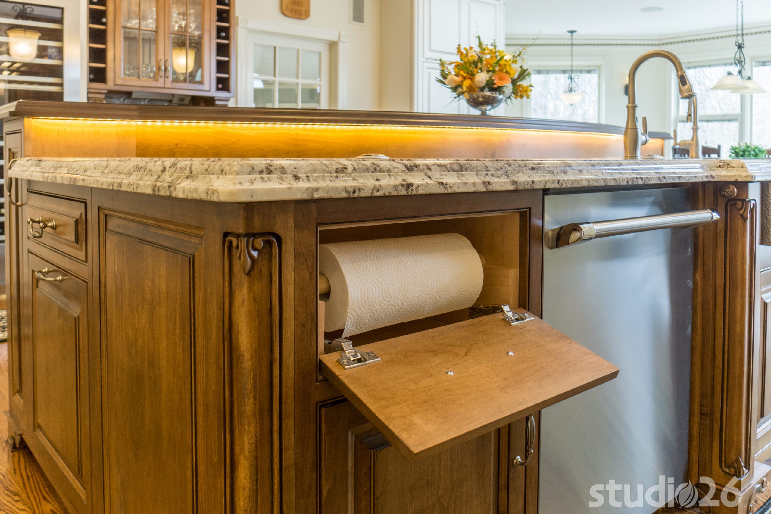 As we dove deeper into the kitchen design, we helped our client capture specific storage solutions that they had been desiring for quite a while – everything from typical pantry items and smaller appliances to hidden hideouts for hand towels, paper towels, and knives to name a few. In an effort to maintain the inherent beauty of the alluring glass tile backsplash and the double-thickness granite countertops, we were even able to help minimize the visual impact of most of the kitchen’s electrical outlets by incorporating an undercabinet power solution around the perimeter and pop-up electrical towers in the island. Also quite noteworthy is the hidden coffee station with recessed doors and the concealed TV area with remote-activated lift door. Innovative and beautiful lighting throughout help to further transform this space into something quite memorable for this family now and for many years to come!