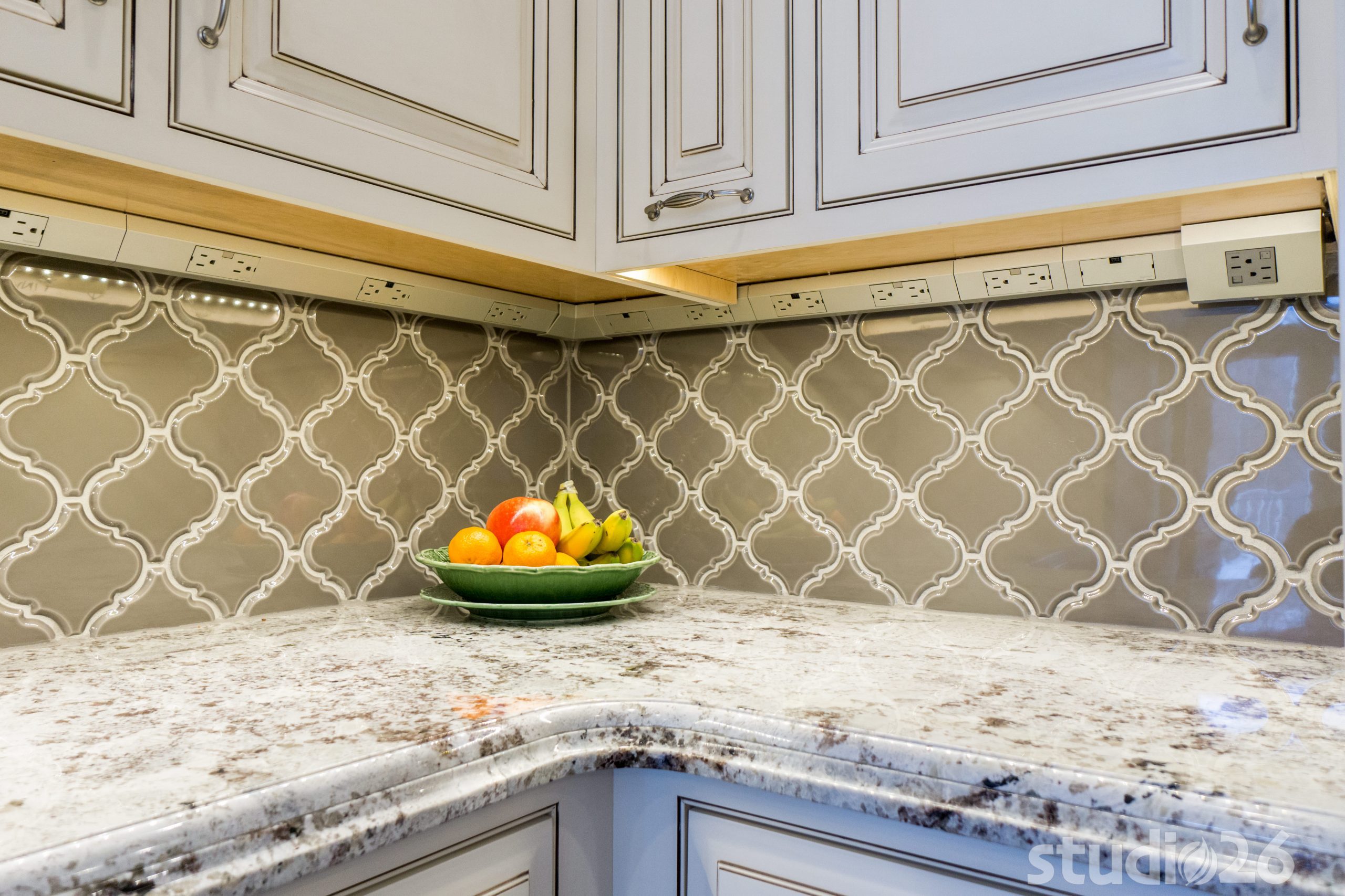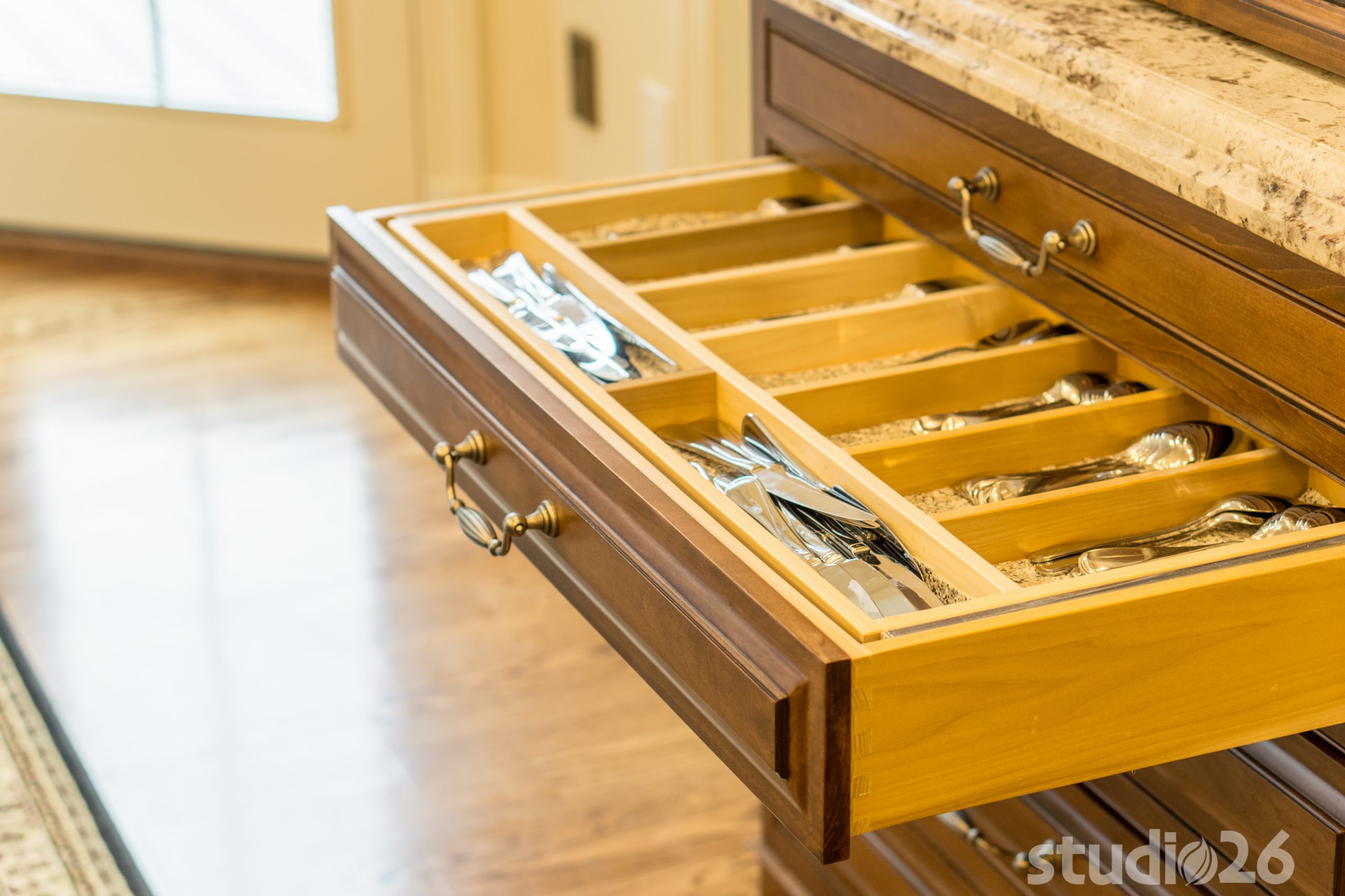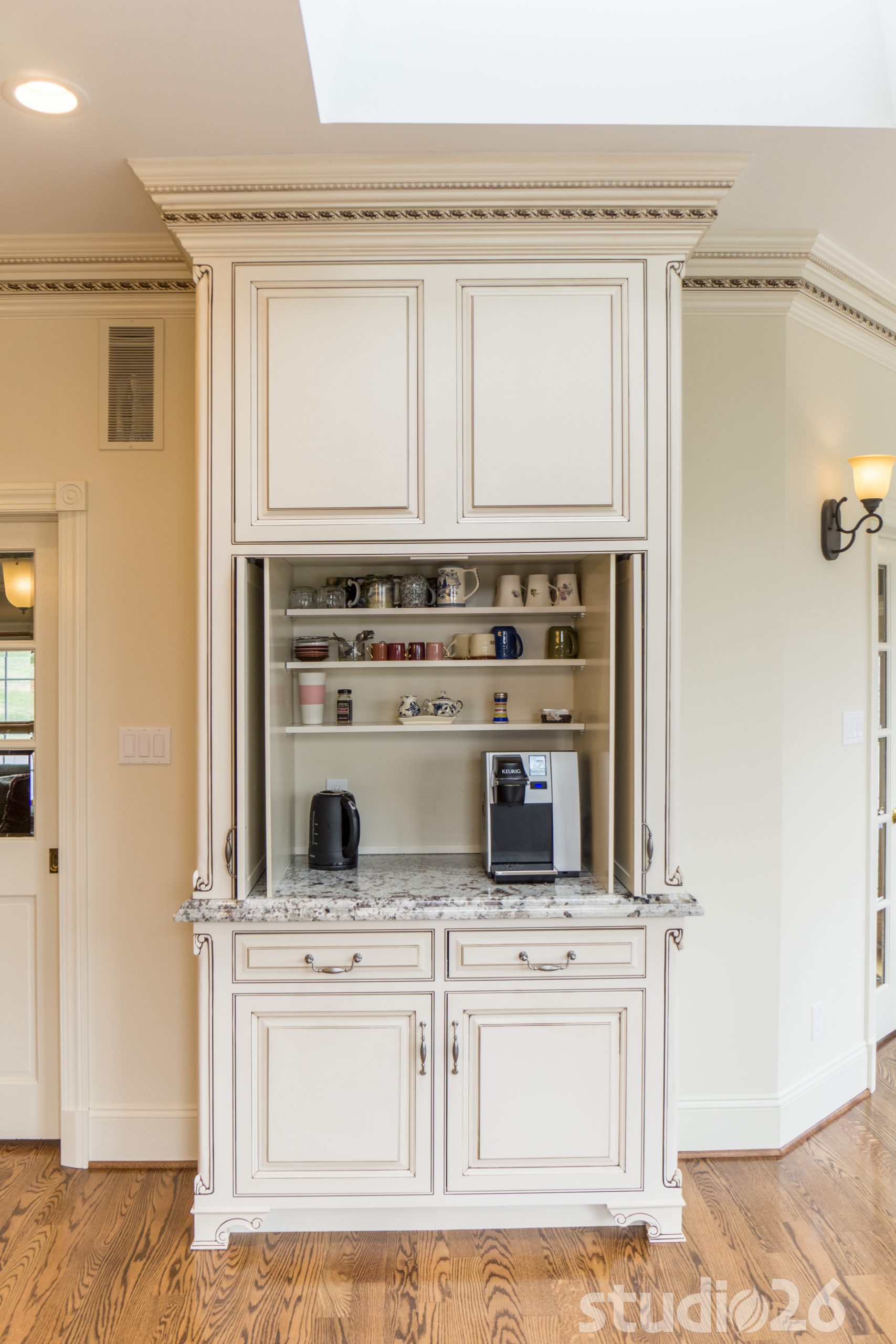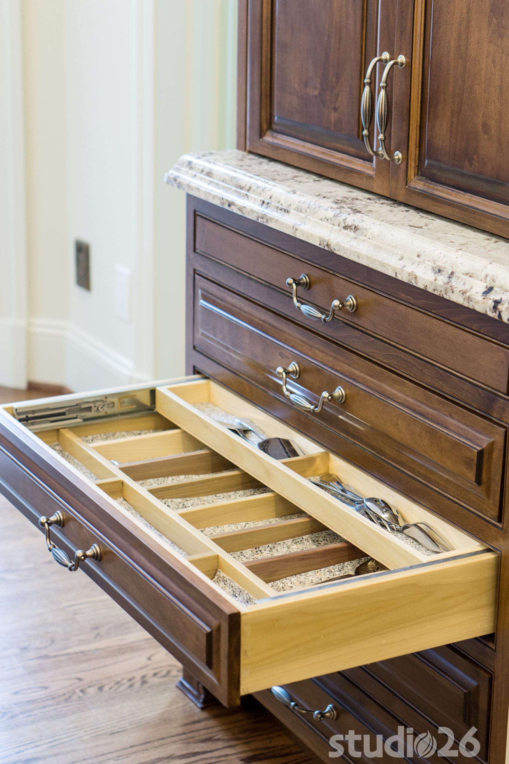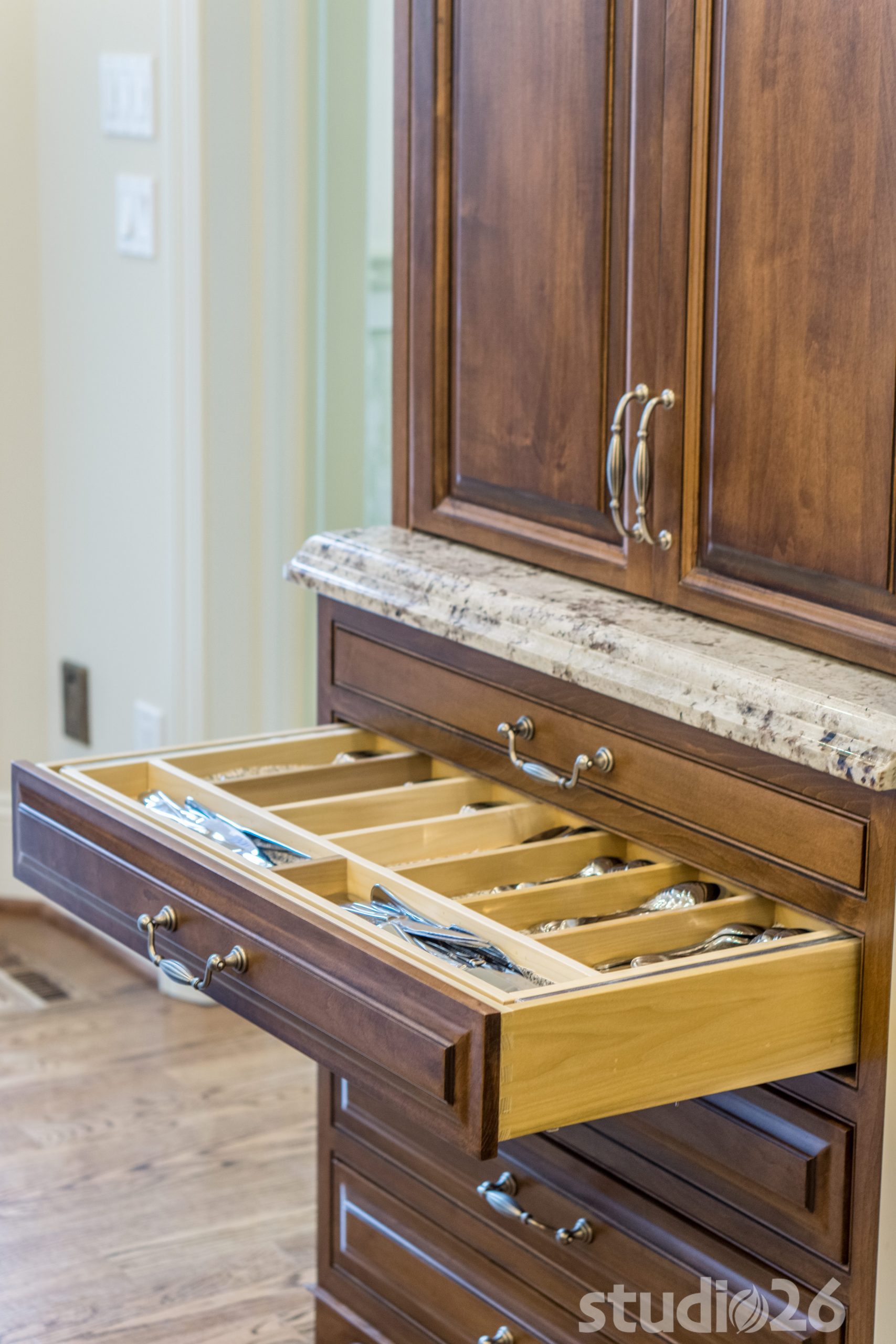 As we dove deeper into the kitchen design, we helped our client capture specific storage solutions that they had been desiring for quite a while – everything from typical pantry items and smaller appliances to hidden hideouts for hand towels, paper towels, and knives to name a few. In an effort to maintain the inherent beauty of the alluring glass tile backsplash and the double-thickness granite countertops, we were even able to help minimize the visual impact of most of the kitchen’s electrical outlets by incorporating an undercabinet power solution around the perimeter and pop-up electrical towers in the island. Also quite noteworthy is the hidden coffee station with recessed doors and the concealed TV area with remote-activated lift door. Innovative and beautiful lighting throughout help to further transform this space into something quite memorable for this family now and for many years to come!