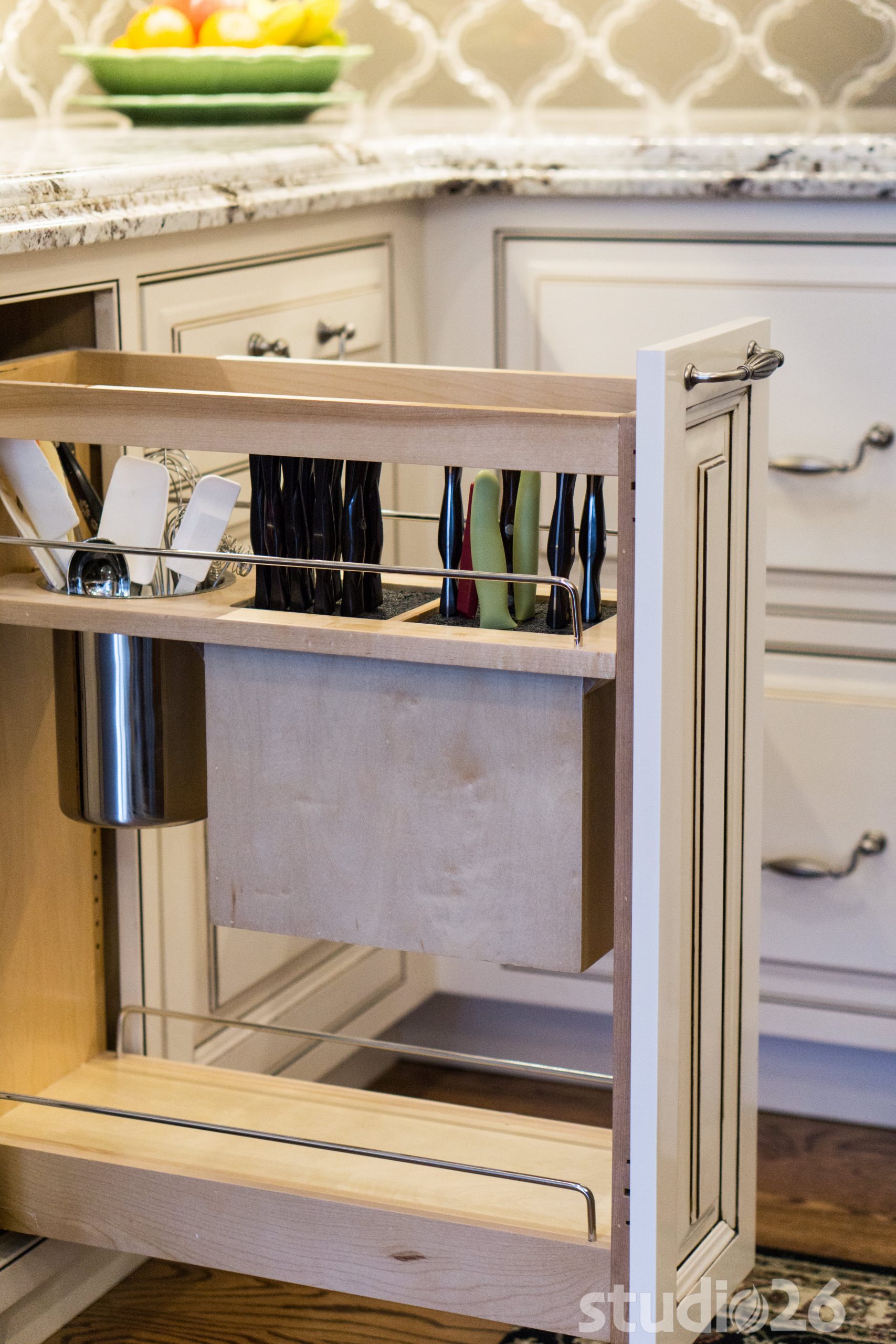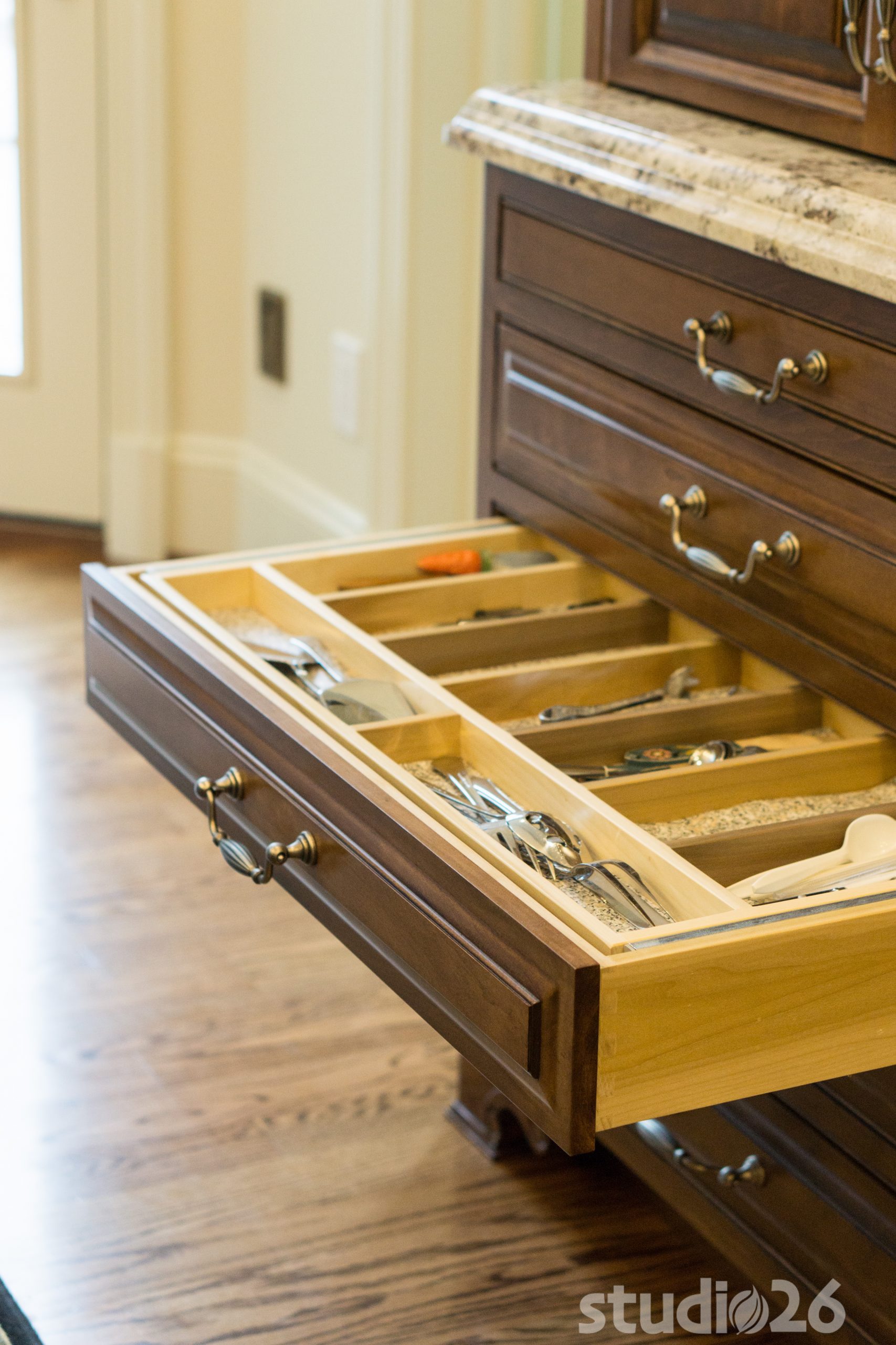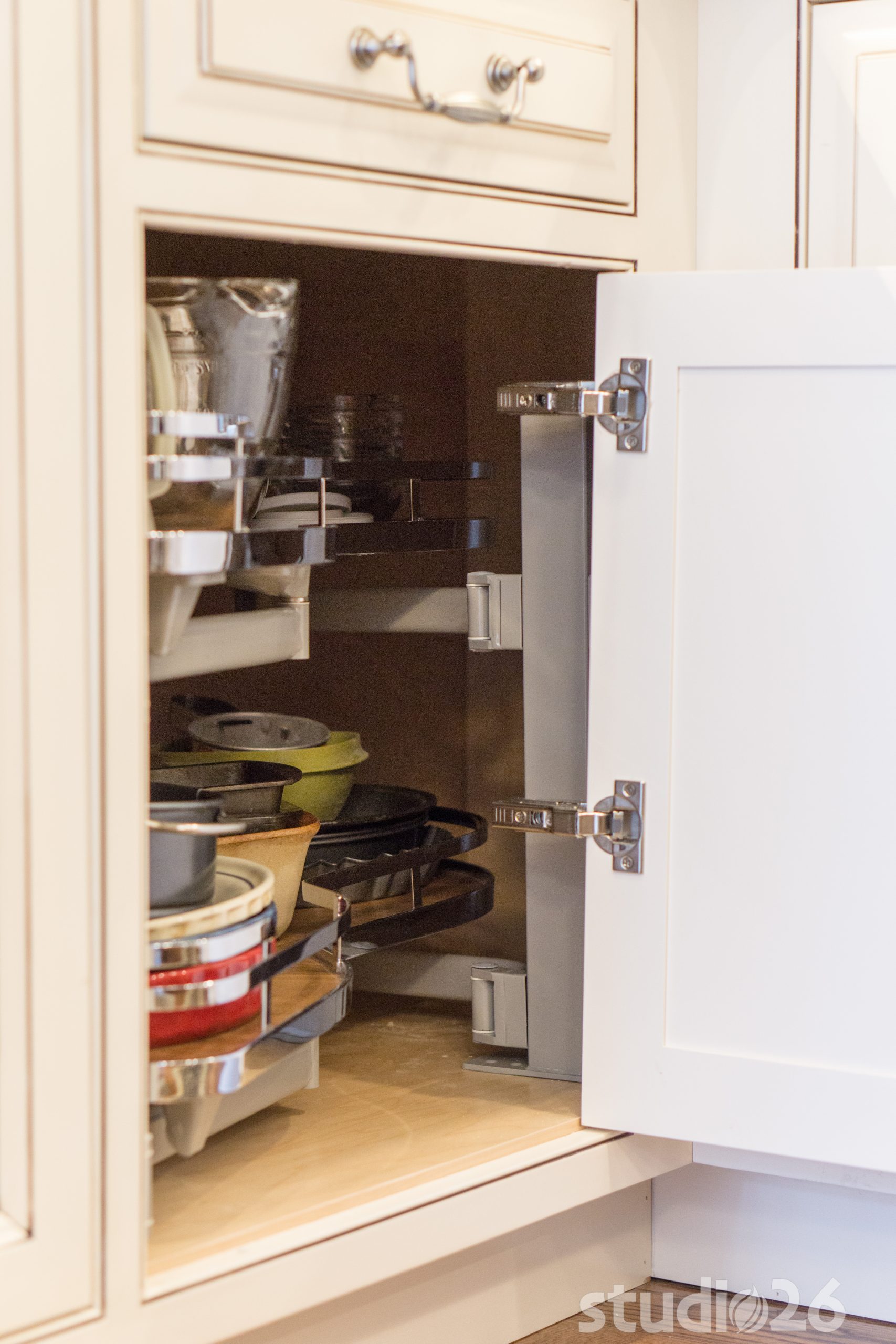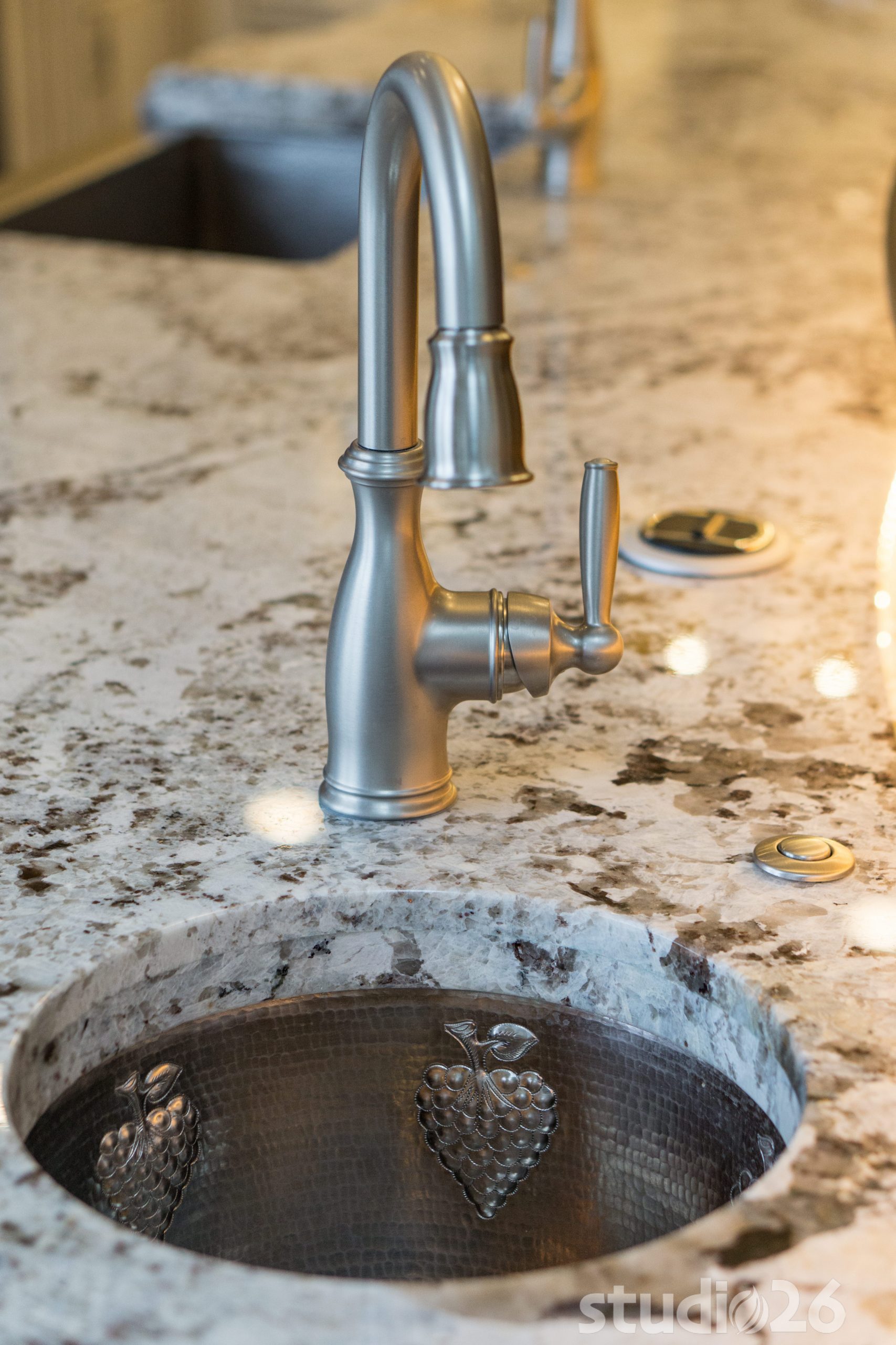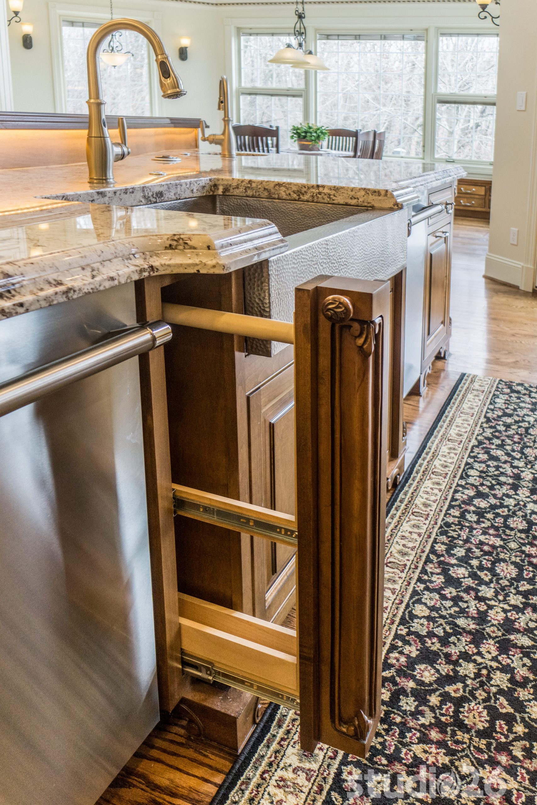 As we dove deeper into the kitchen design, we helped our client capture specific storage solutions that they had been desiring for quite a while – everything from typical pantry items and smaller appliances to hidden hideouts for hand towels, paper towels, and knives to name a few. In an effort to maintain the inherent beauty of the alluring glass tile backsplash and the double-thickness granite countertops, we were even able to help minimize the visual impact of most of the kitchen’s electrical outlets by incorporating an undercabinet power solution around the perimeter and pop-up electrical towers in the island. Also quite noteworthy is the hidden coffee station with recessed doors and the concealed TV area with remote-activated lift door. Innovative and beautiful lighting throughout help to further transform this space into something quite memorable for this family now and for many years to come!