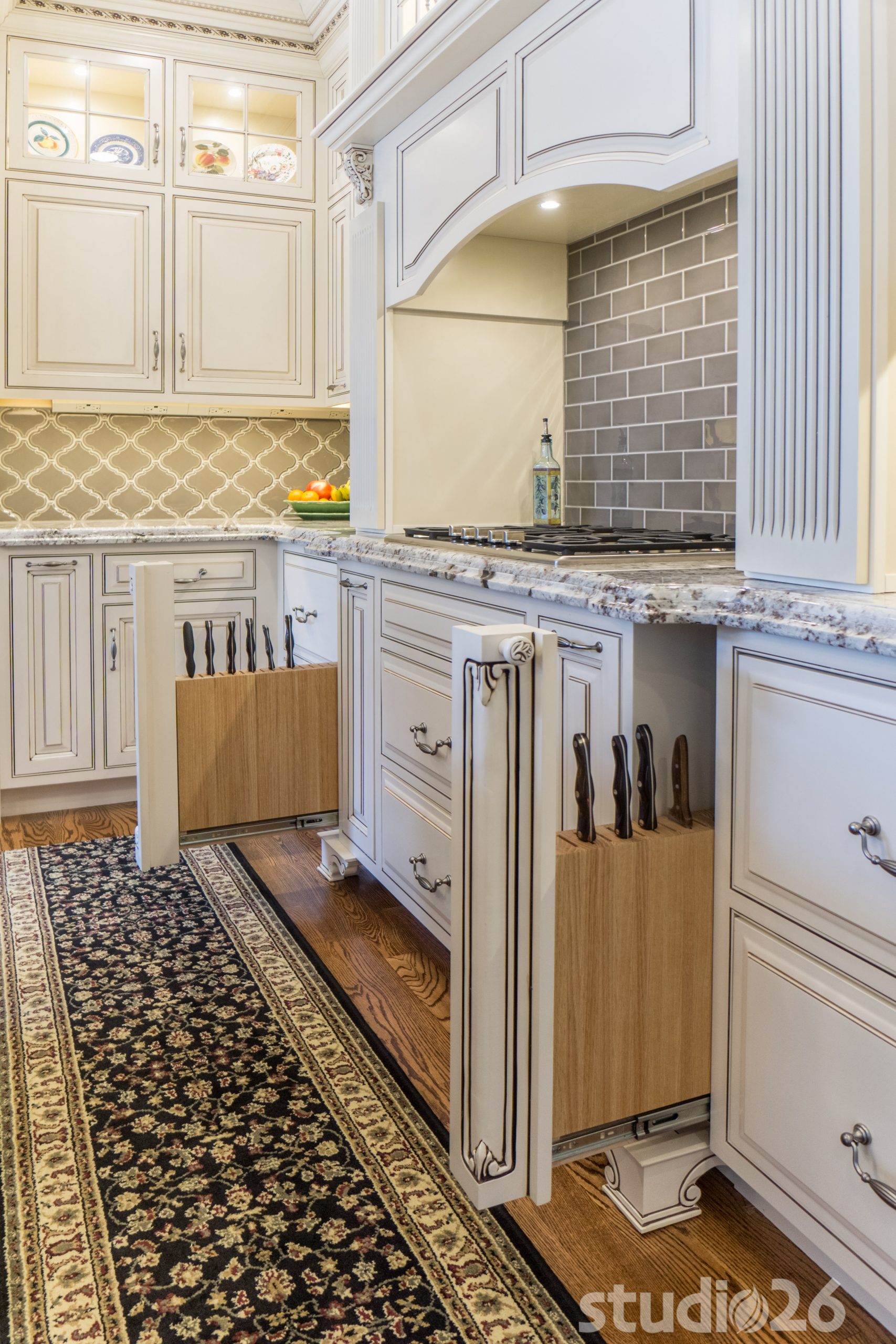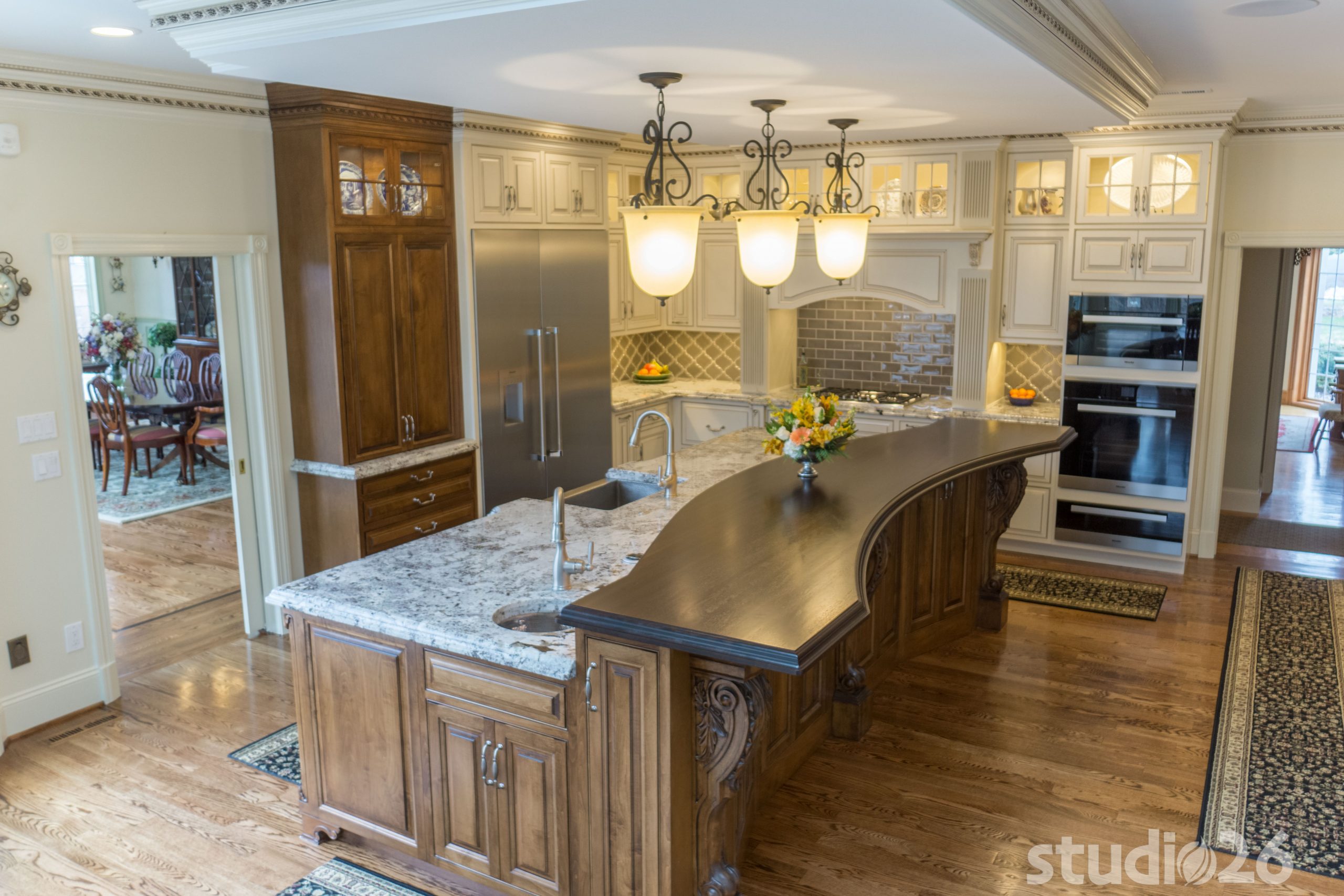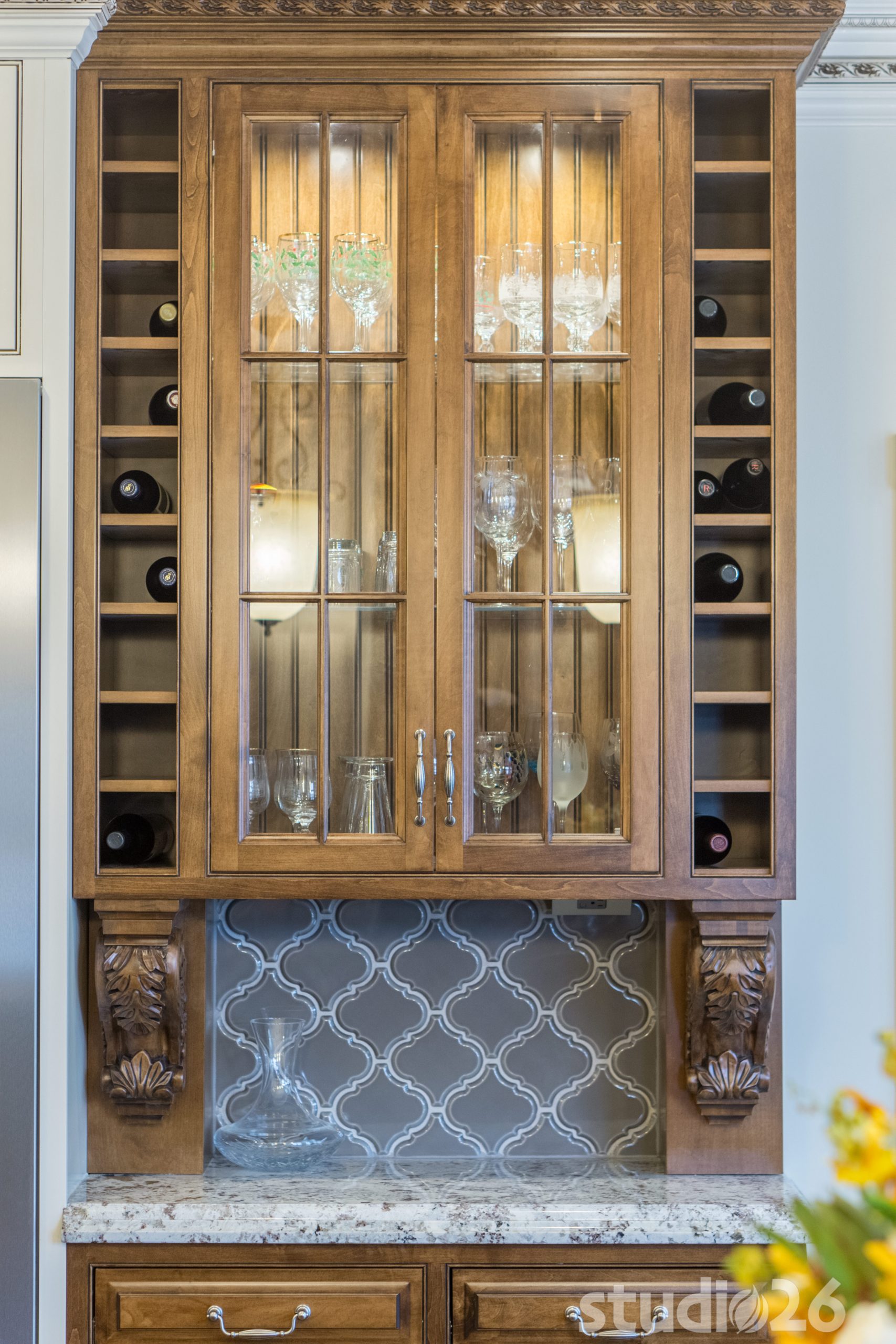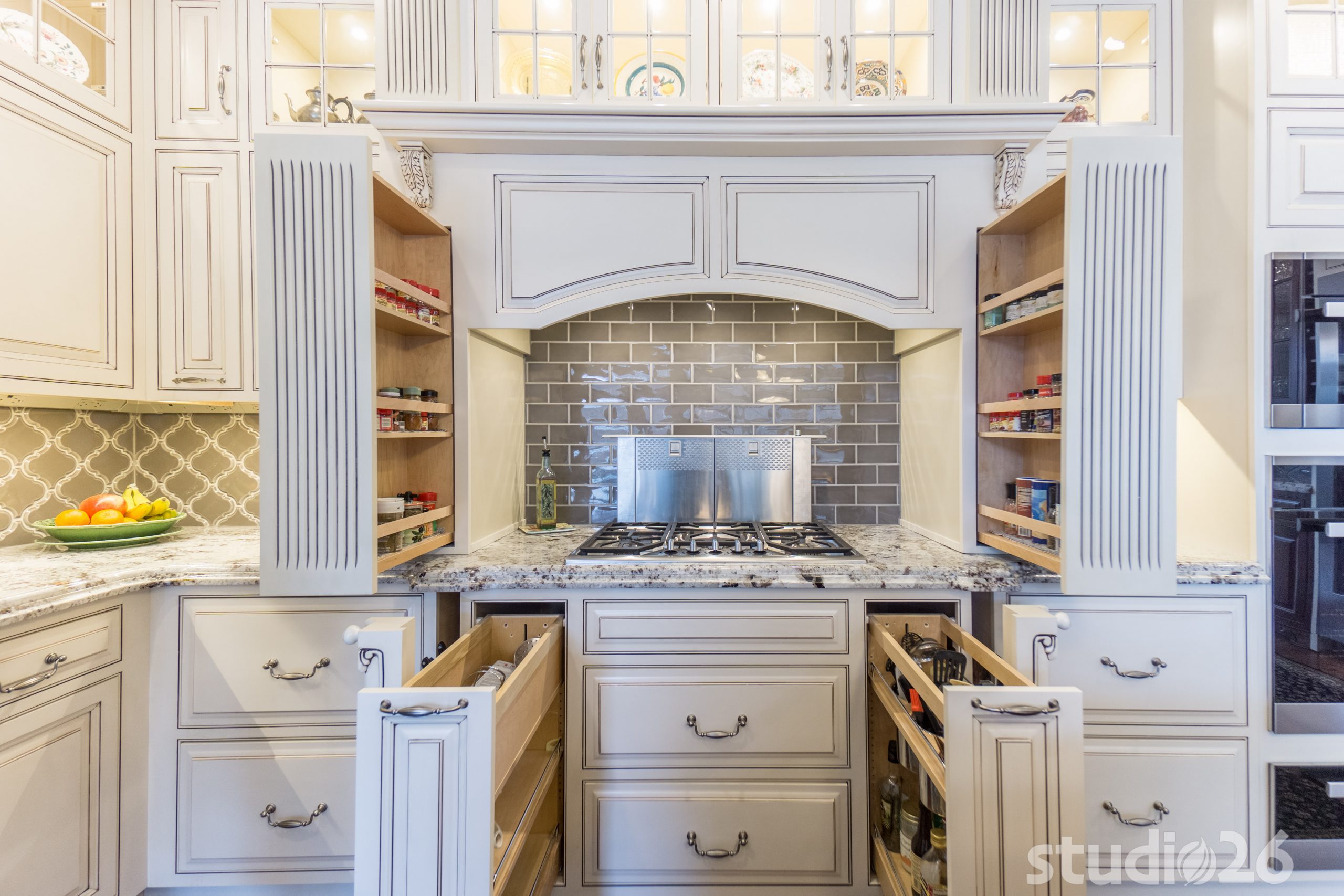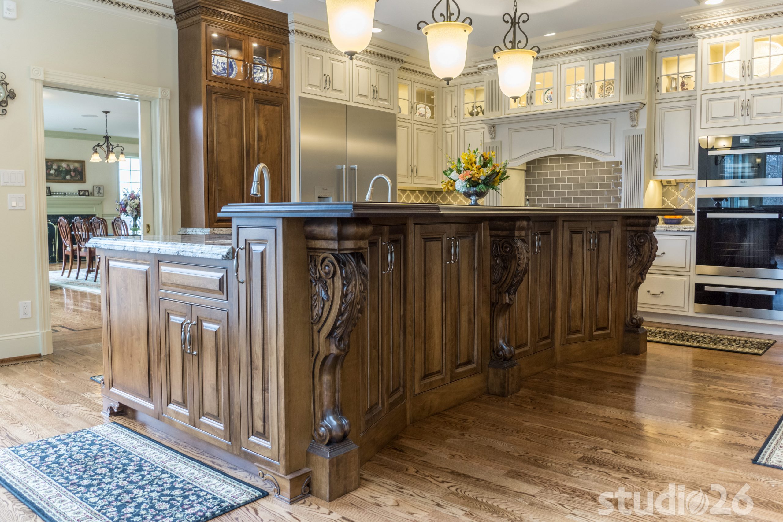When conceiving a vision for the kitchen, our client was excited about the prospect of showcasing a French provincial aesthetic, which already can be found around parts of the rest of the home. In the new design, these often ornate details cannot only be found in the custom cabinetry itself, but also in the lavish five-piece crown moldings throughout the kitchen and into the adjacent breakfast nook area. After much collaborative deliberation back and forth, our client decided to move forward with a potentially more risky decision in mixing painted with stained cabinetry around the kitchen – a decision we believe paid off in spades. In addition to the entire island being stained, we were able to integrate two more furniture-like elements on flanking sides as visual anchors or bookends to the largely off-white, mocha-glazed (to help play off the brown stain) cabinetry that is dominant throughout.