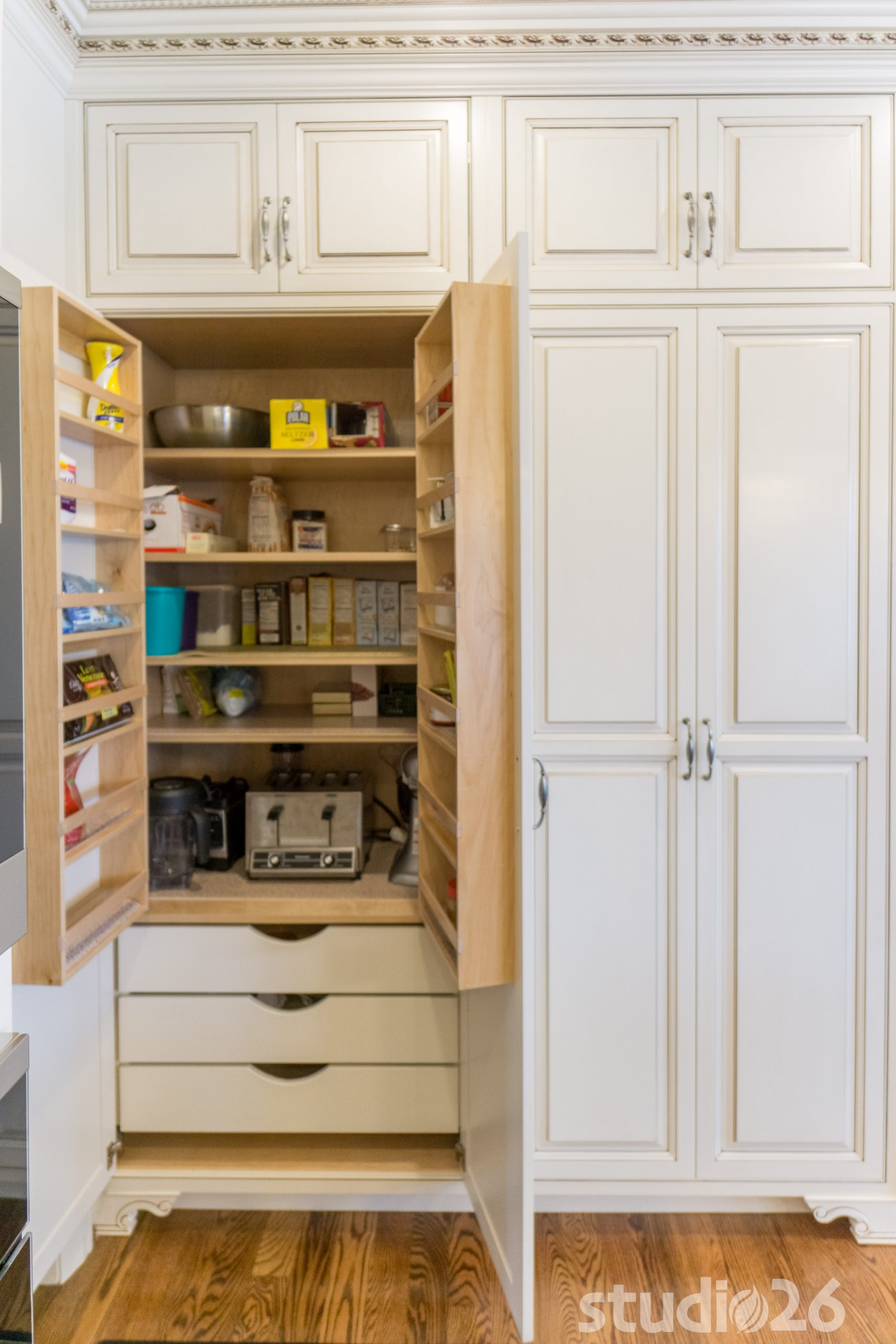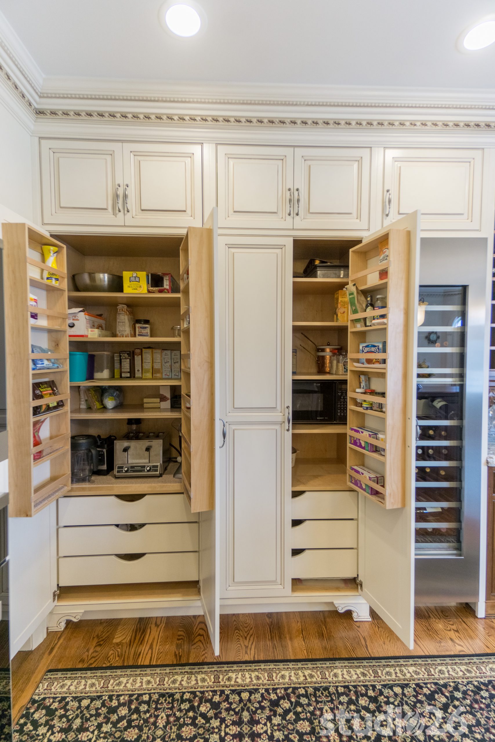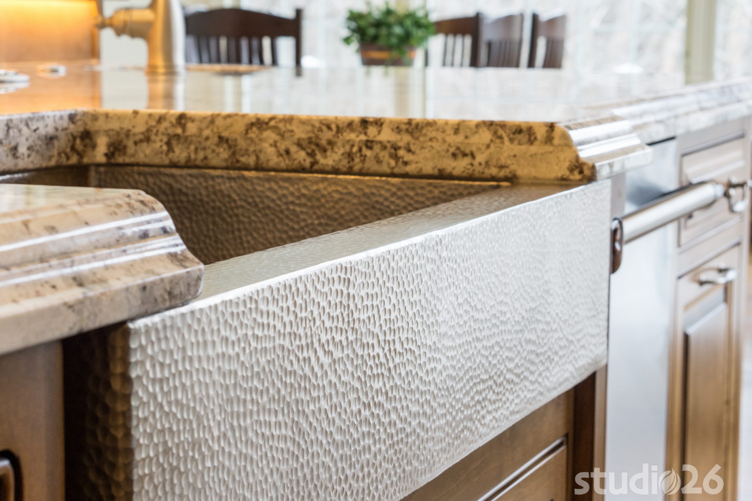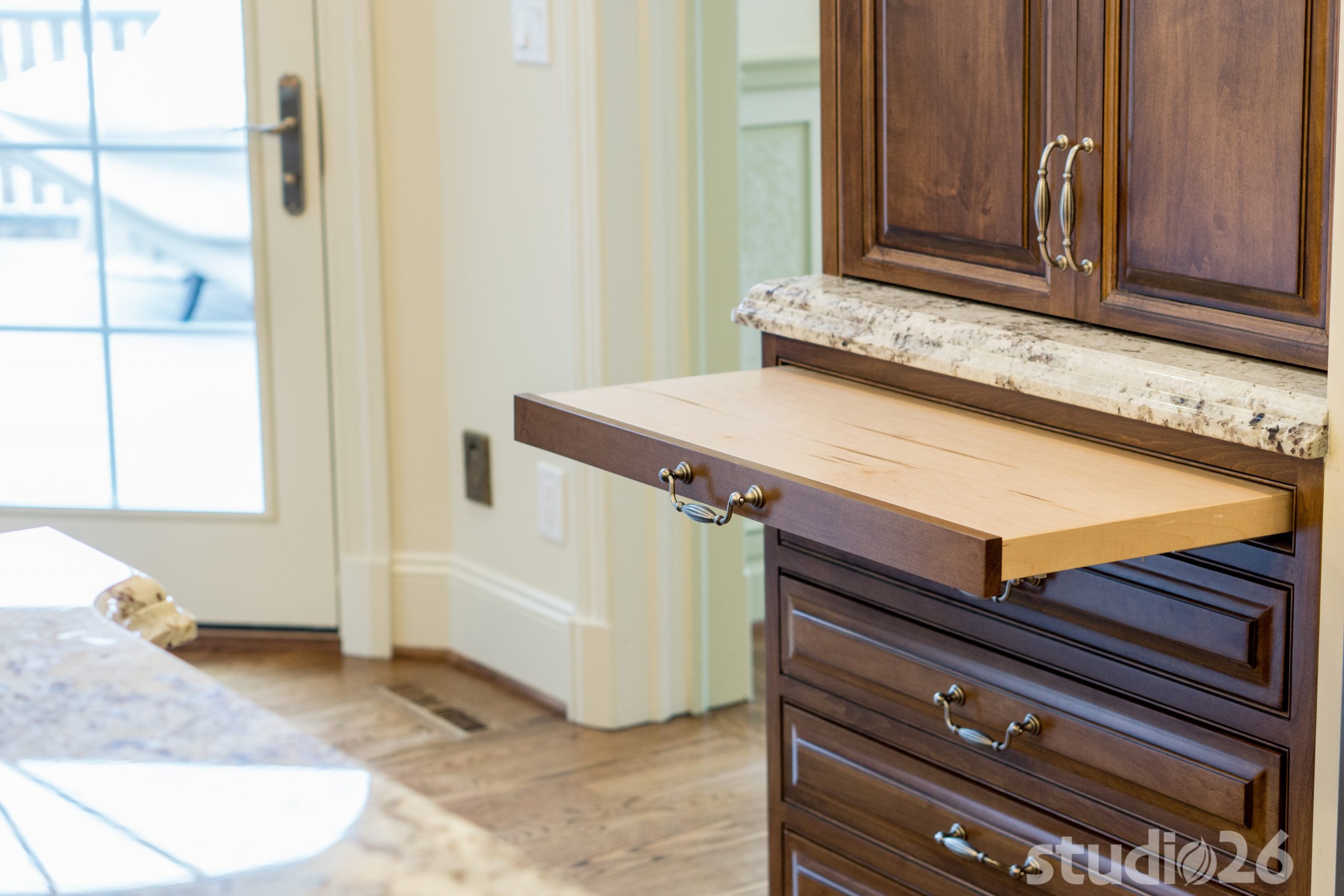 When conceiving a vision for the kitchen, our client was excited about the prospect of showcasing a French provincial aesthetic, which already can be found around parts of the rest of the home. In the new design, these often ornate details cannot only be found in the custom cabinetry itself, but also in the lavish five-piece crown moldings throughout the kitchen and into the adjacent breakfast nook area. After much collaborative deliberation back and forth, our client decided to move forward with a potentially more risky decision in mixing painted with stained cabinetry around the kitchen – a decision we believe paid off in spades. In addition to the entire island being stained, we were able to integrate two more furniture-like elements on flanking sides as visual anchors or bookends to the largely off-white, mocha-glazed (to help play off the brown stain) cabinetry that is dominant throughout.