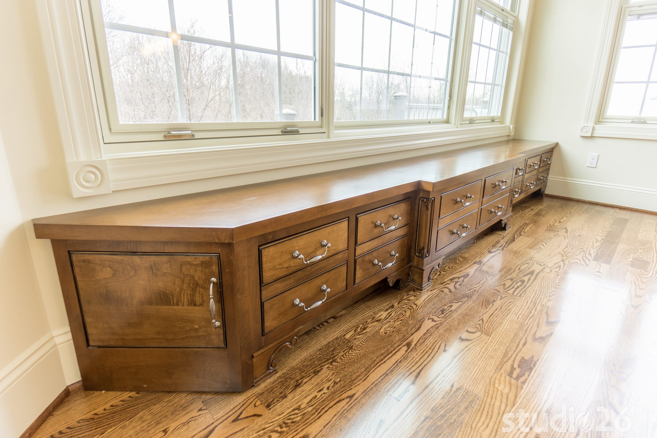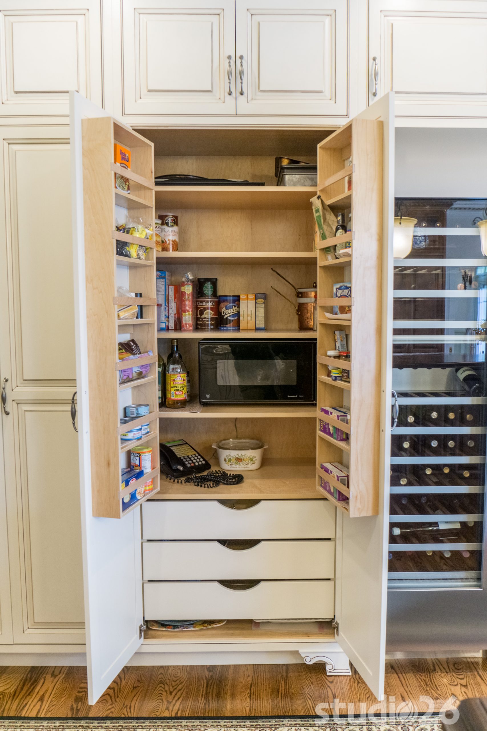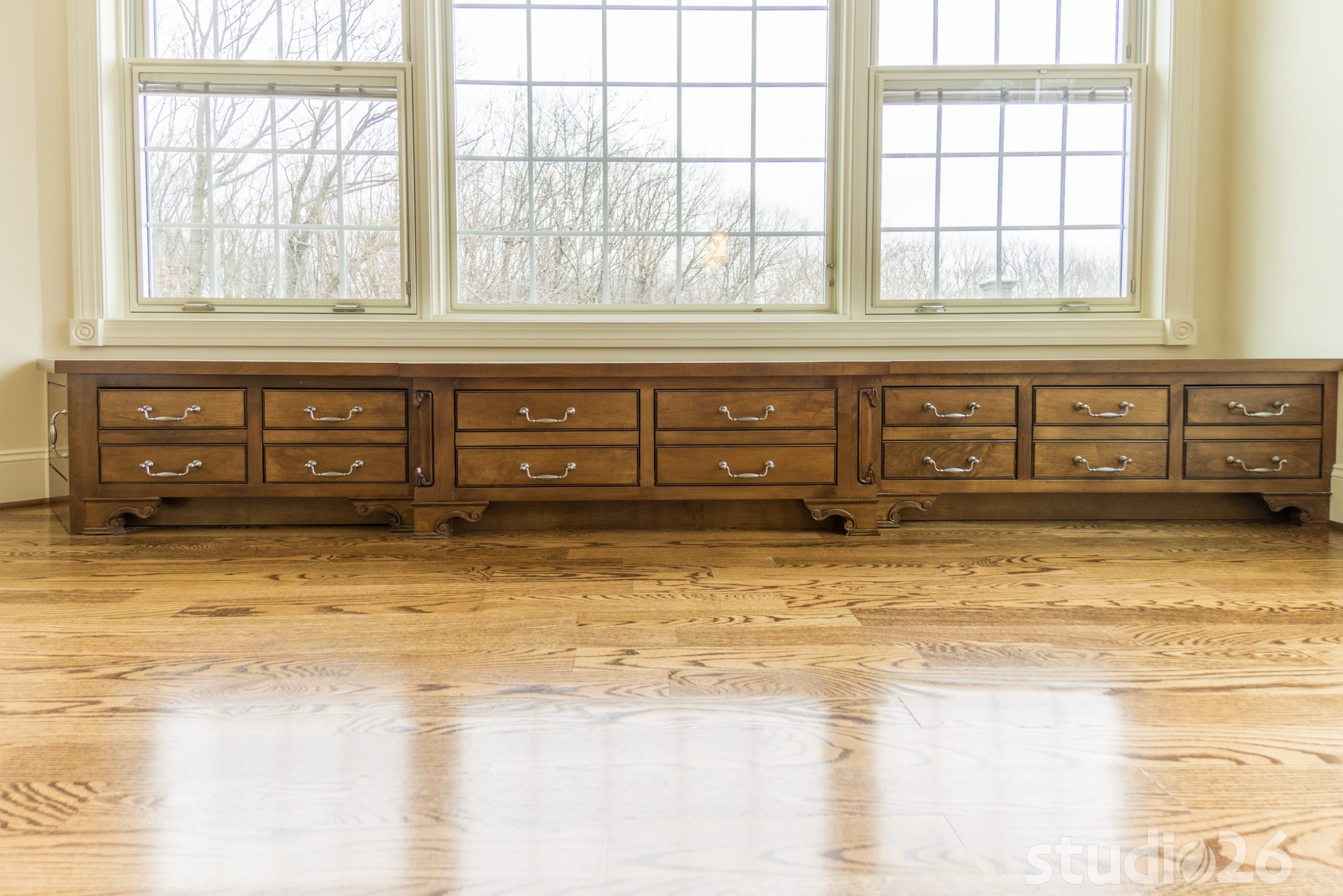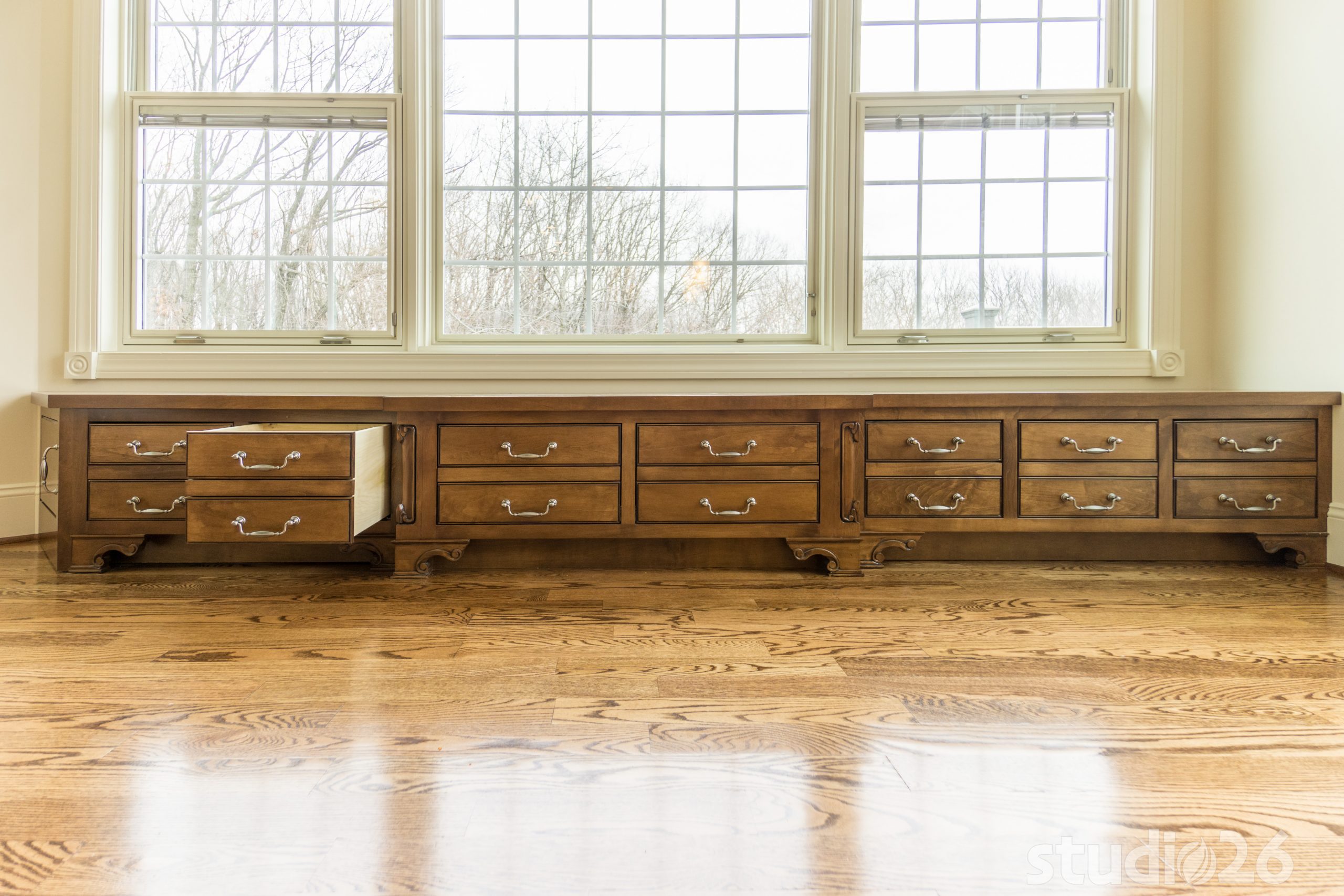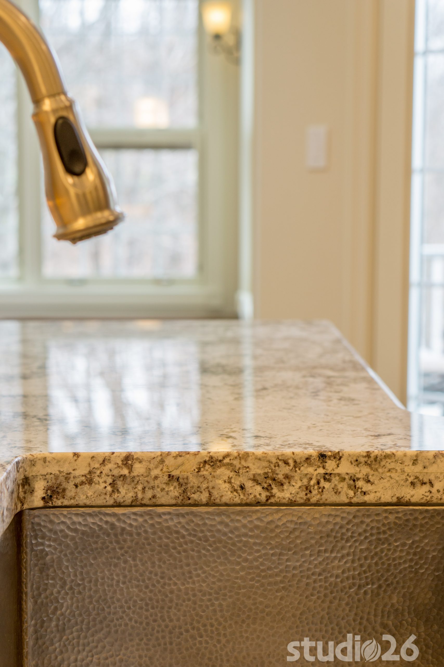 When conceiving a vision for the kitchen, our client was excited about the prospect of showcasing a French provincial aesthetic, which already can be found around parts of the rest of the home. In the new design, these often ornate details cannot only be found in the custom cabinetry itself, but also in the lavish five-piece crown moldings throughout the kitchen and into the adjacent breakfast nook area. After much collaborative deliberation back and forth, our client decided to move forward with a potentially more risky decision in mixing painted with stained cabinetry around the kitchen – a decision we believe paid off in spades. In addition to the entire island being stained, we were able to integrate two more furniture-like elements on flanking sides as visual anchors or bookends to the largely off-white, mocha-glazed (to help play off the brown stain) cabinetry that is dominant throughout.