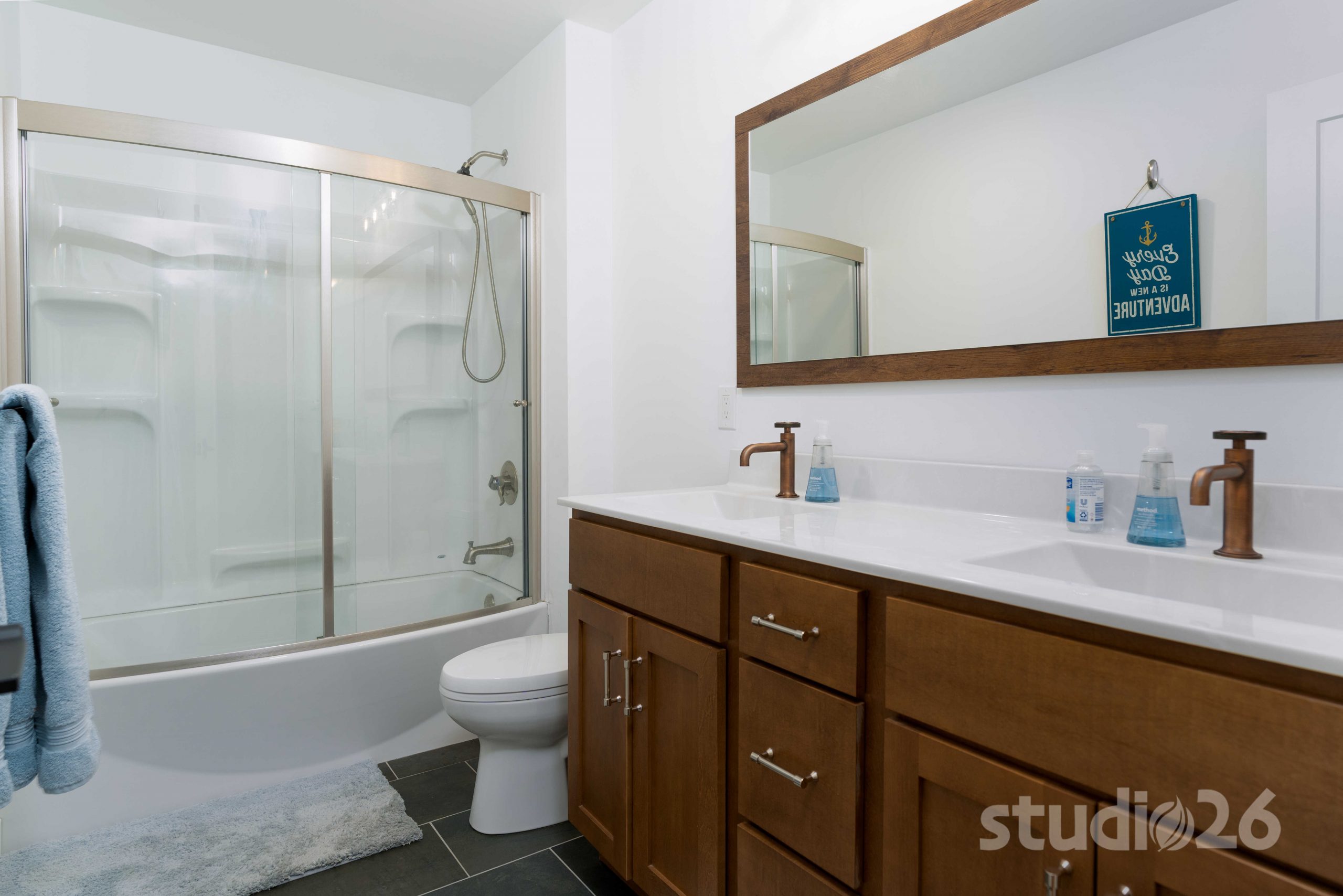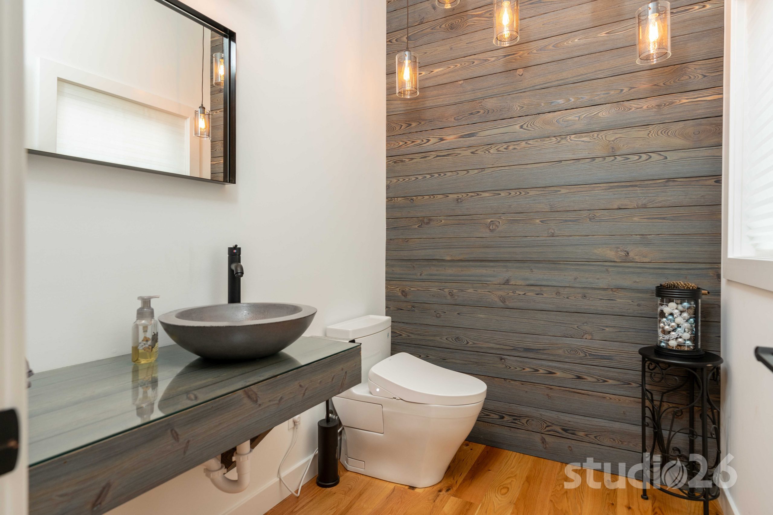 While the lower two floors offer very comfortable and spacious bedrooms and bathrooms, perhaps the most striking aspects of this home reside on the top level. One notable example is the home’s signature butterfly roof, which becomes a prominent cathedral design element in each of the second floor spaces, most notably in the Great Room where the roofline rises up to afford an array of glass welcoming the beautiful horizon outside! Right next door is the bold Kitchen perfect for any home chef and adjacent Dining/Lounge Area with its delightful, cantilevered kitchenette bumpout. On the other side of the vertical stairwell with stainless steel cable railing is a ‘hidden’ Study and an illustrious Powder Room.