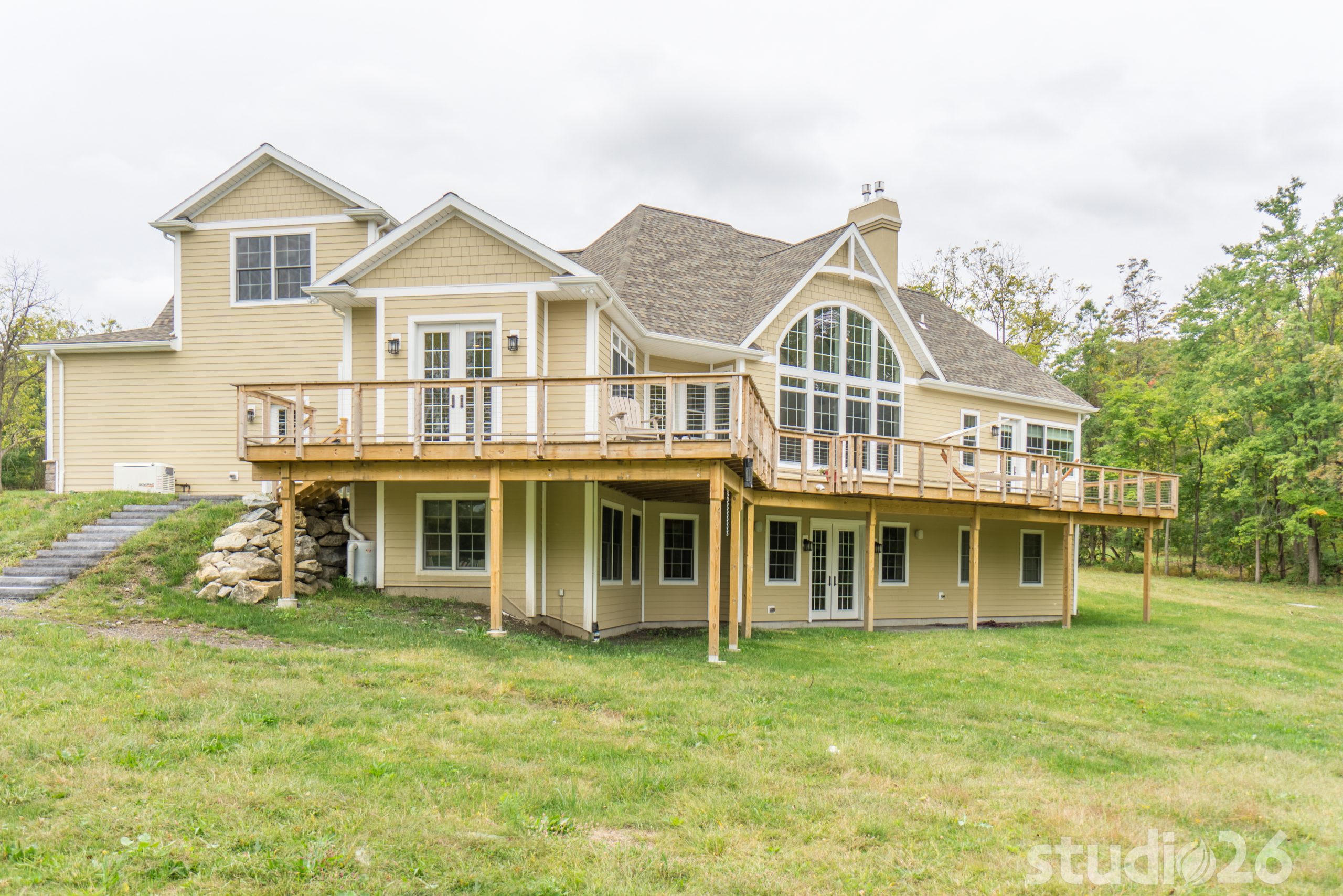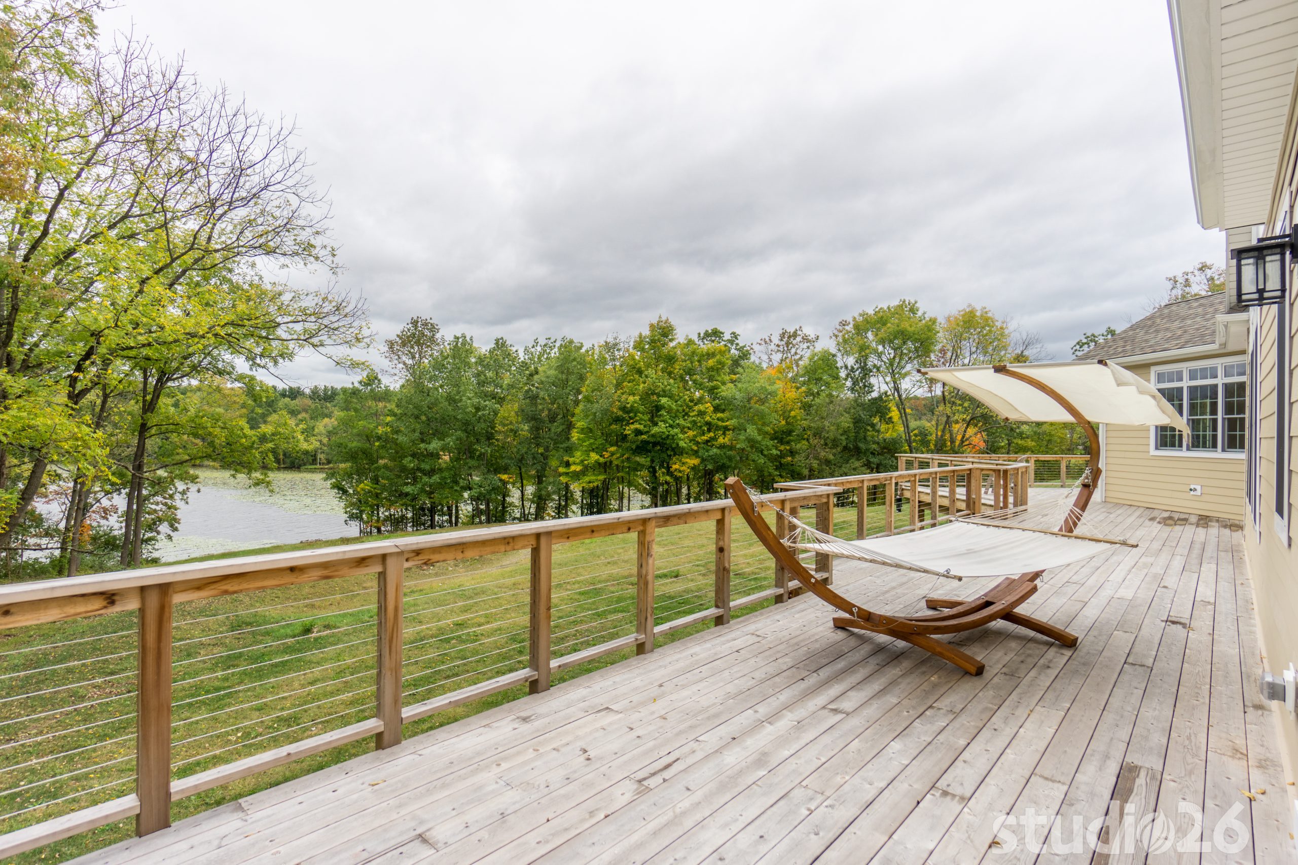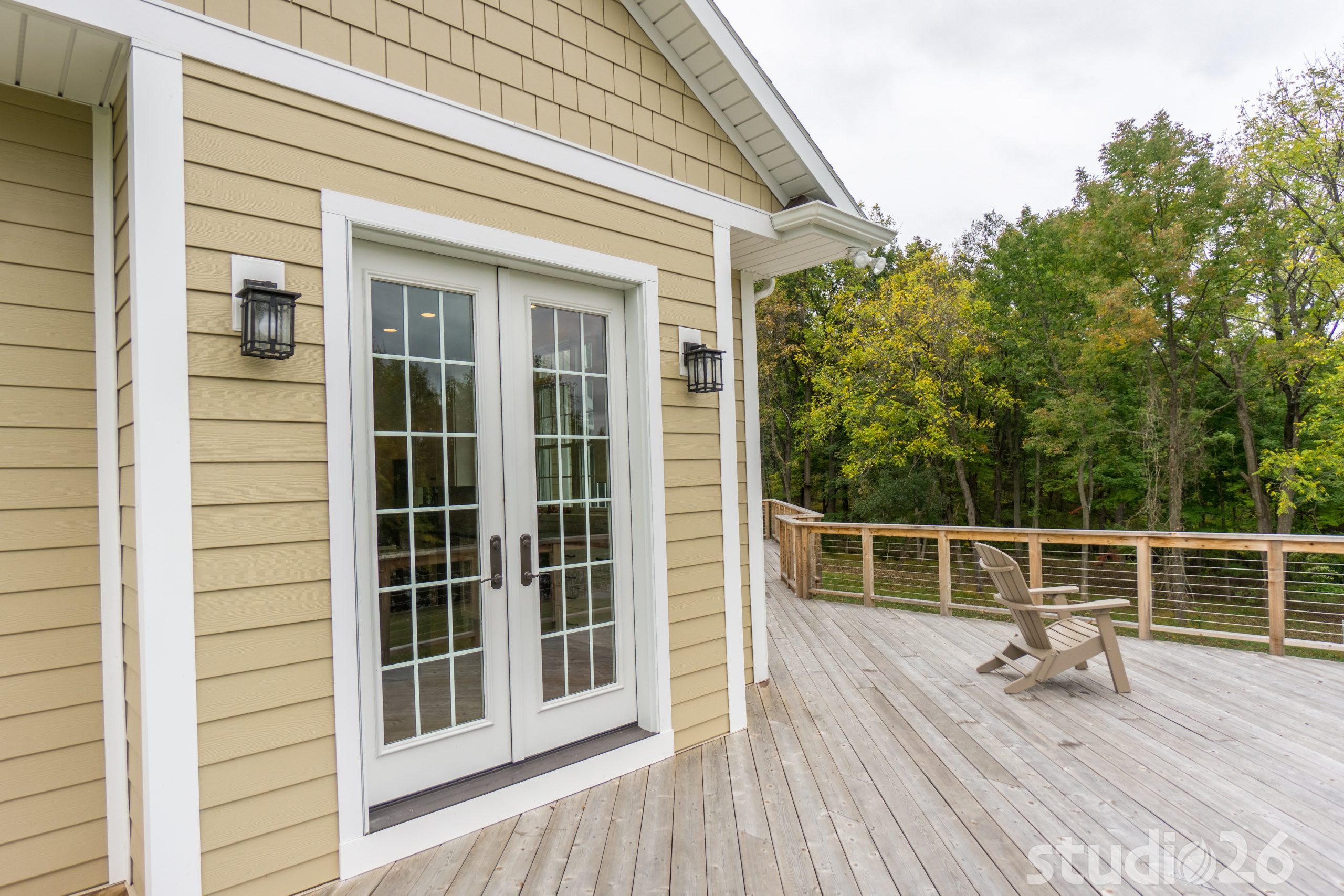 Stone Veneer, Fiber Cement Siding, Cedar Decking with Cable Rail