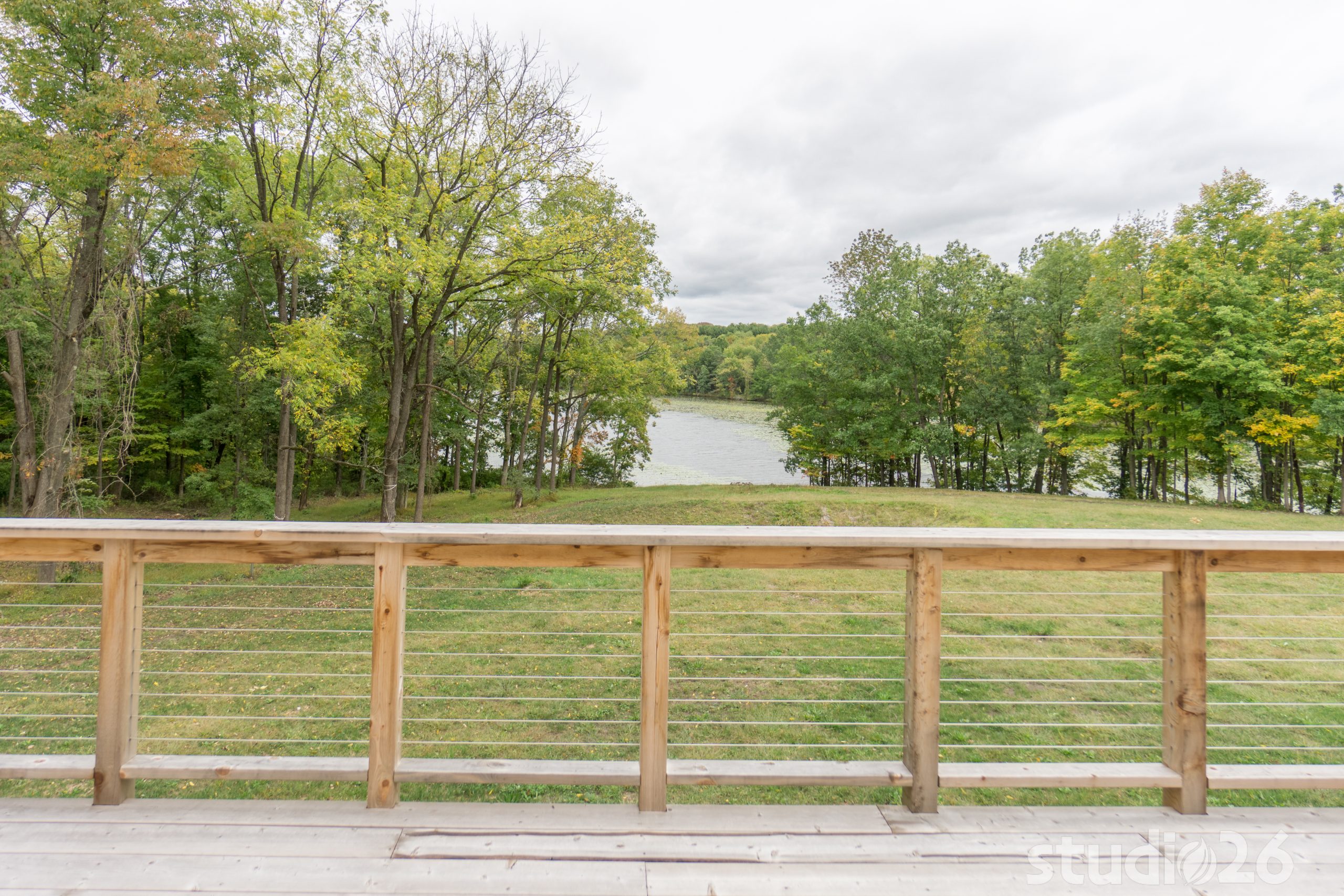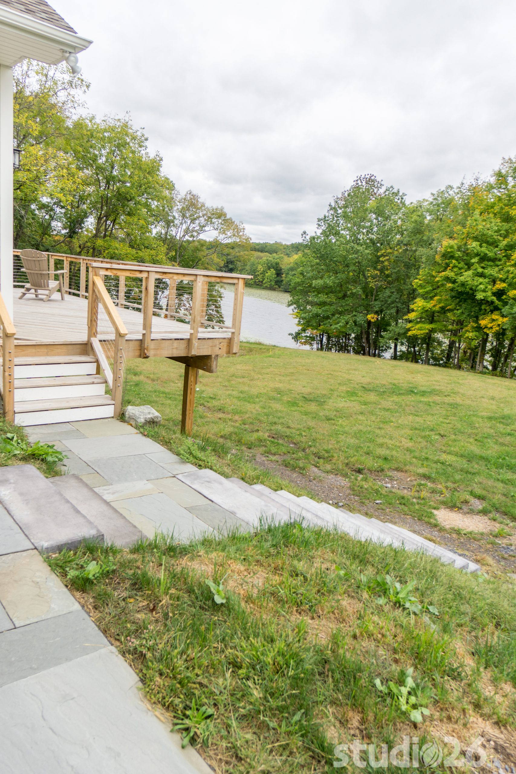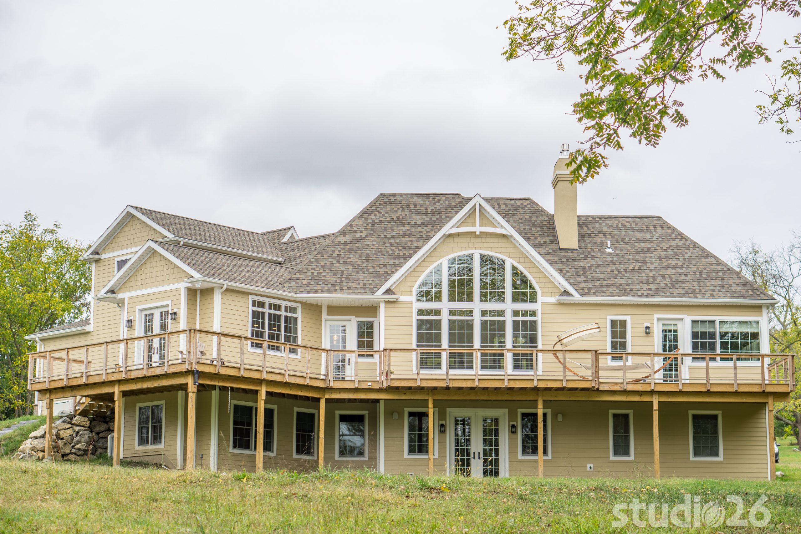 Stone Veneer, Fiber Cement Siding, Cedar Decking with Cable Rail