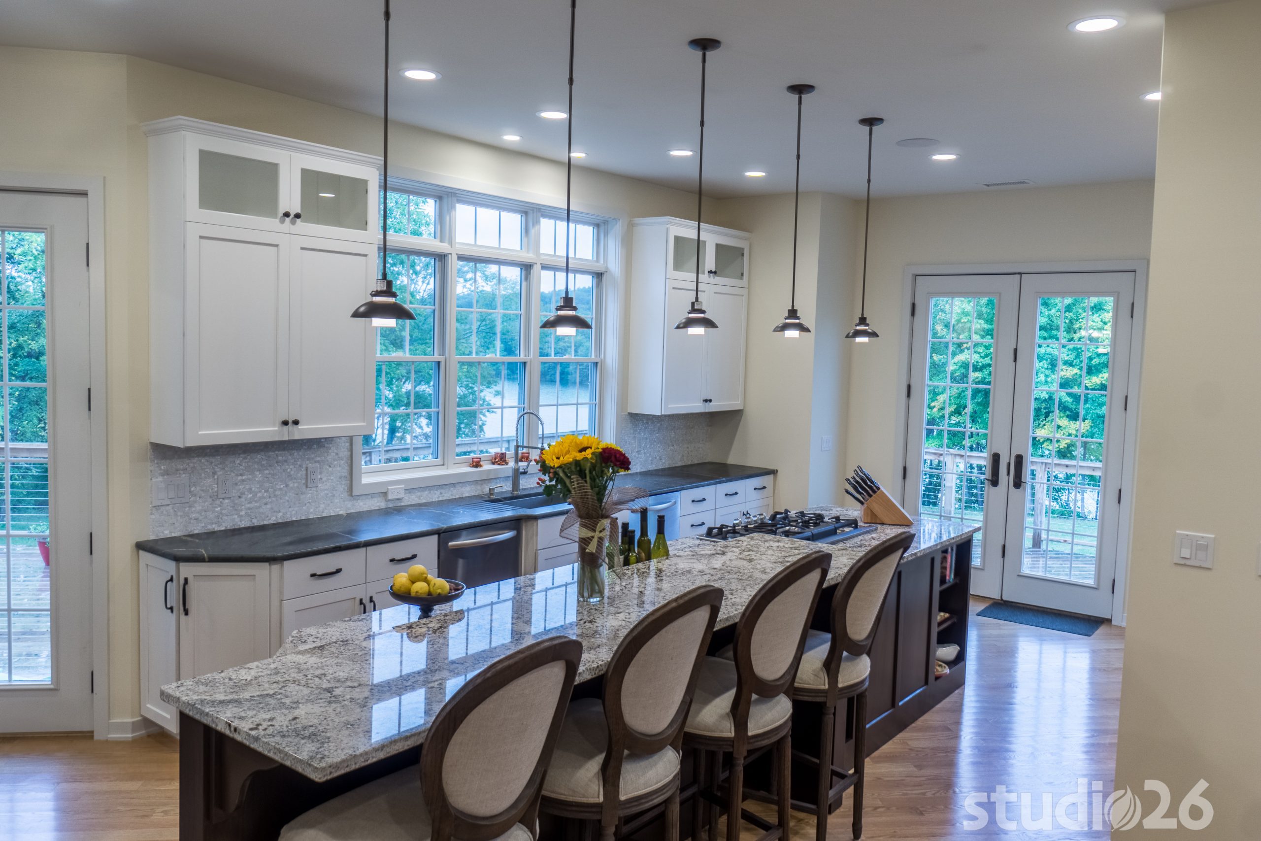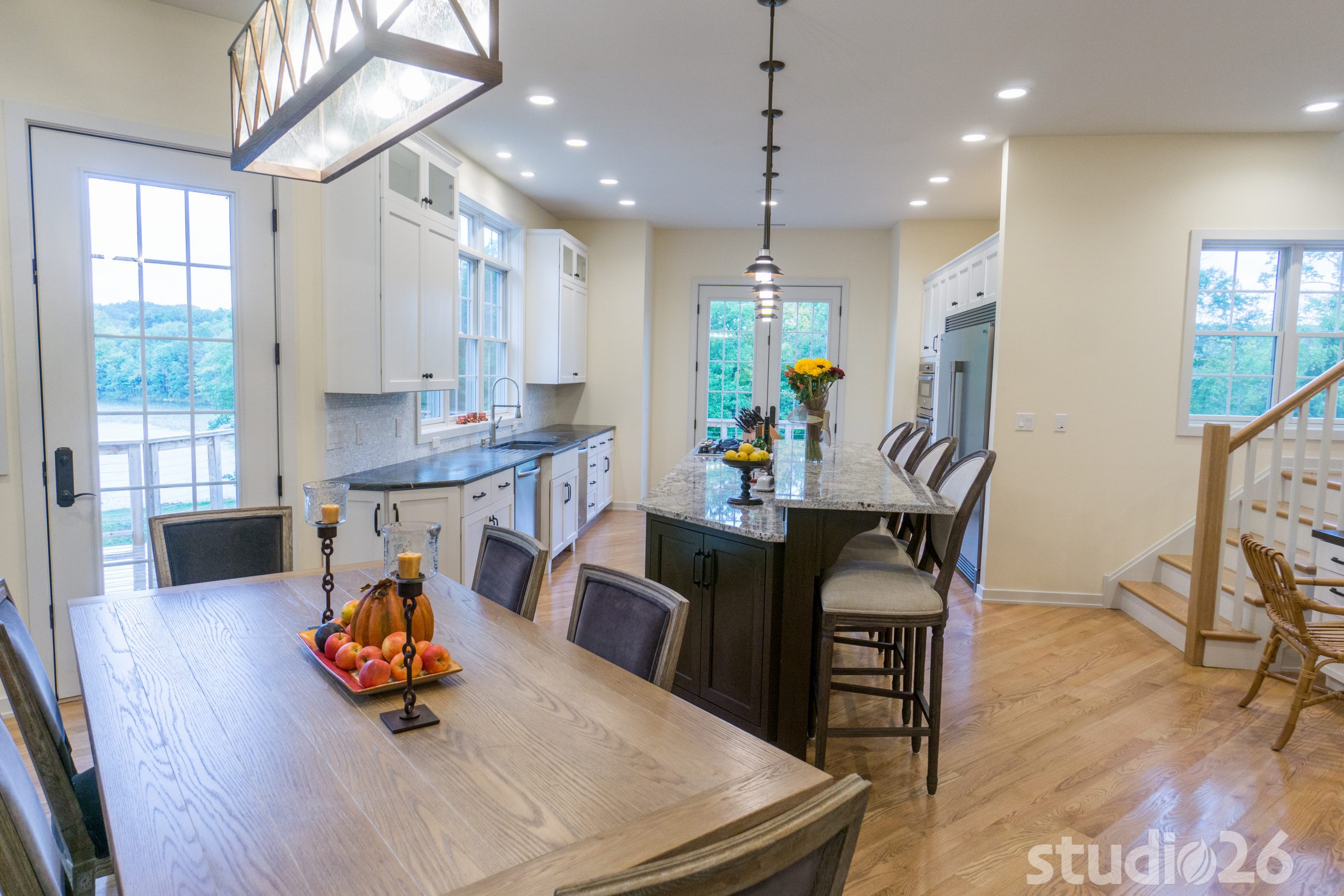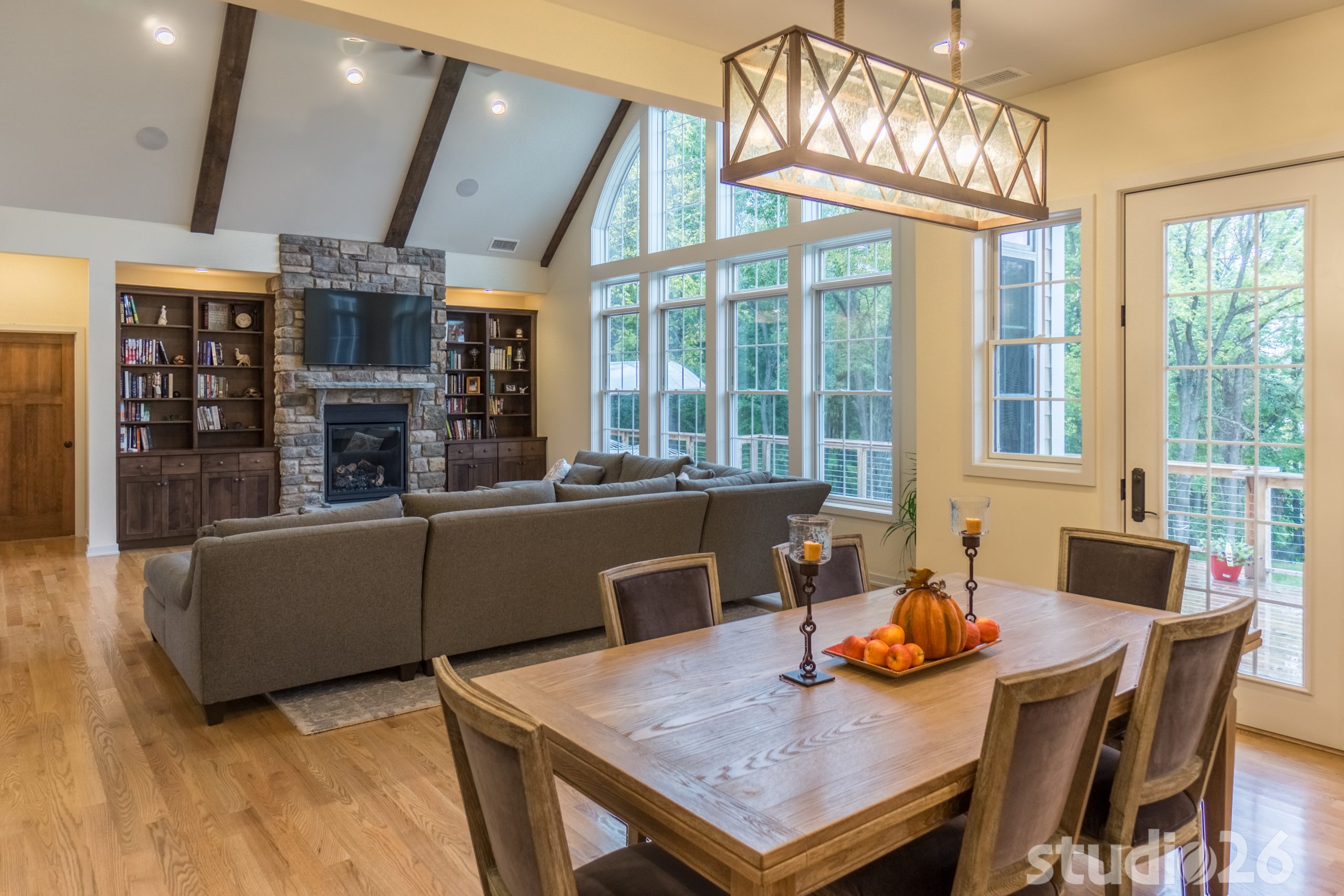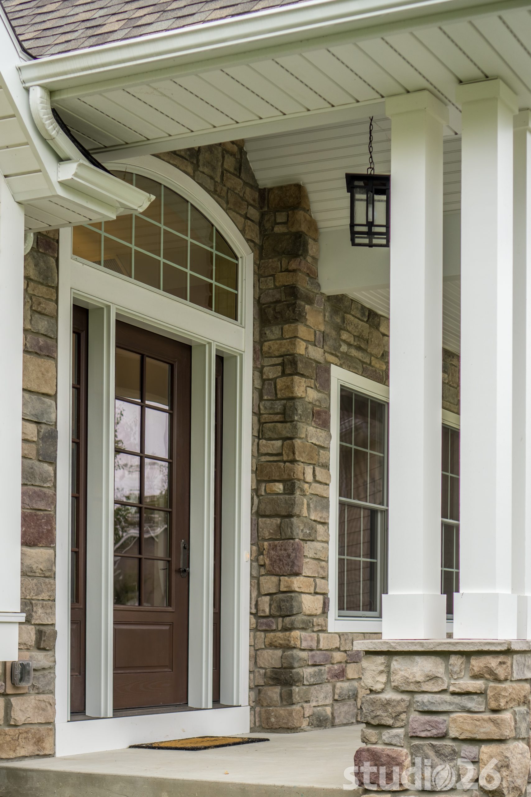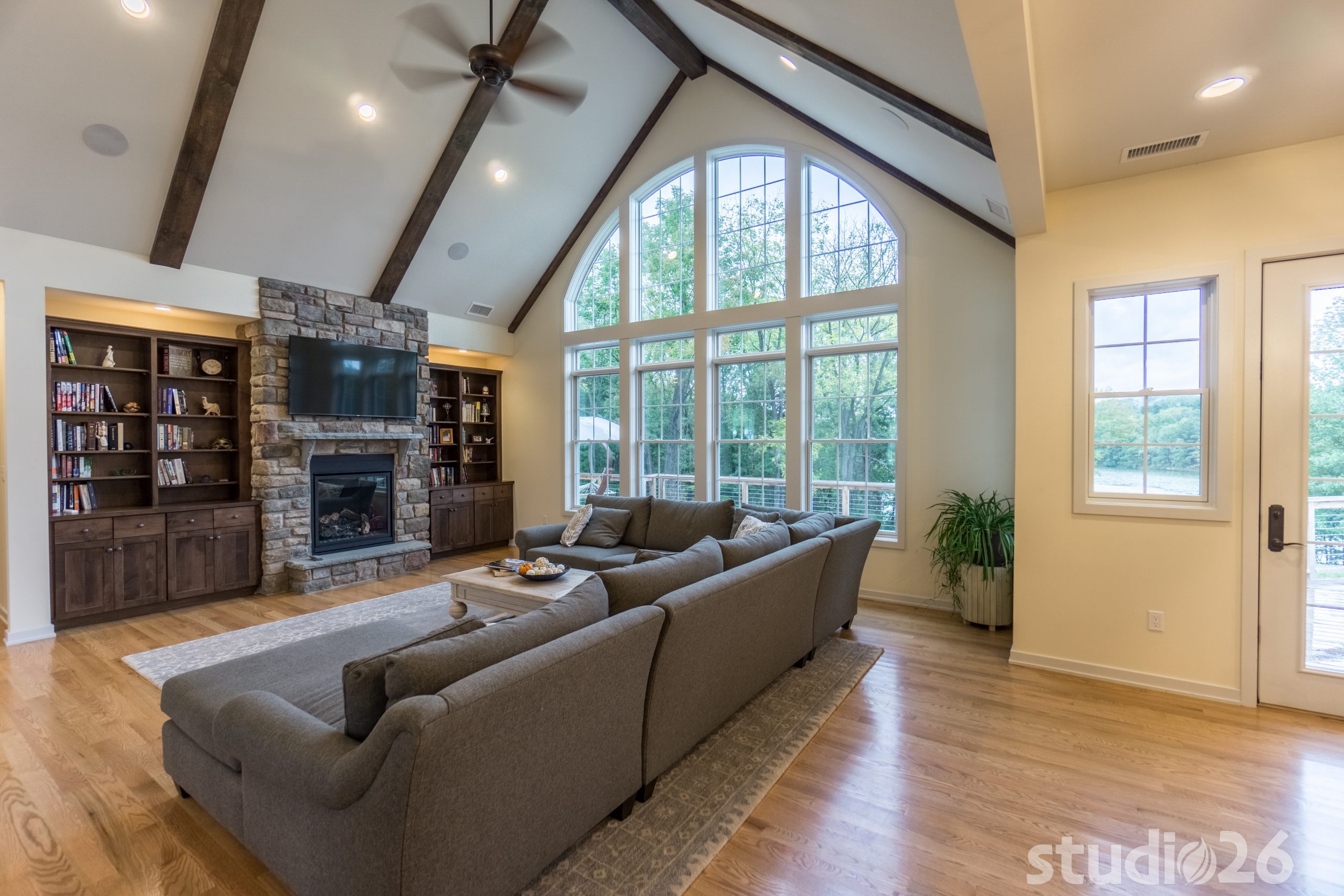 Architecturally, it was imperative for our design to address the site’s greatest amenity – the lake. Utilizing the slowly rolling hill down toward the shoreline, the home was sited perfectly to allow for a fully finished walk-out basement while optimizing all the picturesque views from almost any room in the home. Programmatically, the home was laid out to meet the needs of the owners by affording them the ability to essentially live on one floor of the home for most of the year. On the main level (ceiling height – 10’), a fairly open plan allows the cathedral Great Room with signature arched windows to flow seamlessly into the adjacent and spacious custom Kitchen perfect for their large family. Furthermore, the Master Suite offers the owners a treasured oasis for genuine rest and relaxation. In addition to the large walk-in closet, and spa-like Master Bath with distinctive details and custom tile steam shower, the Master Bedroom is situated on the rear corner of the home purposefully to help the owners not only experience the obvious enjoyment of the lake, but also the sensation of living among the trees while listening to the pleasant crackling of the rolling stream in the adjacent woods.