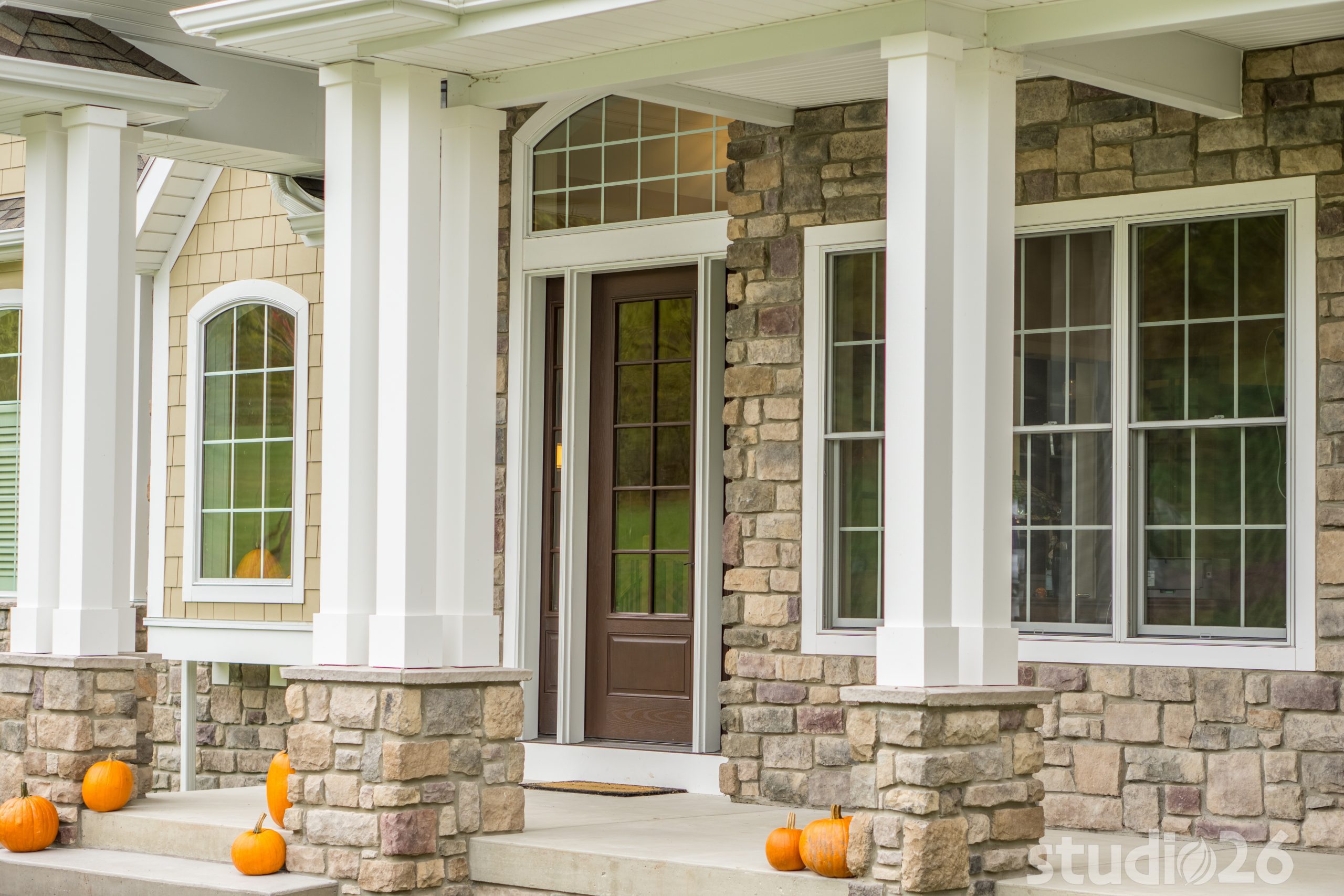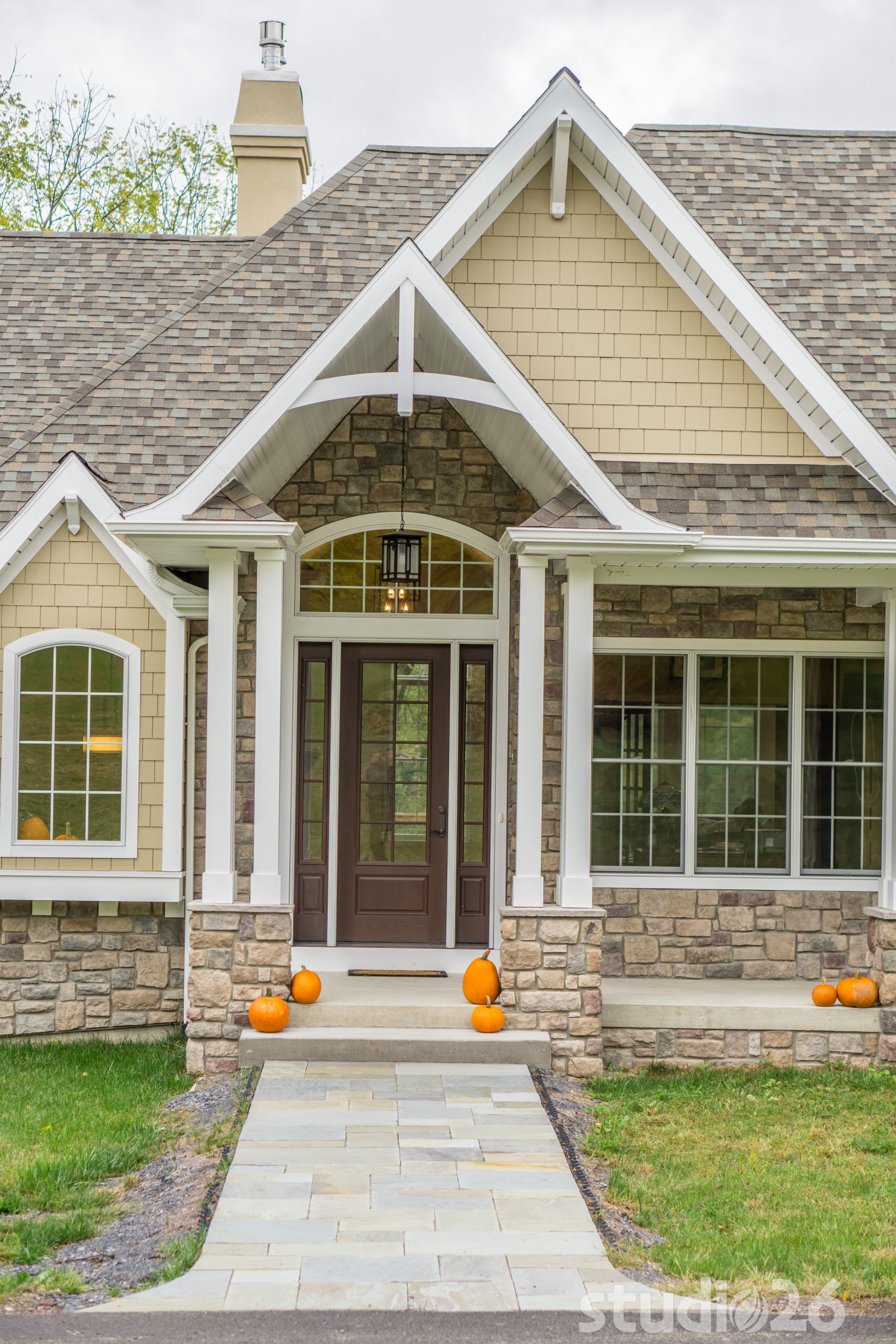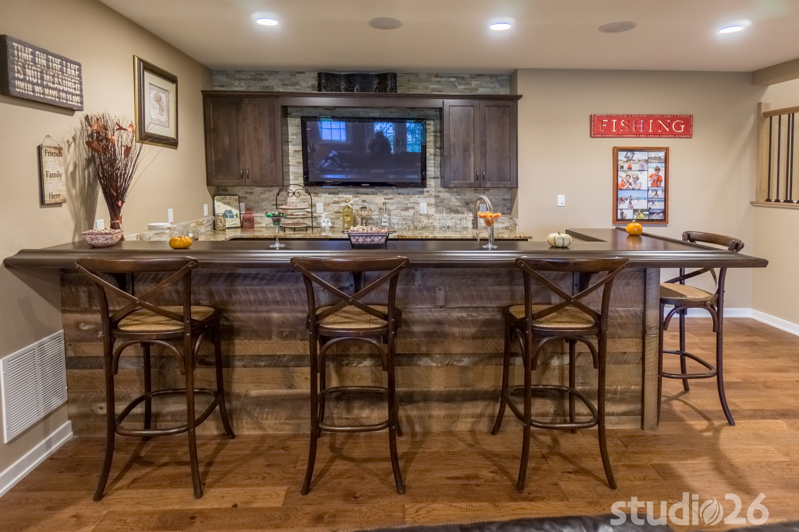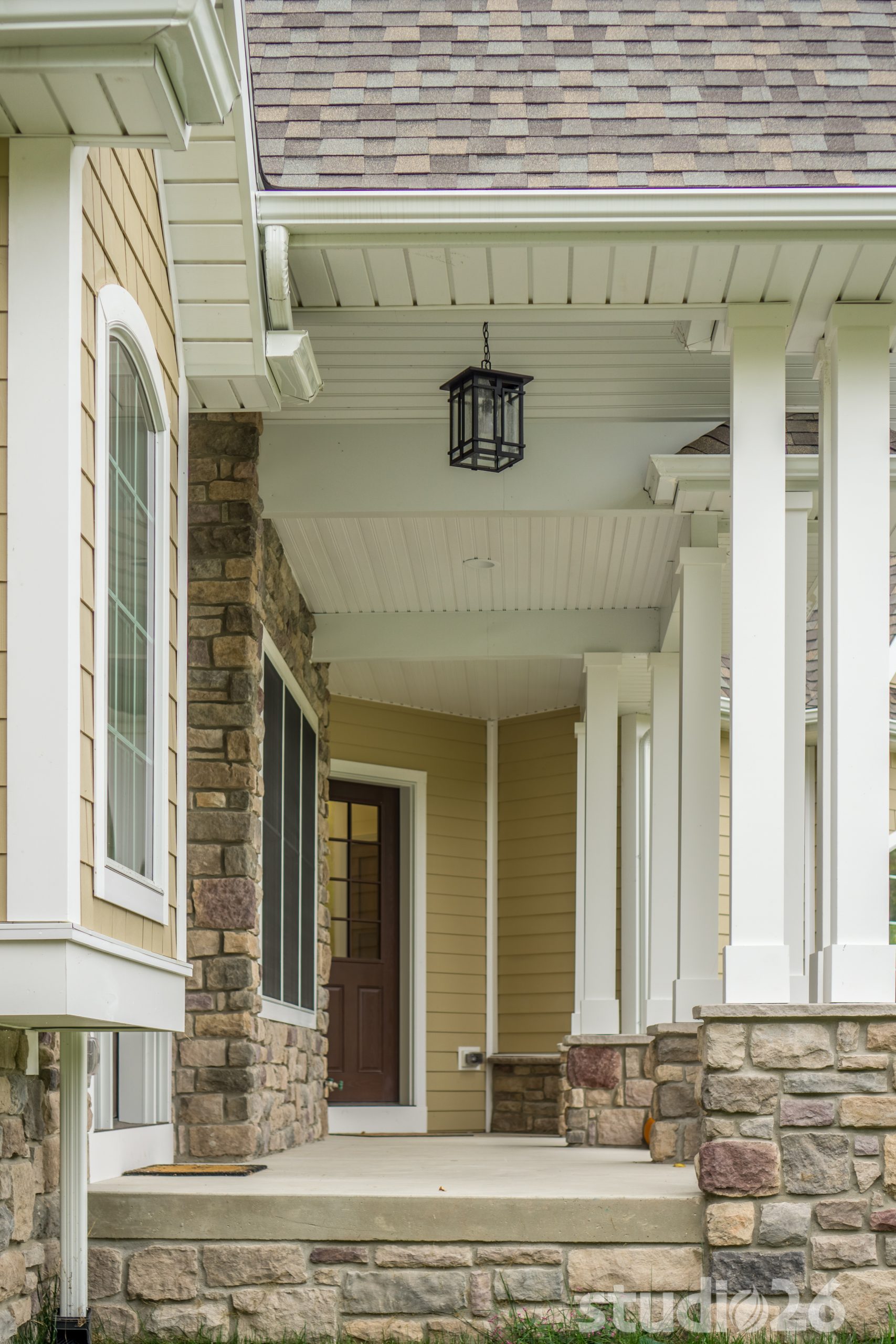 Architecturally, it was imperative for our design to address the site’s greatest amenity – the lake. Utilizing the slowly rolling hill down toward the shoreline, the home was sited perfectly to allow for a fully finished walk-out basement while optimizing all the picturesque views from almost any room in the home. Programmatically, the home was laid out to meet the needs of the owners by affording them the ability to essentially live on one floor of the home for most of the year. On the main level (ceiling height – 10’), a fairly open plan allows the cathedral Great Room with signature arched windows to flow seamlessly into the adjacent and spacious custom Kitchen perfect for their large family. Furthermore, the Master Suite offers the owners a treasured oasis for genuine rest and relaxation. In addition to the large walk-in closet, and spa-like Master Bath with distinctive details and custom tile steam shower, the Master Bedroom is situated on the rear corner of the home purposefully to help the owners not only experience the obvious enjoyment of the lake, but also the sensation of living among the trees while listening to the pleasant crackling of the rolling stream in the adjacent woods.