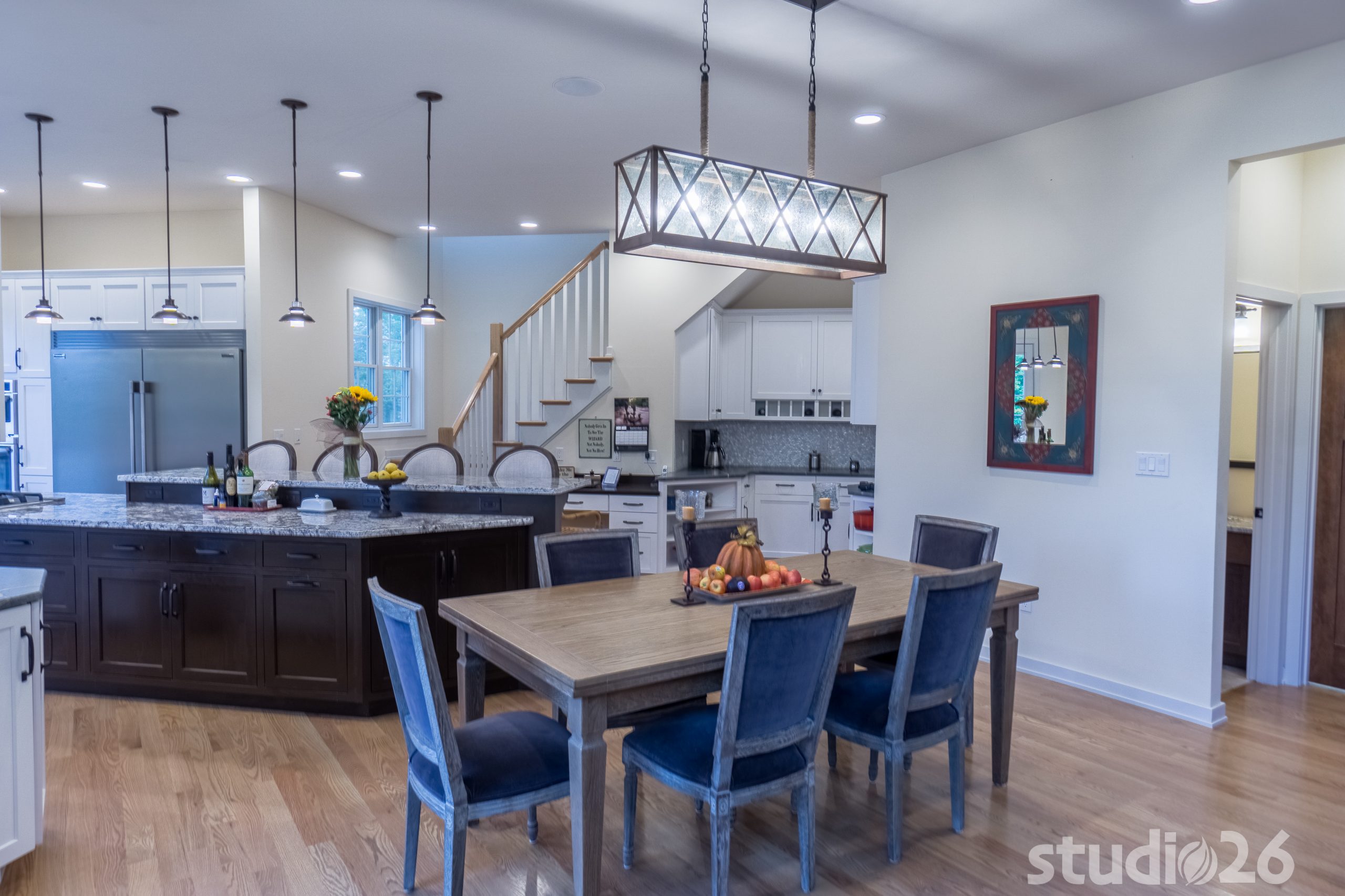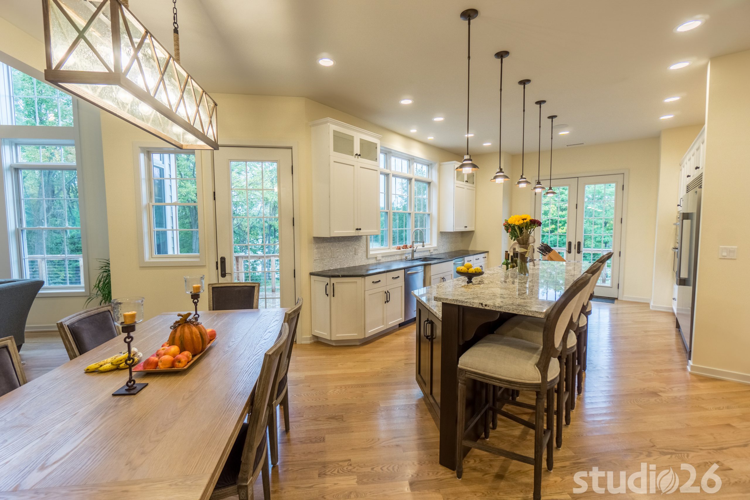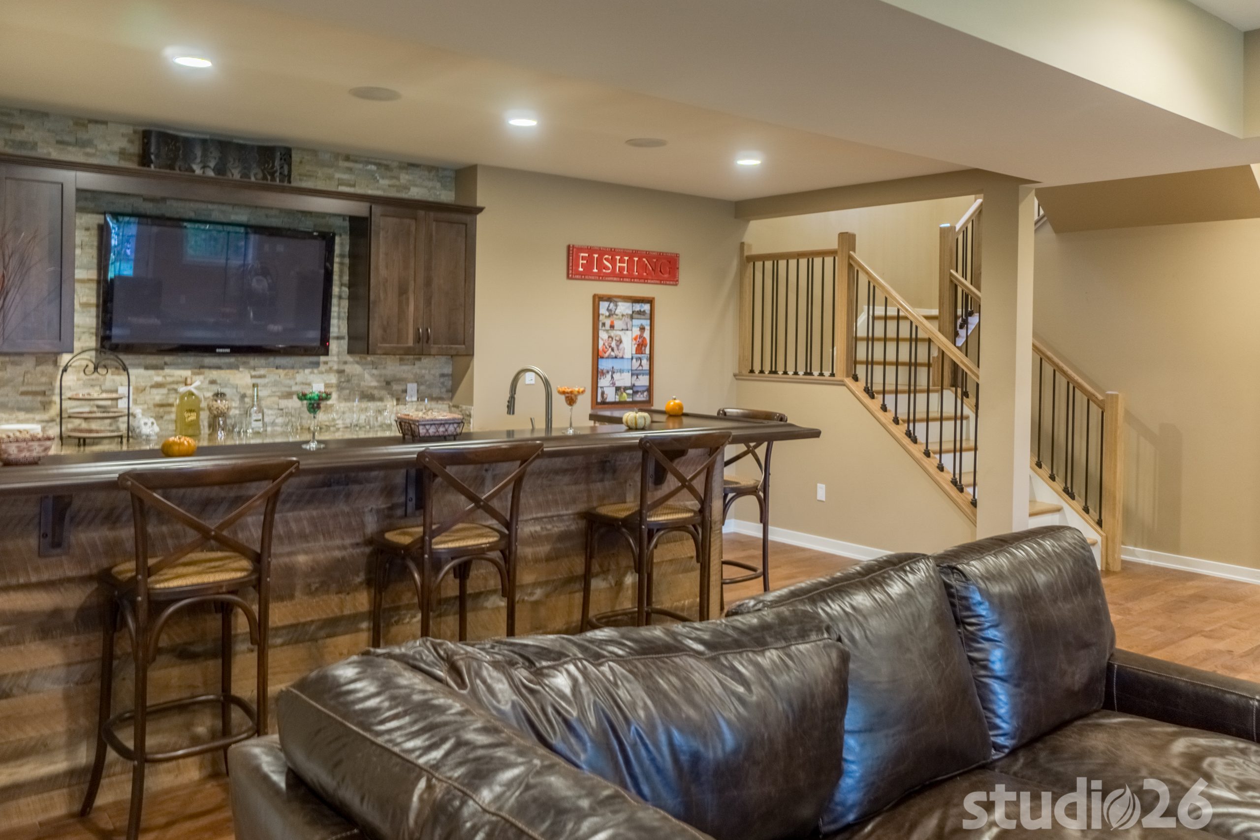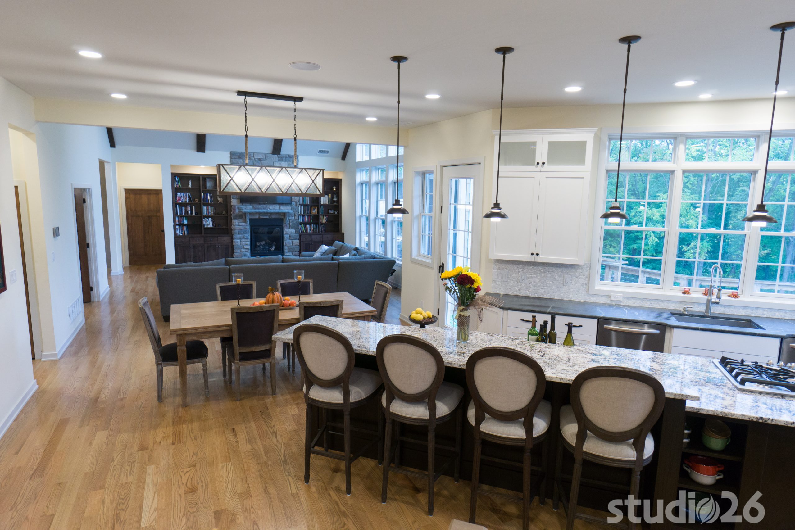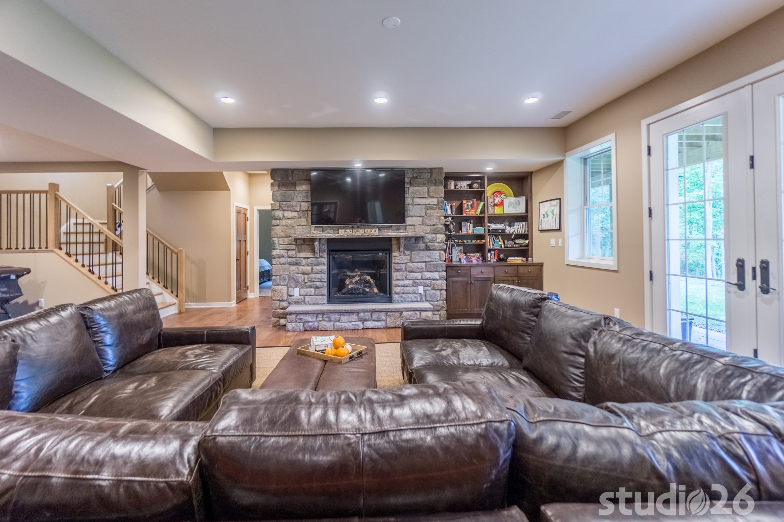 Architecturally, it was imperative for our design to address the site’s greatest amenity – the lake. Utilizing the slowly rolling hill down toward the shoreline, the home was sited perfectly to allow for a fully finished walk-out basement while optimizing all the picturesque views from almost any room in the home. Programmatically, the home was laid out to meet the needs of the owners by affording them the ability to essentially live on one floor of the home for most of the year. On the main level (ceiling height – 10’), a fairly open plan allows the cathedral Great Room with signature arched windows to flow seamlessly into the adjacent and spacious custom Kitchen perfect for their large family. Furthermore, the Master Suite offers the owners a treasured oasis for genuine rest and relaxation. In addition to the large walk-in closet, and spa-like Master Bath with distinctive details and custom tile steam shower, the Master Bedroom is situated on the rear corner of the home purposefully to help the owners not only experience the obvious enjoyment of the lake, but also the sensation of living among the trees while listening to the pleasant crackling of the rolling stream in the adjacent woods.
