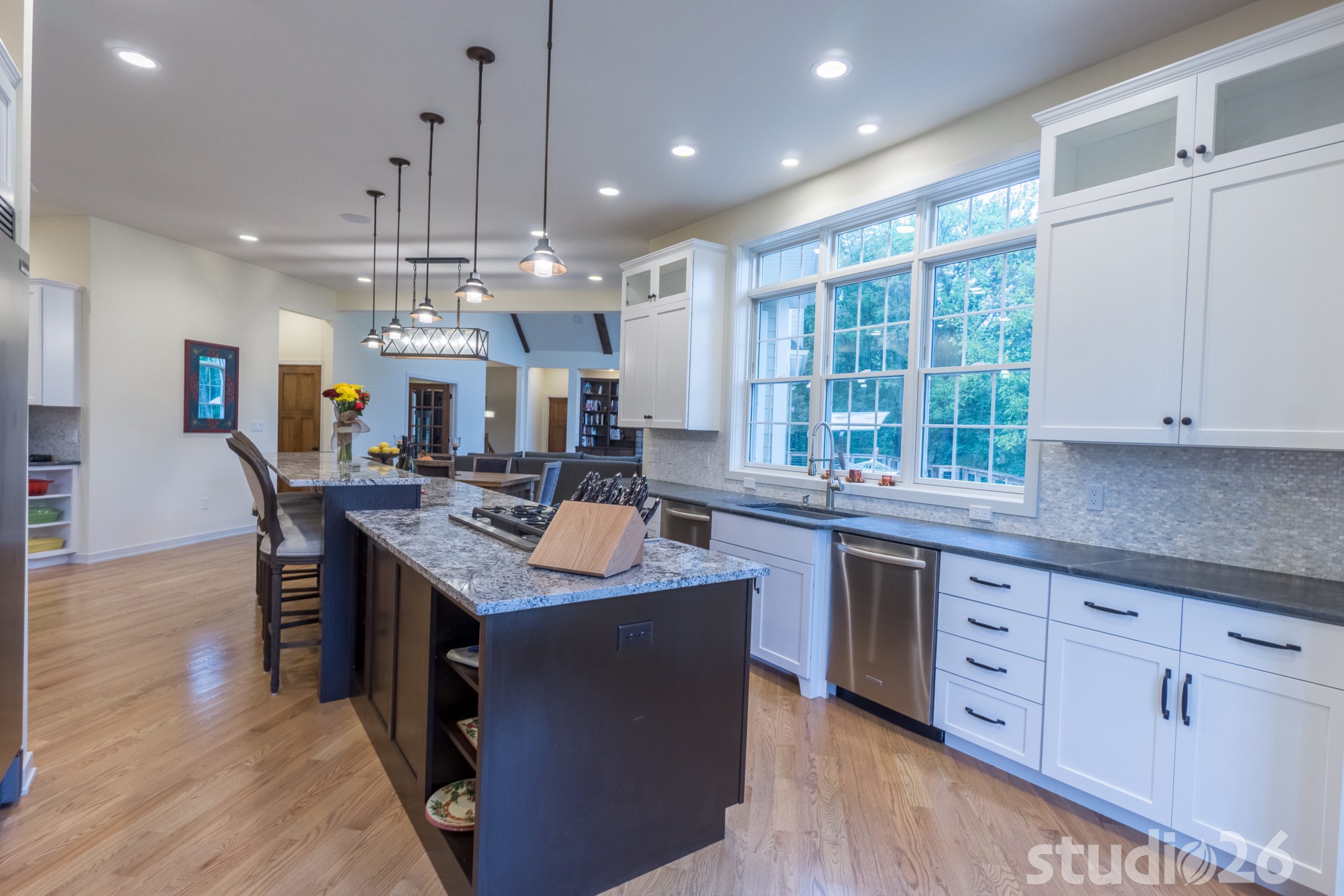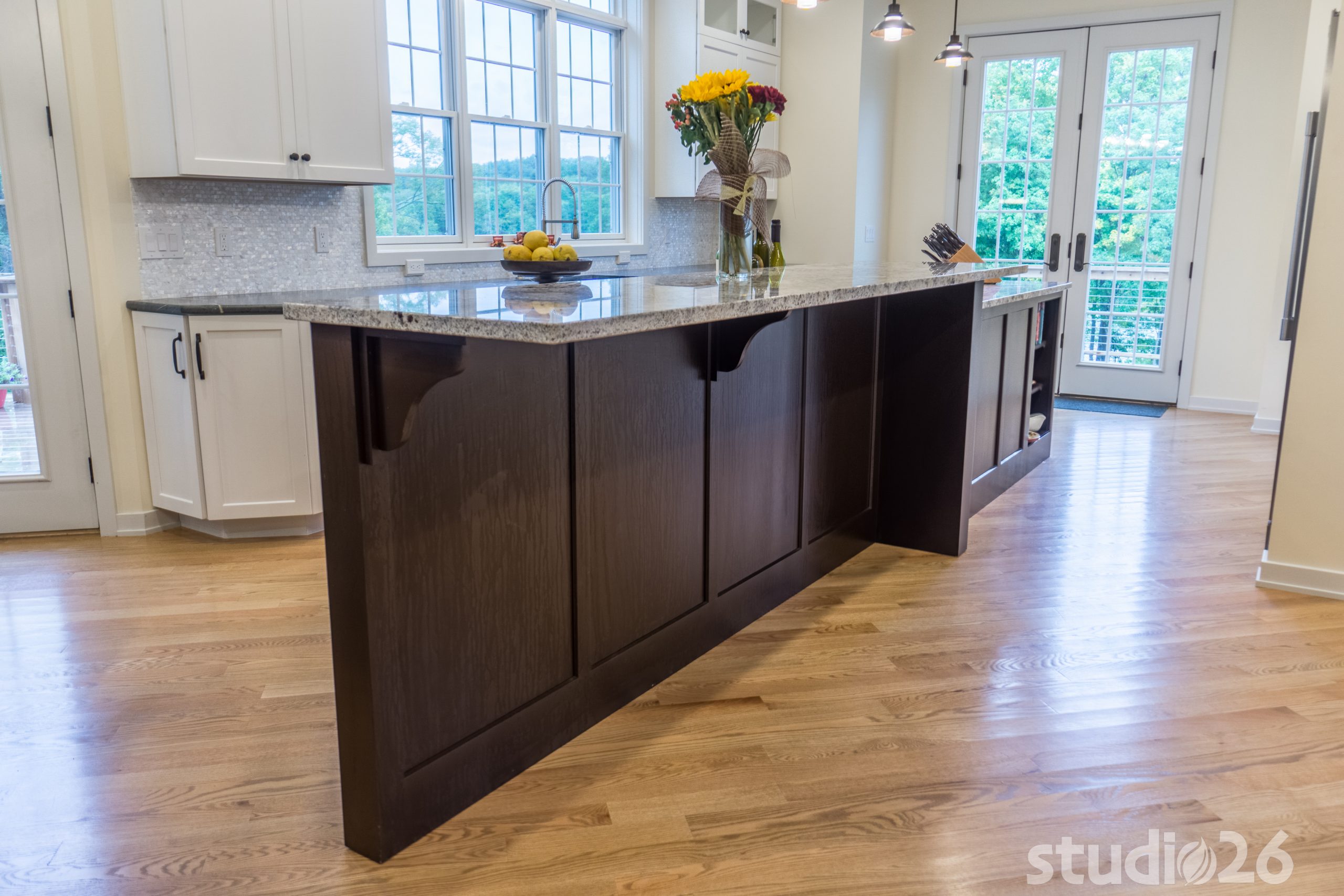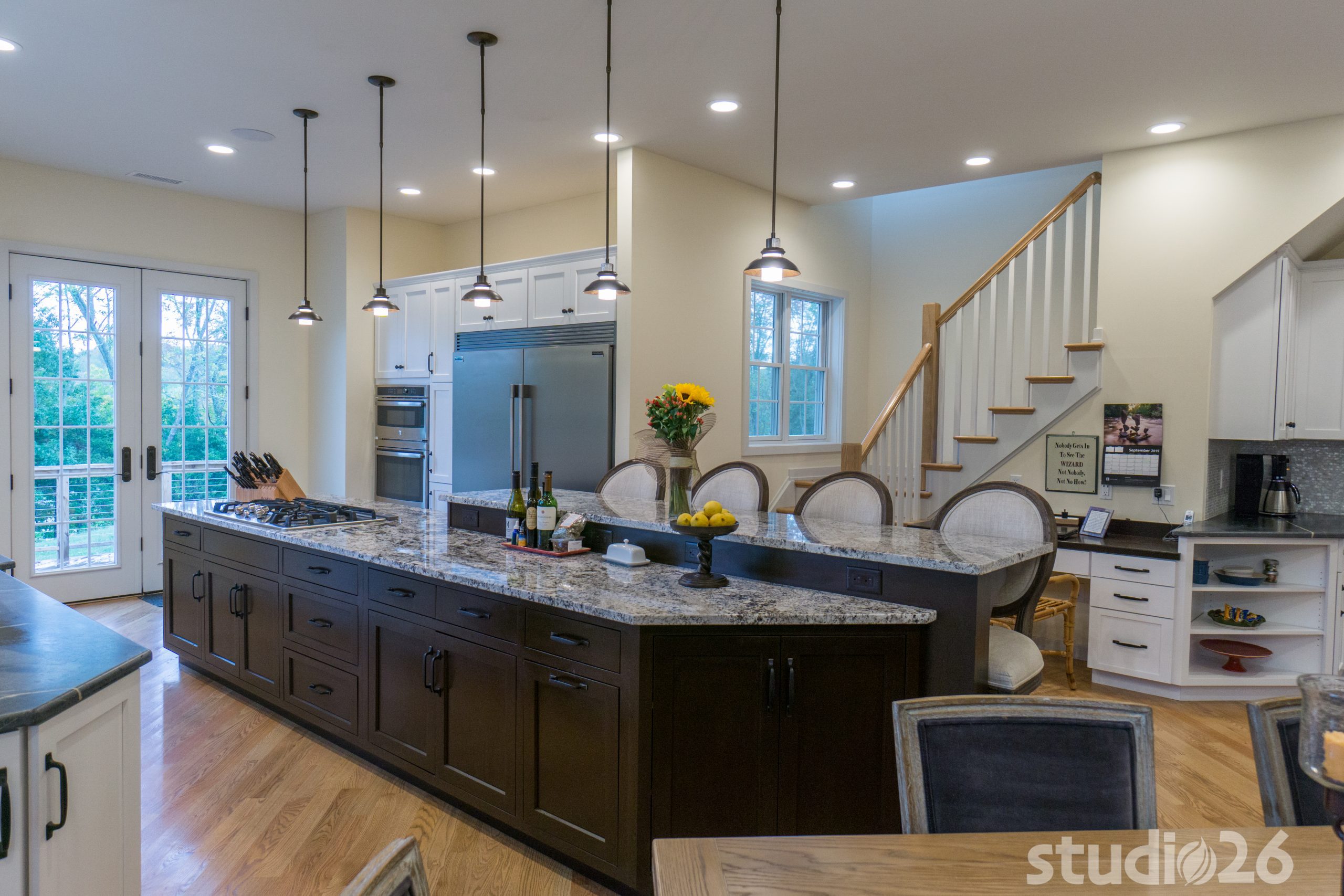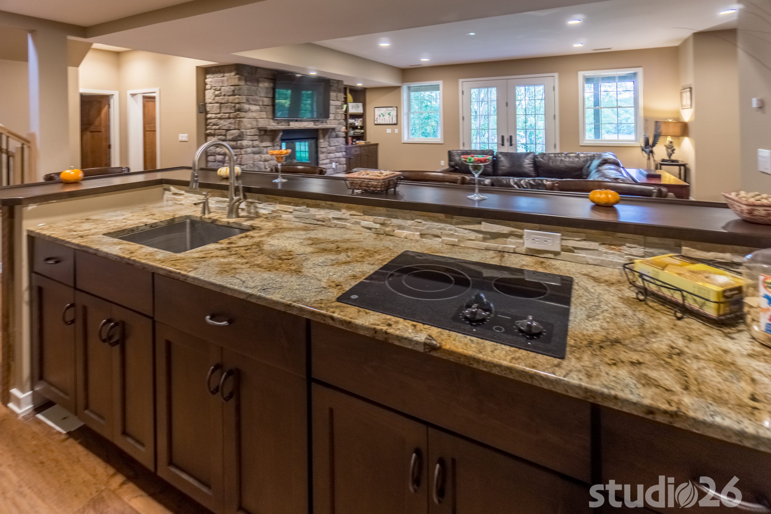 Architecturally, it was imperative for our design to address the site’s greatest amenity – the lake. Utilizing the slowly rolling hill down toward the shoreline, the home was sited perfectly to allow for a fully finished walk-out basement while optimizing all the picturesque views from almost any room in the home. Programmatically, the home was laid out to meet the needs of the owners by affording them the ability to essentially live on one floor of the home for most of the year. On the main level (ceiling height – 10’), a fairly open plan allows the cathedral Great Room with signature arched windows to flow seamlessly into the adjacent and spacious custom Kitchen perfect for their large family. Furthermore, the Master Suite offers the owners a treasured oasis for genuine rest and relaxation. In addition to the large walk-in closet, and spa-like Master Bath with distinctive details and custom tile steam shower, the Master Bedroom is situated on the rear corner of the home purposefully to help the owners not only experience the obvious enjoyment of the lake, but also the sensation of living among the trees while listening to the pleasant crackling of the rolling stream in the adjacent woods.