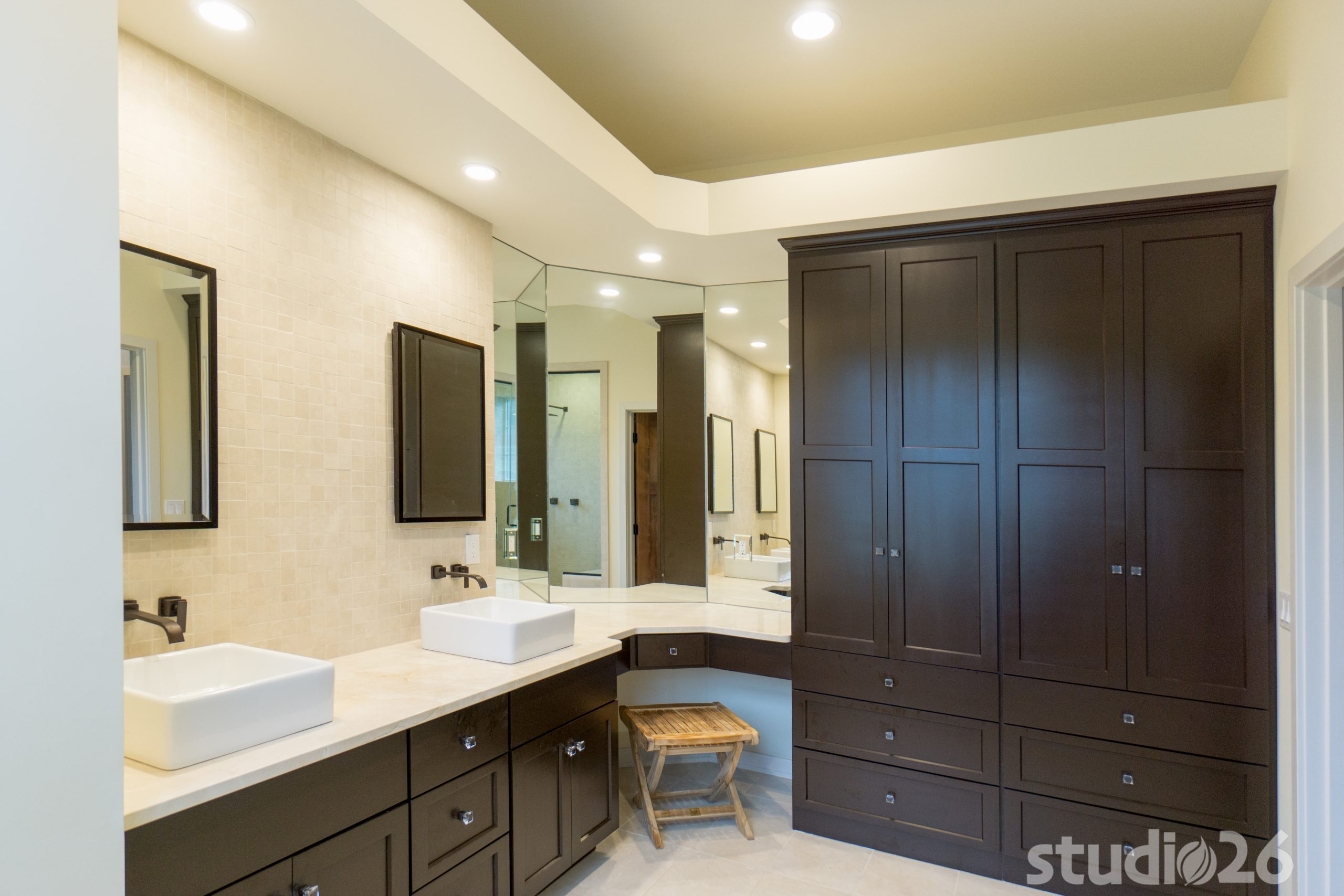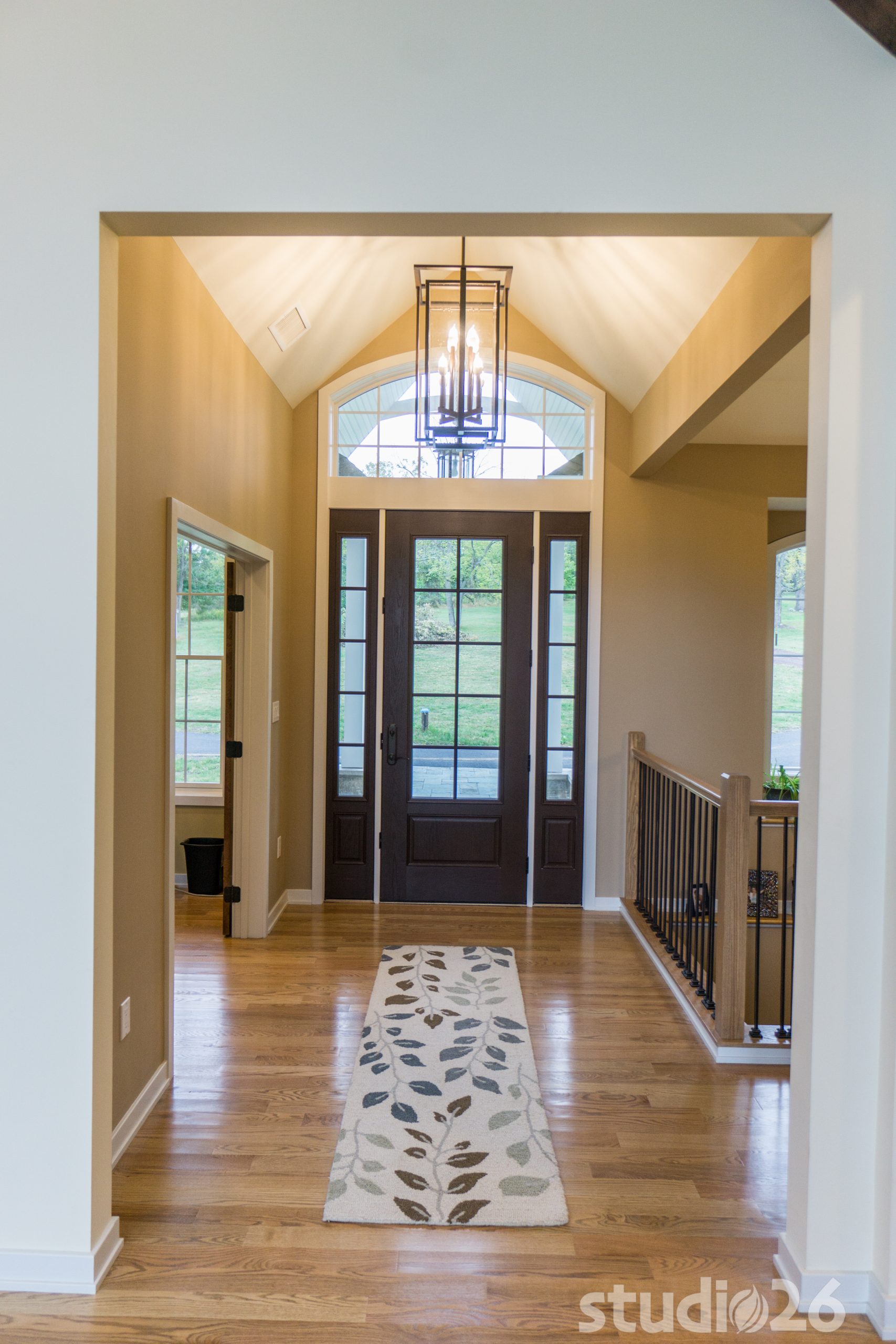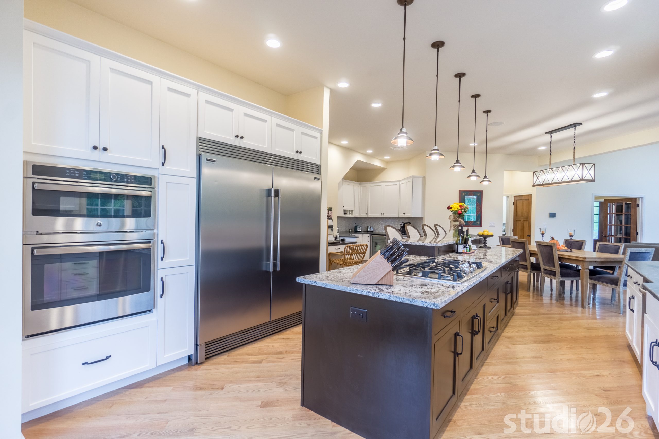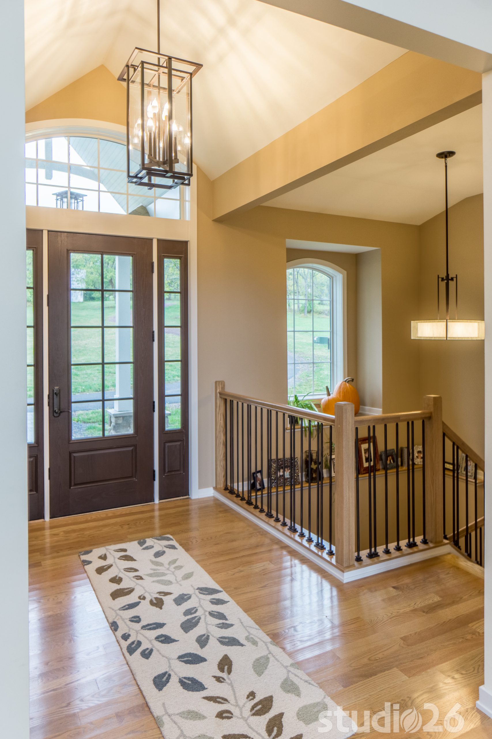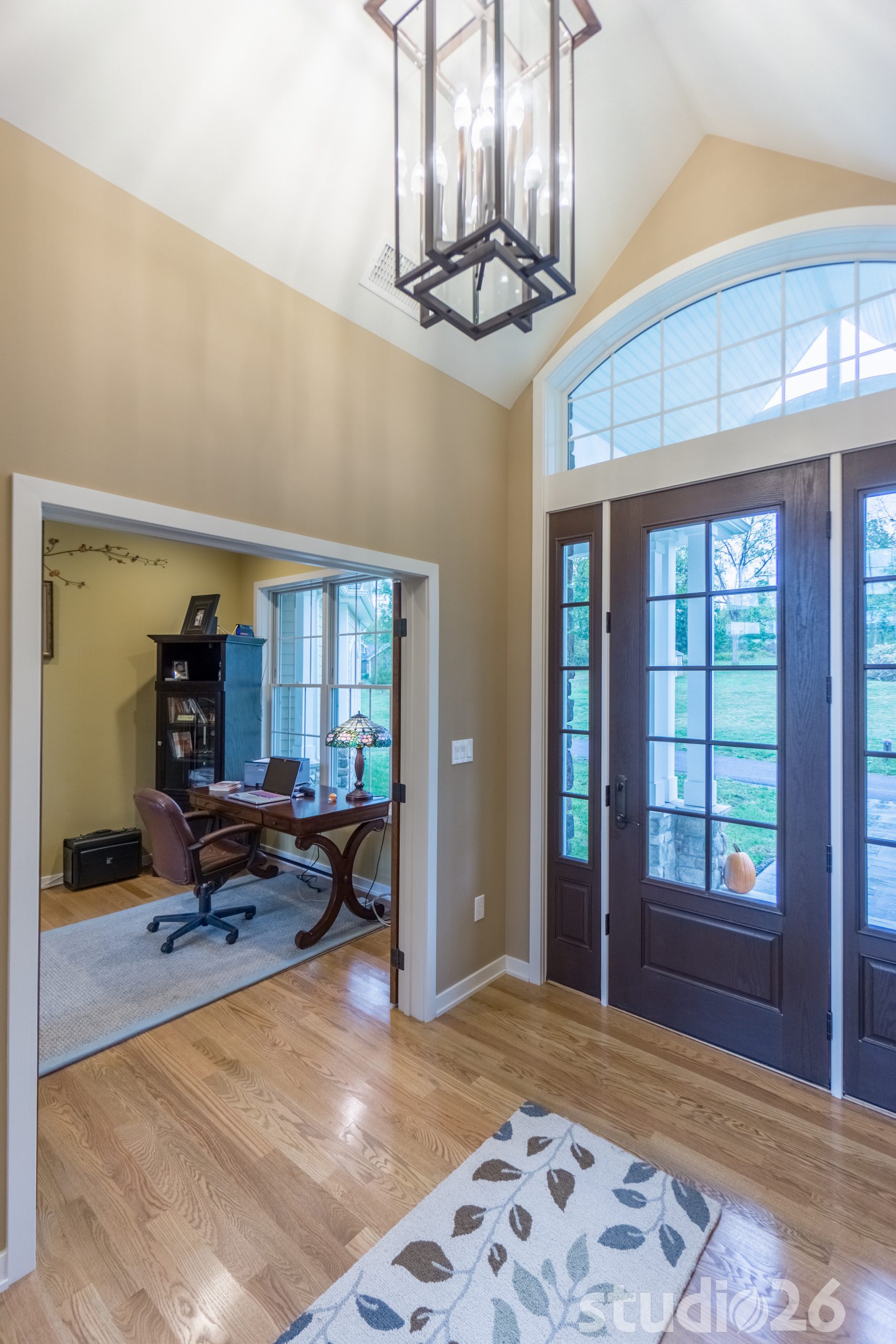 Architecturally, it was imperative for our design to address the site’s greatest amenity – the lake. Utilizing the slowly rolling hill down toward the shoreline, the home was sited perfectly to allow for a fully finished walk-out basement while optimizing all the picturesque views from almost any room in the home. Programmatically, the home was laid out to meet the needs of the owners by affording them the ability to essentially live on one floor of the home for most of the year. On the main level (ceiling height – 10’), a fairly open plan allows the cathedral Great Room with signature arched windows to flow seamlessly into the adjacent and spacious custom Kitchen perfect for their large family. Furthermore, the Master Suite offers the owners a treasured oasis for genuine rest and relaxation. In addition to the large walk-in closet, and spa-like Master Bath with distinctive details and custom tile steam shower, the Master Bedroom is situated on the rear corner of the home purposefully to help the owners not only experience the obvious enjoyment of the lake, but also the sensation of living among the trees while listening to the pleasant crackling of the rolling stream in the adjacent woods.