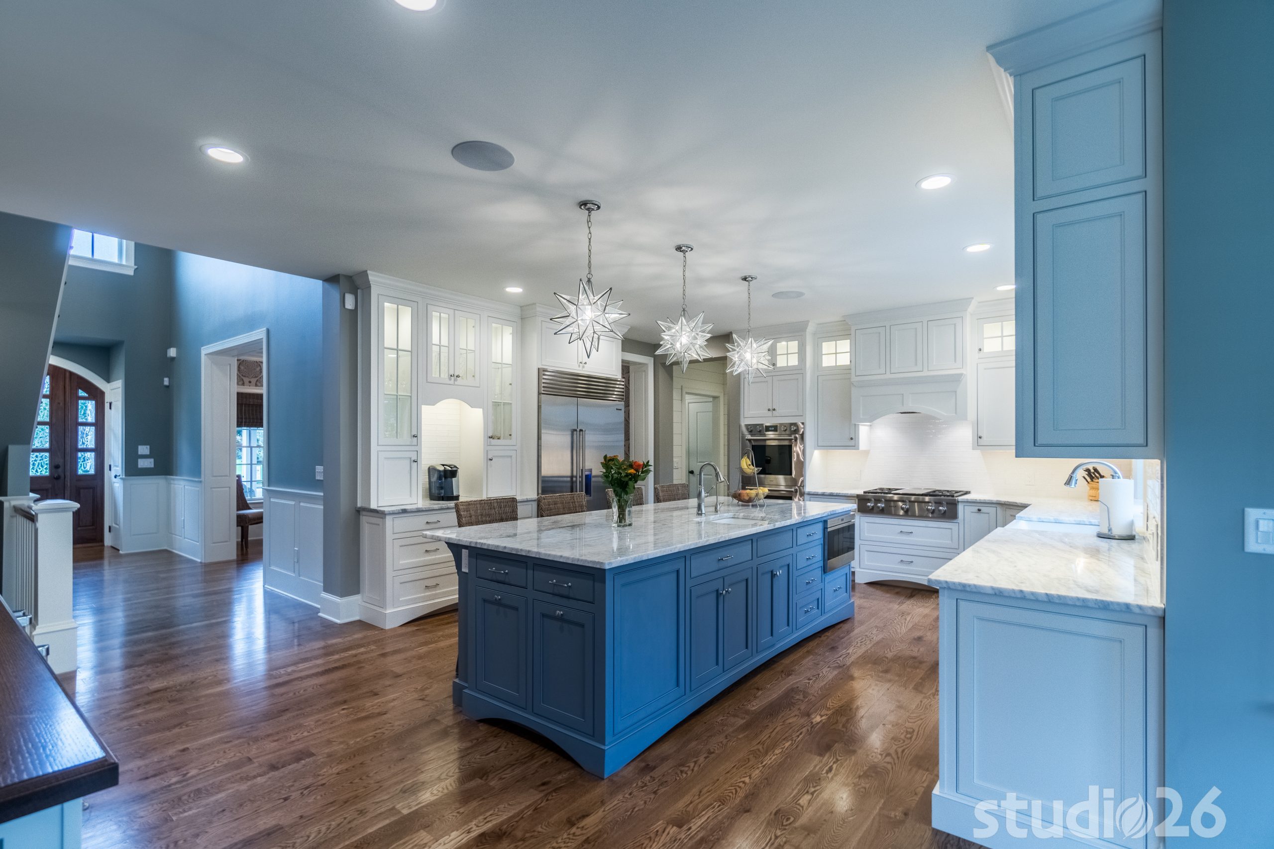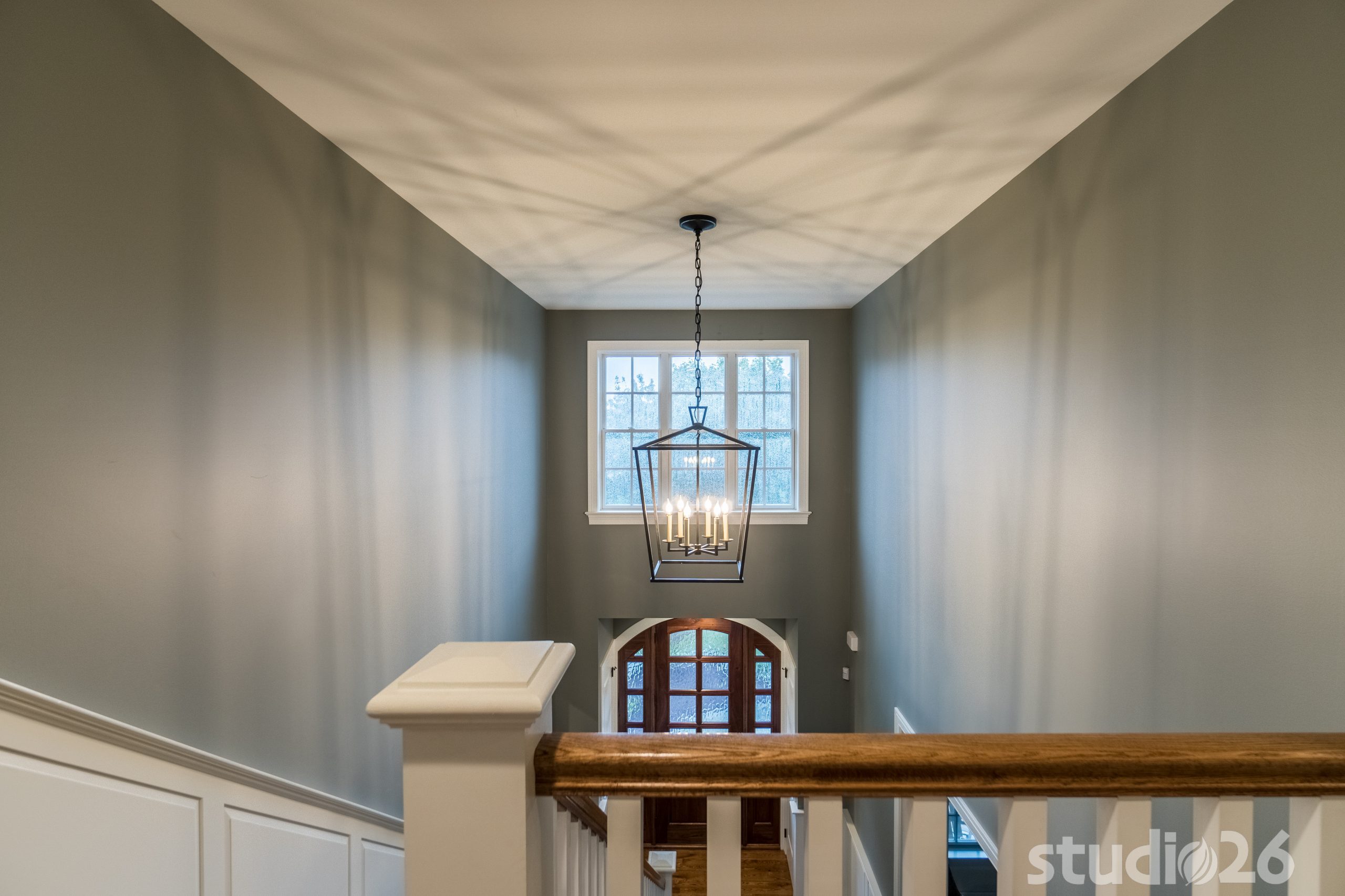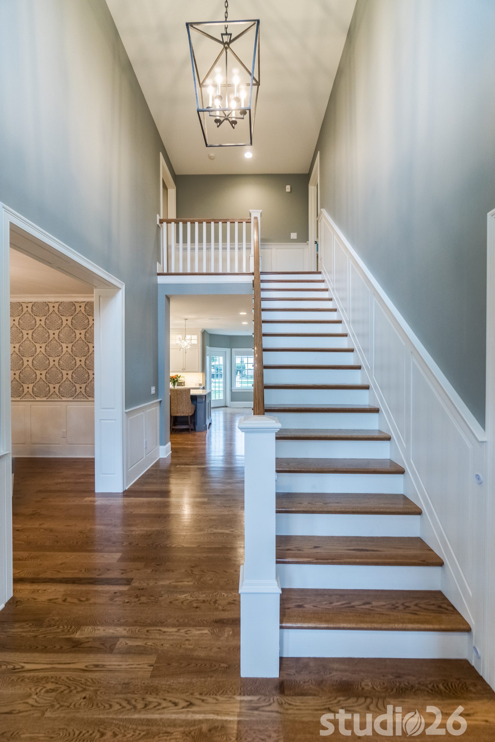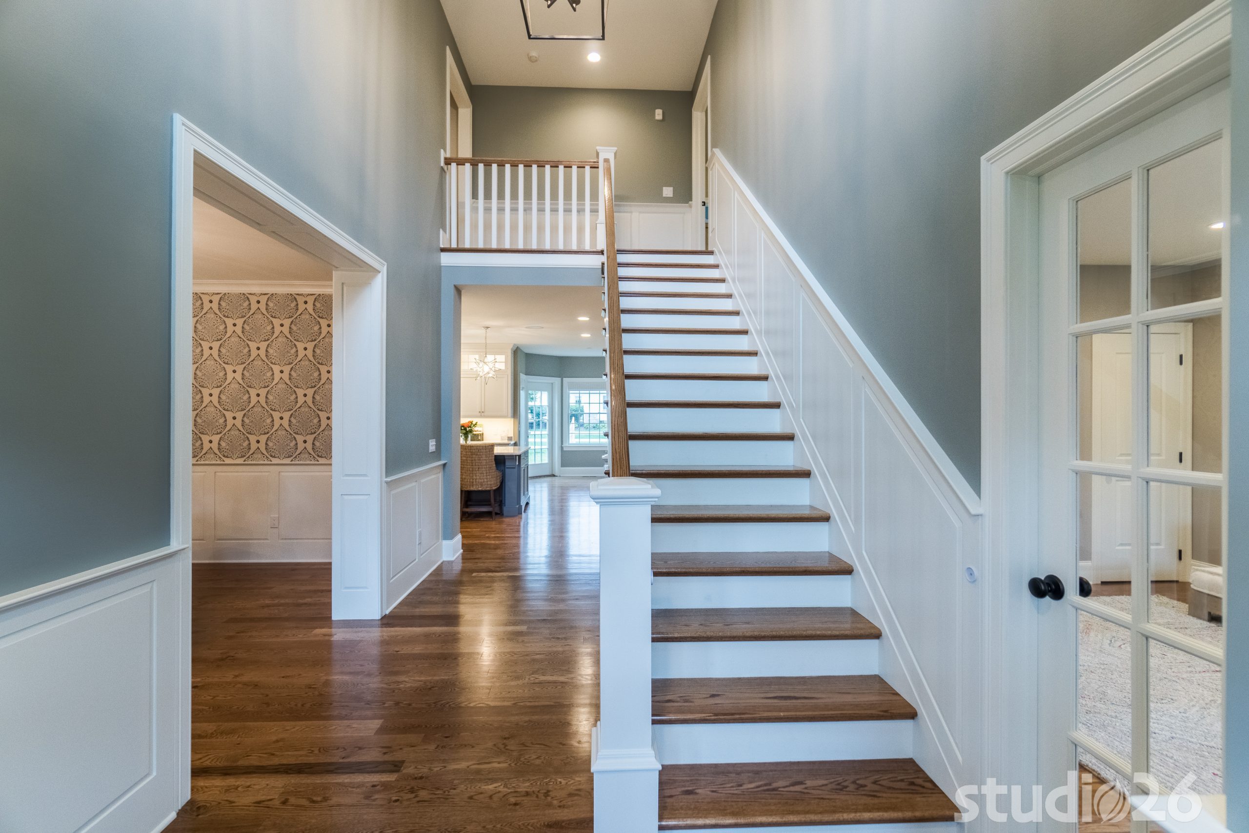 While classic – with its real regionally-quarried stone, white fiber cement clapboard siding, and operable black shutters – on the outside, the home offers a very elegant, yet comfortable ambiance for a growing family of six on this inside. Upon entering the home, the two-story grand foyer welcomes its guests with classical elegance highlighted by impressionable details such as purposefully thicker interior walls to help recall hints of yesteryear, genuine recessed panel wainscoting, understated colonial trim and crown molding details, and site-finished random-width white oak floors throughout.