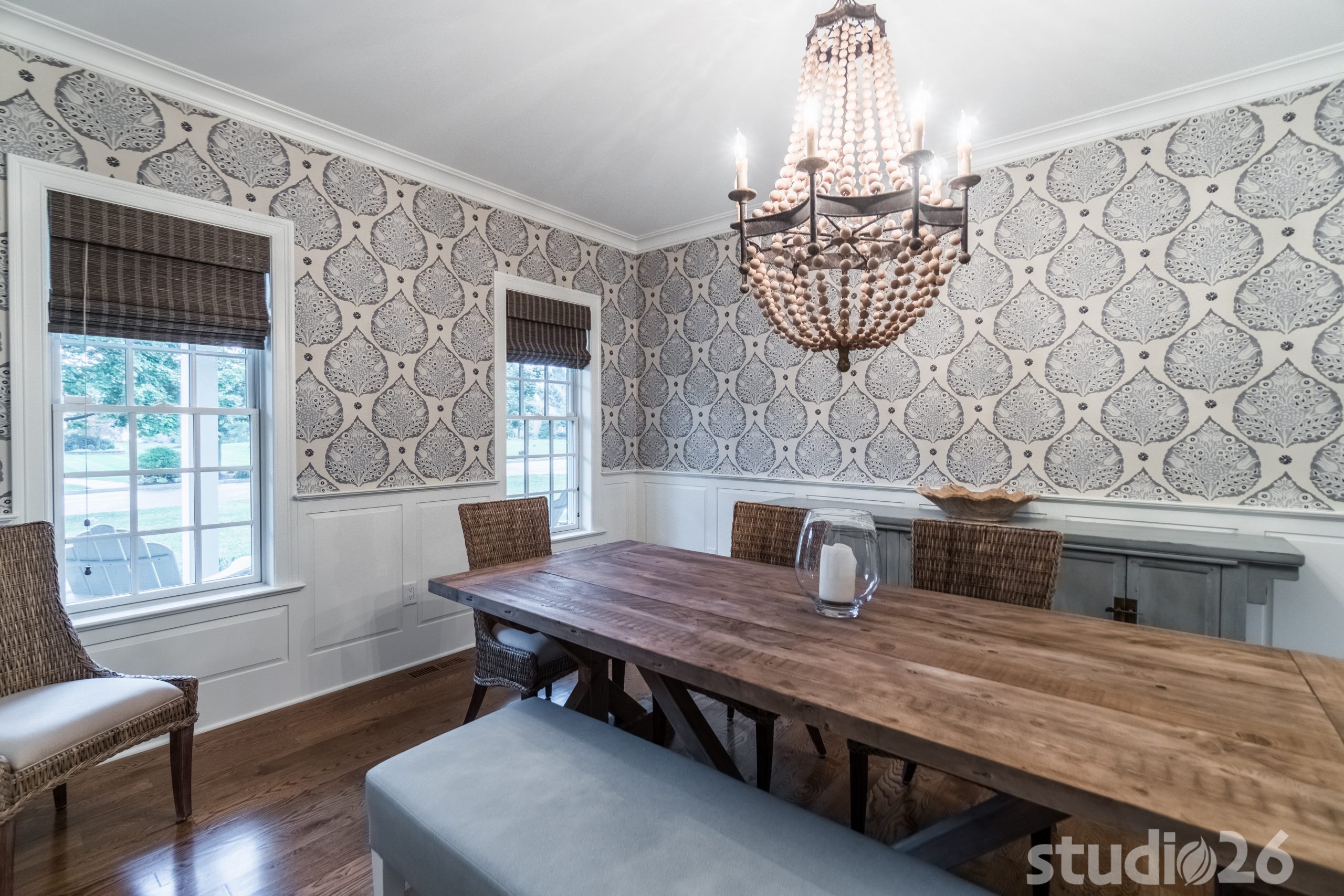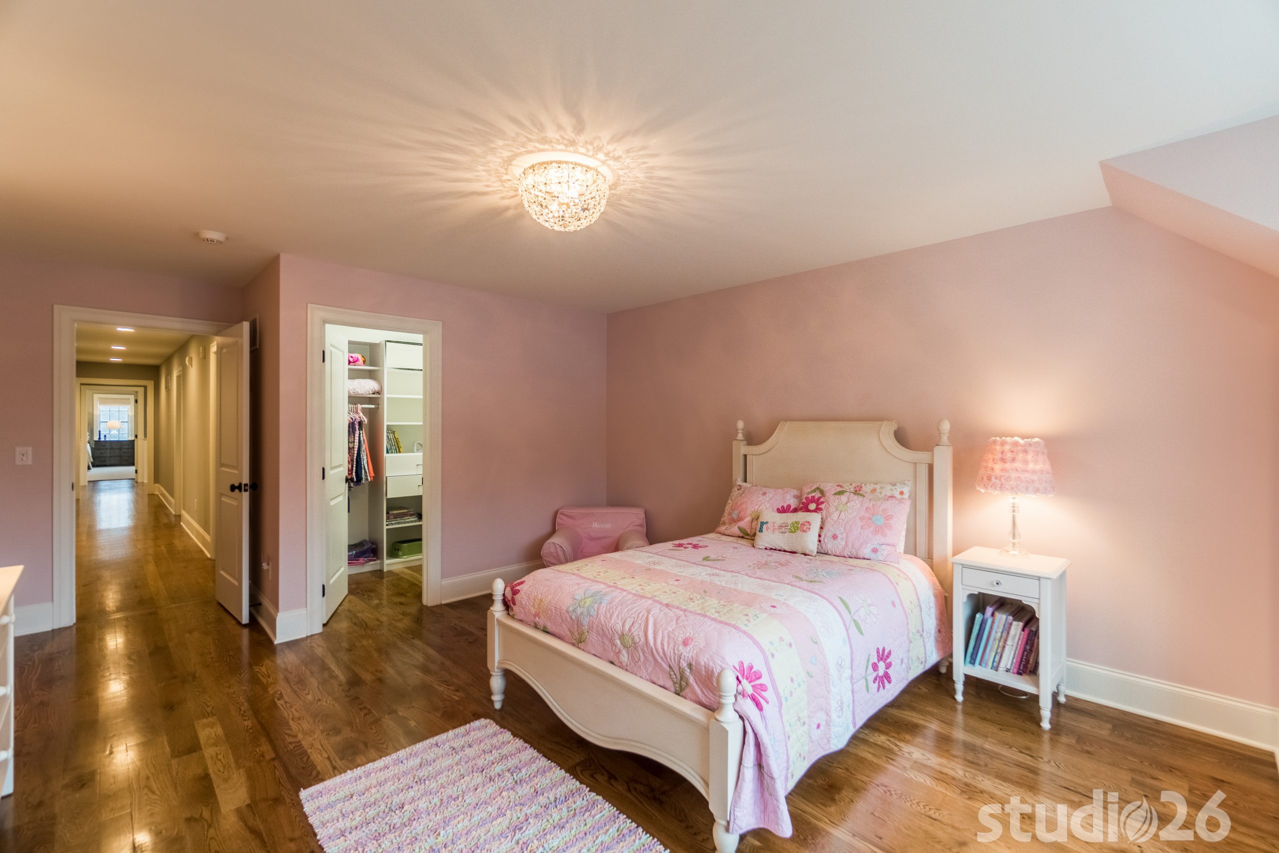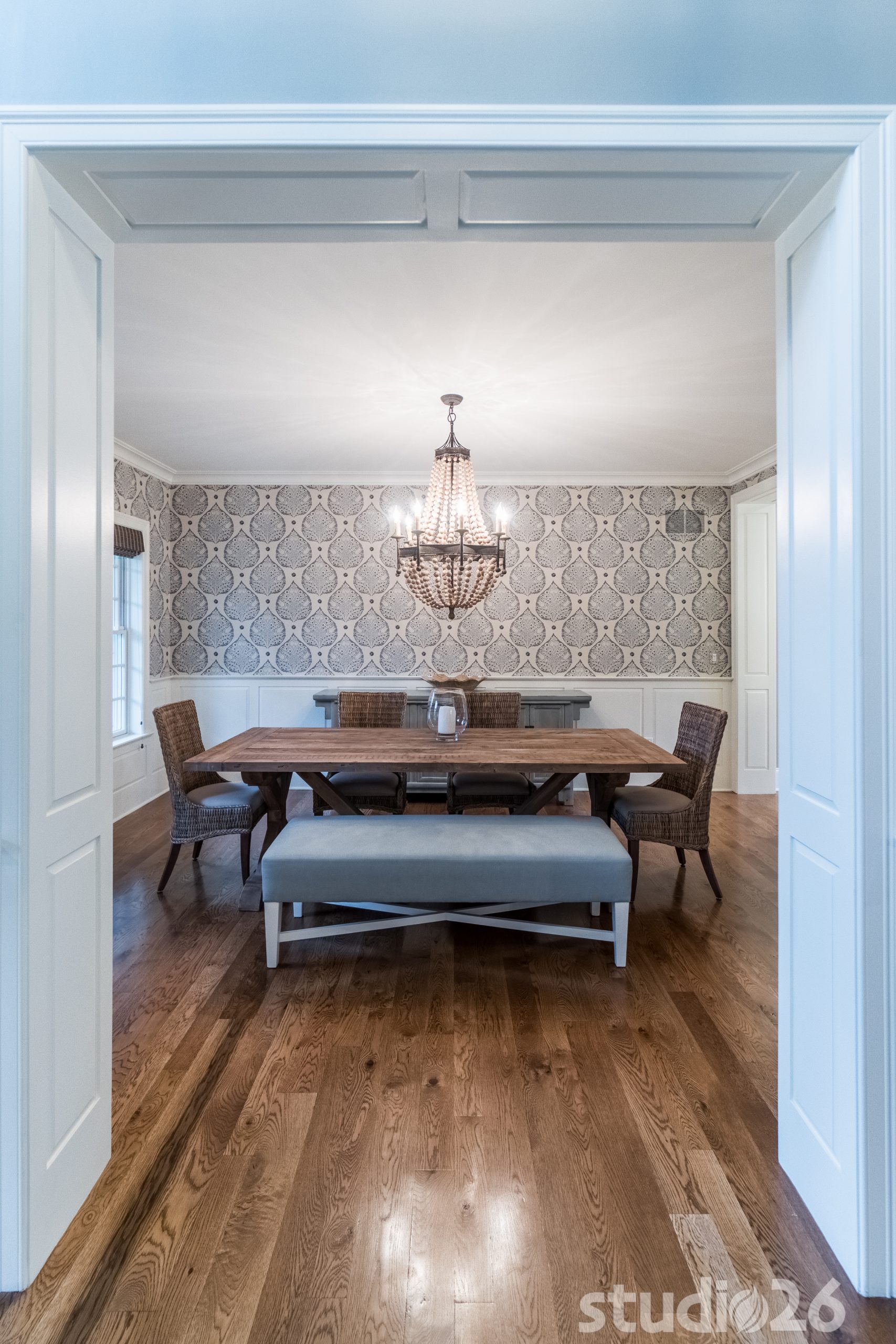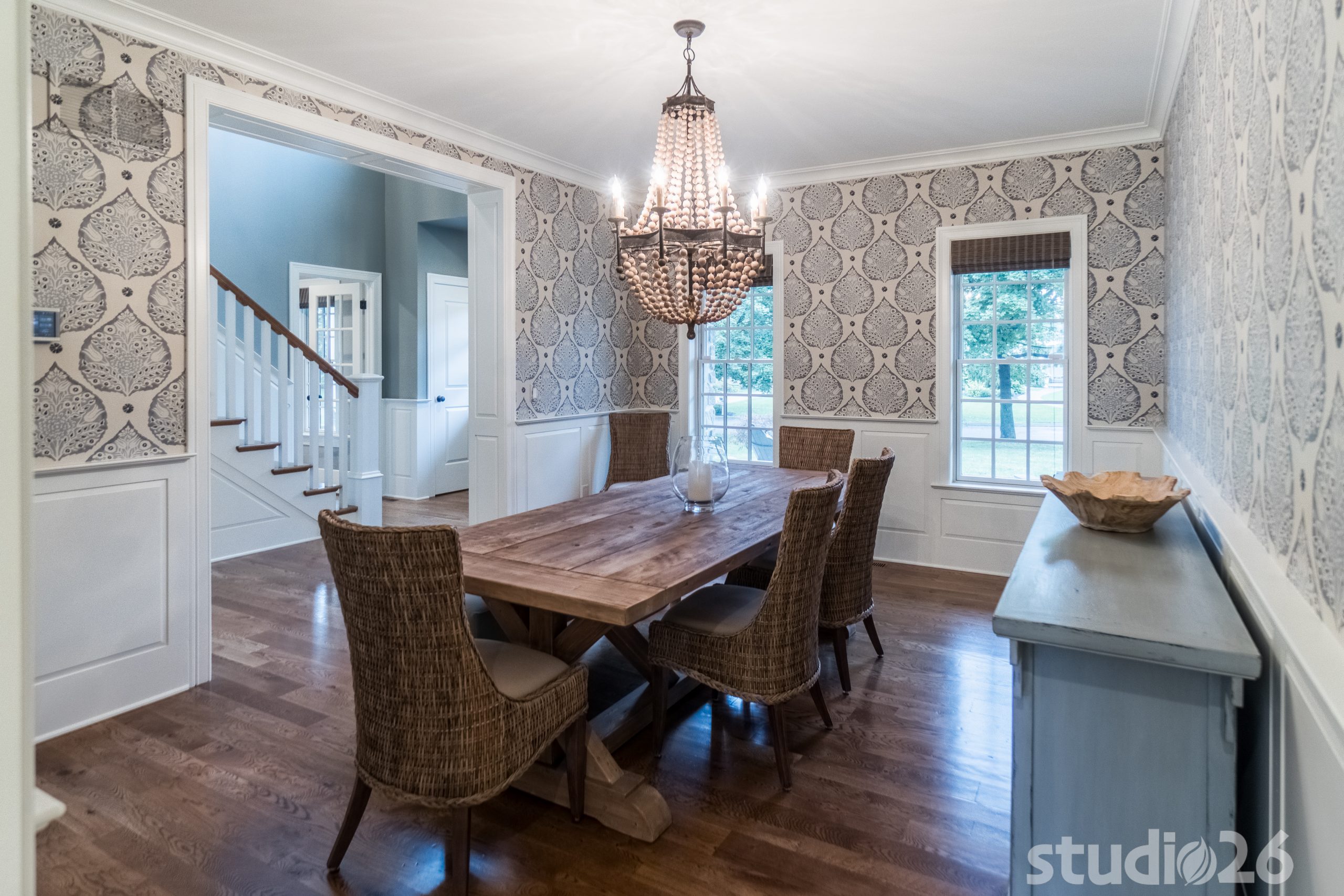 While classic – with its real regionally-quarried stone, white fiber cement clapboard siding, and operable black shutters – on the outside, the home offers a very elegant, yet comfortable ambiance for a growing family of six on this inside. Upon entering the home, the two-story grand foyer welcomes its guests with classical elegance highlighted by impressionable details such as purposefully thicker interior walls to help recall hints of yesteryear, genuine recessed panel wainscoting, understated colonial trim and crown molding details, and site-finished random-width white oak floors throughout.