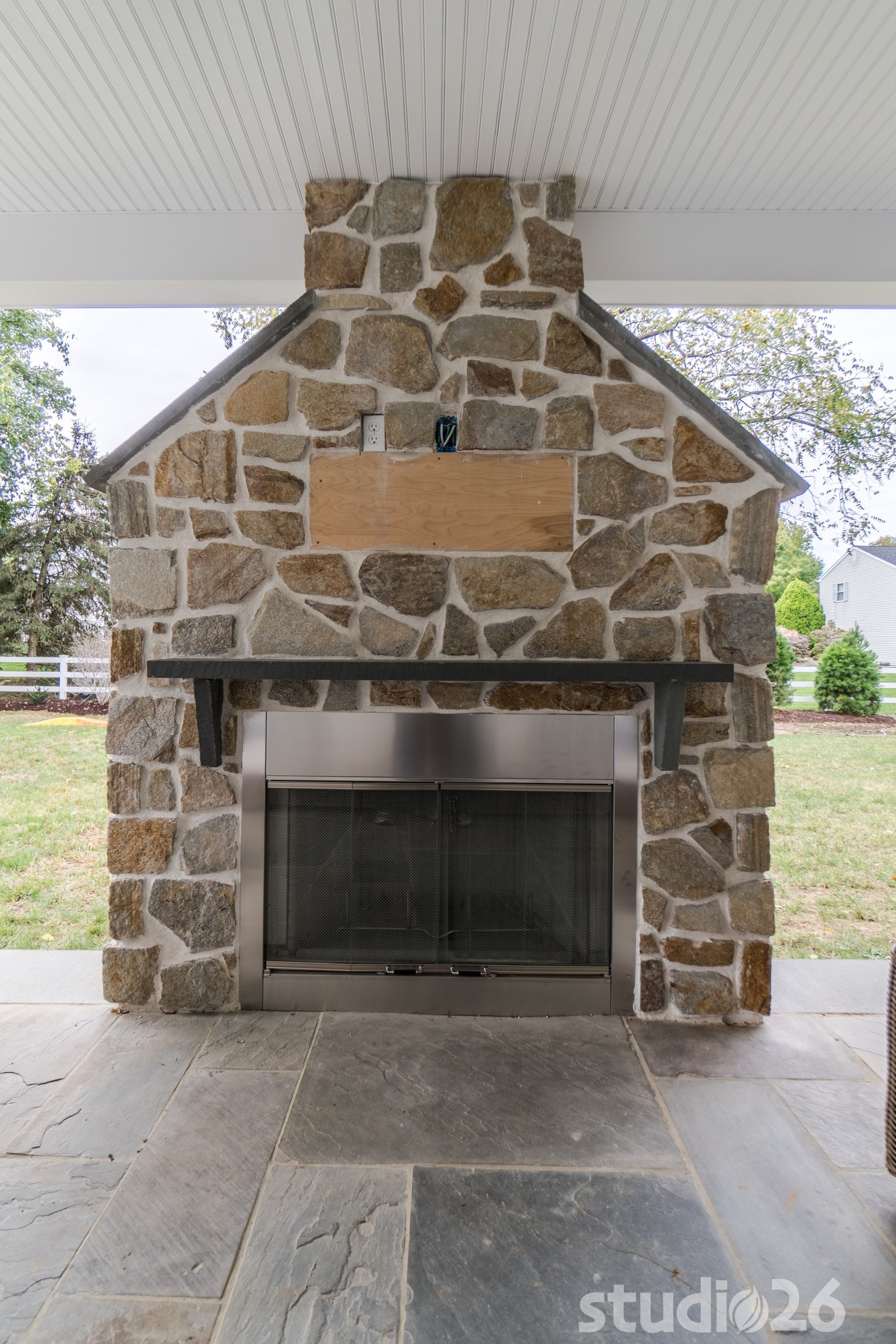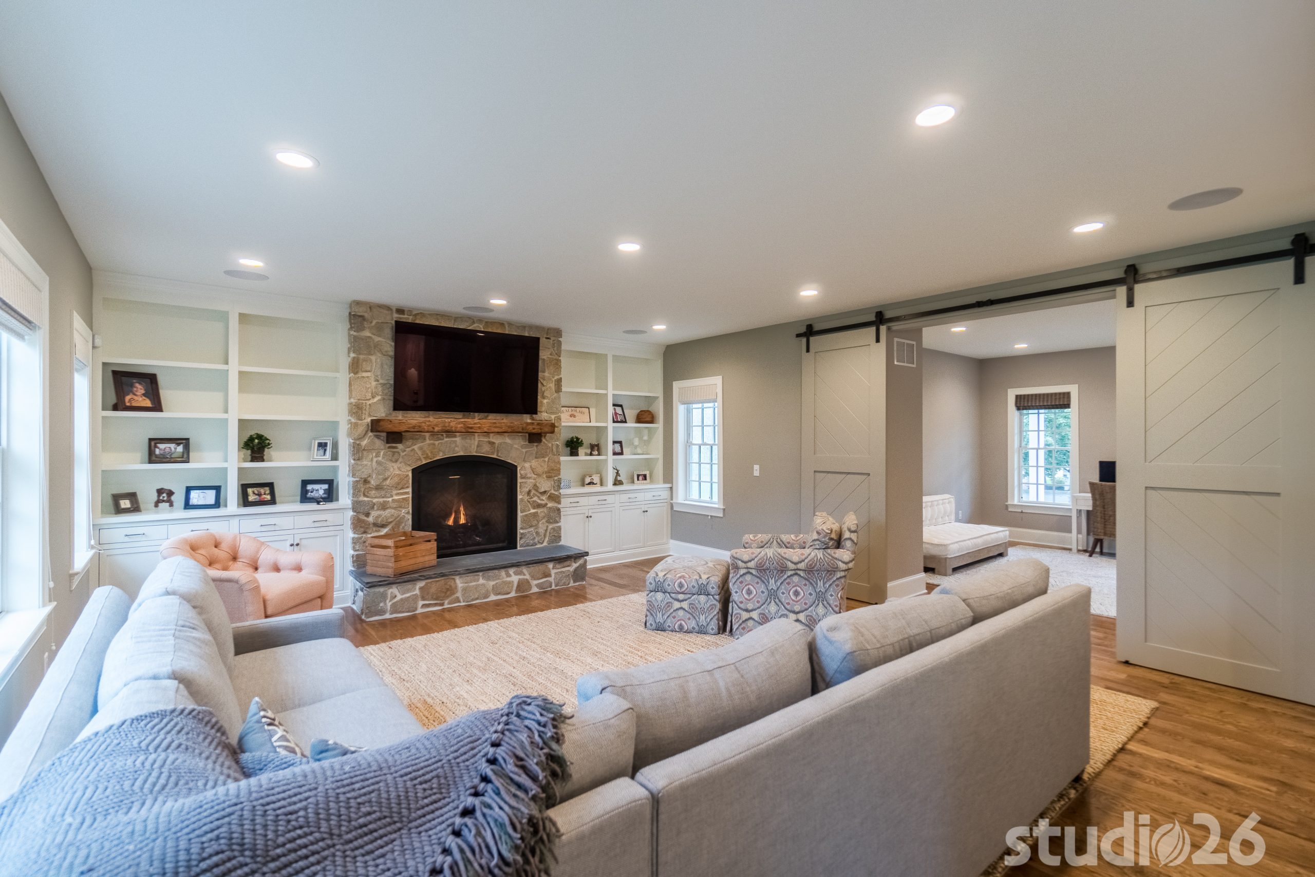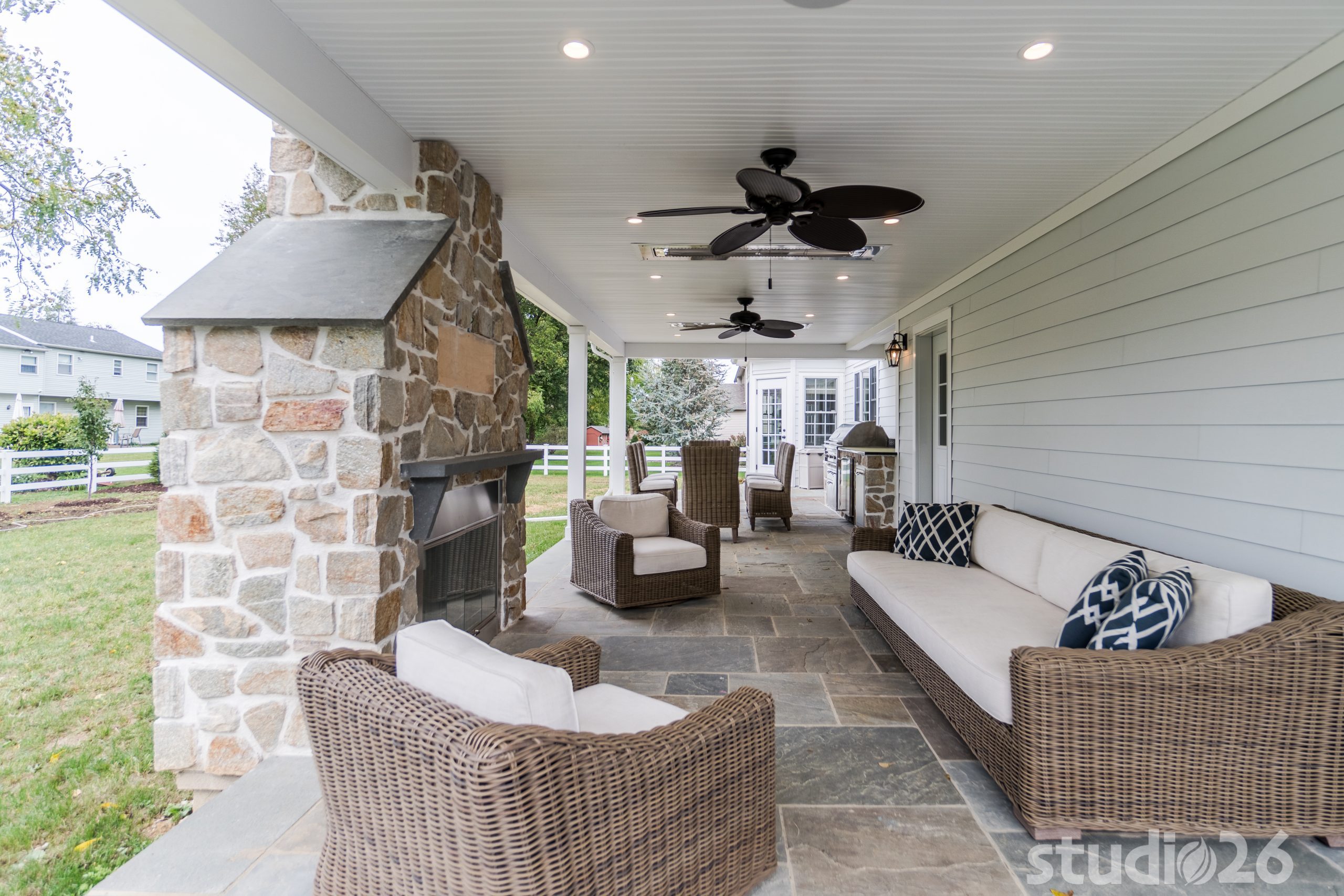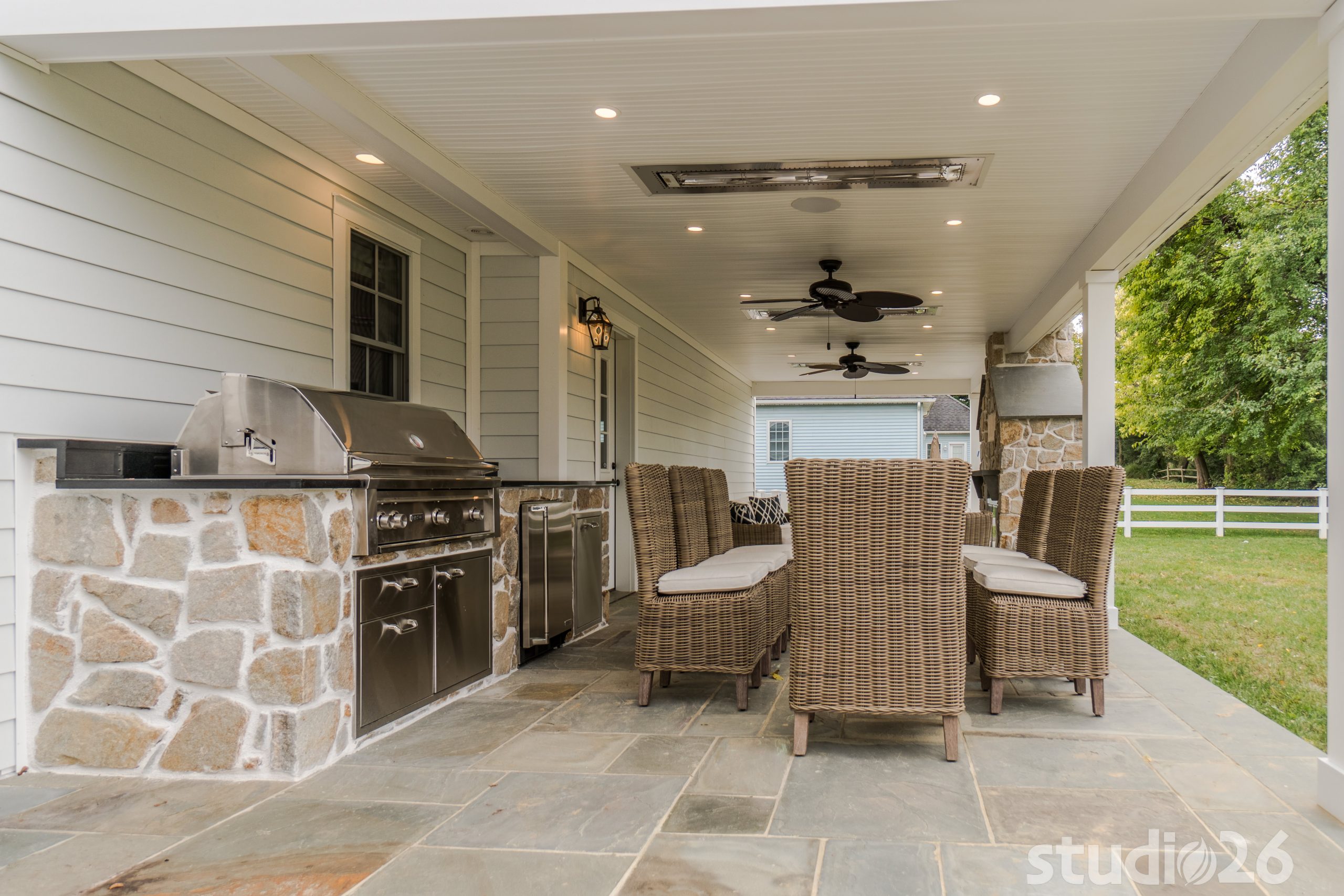 Programmatically, our client was looking to capture a few of the cherished elements of their former home while incorporating several new and larger components that would help them to better entertain their plentiful extended family and friends throughout the holidays and special occasions. To help deliver on this goal, it was important for us to incorporate an expansive covered front porch with its black standing seam metal roof as well as an extensive rear covered porch area that housed a custom outdoor kitchen, a wood-burning stone fireplace, and toasty infrared heaters recessed into the bead board ceiling perfect to help expand the entertaining seasons throughout the year.